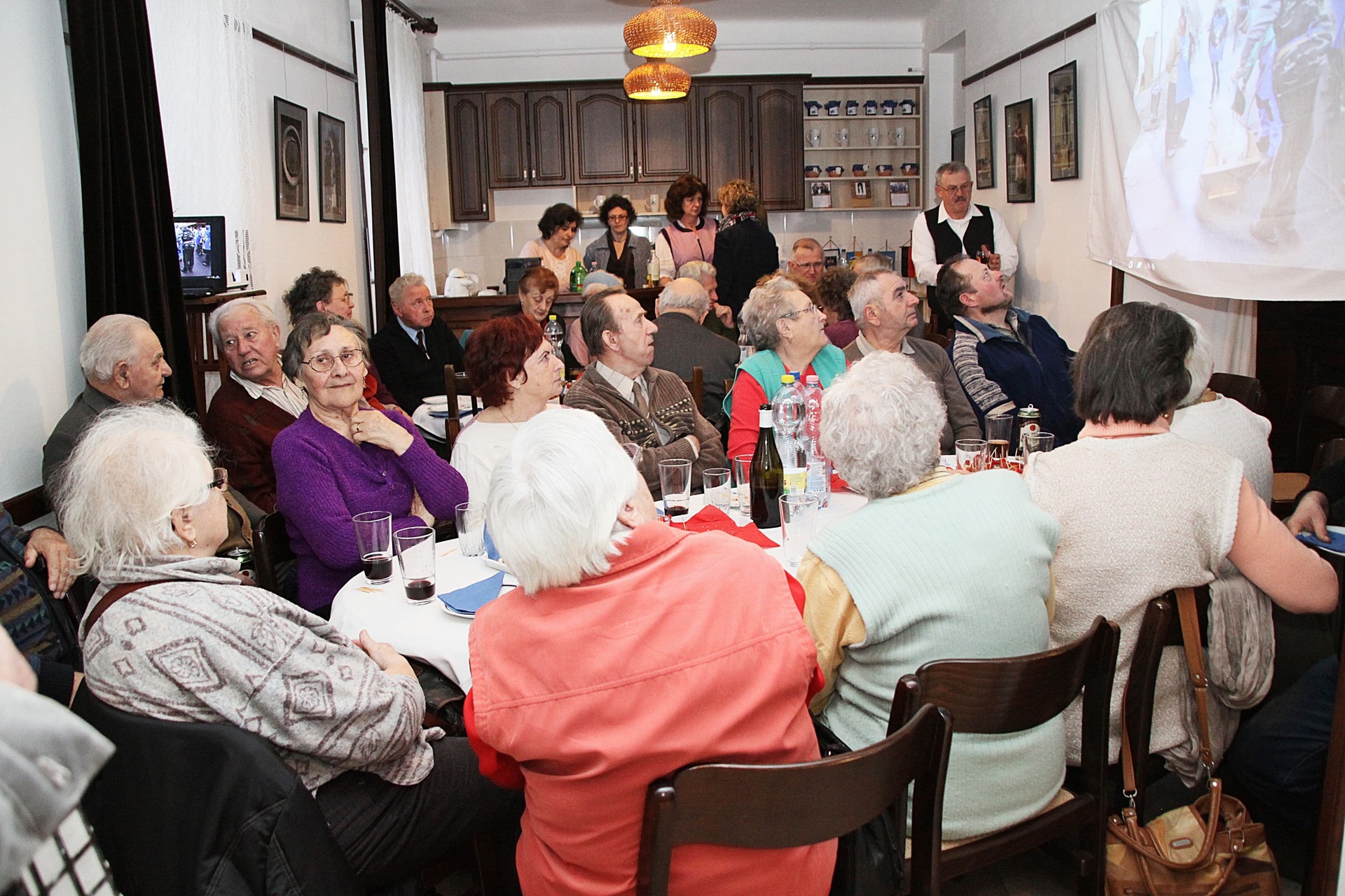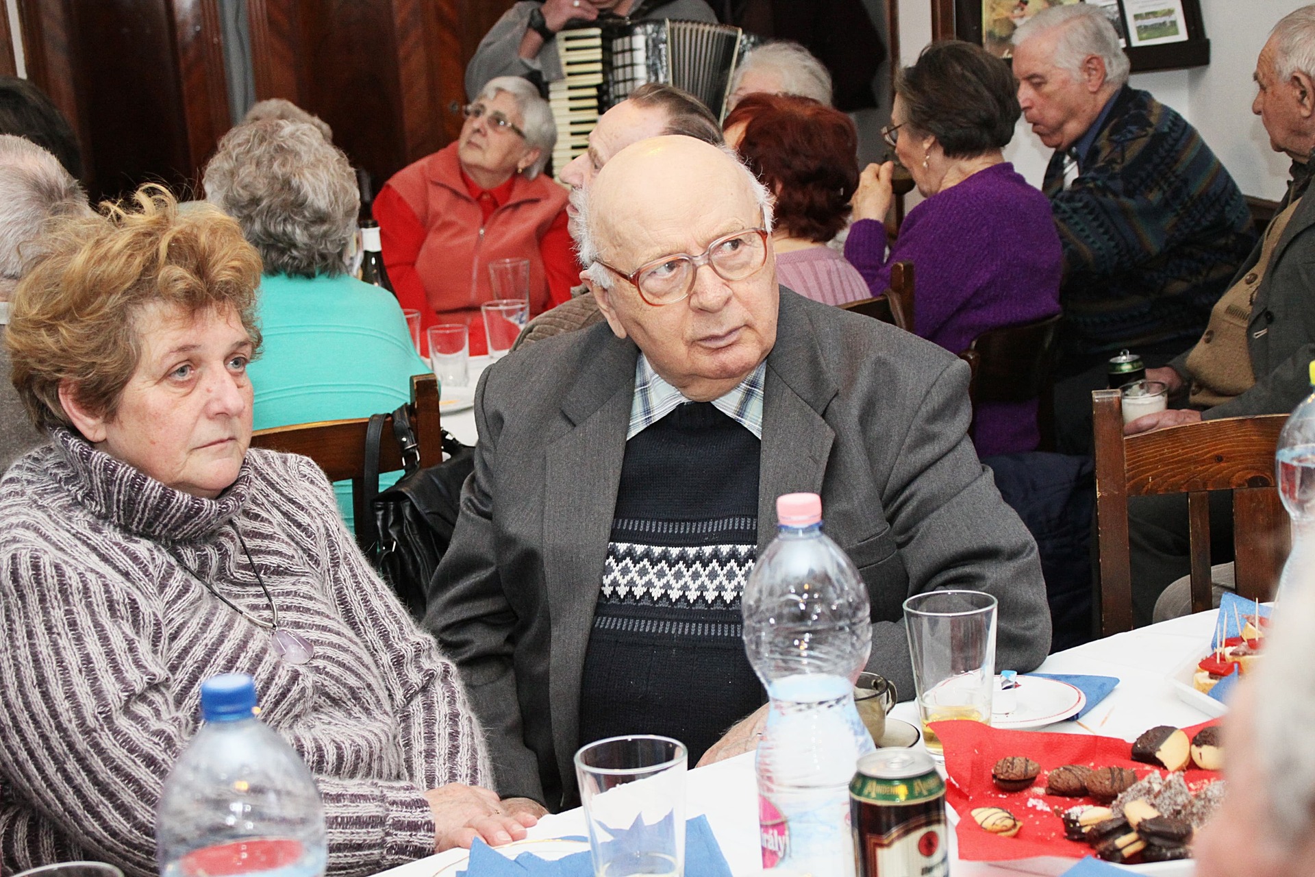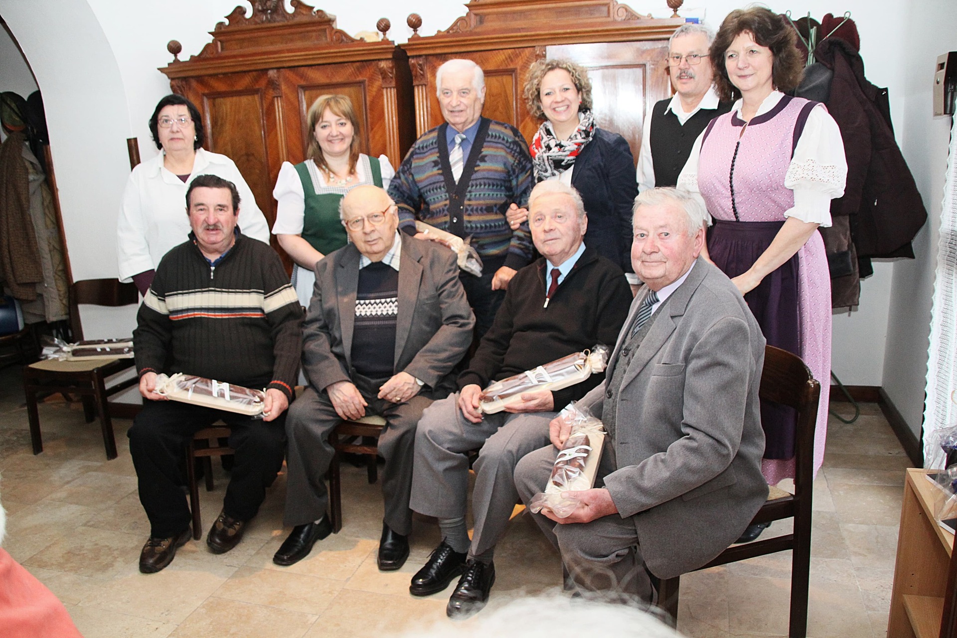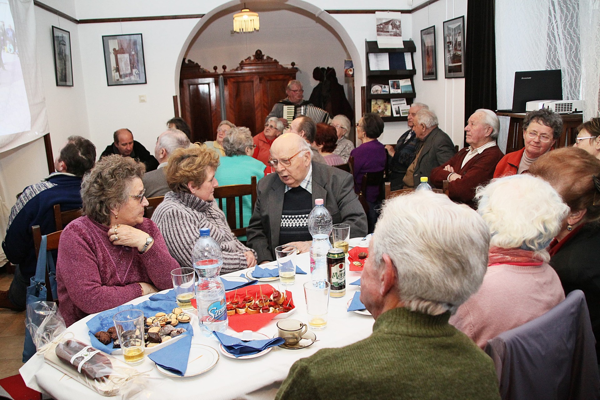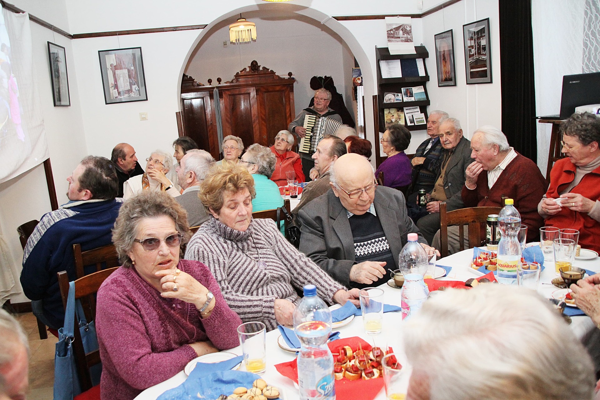 Az ünnepeltekkel csoportképet is készítettek, a délután hátralévő része pedig mulatozással telt. Szépen fogytak az asztalokra készített kolbászos falatok, mialatt Cseke Pista bácsi – mint ahogyan már 15 éve valamennyi rendezvényen – harmonikaszóval biztosította a jó hangulatot, a közösség tagjai pedig eközben Szabó László falakon szereplő fotóit is megcsodálhatták.