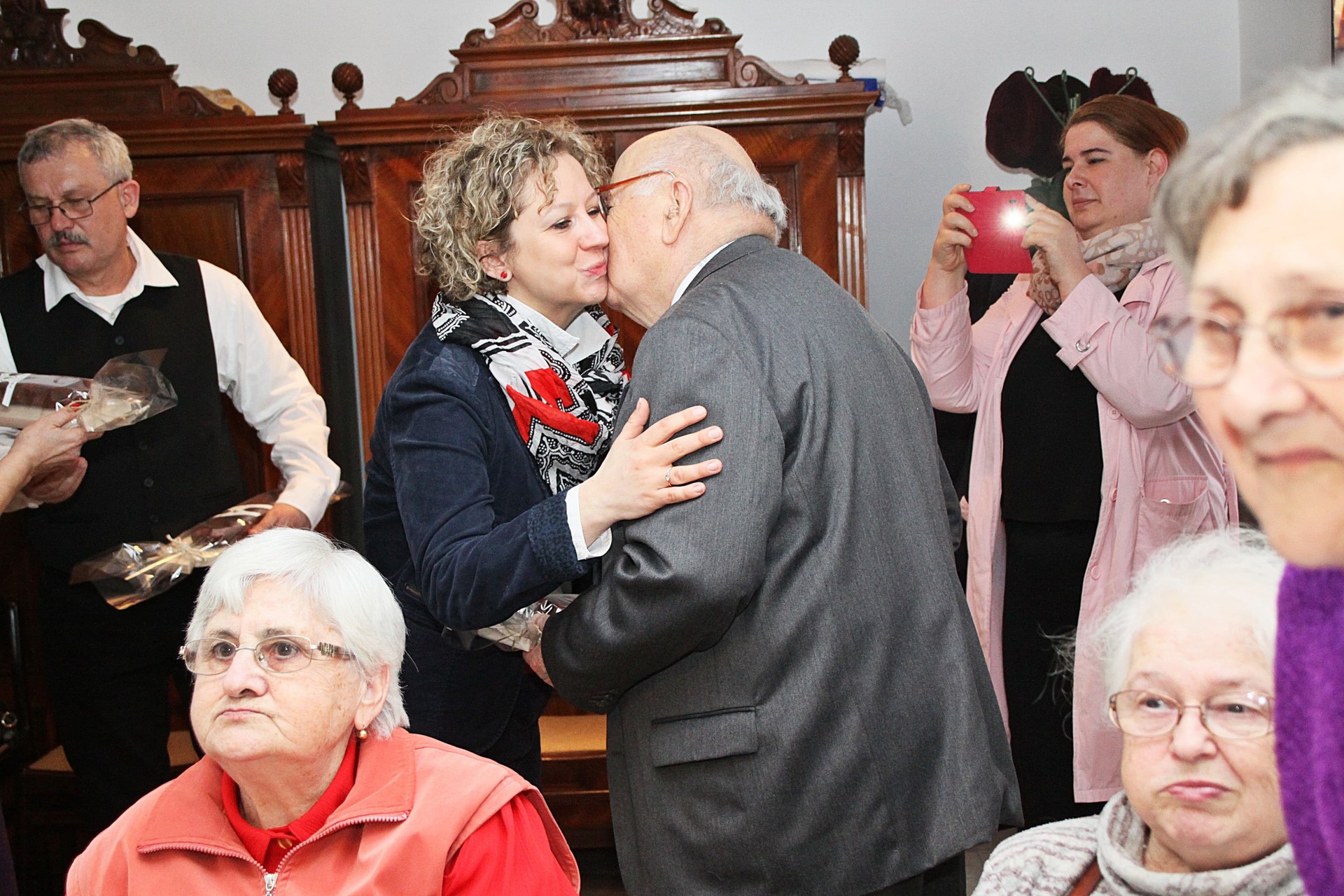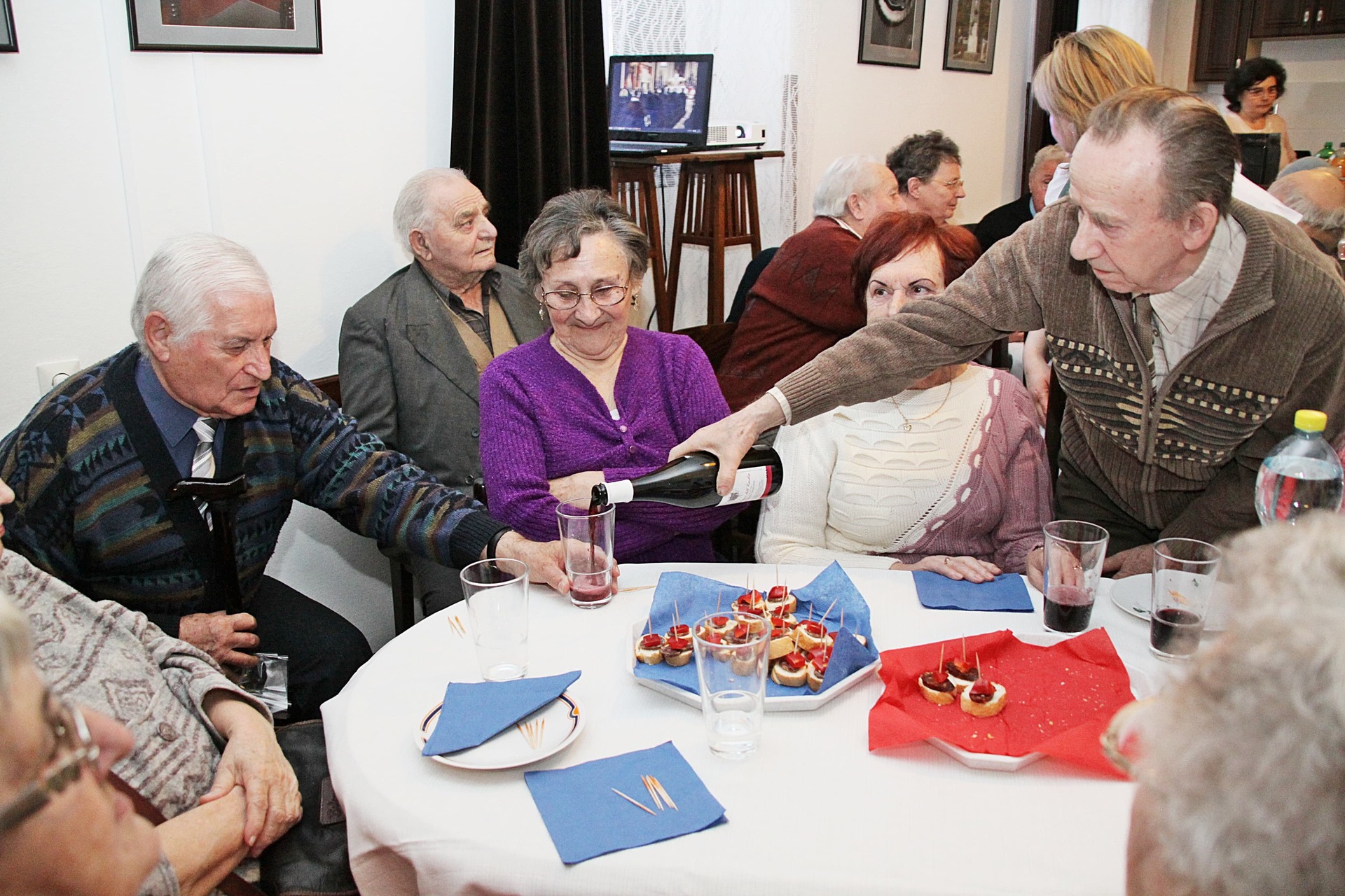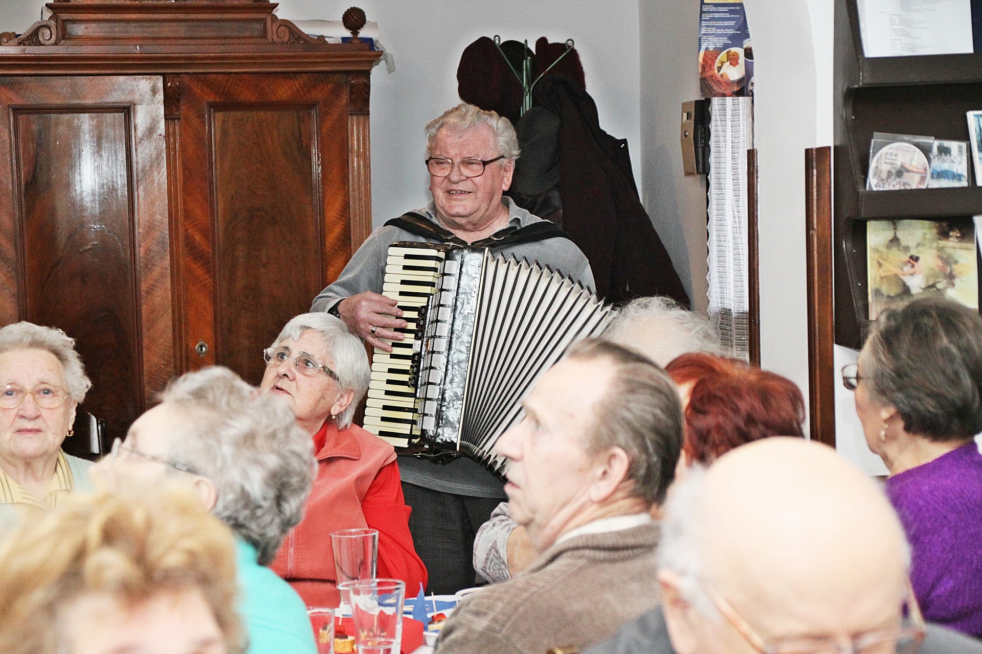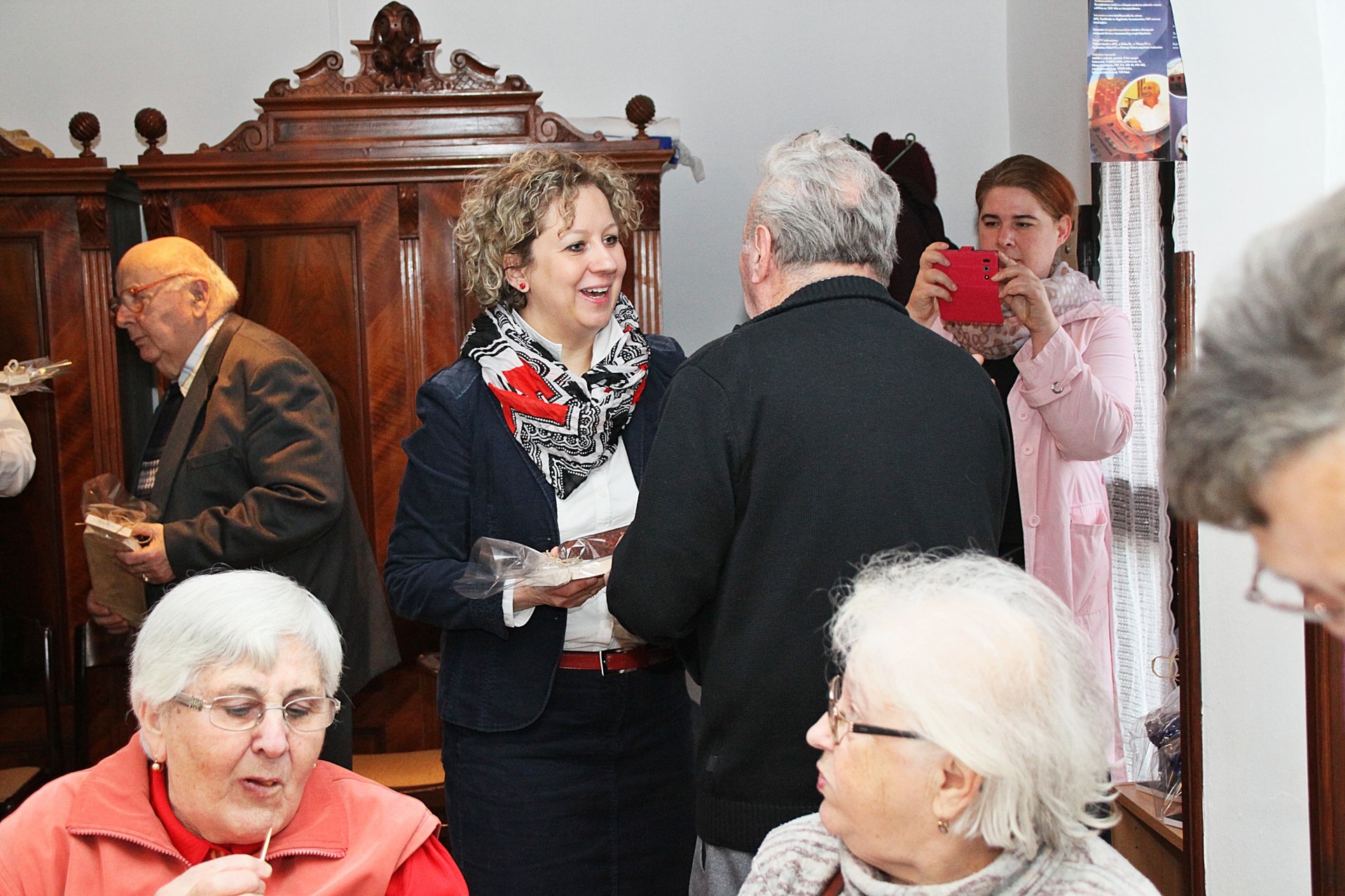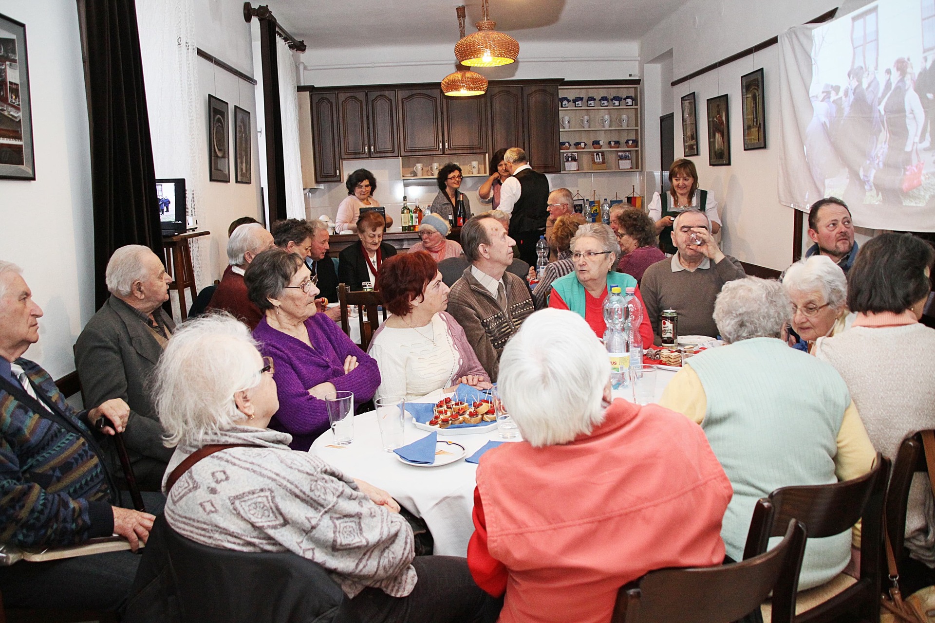 Az ünnepeltekkel csoportképet is készítettek, a délután hátralévő része pedig mulatozással telt. Szépen fogytak az asztalokra készített kolbászos falatok, mialatt Cseke Pista bácsi – mint ahogyan már 15 éve valamennyi rendezvényen – harmonikaszóval biztosította a jó hangulatot, a közösség tagjai pedig eközben Szabó László falakon szereplő fotóit is megcsodálhatták.