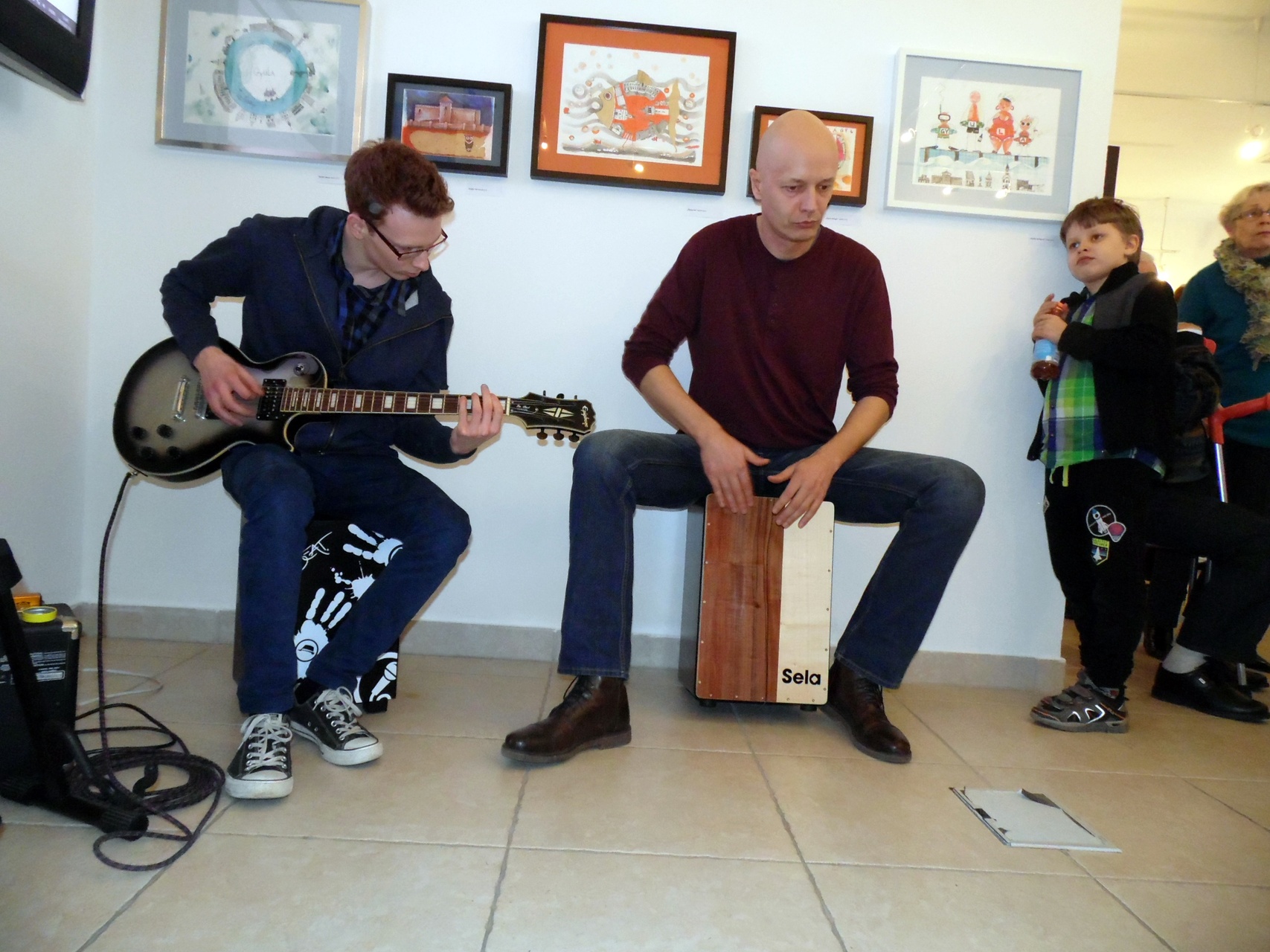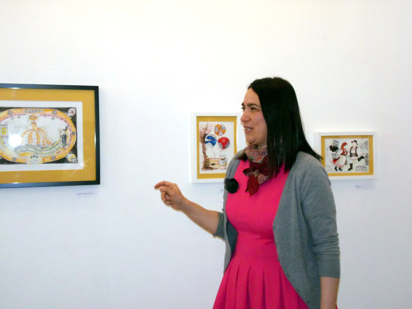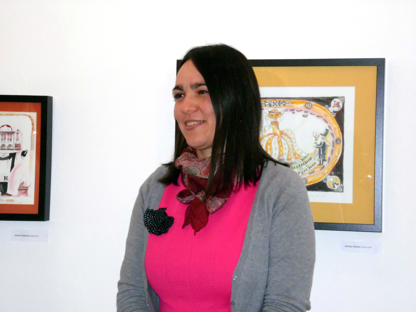Ezt követően Kiss Adél személyesen mutatta be gyulai képeit a jelenlévőknek. „A gyulavári kastély jellegzetessége az épület és hogy Kohán György itt született” – mondta, majd a Komló, az Almásy-kastély, a Mogyoróssy könyvtár, a Göndöcs-kert, valamint a 48-as klub megszemélyesített épületeit ábrázoló képeiről mesélt.