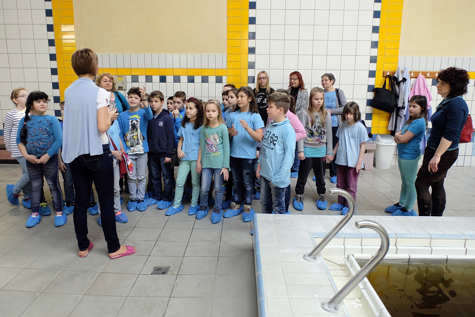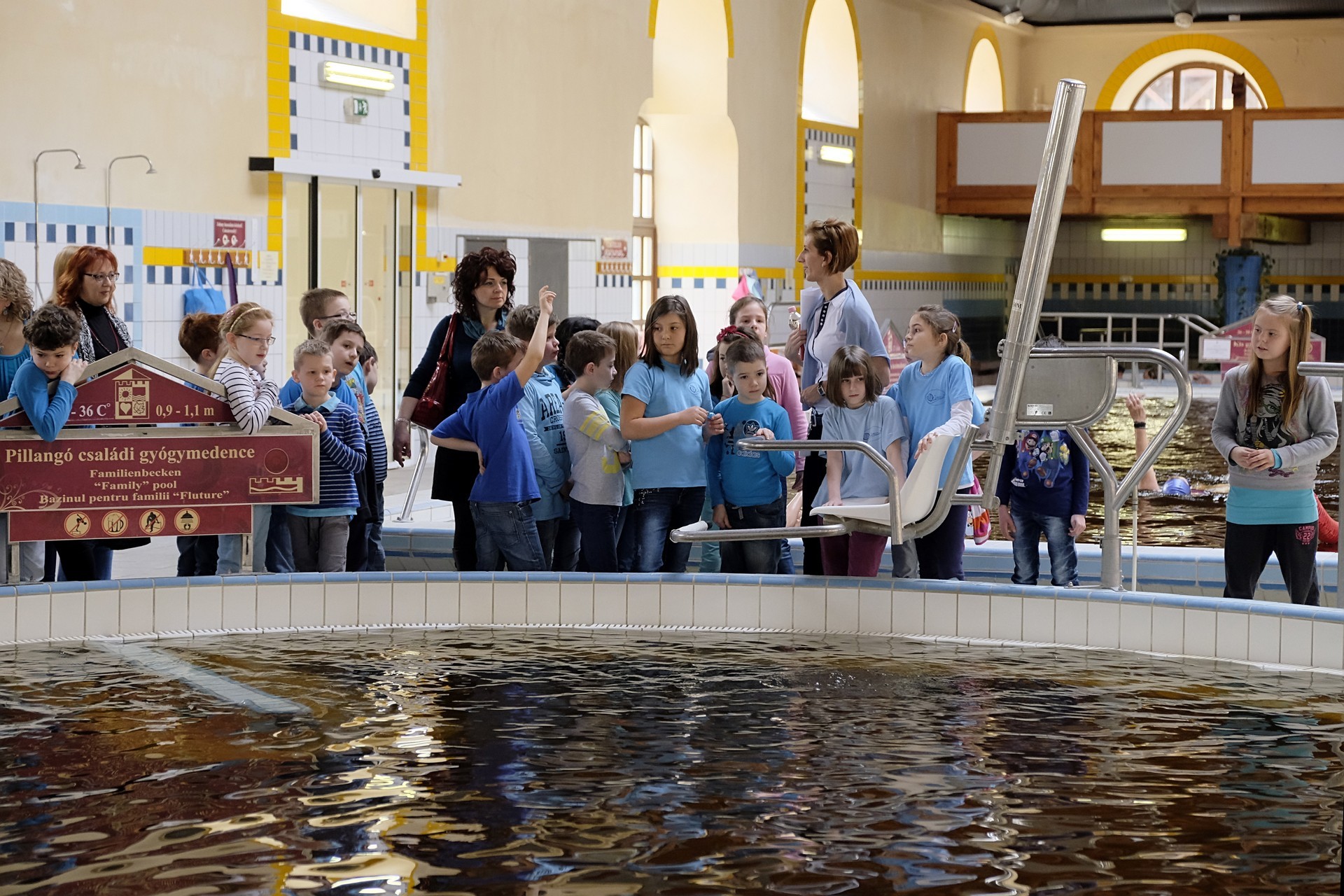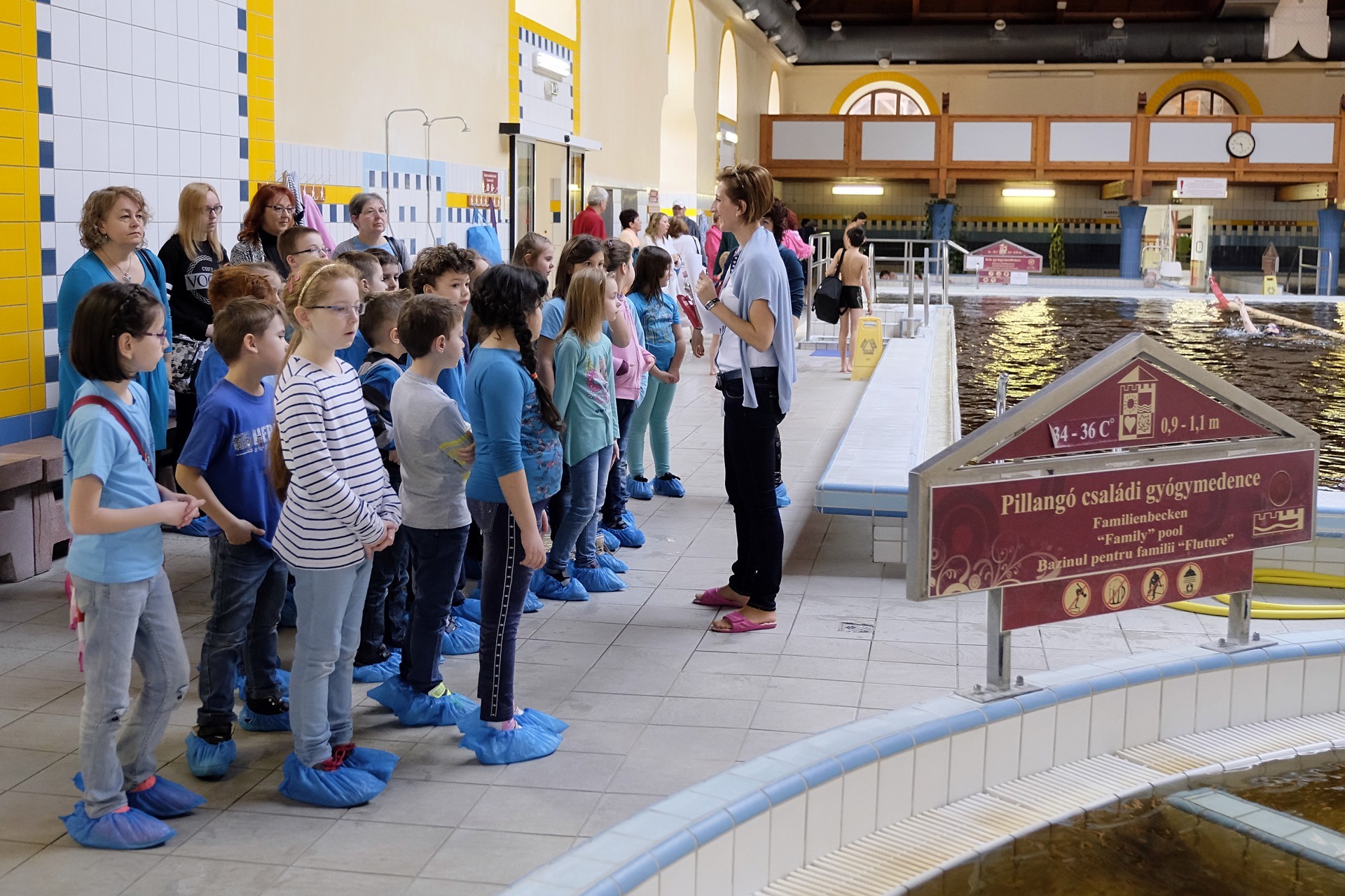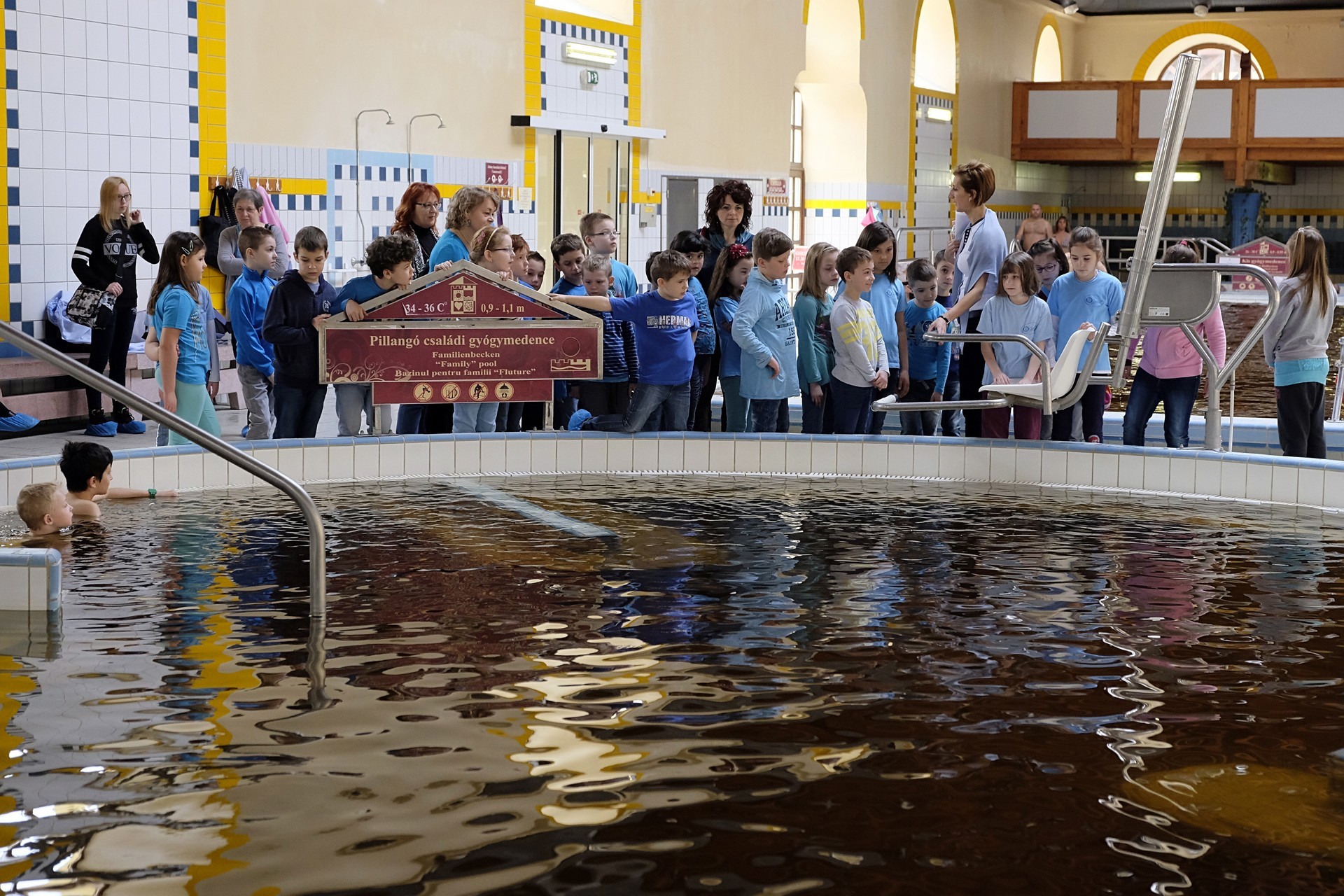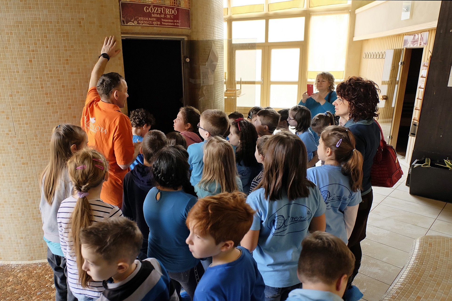 Aznap több csoport is indult, a legelső, 9 órás csapatban a Dürer Albert Általános Iskola 2.a osztályos tanulói vettek részt, akik lelkesen válaszoltak alkalmi túravezetőjük kérdéseire. A sétát elindító eligazításon Keszeli Hajnalka megkérdezte az alsósokat arról, vajon tudják-e, milyen szolgáltatásai vannak egy ilyen fürdőnek, meddig szabad a gyógyvízben ülni, és hogy mire kell vigyázni egy ilyen helyen. Az iskolások megegyeztek abban, hogy leginkább arra, hogy el ne törjön a kezük, majd a fürdő munkatársa után eredve célba vették a gyógyvizes medencéket.
