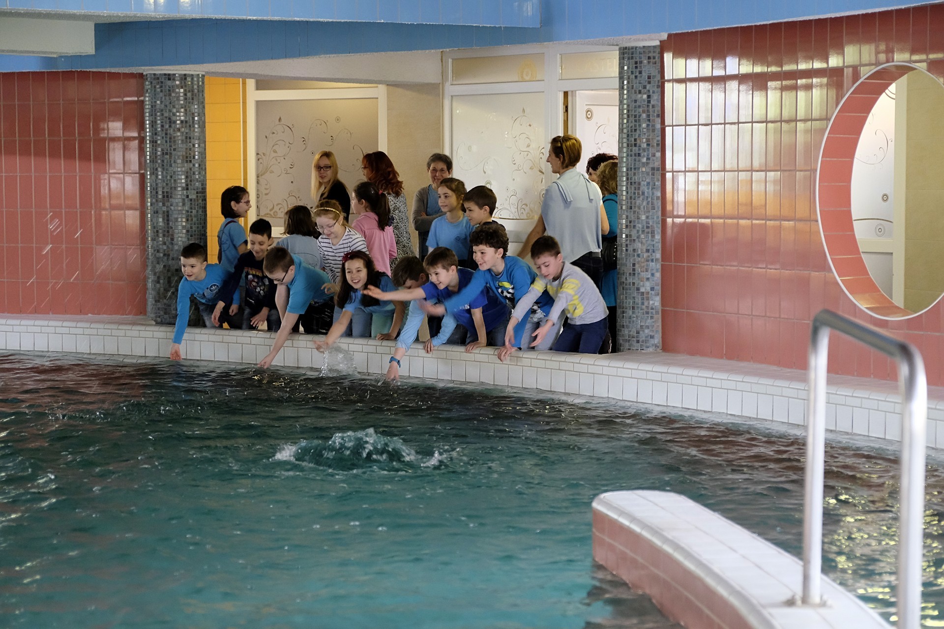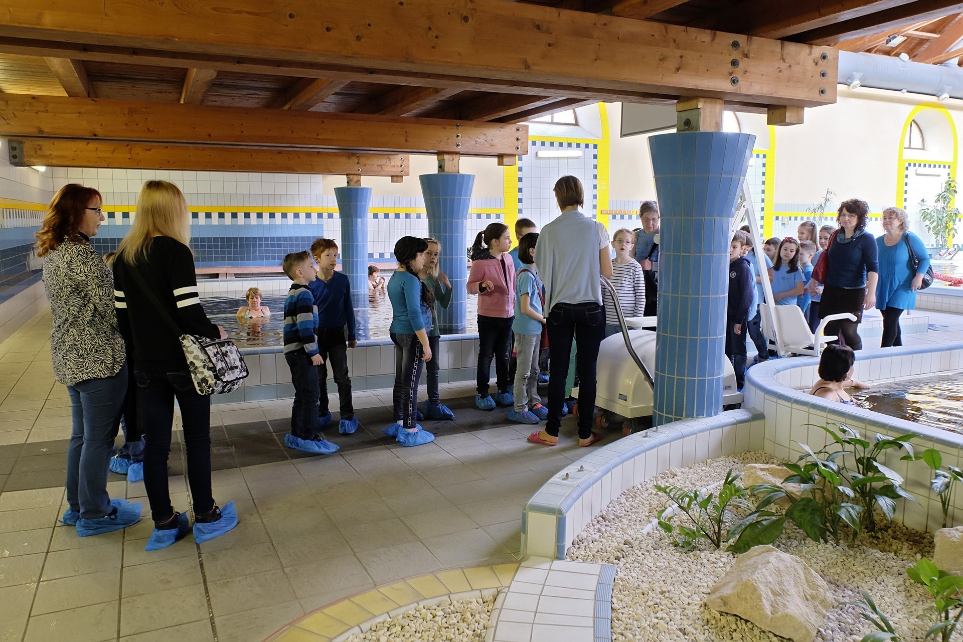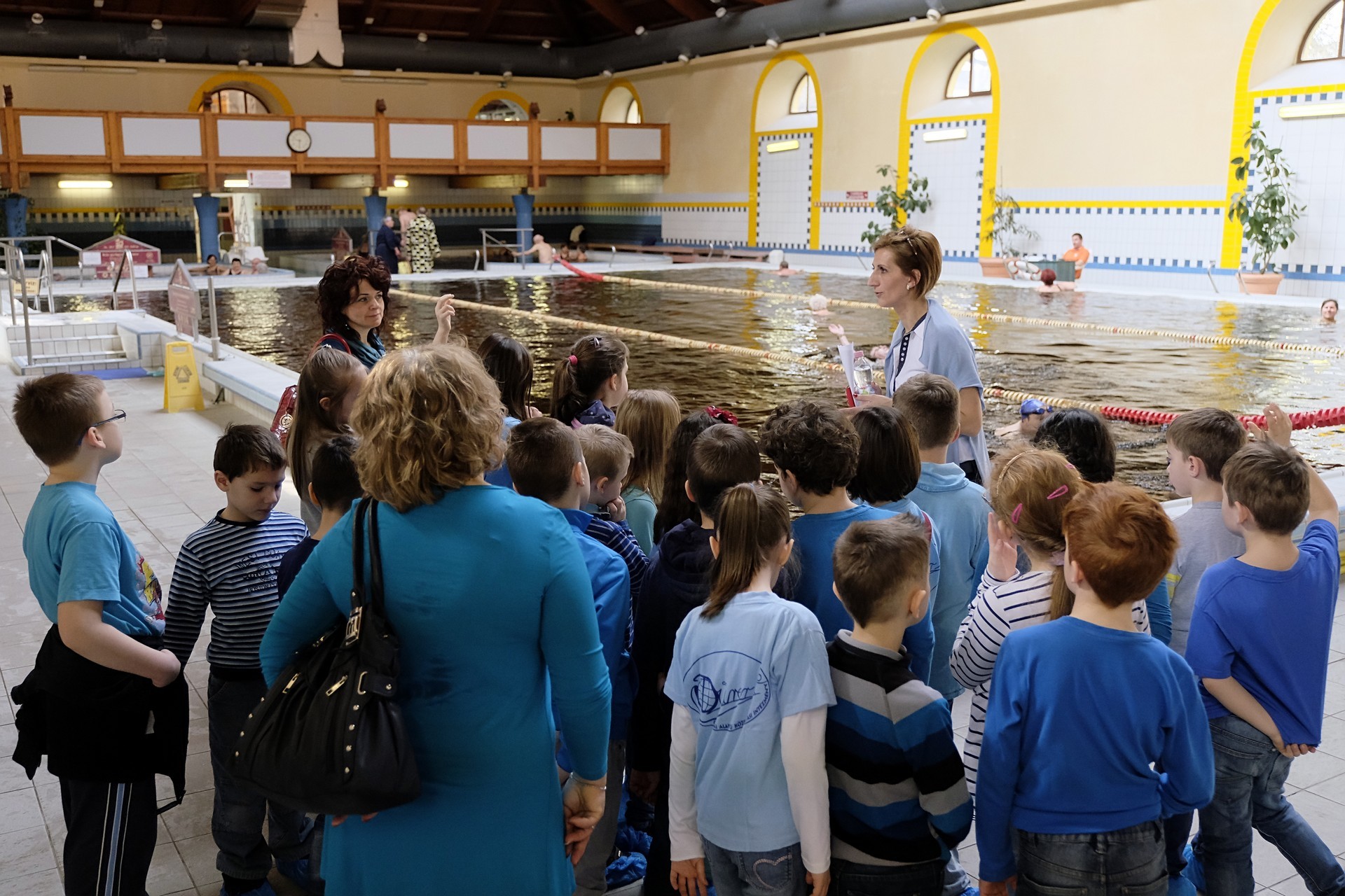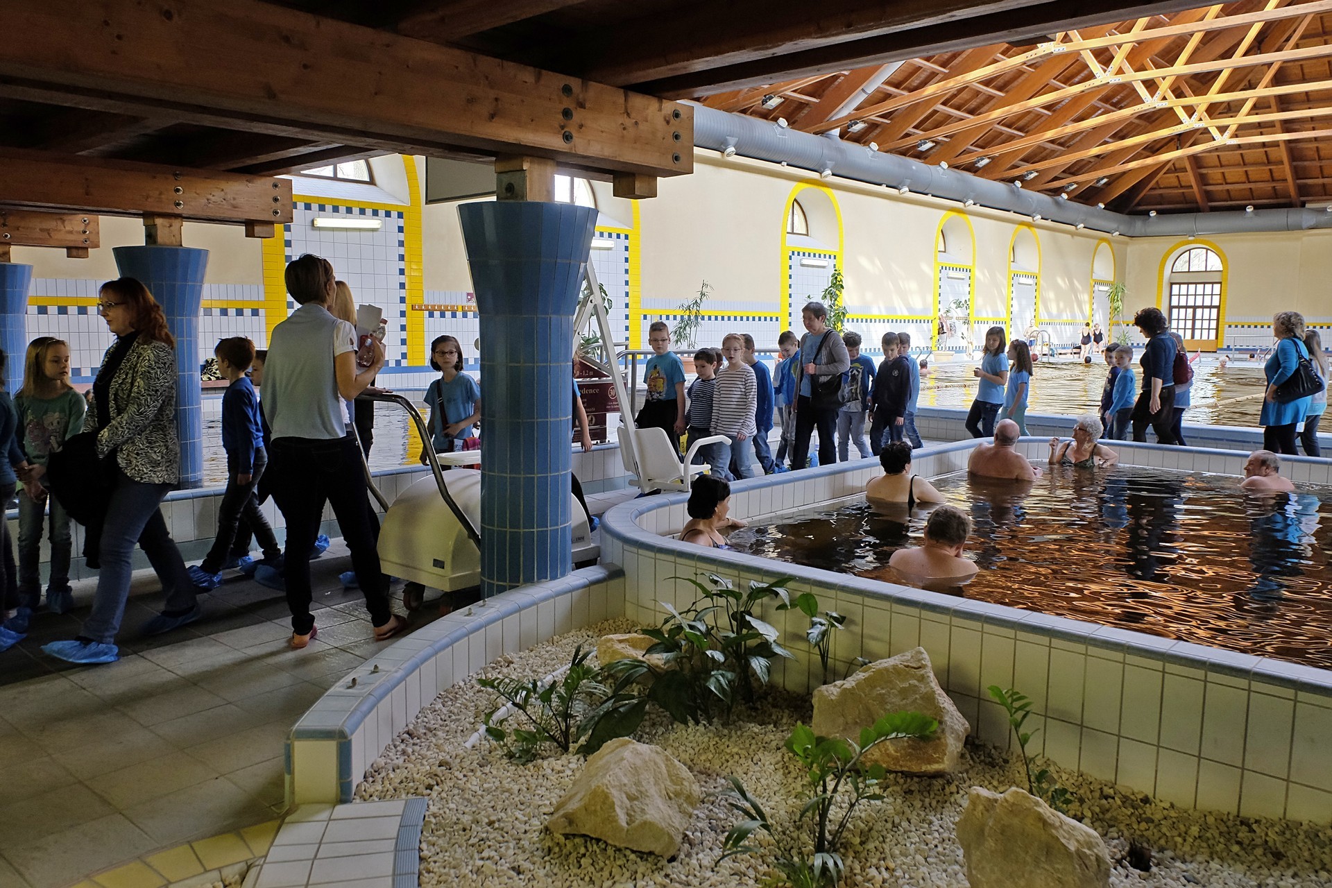 Aznap több csoport is indult, a legelső, 9 órás csapatban a Dürer Albert Általános Iskola 2.a osztályos tanulói vettek részt, akik lelkesen válaszoltak alkalmi túravezetőjük kérdéseire. A sétát elindító eligazításon Keszeli Hajnalka megkérdezte az alsósokat arról, vajon tudják-e, milyen szolgáltatásai vannak egy ilyen fürdőnek, meddig szabad a gyógyvízben ülni, és hogy mire kell vigyázni egy ilyen helyen. Az iskolások megegyeztek abban, hogy leginkább arra, hogy el ne törjön a kezük, majd a fürdő munkatársa után eredve célba vették a gyógyvizes medencéket.