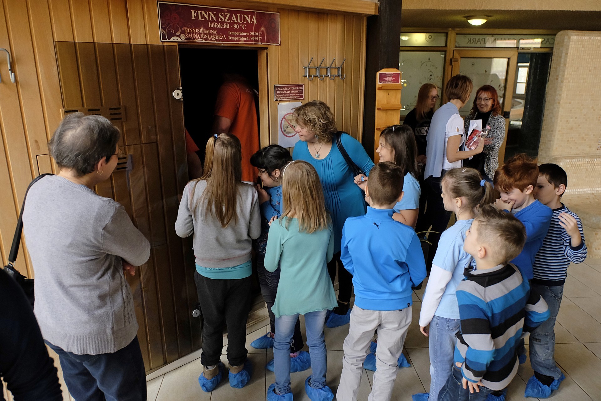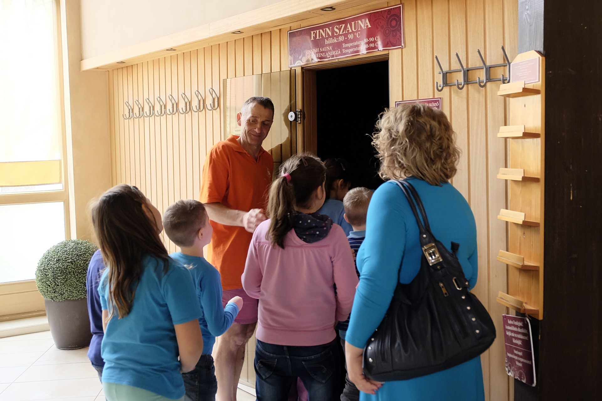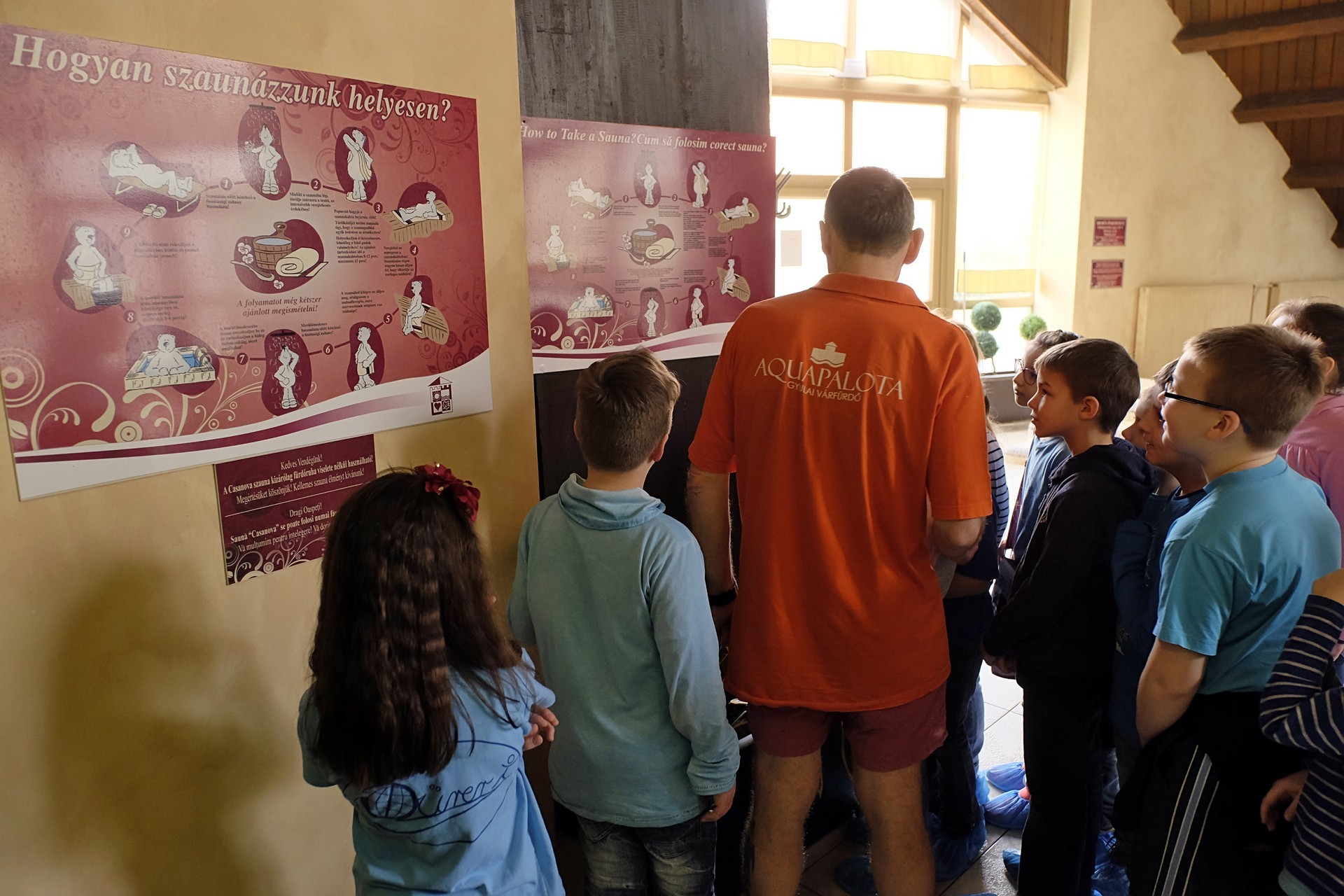 A séta a wellnessrészlegen folytatódott, majd a kicsik azt is megtekinthették, mi történik egy szaunaszeánszon, eztán pedig az AquaPalotát vették célba, ahol azt is megtudhatták, hogy annak levegőjét a medencékből leengedett gyógyvíz melegíti. Végül a csapat annak pincéjébe indult, és a berendezést működtető hőszivattyűt is megnézhette a nem mindennapi nyílt napon.