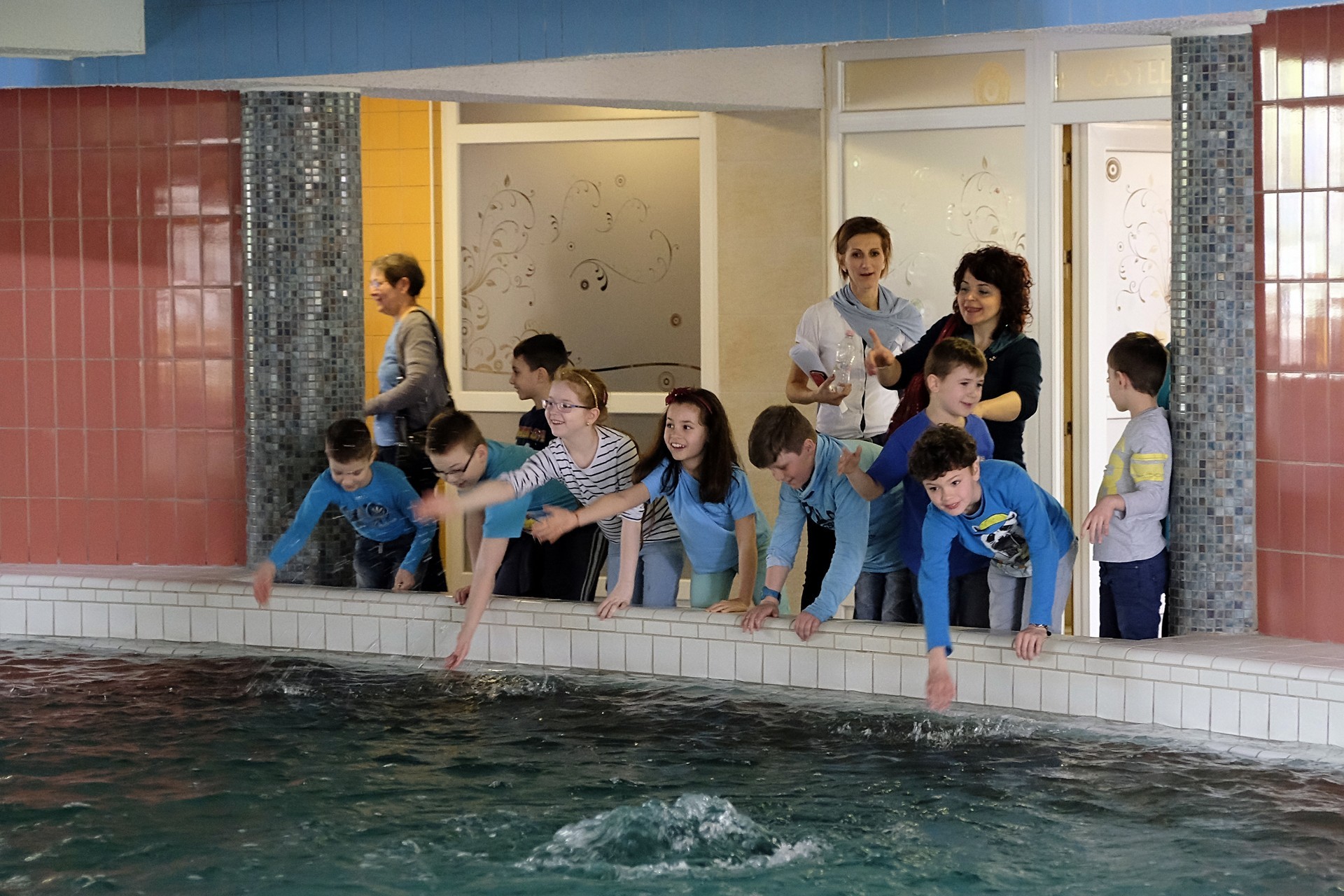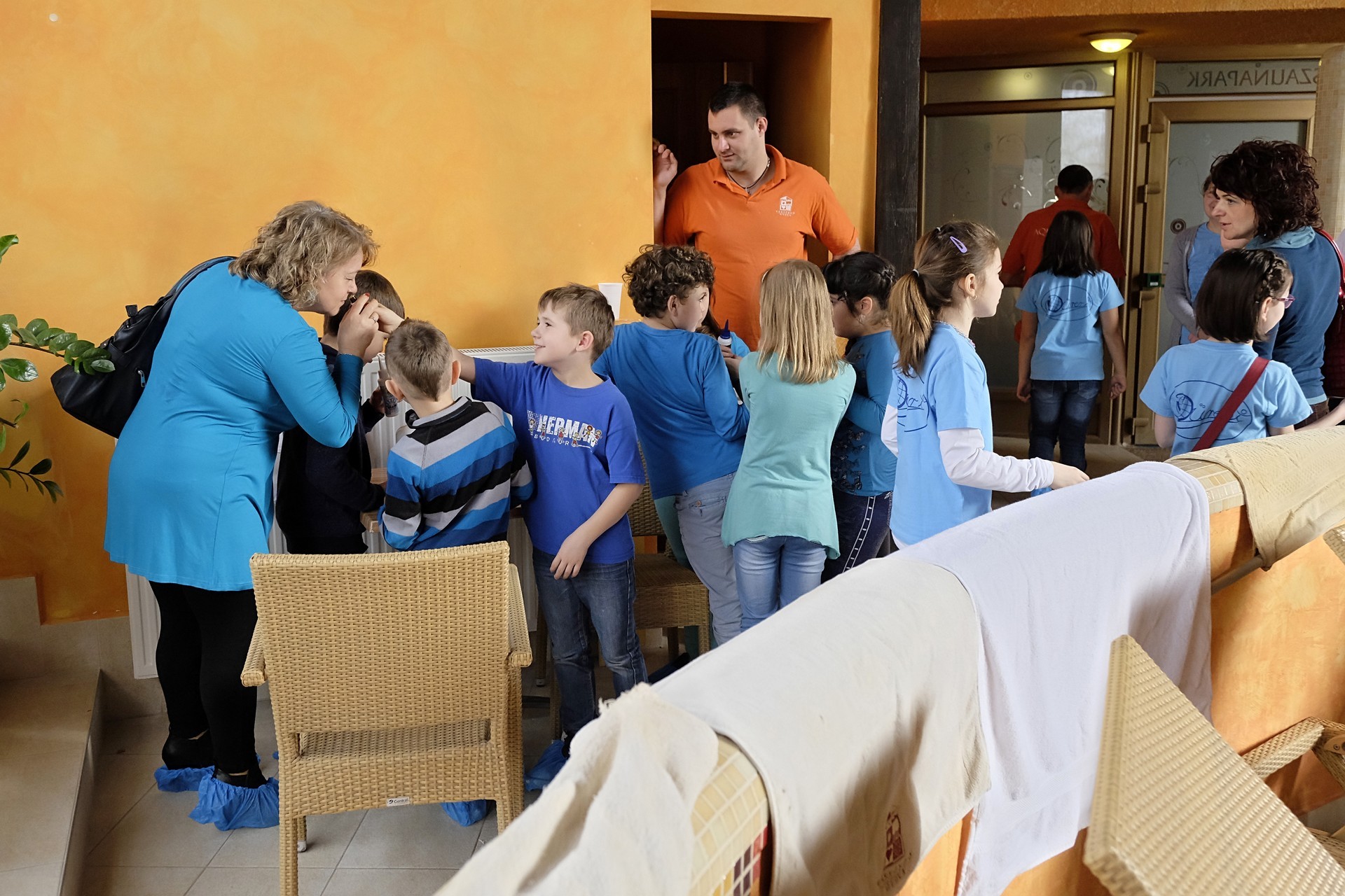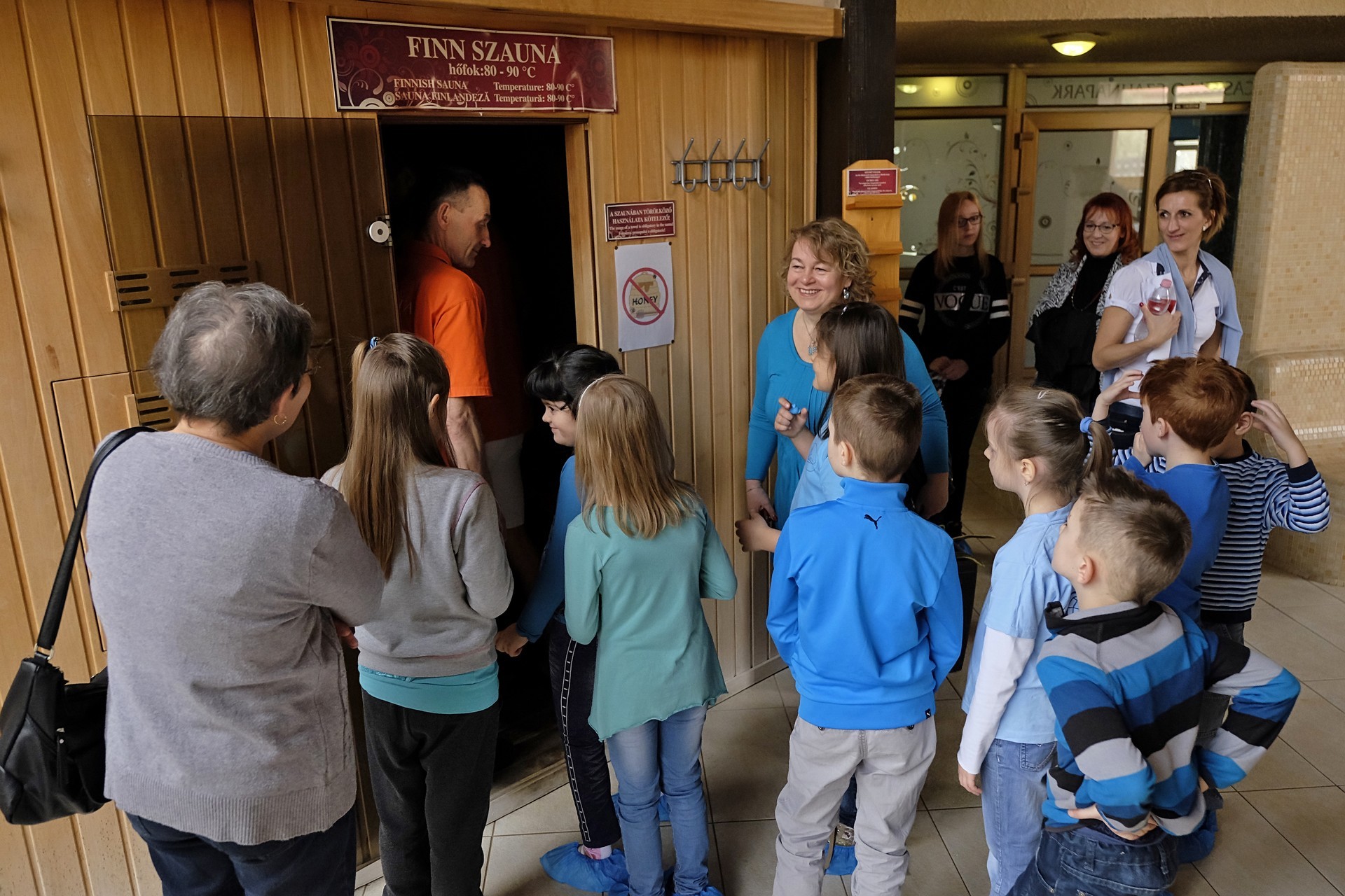 A séta a wellnessrészlegen folytatódott, majd a kicsik azt is megtekinthették, mi történik egy szaunaszeánszon, eztán pedig az AquaPalotát vették célba, ahol azt is megtudhatták, hogy annak levegőjét a medencékből leengedett gyógyvíz melegíti. Végül a csapat annak pincéjébe indult, és a berendezést működtető hőszivattyűt is megnézhette a nem mindennapi nyílt napon.
