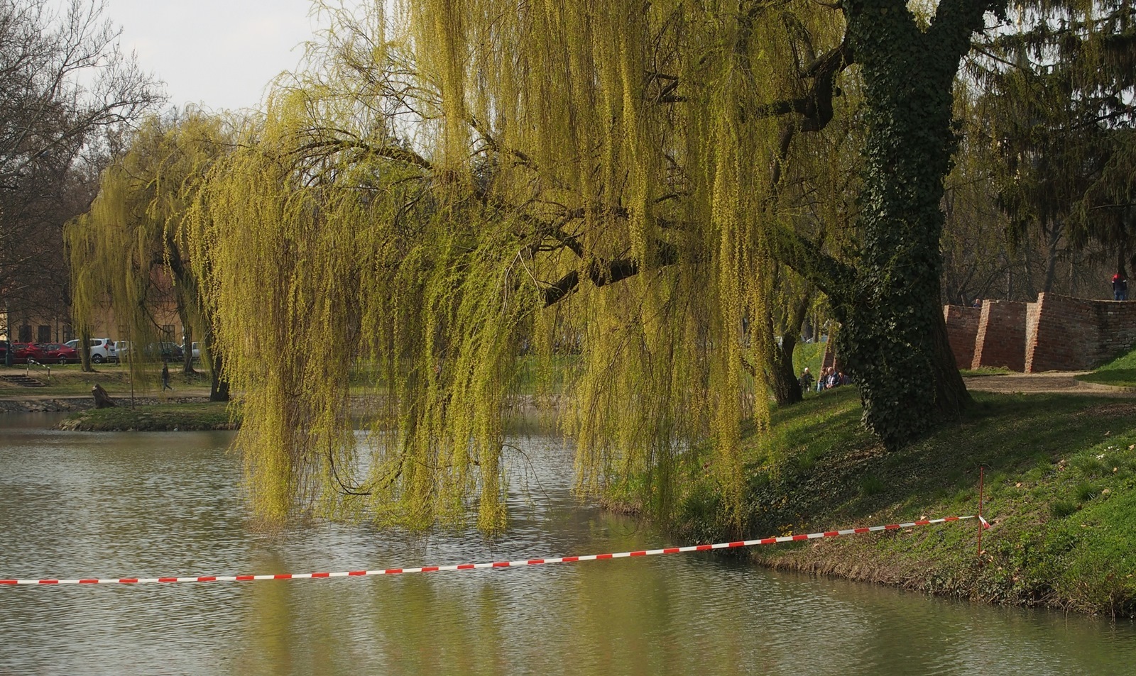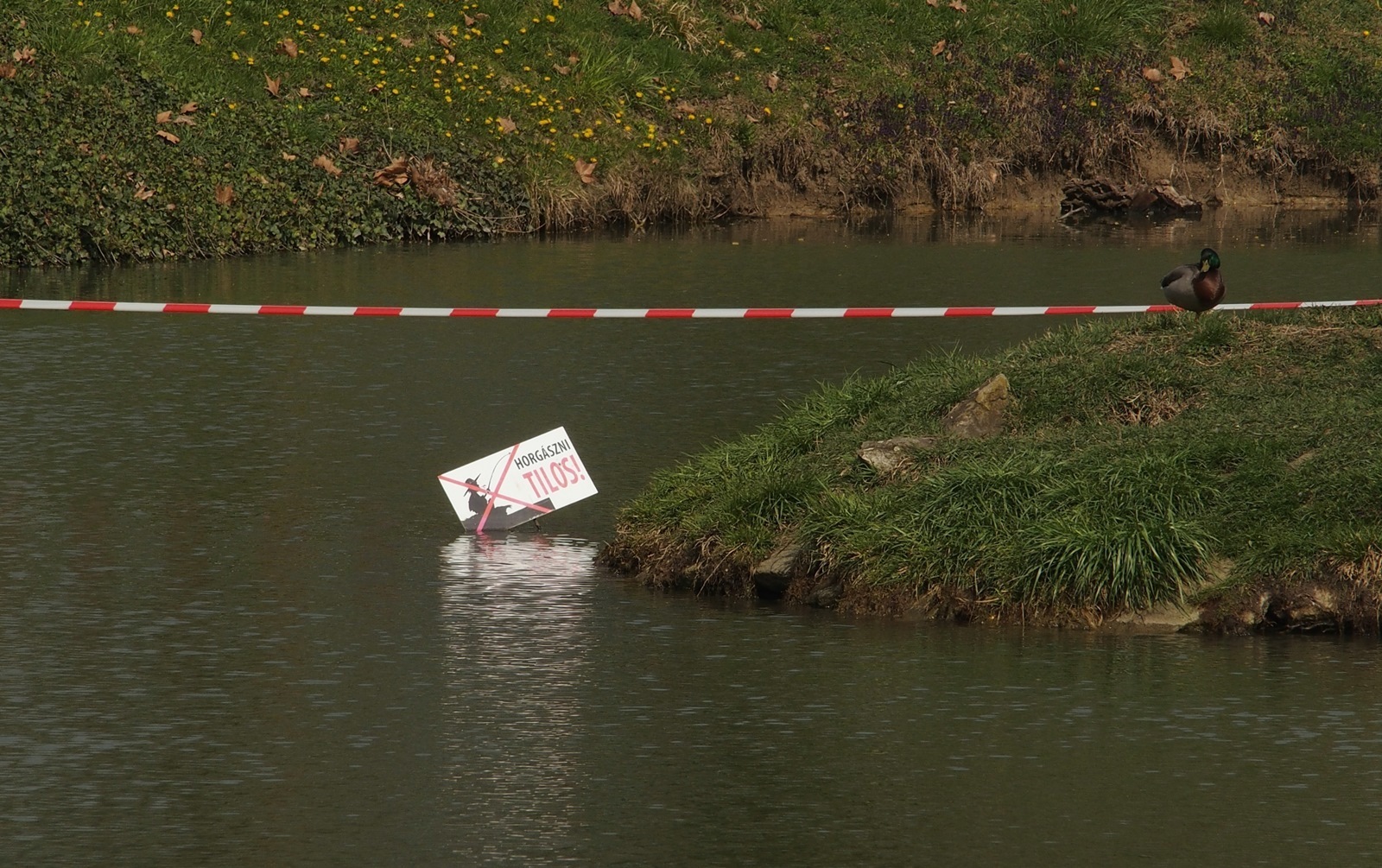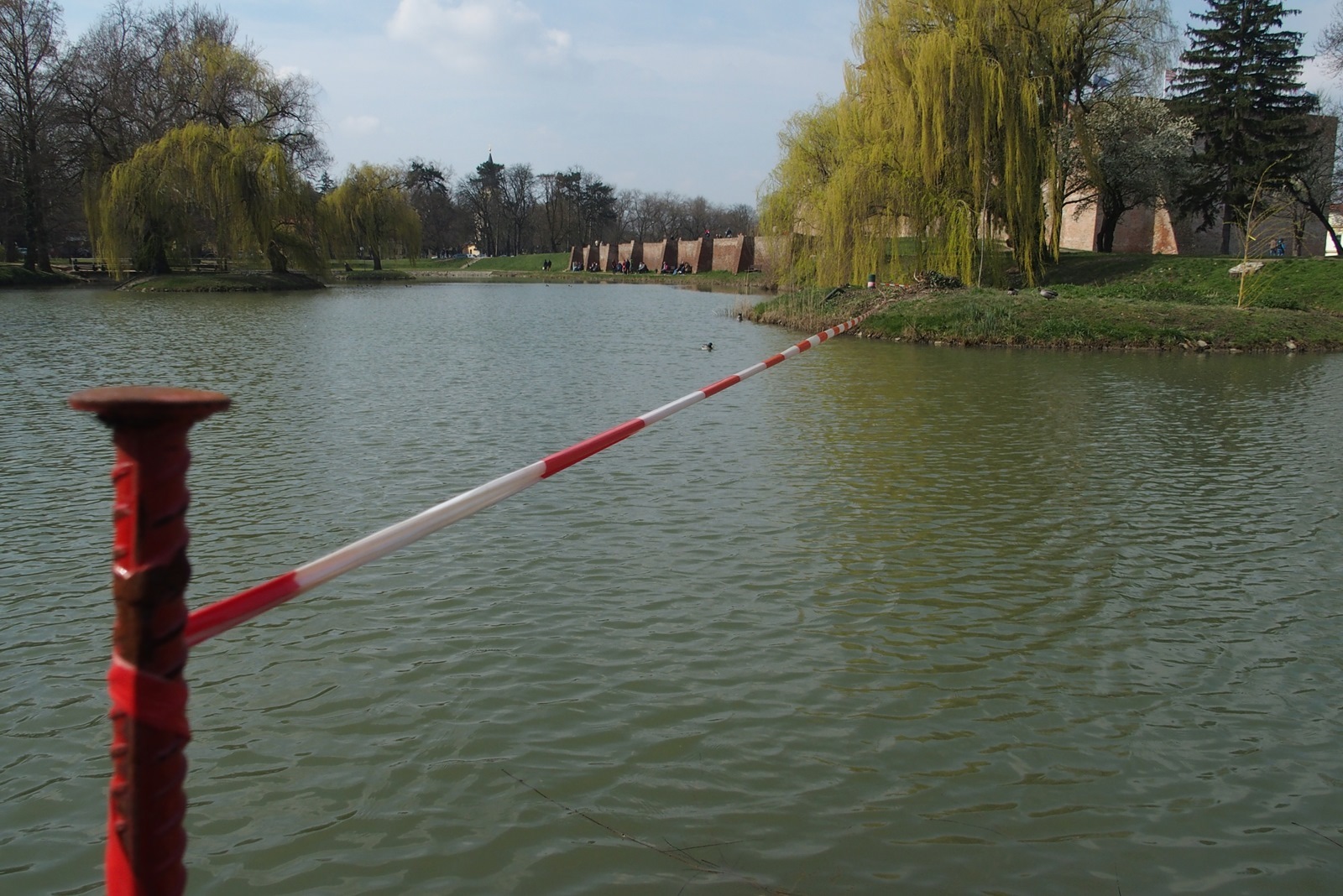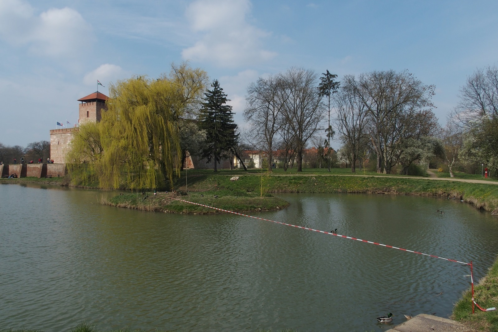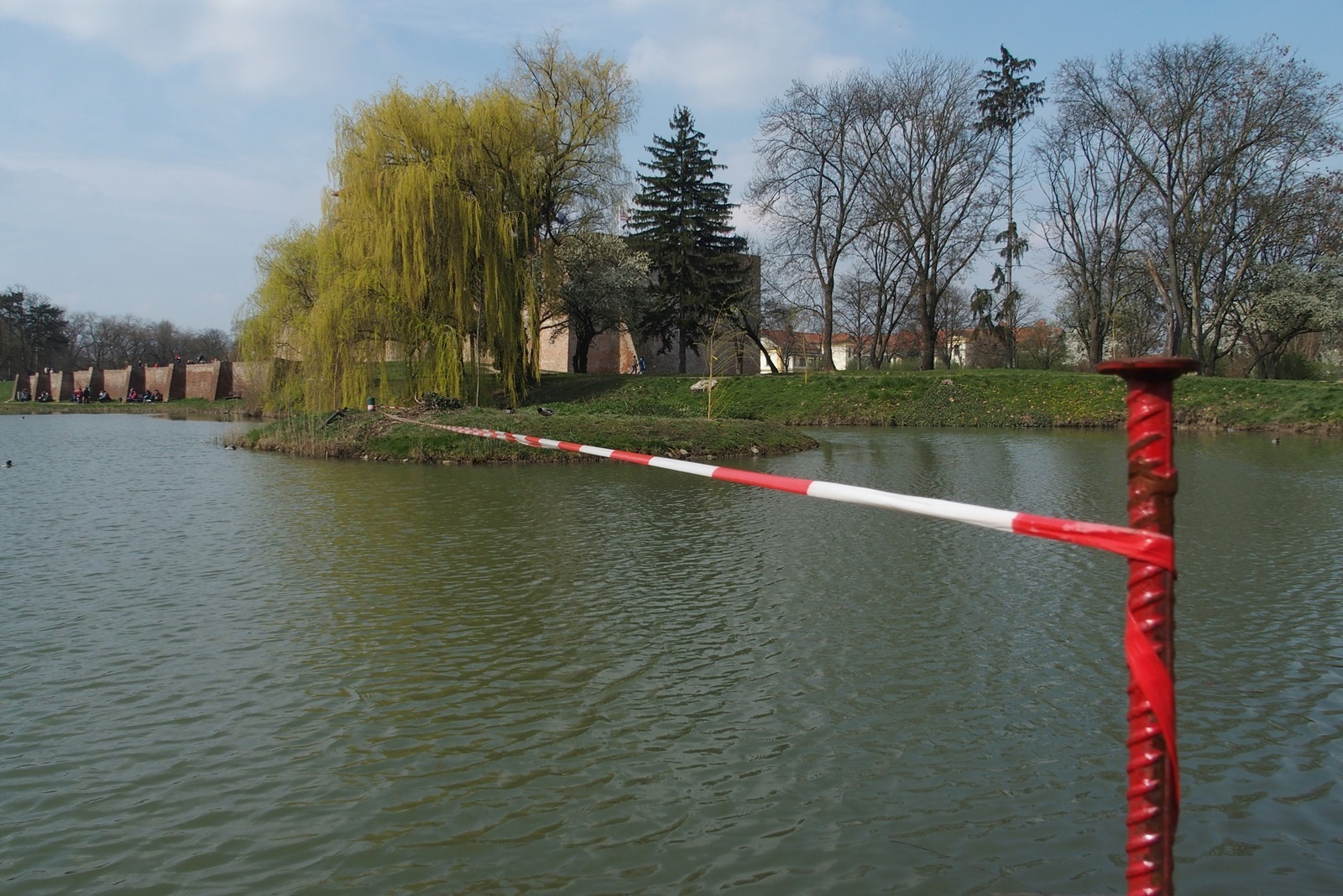 Szép tavaszi hétvége volt. A gyulai várhoz is sok helyi és turista látogatott ki, élvezték a nap melengető sugarait, a várkert romantikus hangulatát. Ilyenkor rengeteg fotó készül és kerül a vendégek oldalaira, virtuális postaládájába. Mi tudjuk, de a vendégek nem: a szalag azt jelzi a tavon, hogy azon túl vékony a jég, korcsolyázni veszélyes! Ne mondjuk meg nekik. Higgyék csak azt, hogy ott horgászni tilos! Vagy jelezze a vékony jeget továbbra is? Rendben, de akkor várjunk még április elsejéig!