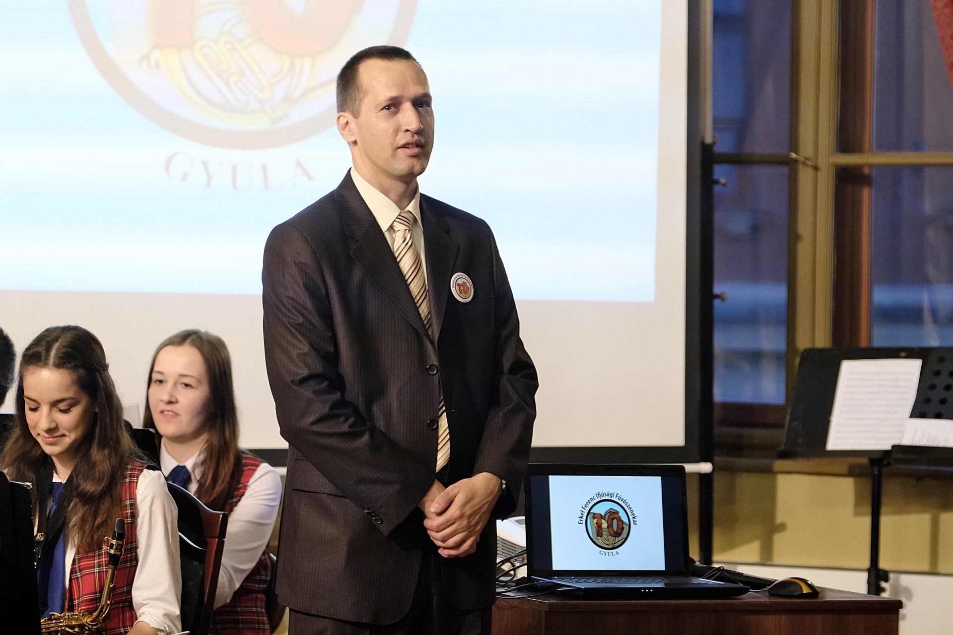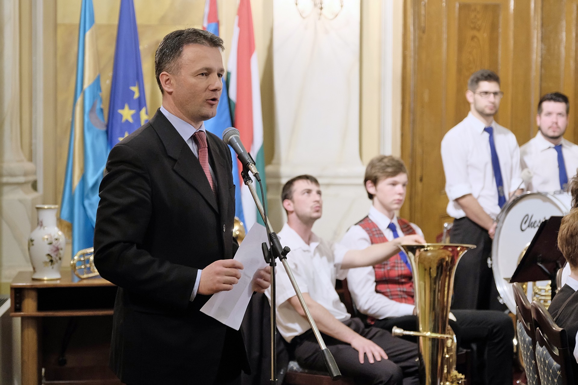 A városvezető a zenei hatás tudományos kutatással kimutatott fontosságára és közösségteremtő hatására is kitért, majd személyes élménnyel alátámasztva hangsúlyozta Bogdán Gábor, az Erkel Ferenc Ifjúsági Fúvószenekar karnagyának érdemeit.