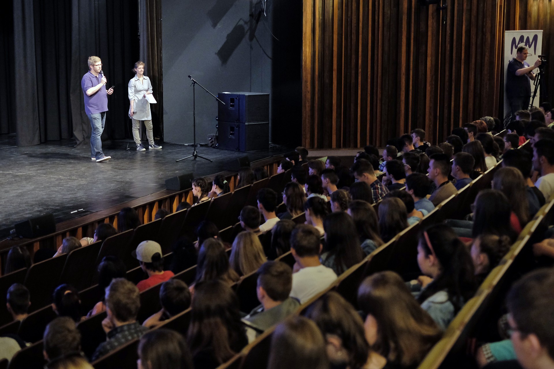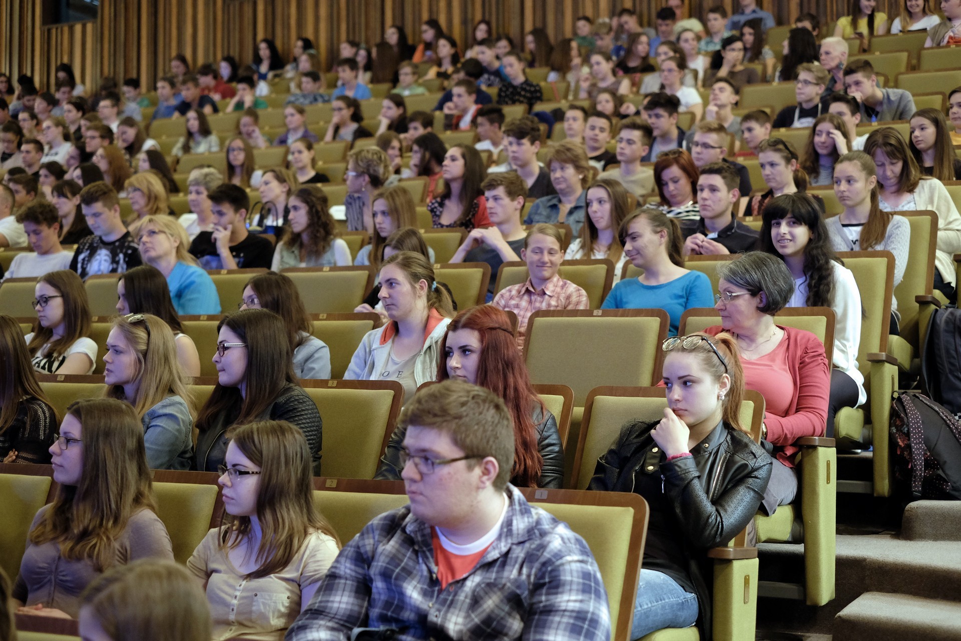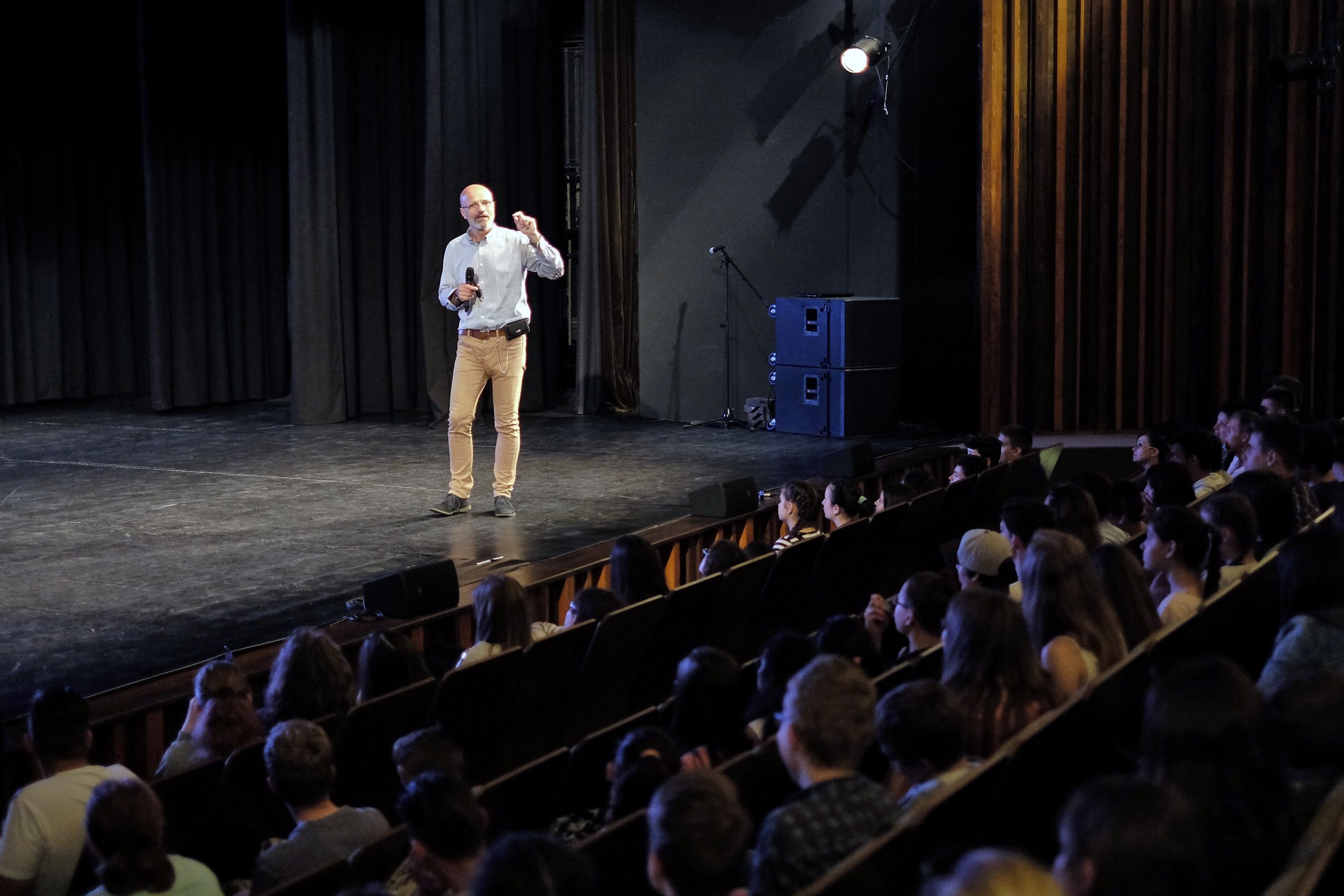 Ennek mintegy áttekintését tartották 13.30-tól az épület színháztermében, amíg – az önhibáján kívül késésbe került – dr. Zacher Gábor érkezésére vártak. A népszerű toxikológus aztán egyenesen a színpadra érkezett, és máris a tőle várt témába, a fiatalok drogkérdésébe vetette magát, és a nézőtéren helyet foglaló általános és középiskolás diákokat.