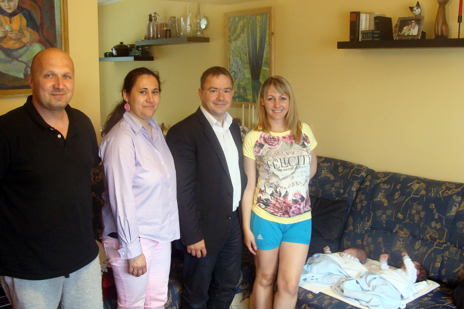 Kónya István alpolgármester, a kerület képviselője és Galyas Tiborné, a Gyulai Kreatív Varrónők Szövetkezetének munkatársa köszöntötte május 25-én az újszülött ikreket, Szathmáry Bencét és Botondot, valamint szüleit, Szathmáry-Bősz Mónikát és Szathmáry Zsoltot.