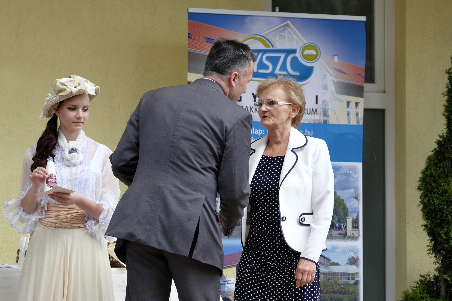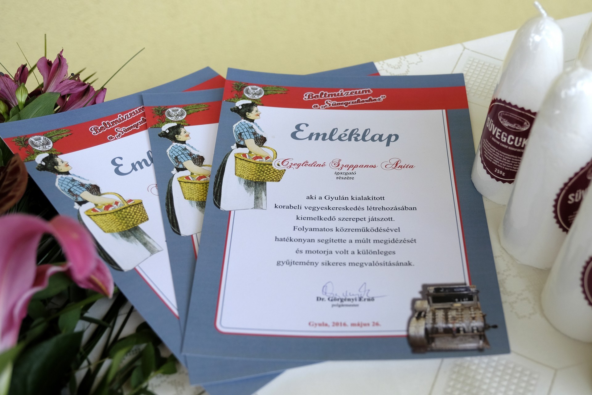 A megnyitó végén a köszönet percei következtek. Emléklapot, virágot és cukorsüveget vehetett át Czeglédiné Szappanos Anita, Pammer István és Török Róbert, de süvegcukros „elismerést” vehettek át a kollégák, a tanulók, a támogatók és a segítők is. Végezetül a szalag ünnepélyes átvágása után a boltmúzeum helyiségének bejárása, valamint a ritka eszközök és tárgyak megcsodálása következett. A bolt kialakítása lenyűgöző és hiteles képet ad a hajdan kor kereskedelmi egységéről.