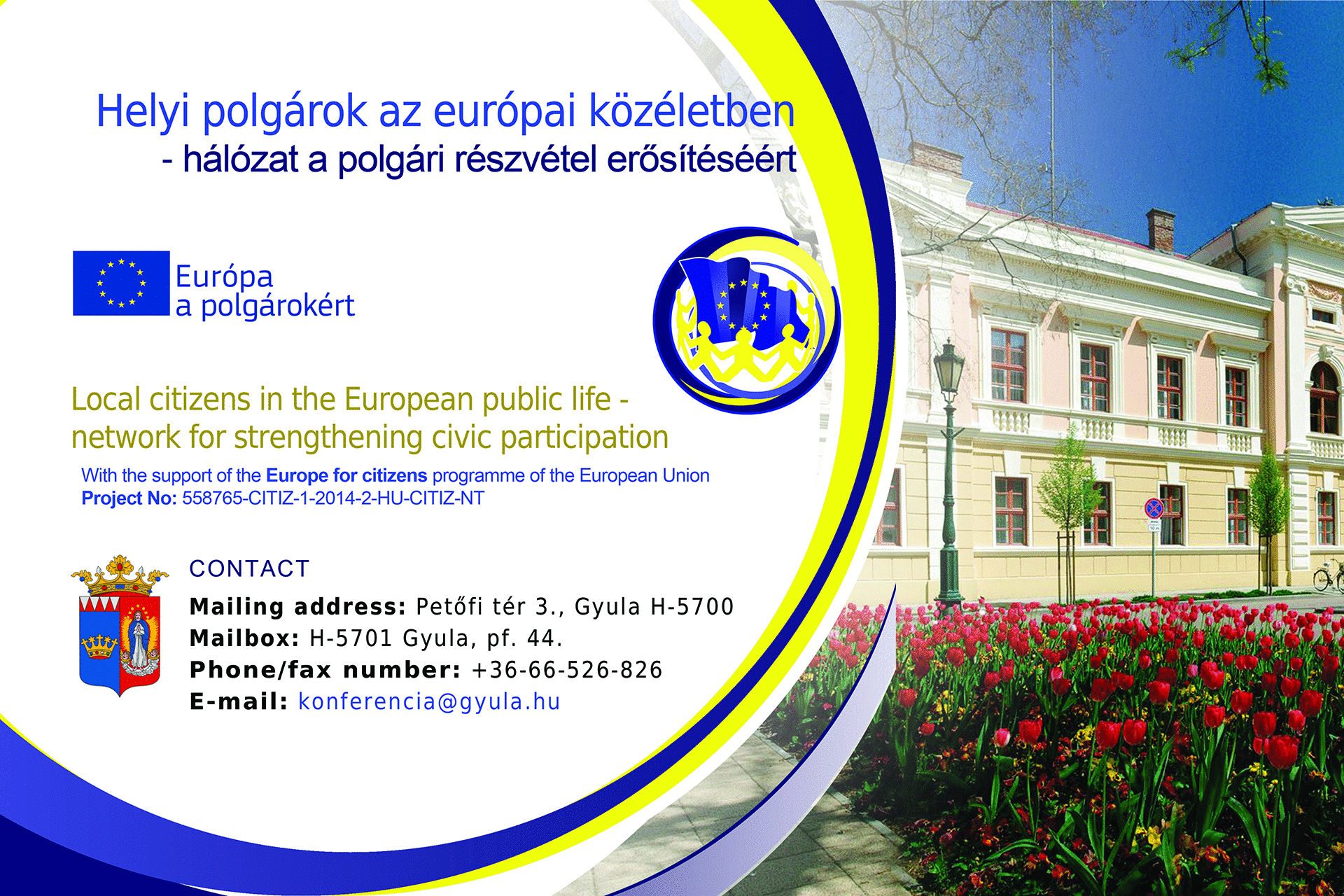 A „Helyi polgárok az európai közéletben – hálózat a polgári részvétel erősítéséért” (Az Európa Unió, Európa a polgárokért program támogatásával ● Project No: 558765-CITIZ-1-2014-2-HU-CITIZ-NT) című hat állomásos testvérvárosi konferencia záróeseménye a projektgazda városában, Gyulán kerül megrendezésre 2016. június 11-én (szombat) 9.30 órától a Városháza dísztermében (Gyula, Petőfi tér 3.).