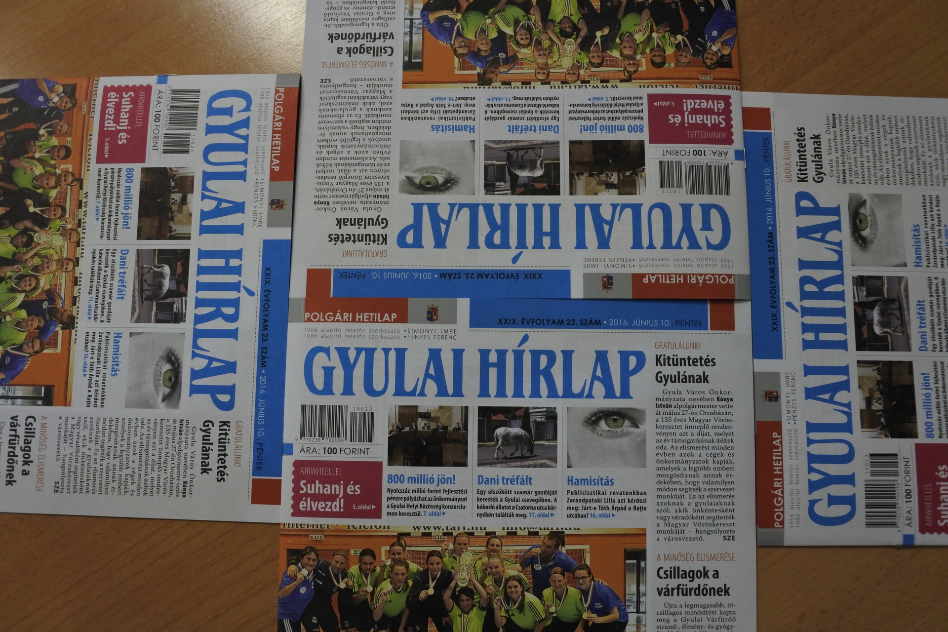 A XXIX. évfolyam 23. számában együtt örülünk a Gyulai Amazonokkal. Aranyérem csillog a futballista leányok nyakában. Viszlát NB II.! Jöhet az NB I.!!! A Magyar Vöröskereszt kitüntetéssel köszönte meg a gyulai véradók segítségét. A Gyulai Várfürdő újra kiérdemelte az 5 csillagot. Ez a Nemzetgazdasági Minisztérium tanúsító védjegye, a minőség garanciája. Legyünk büszkék a fürdőnkre! Az önkormányzat 53 millió forint költ utcák és tereket csinosítására. Súr Enikő a piacon végigkóstolta az összes bogyósgyümölcsöt. Voksát a málna mellett tette el. Az édes élvezet kilója meghaladja a 2000 forintot. Csevegő rovatukban a parasztparkolókról írunk. Több figyelem kellene, uraim, sokkal több. Állásbörze rovatunkban többek között szobalányokat keresünk a Erkel hotelbe, gépkocsivezetőt a mentősökhöz, mosogatóst a Százéves cukrászdába, felszolgálókat a Kézművesbe, eladót élelmiszerüzletbe. Gajda Róbert kormánymegbízottal idéztük fel a trianoni eseményeket június 4-én. Készülünk a Kohán 50’ című kiállításra. Kipróbáltuk az airwheel nevet viselő járműveket. Szemtanút keresünk a rendőrséggel. 800 millió forint fejlesztési pénzre pályázik városunk – részletes testületi beszámolónkat lapunk 7. oldalán olvashatják el. A 87. könyvhét teljes programját megtalálják a Gyulai Hírlapban, tehát kizárt, hogy valamiről lemaradjanak! Rejtő koktéllal is csábítgatunk. A Bi-Tang Flow megírta városunk raphimnuszát, mi pedig megírtuk, hogy ők megírták és megénekelték. Moziban rögzítette anyagát a gyulai Synema zenekar. Dani elment sétálni egyet. Dani egy igazi szamár. Ez az ő igaz történte. A héten is beülhet velünk bárki moziba. Szombaton elmegyünk gazdit keresni Picurnak. Miroslav Zapletal győzelmével zárult a Gyulai Várfürdő Kupa. Dietetikusunk arra próbál meg rávenni minket, hogy együnk salátát és sokat. Szőlőre gerjedő gubacsatkákra vadászunk Pomázi Ferenc kertészünkkel. Bogarásszák az apróhirdetéseket is. Zarándpataki Lillával leleplezünk egy történelmet meghamisító kísérletet. Esőből kevesebb, napsütésből sokkal több jut majd Gyulára.