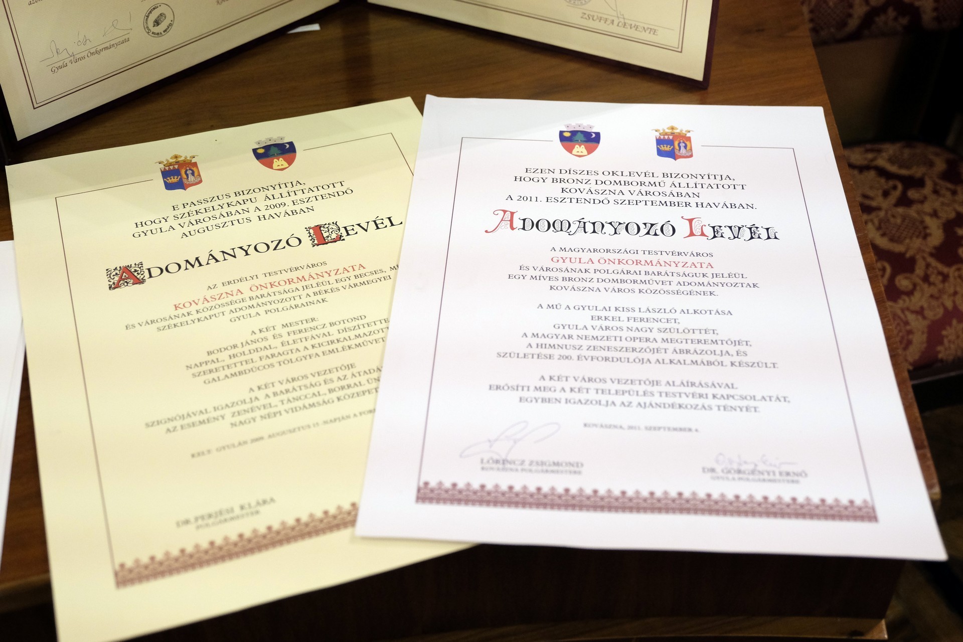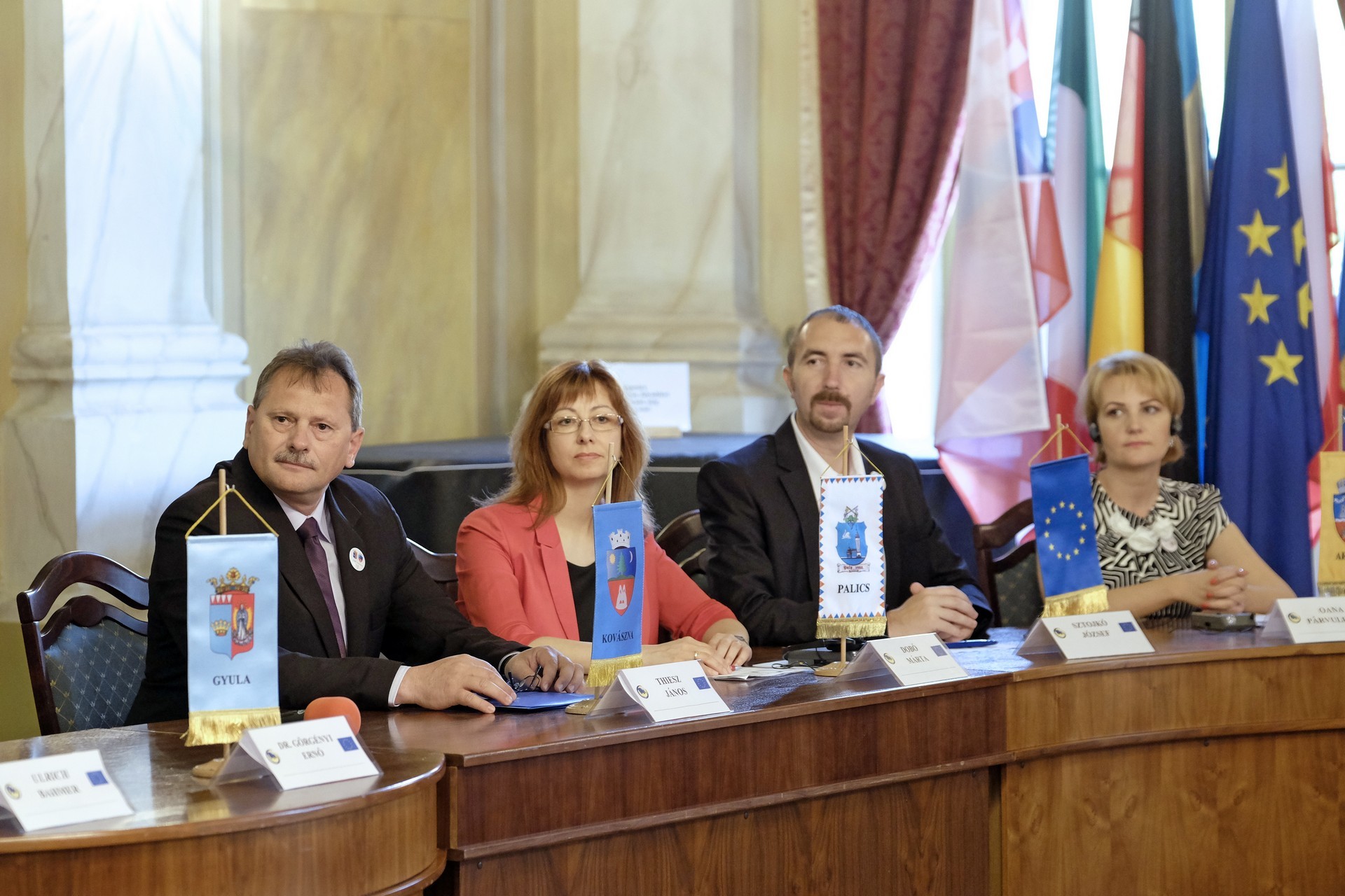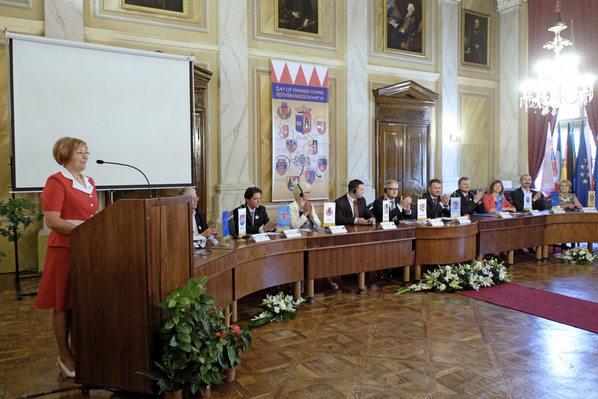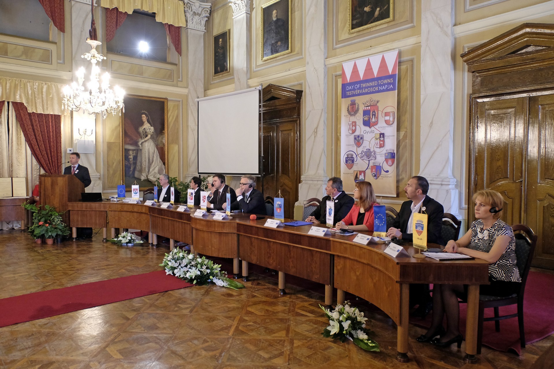 A jubileumi aláírás eseményét köszöntők előzték meg, közöttük az első dr. Görgényi Ernő polgármesteré volt. A gyulai városvezető gondolatait egy Cicero-idézettel kezdte: „Bárcsak olyan könnyen megtalálhatnám az igazat, mint ahogy cáfolom a hamisat”. Manapság talán nehezebb az igazság közelébe férkőzni, mint korábban, de van rá mód: valódi kapcsolatok kellenek hozzá – utalt a testvérvárosokkal való együttműködés fontosságára a polgármester.