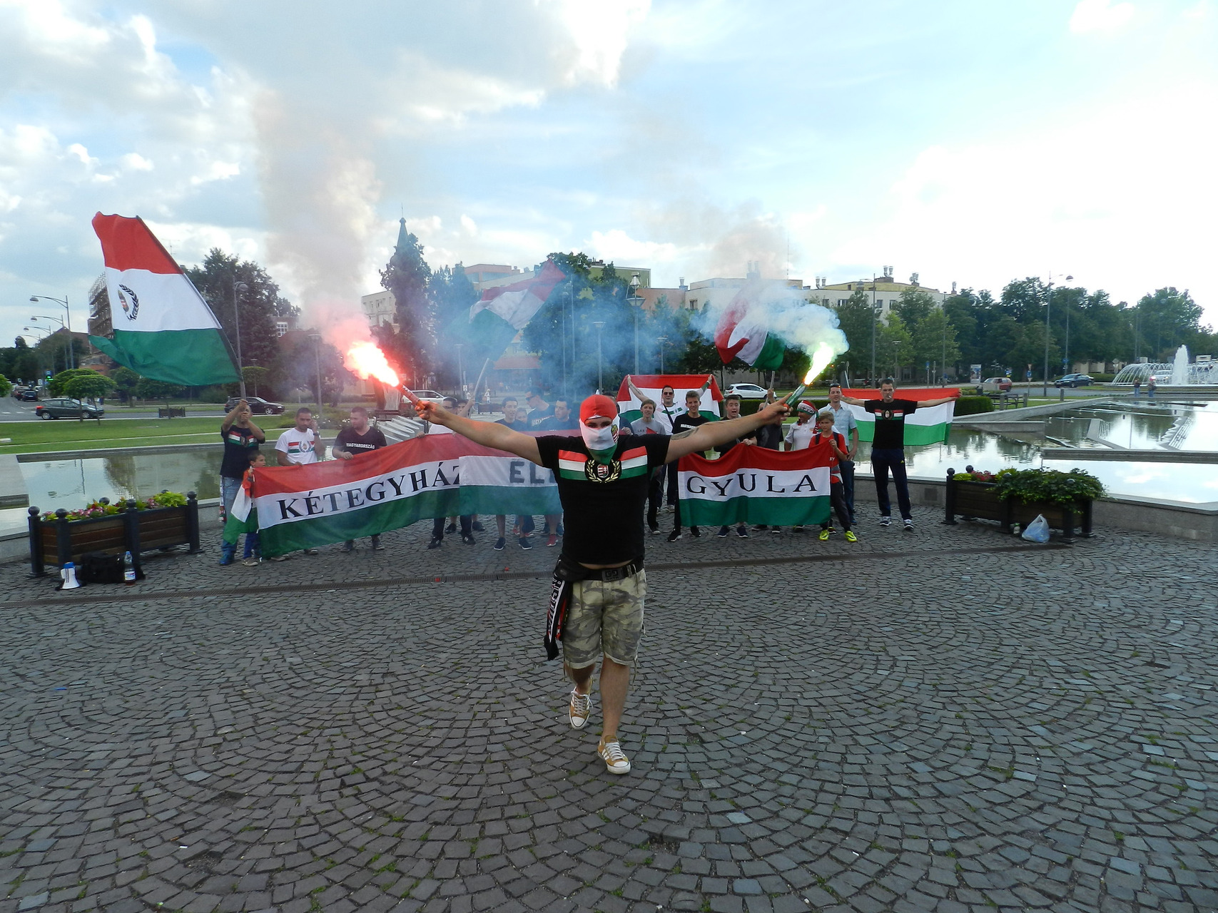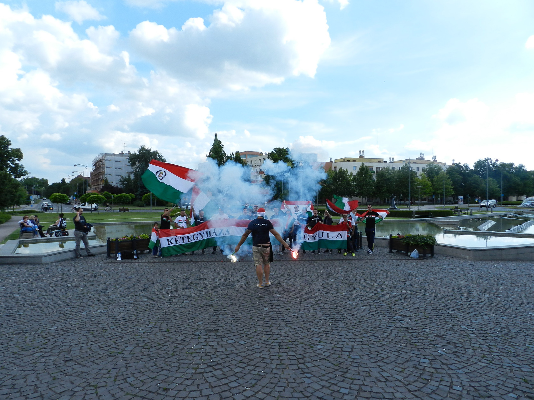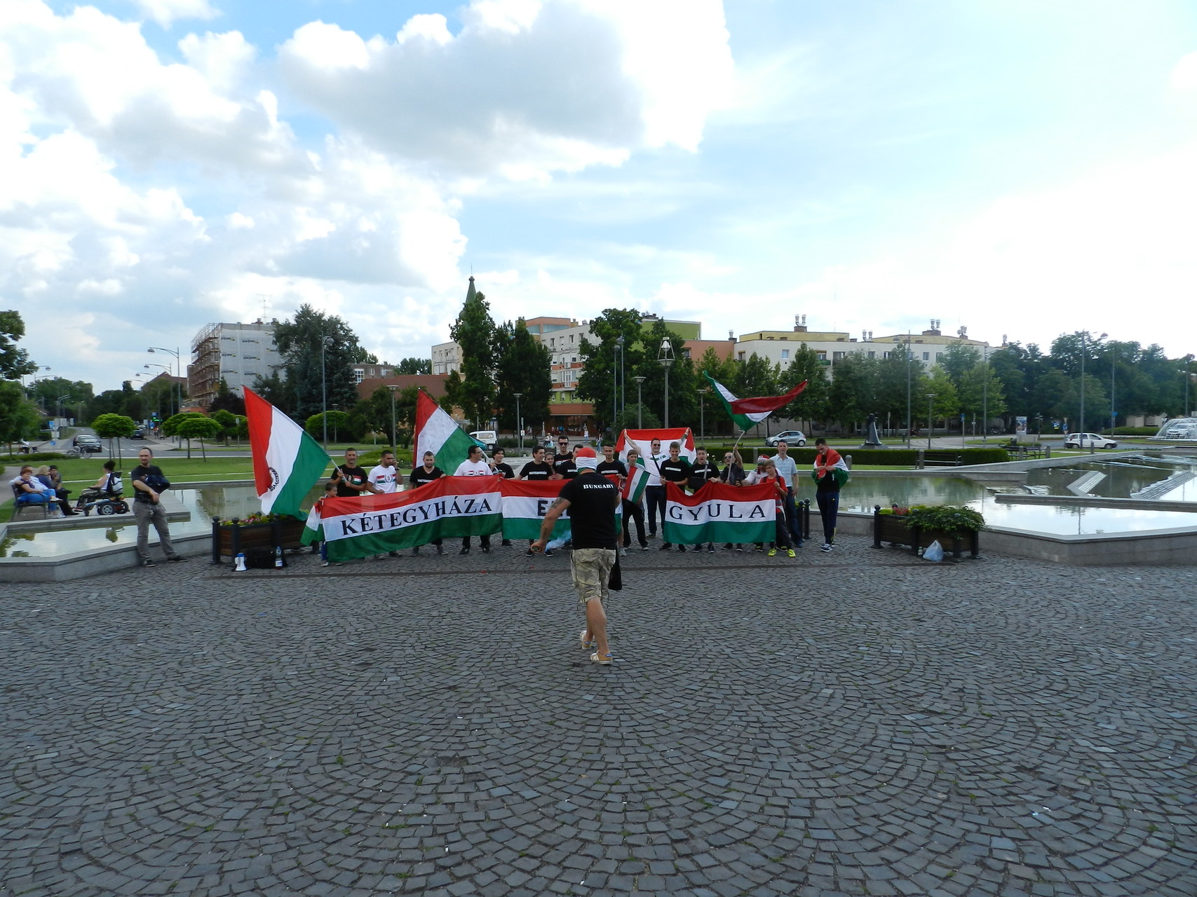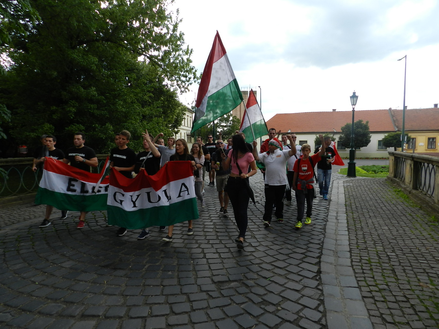 A közös élmény egy felvonulással kezdődött, ahol gyulai, eleki és kétegyházi szurkolók kezdték meg a hangolódást, valamint próbálták feltüzelni a város lakóit. A Kossuth tértől egészen a Rondelláig énekeltek, elhangzottak a legismertebb szurkolói rigmusok, és persze nem maradhatott el a válogatott hivatalos a dala, az „Éjjel soha nem érhet véget”. A Rondellánál már tömeg várta a felvonulókat, ahol a Himnusz elhangzása alatt nemzeti színű füstölőket gyújtottak a szurkolók, hogy még tovább fokozzák a hangulatot.