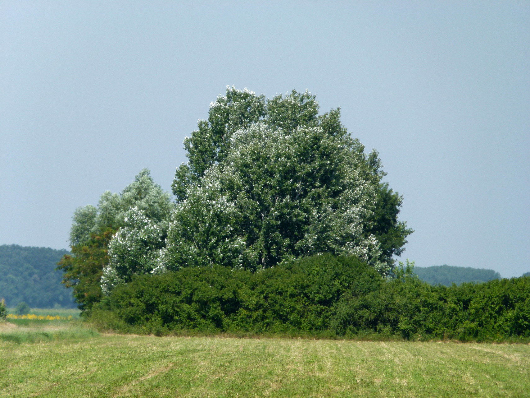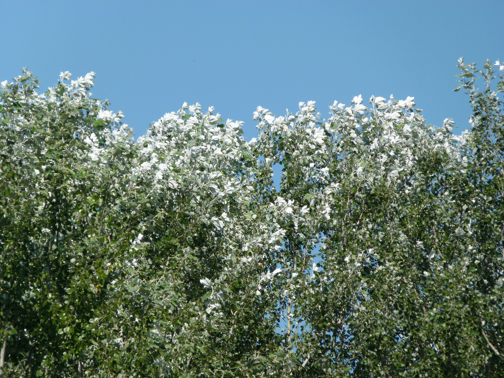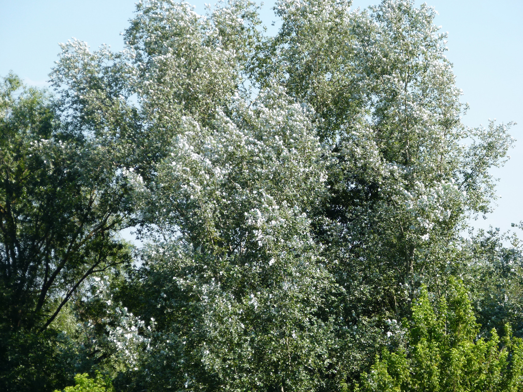 A képen látható „havas” lombozat a fehér nyár sajátja. A populus alba a fűzfafélék családjába tartozik, és kedveli a nedves területeket. Mi is a Körös folyó partján találtunk rá. A havas jellegét az adja, hogy leveleinek fonákja ezüstös-fehéres, így amikor a szél visszafelé fújja a leveleket, előtűnik megtévesztő és egyben gyönyörű jellegzetessége.