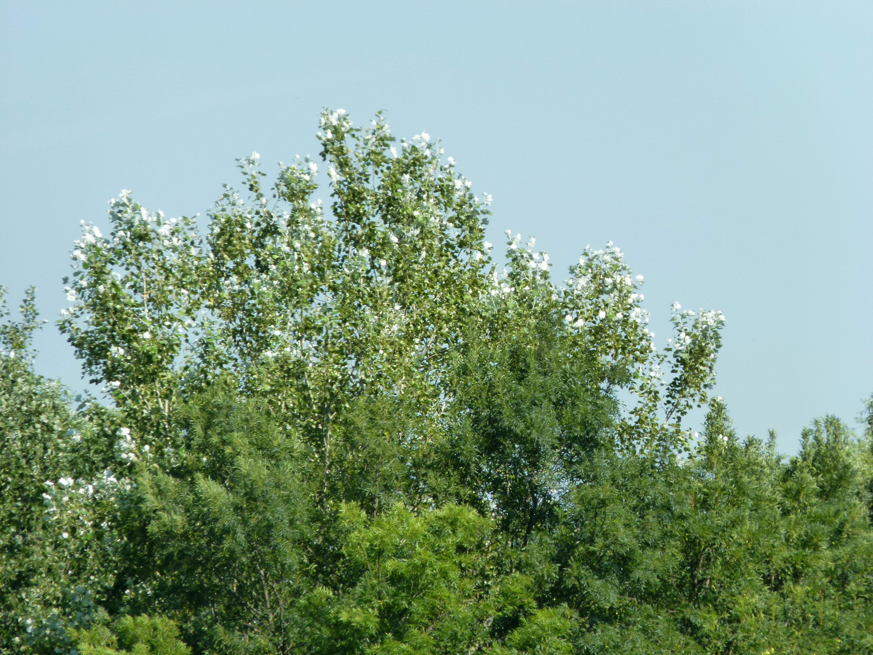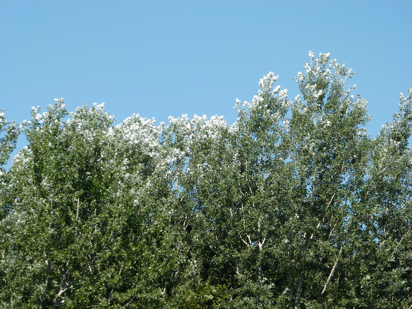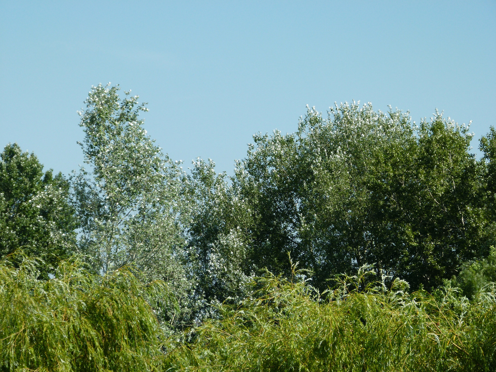 A képen látható „havas” lombozat a fehér nyár sajátja. A populus alba a fűzfafélék családjába tartozik, és kedveli a nedves területeket. Mi is a Körös folyó partján találtunk rá. A havas jellegét az adja, hogy leveleinek fonákja ezüstös-fehéres, így amikor a szél visszafelé fújja a leveleket, előtűnik megtévesztő és egyben gyönyörű jellegzetessége.