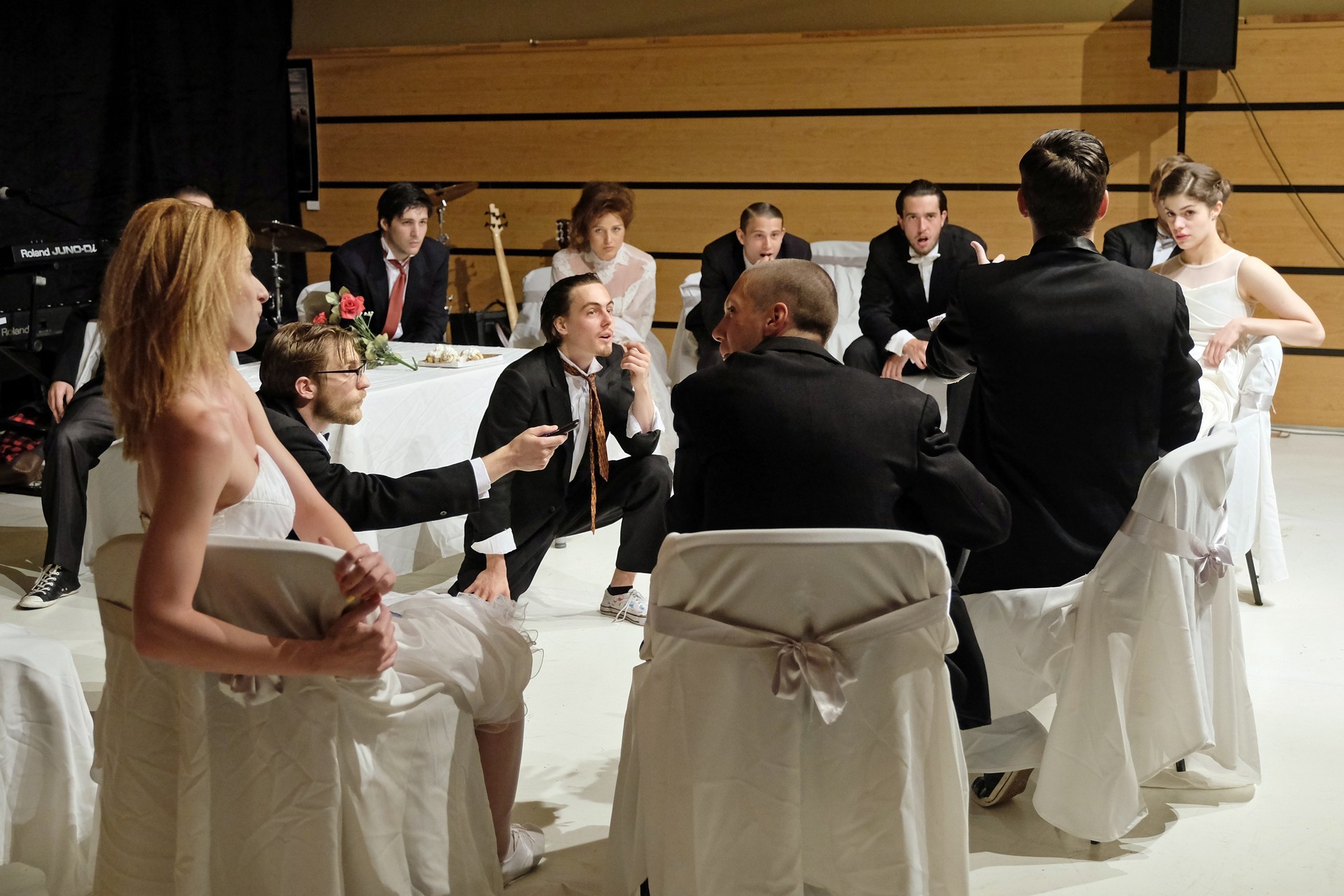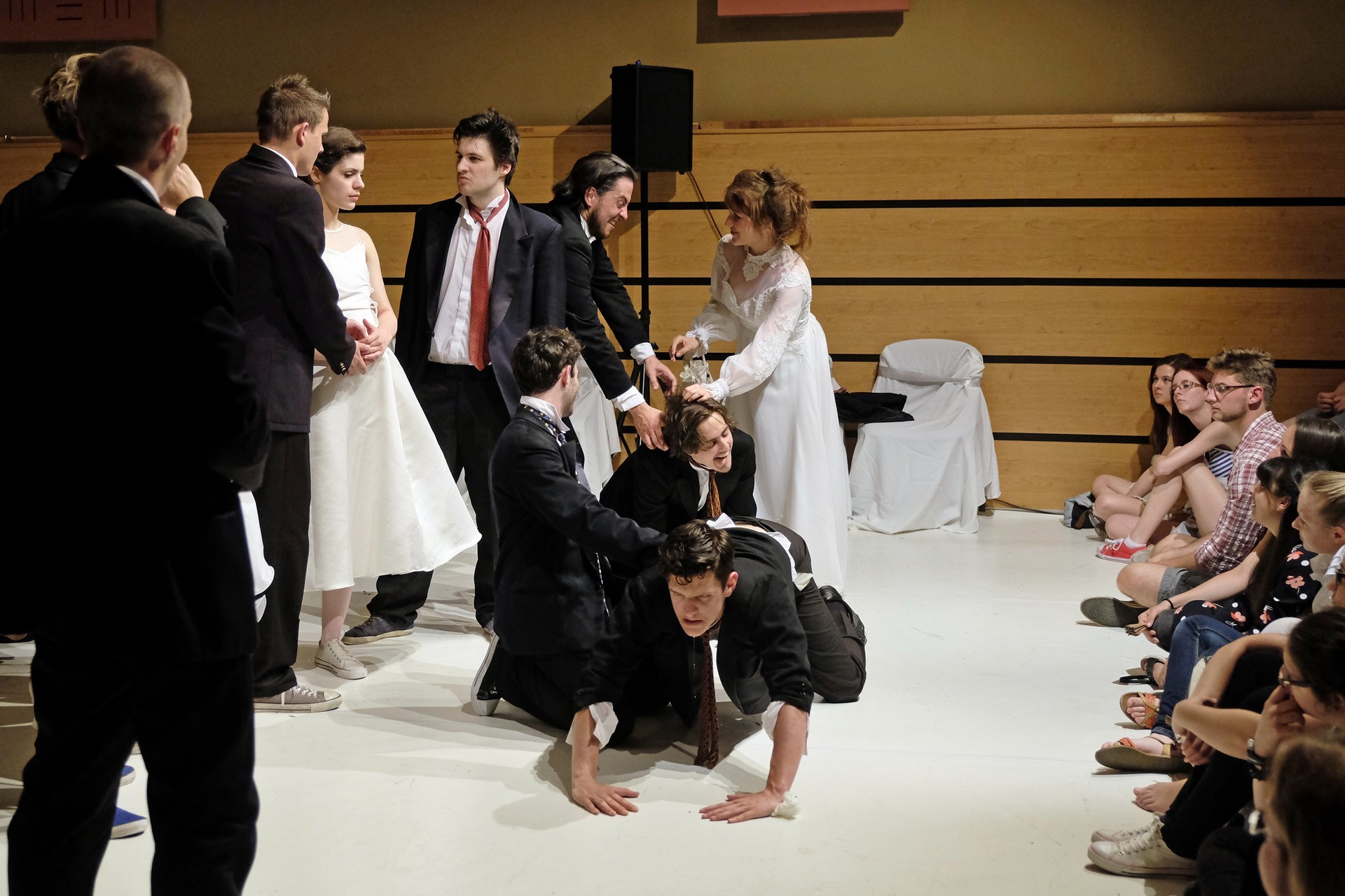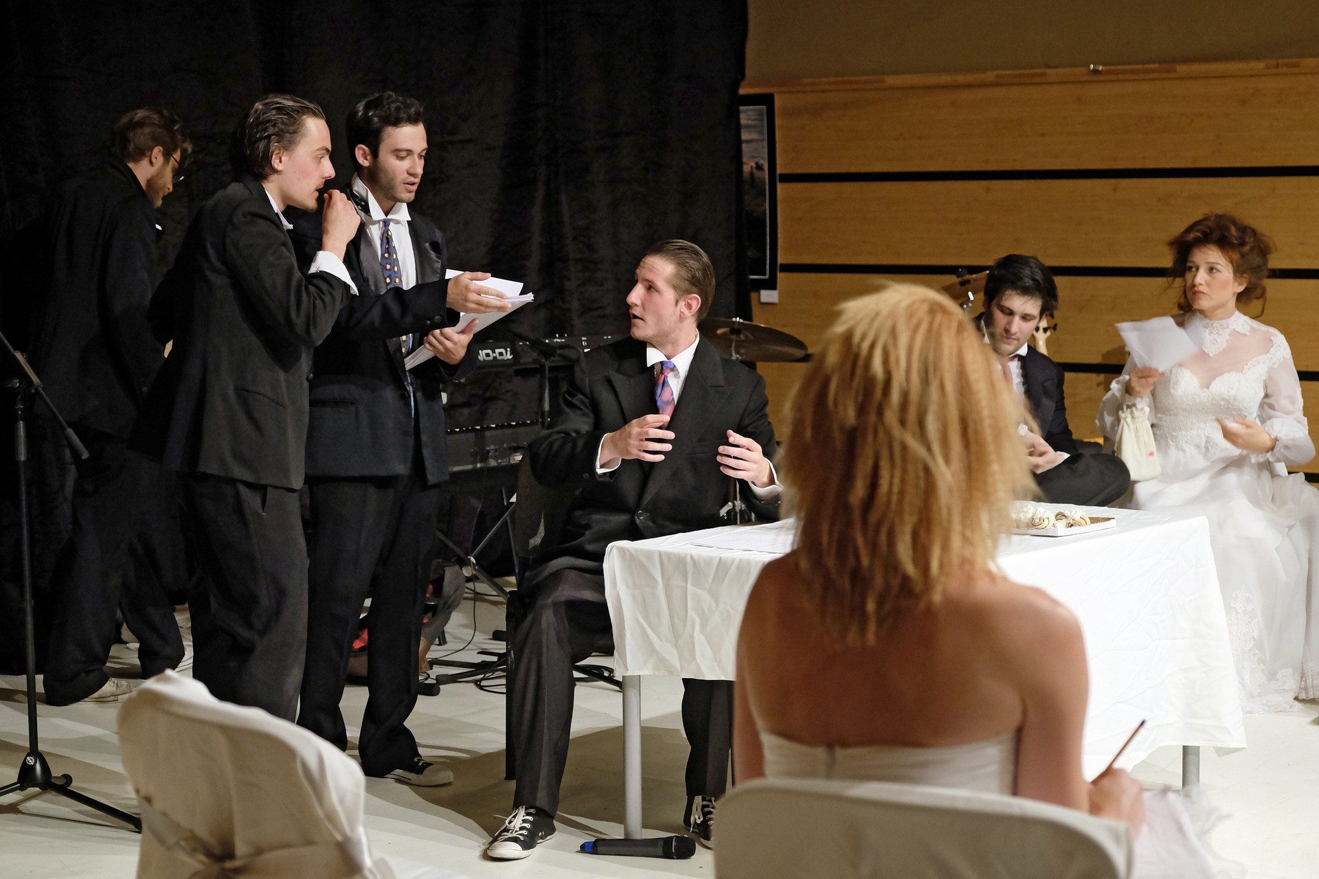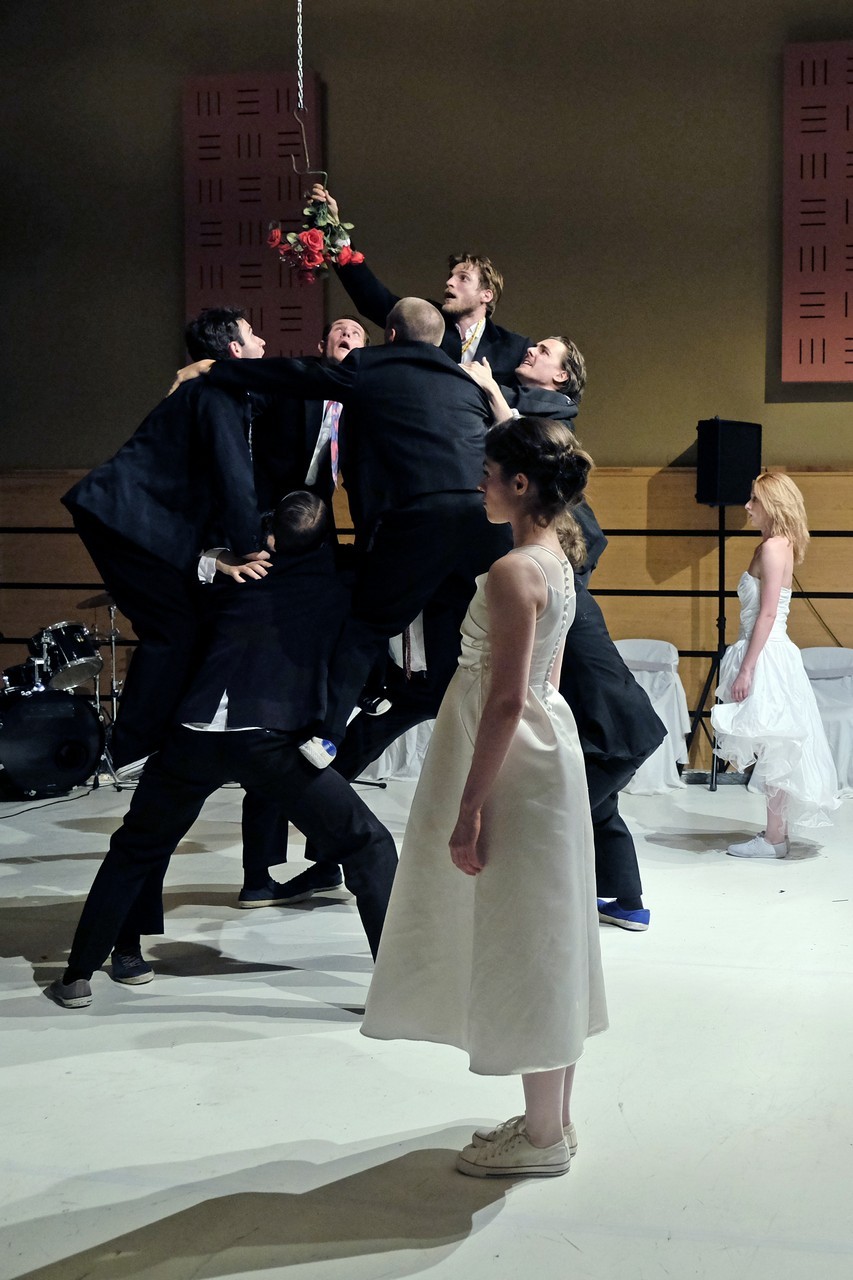 A darab közjátékában ezúttal nem mesteremberek készülnek Théseus és Hyppolita (Kiss Andrea) esküvőjére, hanem a fiatal színészek önmagukat megformálva készülnek a Piramusz és Tiszbe című darabbal. Olasz Renátó nagy beleéléssel rendezné a darabot, de meggyűlik a baja a túlbuzgó előadókkal. Gyöngyösi Zoltán, a címszerepet megkapva sztárként viselkedik, tőle kapjuk meg a jó színész három fő ismérvét, amelyek a szövegtudás, pontosság és az a kis titok, a plusz, amit beleviszel a karakterbe. A tanácsokat mindenki szeretné megfogadni: Ember Márk, az Oroszlán megformálója, minden áron szeretne levetkőzni, Georgita Máté Dezső hangot ad annak, hogy miért neki kell mindig a nőt játszania, Medveczky Balázsra a Fal szerepe jut, ő azonban ebben is megtalálja a kihívást, egészen felhőtlen perceket okozva ezzel a közönségnek.