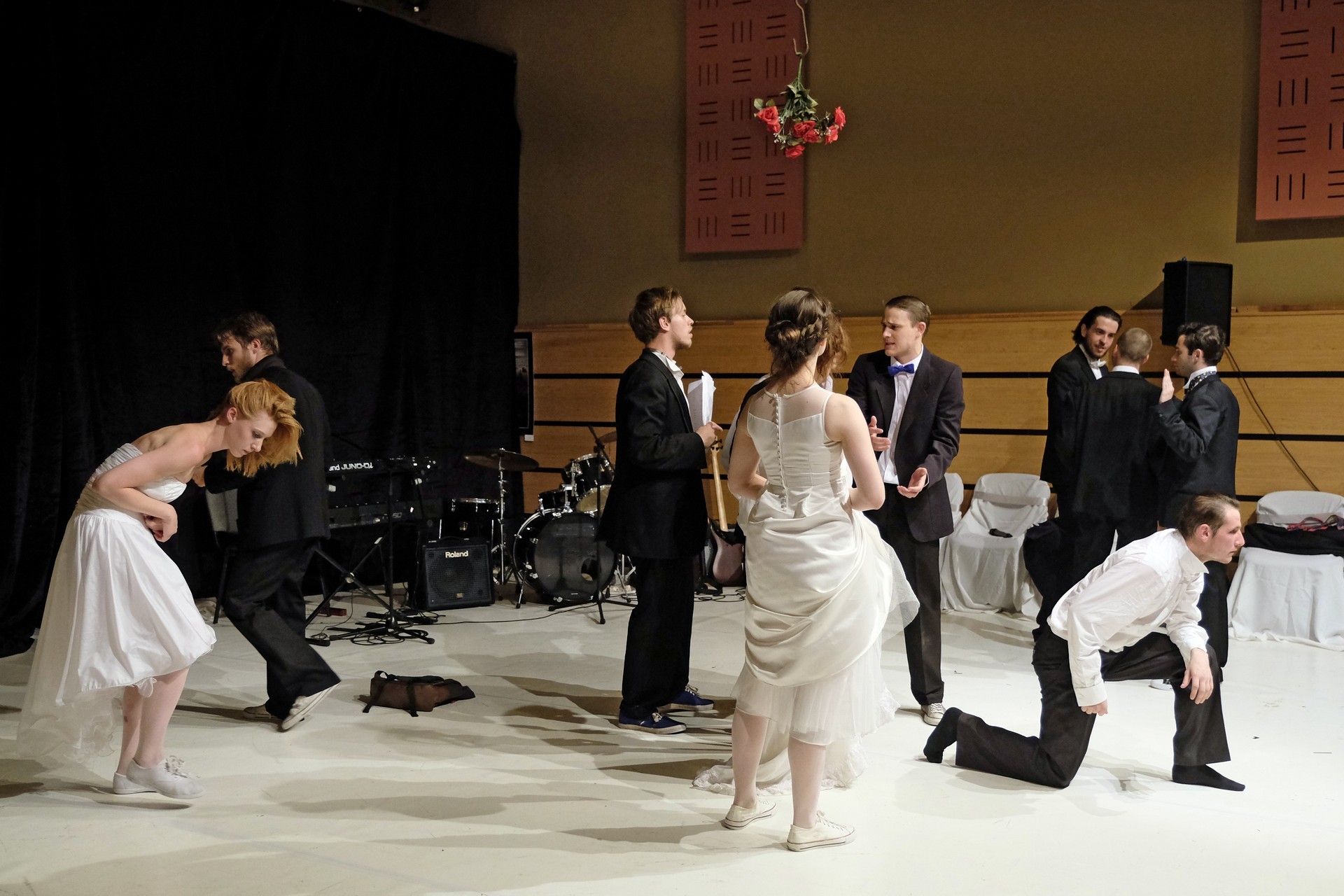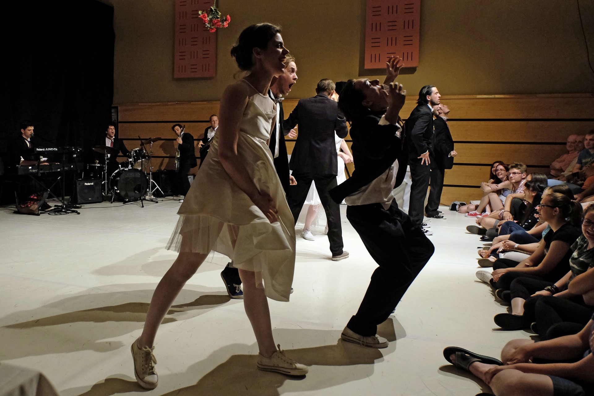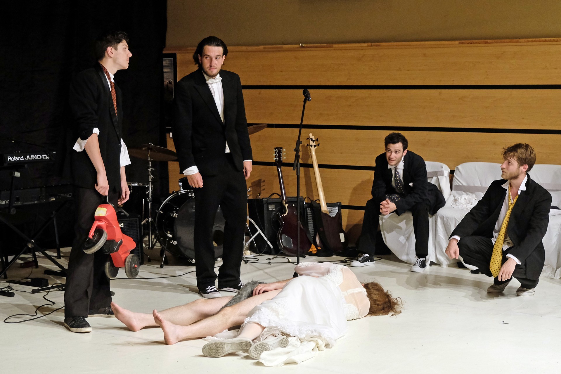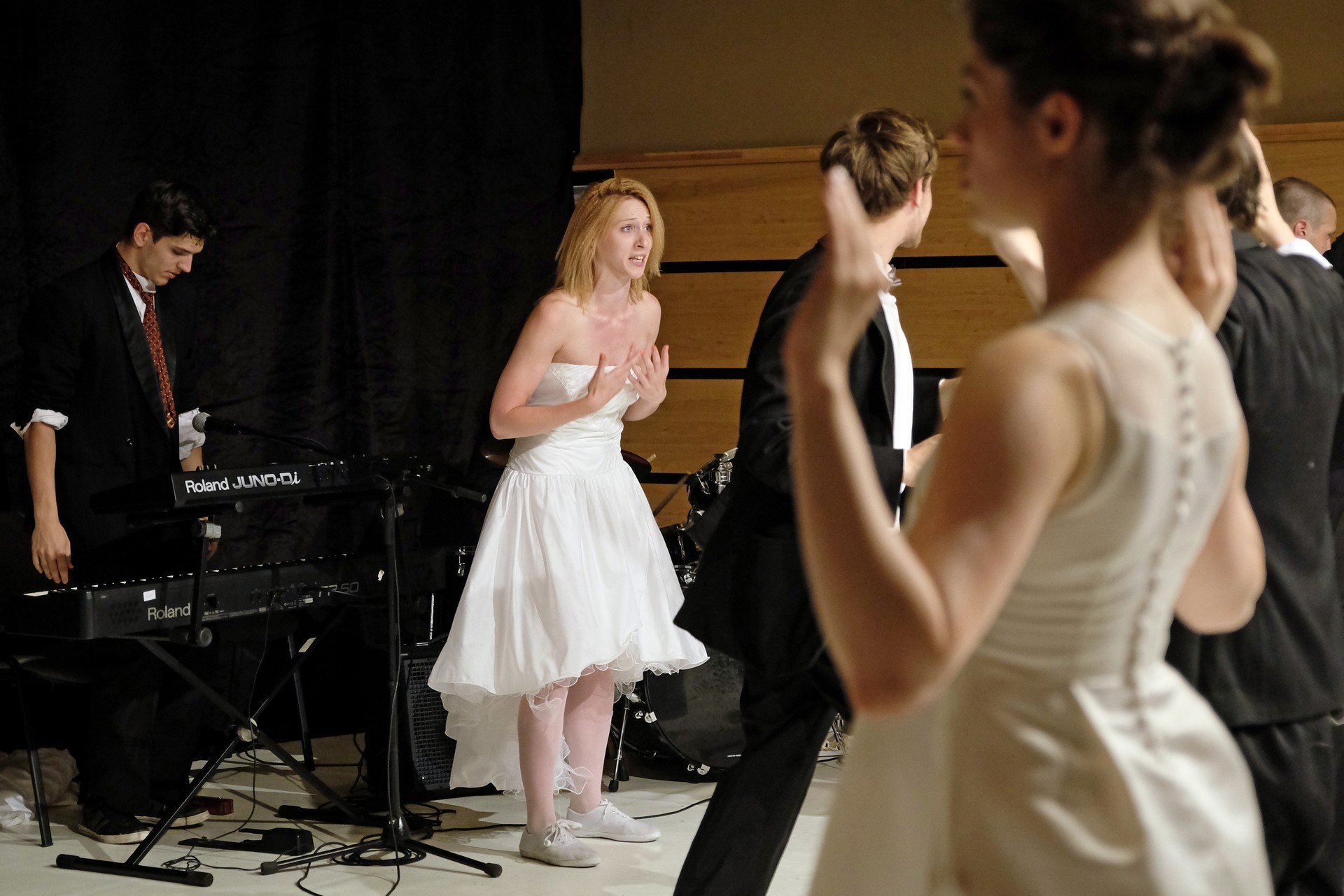 A darab közjátékában ezúttal nem mesteremberek készülnek Théseus és Hyppolita (Kiss Andrea) esküvőjére, hanem a fiatal színészek önmagukat megformálva készülnek a Piramusz és Tiszbe című darabbal. Olasz Renátó nagy beleéléssel rendezné a darabot, de meggyűlik a baja a túlbuzgó előadókkal. Gyöngyösi Zoltán, a címszerepet megkapva sztárként viselkedik, tőle kapjuk meg a jó színész három fő ismérvét, amelyek a szövegtudás, pontosság és az a kis titok, a plusz, amit beleviszel a karakterbe. A tanácsokat mindenki szeretné megfogadni: Ember Márk, az Oroszlán megformálója, minden áron szeretne levetkőzni, Georgita Máté Dezső hangot ad annak, hogy miért neki kell mindig a nőt játszania, Medveczky Balázsra a Fal szerepe jut, ő azonban ebben is megtalálja a kihívást, egészen felhőtlen perceket okozva ezzel a közönségnek.