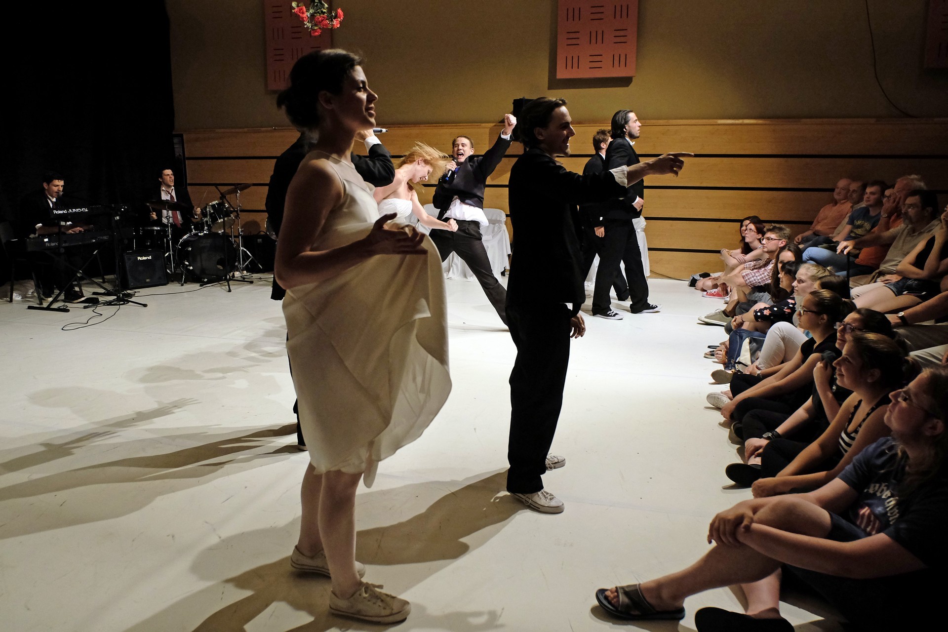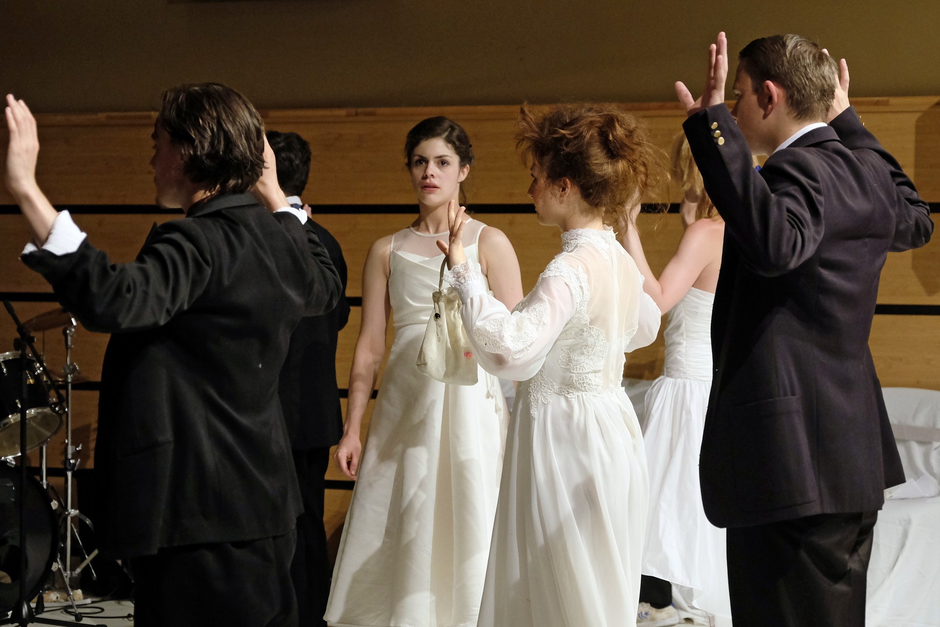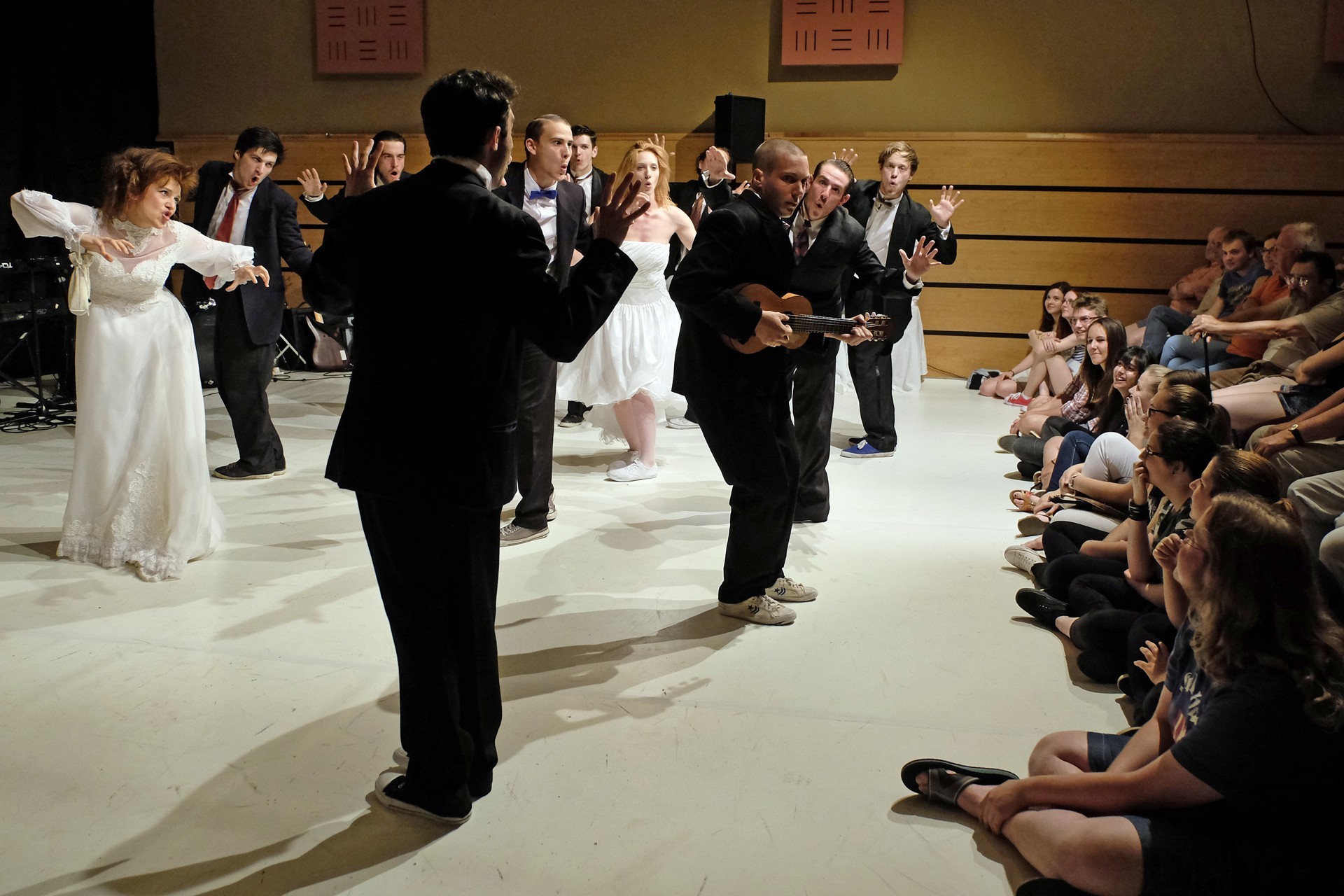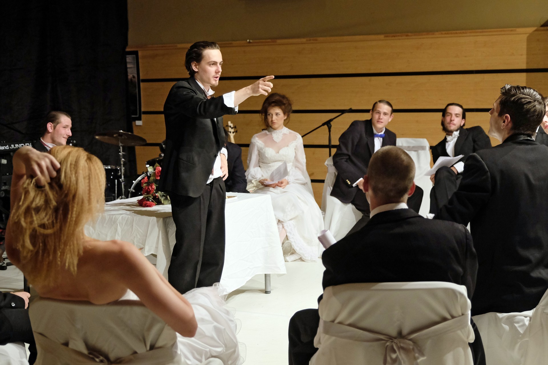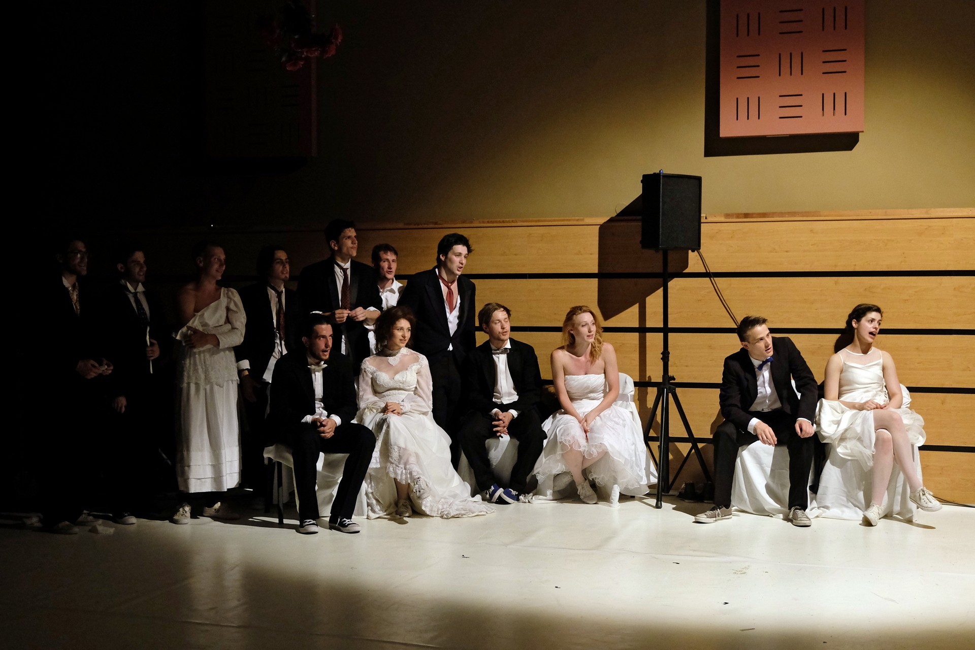 A darab közjátékában ezúttal nem mesteremberek készülnek Théseus és Hyppolita (Kiss Andrea) esküvőjére, hanem a fiatal színészek önmagukat megformálva készülnek a Piramusz és Tiszbe című darabbal. Olasz Renátó nagy beleéléssel rendezné a darabot, de meggyűlik a baja a túlbuzgó előadókkal. Gyöngyösi Zoltán, a címszerepet megkapva sztárként viselkedik, tőle kapjuk meg a jó színész három fő ismérvét, amelyek a szövegtudás, pontosság és az a kis titok, a plusz, amit beleviszel a karakterbe. A tanácsokat mindenki szeretné megfogadni: Ember Márk, az Oroszlán megformálója, minden áron szeretne levetkőzni, Georgita Máté Dezső hangot ad annak, hogy miért neki kell mindig a nőt játszania, Medveczky Balázsra a Fal szerepe jut, ő azonban ebben is megtalálja a kihívást, egészen felhőtlen perceket okozva ezzel a közönségnek.