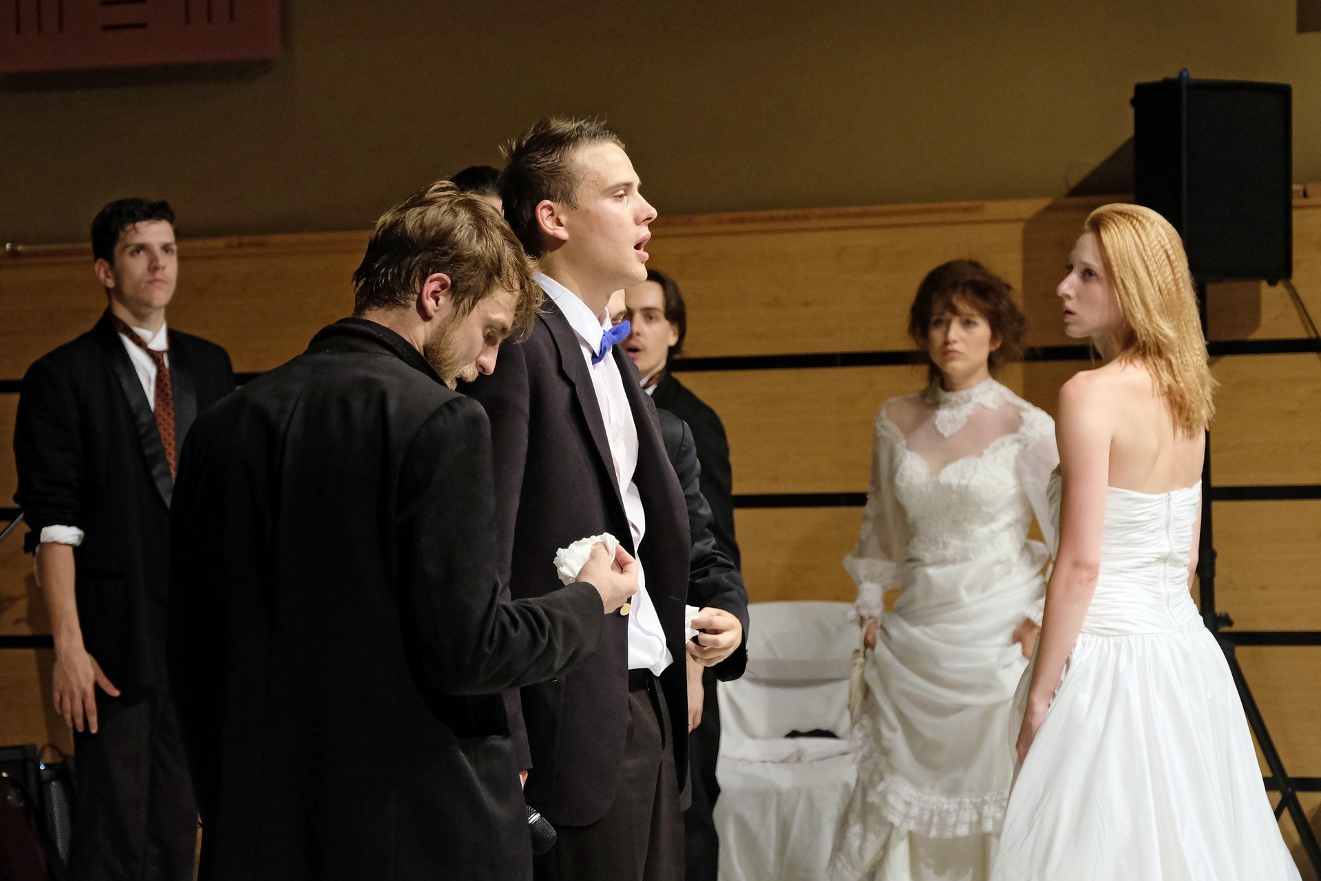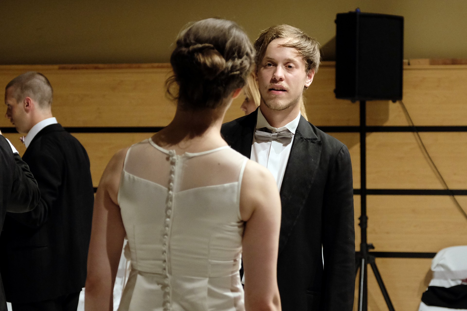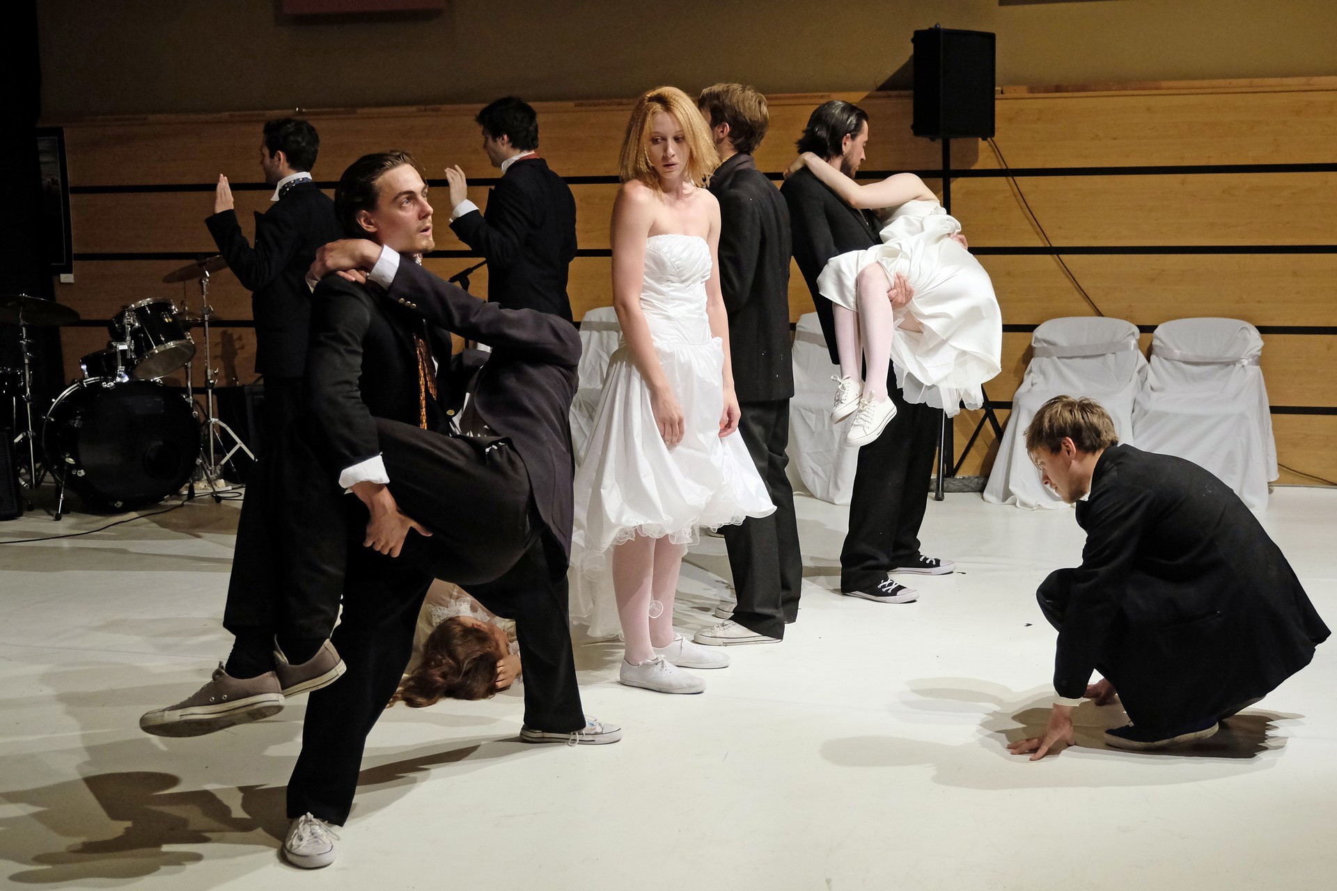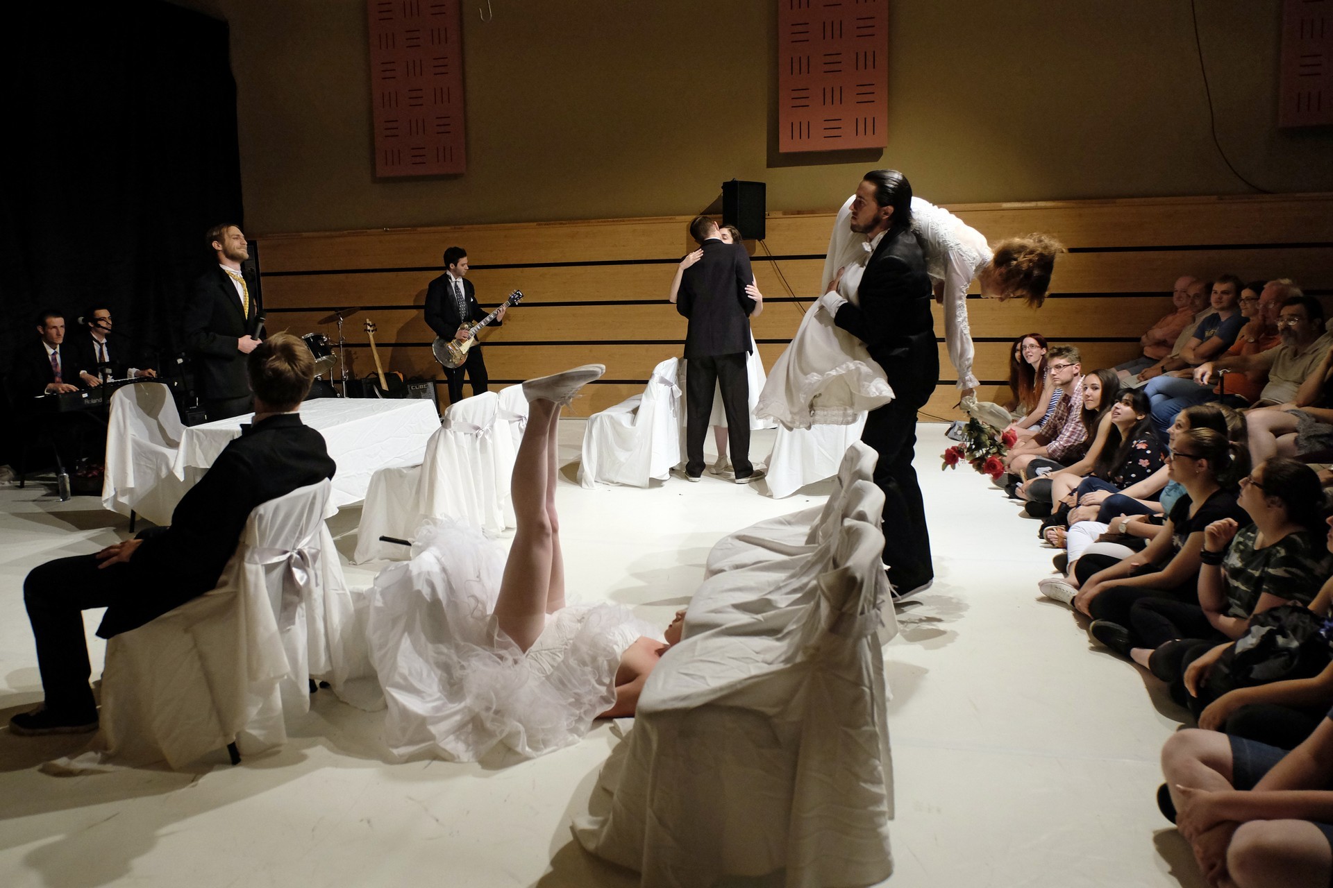A darab közjátékában ezúttal nem mesteremberek készülnek Théseus és Hyppolita (Kiss Andrea) esküvőjére, hanem a fiatal színészek önmagukat megformálva készülnek a Piramusz és Tiszbe című darabbal. Olasz Renátó nagy beleéléssel rendezné a darabot, de meggyűlik a baja a túlbuzgó előadókkal. Gyöngyösi Zoltán, a címszerepet megkapva sztárként viselkedik, tőle kapjuk meg a jó színész három fő ismérvét, amelyek a szövegtudás, pontosság és az a kis titok, a plusz, amit beleviszel a karakterbe. A tanácsokat mindenki szeretné megfogadni: Ember Márk, az Oroszlán megformálója, minden áron szeretne levetkőzni, Georgita Máté Dezső hangot ad annak, hogy miért neki kell mindig a nőt játszania, Medveczky Balázsra a Fal szerepe jut, ő azonban ebben is megtalálja a kihívást, egészen felhőtlen perceket okozva ezzel a közönségnek.