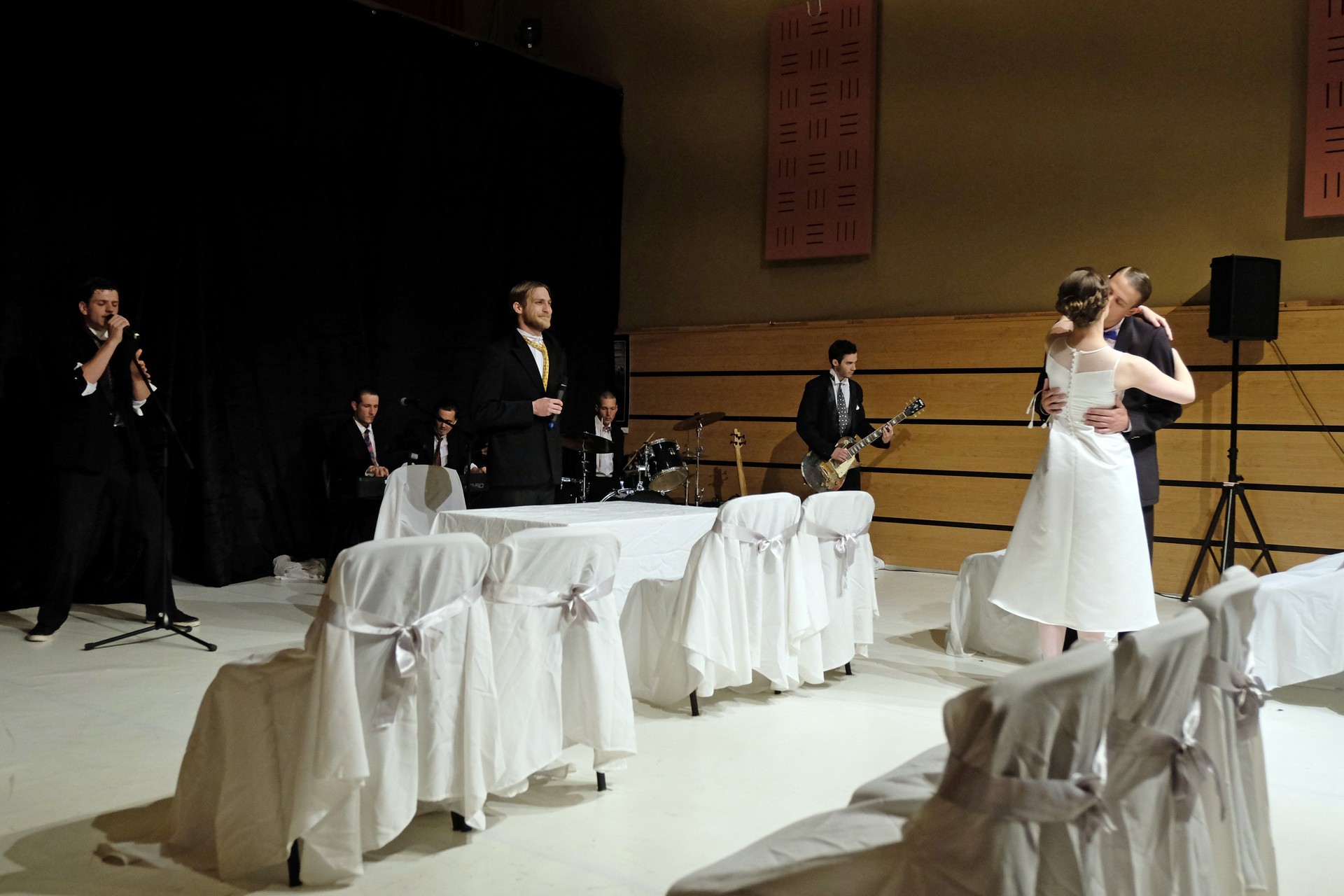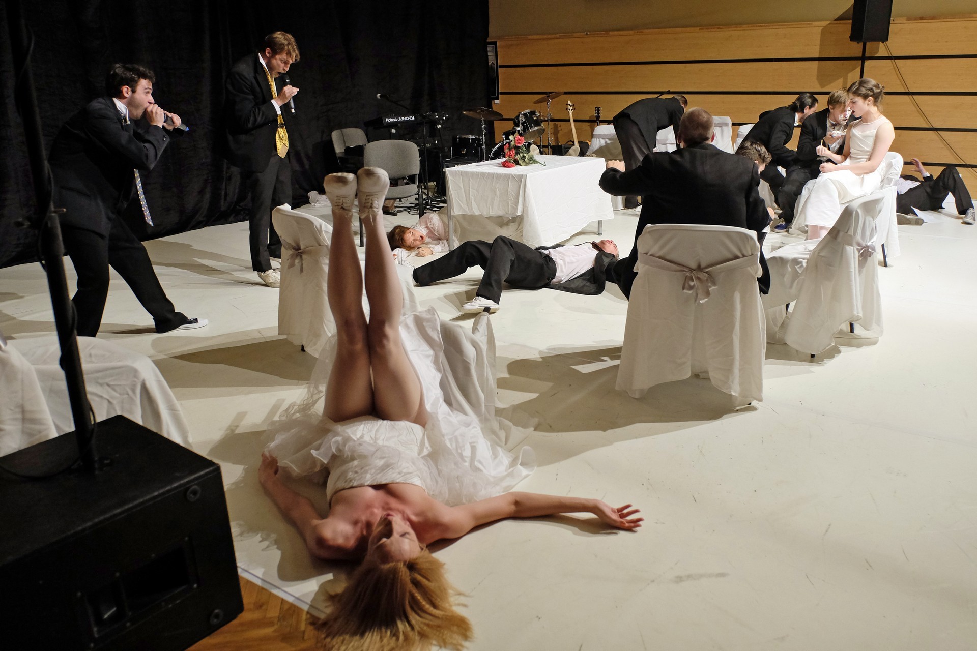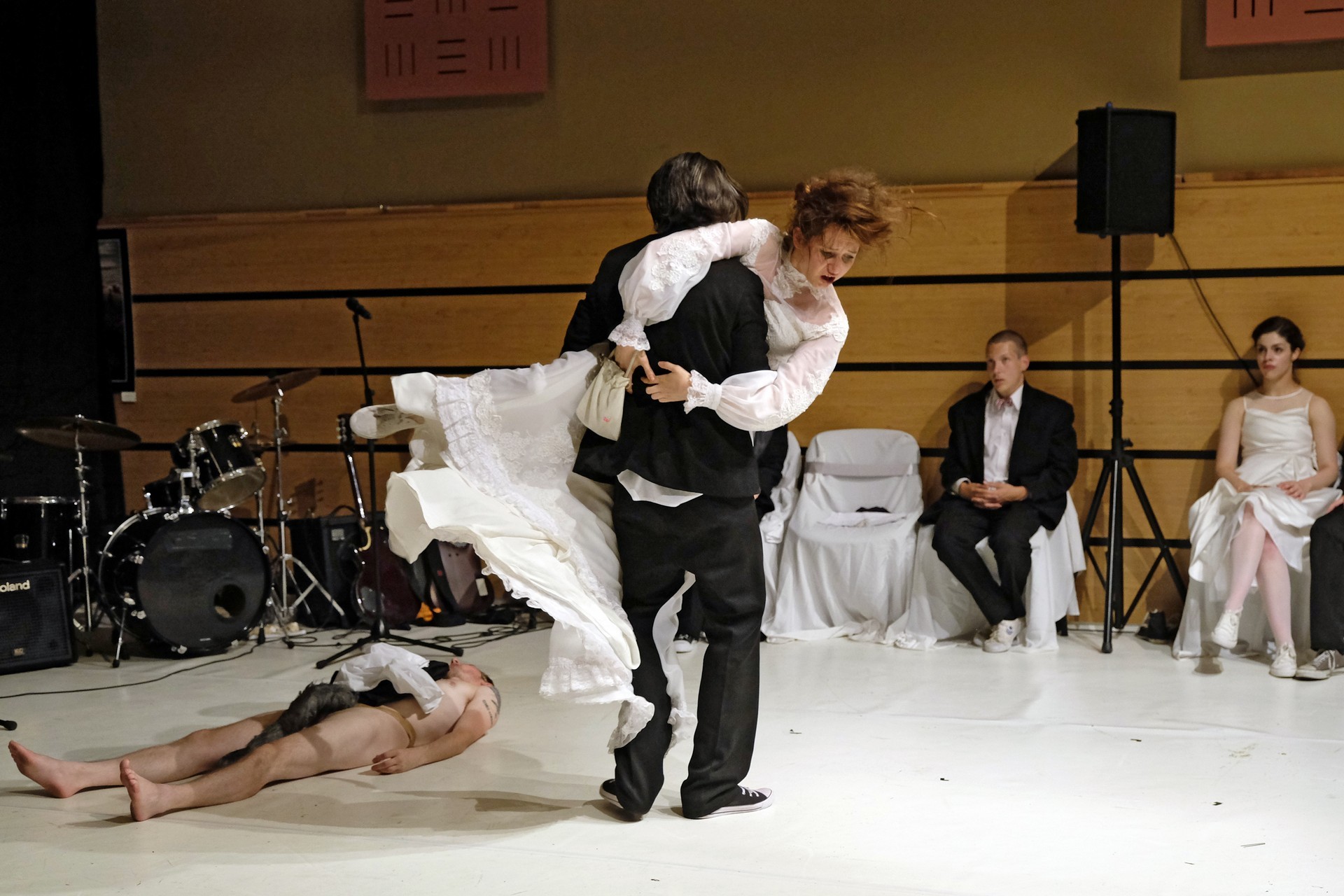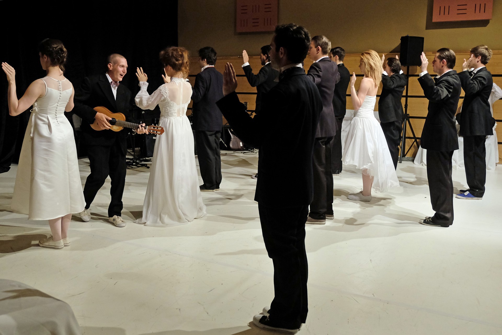 A darab közjátékában ezúttal nem mesteremberek készülnek Théseus és Hyppolita (Kiss Andrea) esküvőjére, hanem a fiatal színészek önmagukat megformálva készülnek a Piramusz és Tiszbe című darabbal. Olasz Renátó nagy beleéléssel rendezné a darabot, de meggyűlik a baja a túlbuzgó előadókkal. Gyöngyösi Zoltán, a címszerepet megkapva sztárként viselkedik, tőle kapjuk meg a jó színész három fő ismérvét, amelyek a szövegtudás, pontosság és az a kis titok, a plusz, amit beleviszel a karakterbe. A tanácsokat mindenki szeretné megfogadni: Ember Márk, az Oroszlán megformálója, minden áron szeretne levetkőzni, Georgita Máté Dezső hangot ad annak, hogy miért neki kell mindig a nőt játszania, Medveczky Balázsra a Fal szerepe jut, ő azonban ebben is megtalálja a kihívást, egészen felhőtlen perceket okozva ezzel a közönségnek.