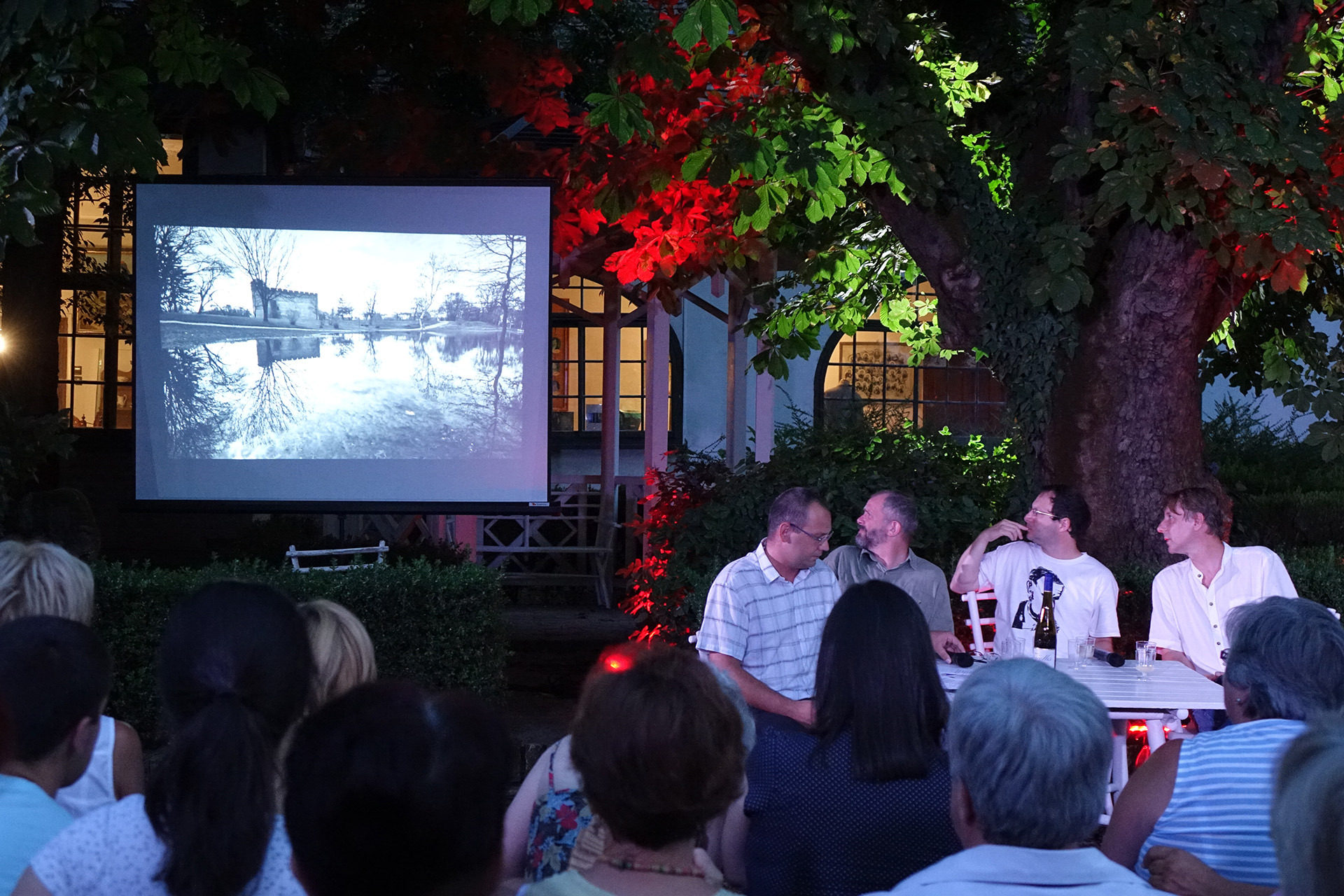 A bevezető után Sándor László fotóit csodálhatták meg az udvaron ücsörgők. A helyi származású alkotó nem lehetett jelen, zenével aláfestett fotófüzére így is hatásos antréja volt a randevúnak. Képein Gyula legkülönbözőbb helyszínein jártunk: egyedi perspektívái és monokróm látásmódja a város borongós-szép arcát mutatta be. (Fotóit megtekinthetik a lunalaci.blogspot.hu oldalon.) Utána sem maradt a közönség vizuális élmény nélkül: a beszélgetés közben archív városi képek és Rusznyák Csaba fotográfiái peregtek. A Gyulai Hírlap fotóriportere a város életének olyan kimerevített szépségeit láttatta, amelyek mellett sokan elmennek a mindennapokban.