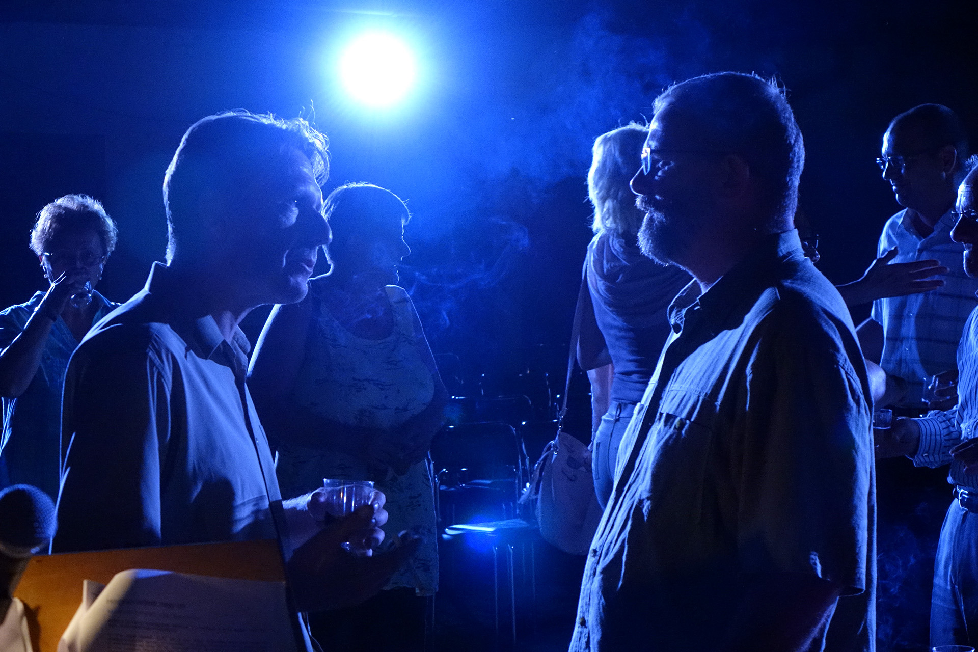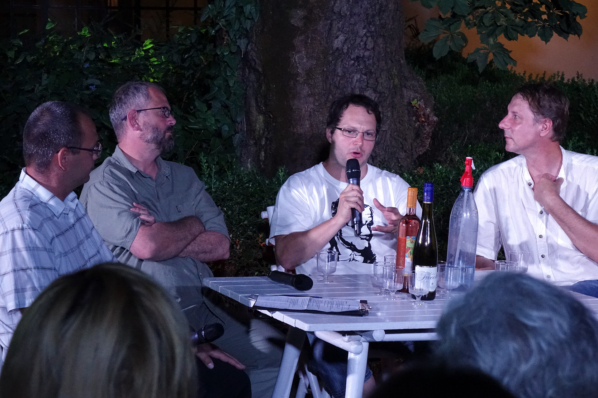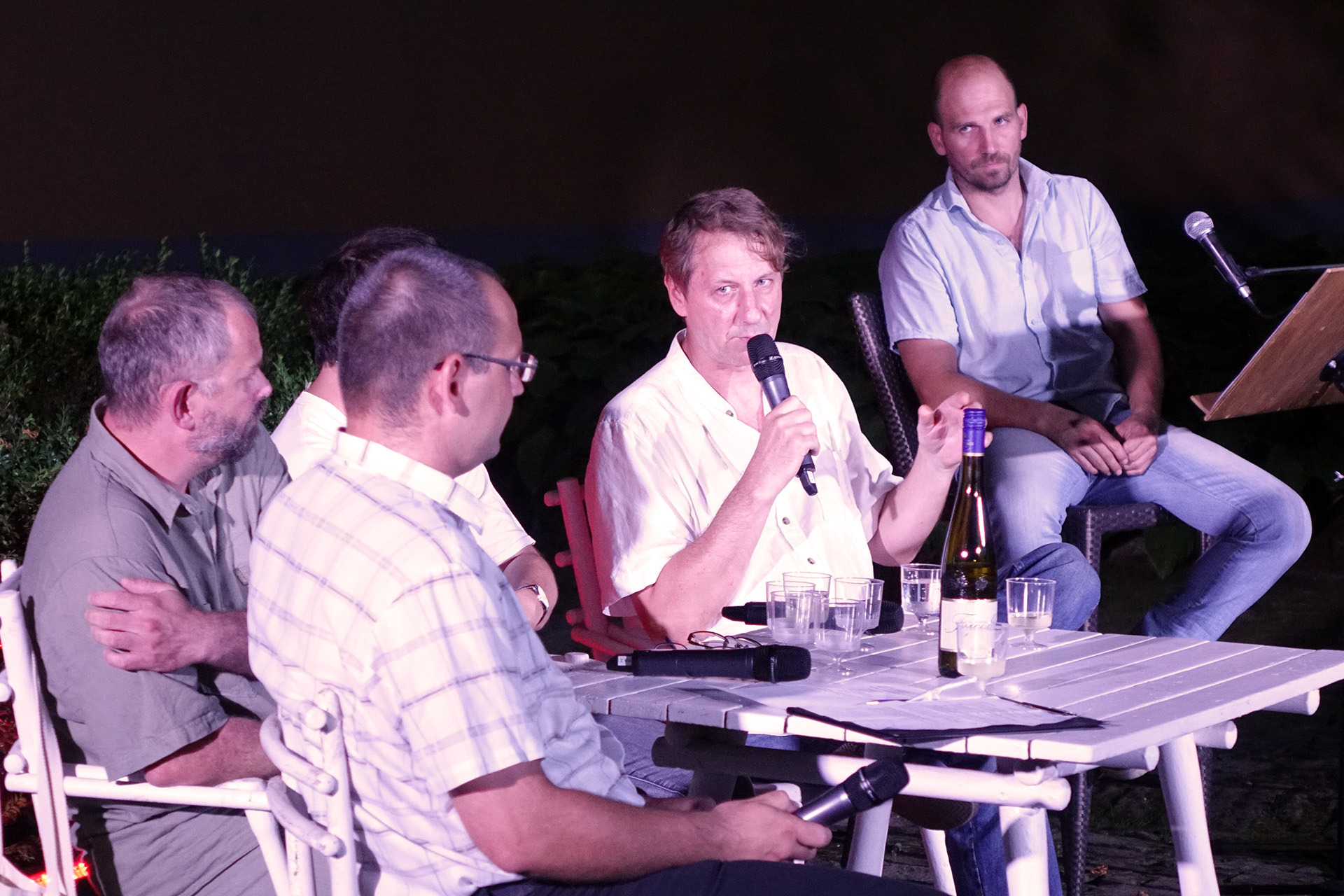 Kiss László Hogyan lettem nagy író című, sajátosan önironikus prózája után tovább folytatódott Fodor György kitartó faggatózása és a literátorok beszélgetése. Aznap estére vihart jósoltak, úgyhogy jogosan következtek az irodalmárokhoz intézett villámkérdések, amelyekből megtudhattuk, hogy Kiss Lászlót az írásban kifejezetten inspirálja az irodalom tanítása, az ő esetében „kéz a kézben jár” a két hivatás. Becsy András pedig szívesen tanít szakiskolásokat, mert közben nem kell tanárnak lennie a nap minden órájában. Írótársaihoz hasonlóan Kiss Ottó is pedagógusnak indult. Tanítóképzőbe járt, de már a gyakorlótanítások alkalmával kiderült, az óravázlatok körmölése helyett inkább verset írt. A személyes kérdések folytán előtérbe került Kiss László némettudása is. A Németül beszélek című novellájának felolvasása teljes képet adott az alkotó ilyen irányú kompetenciájáról.