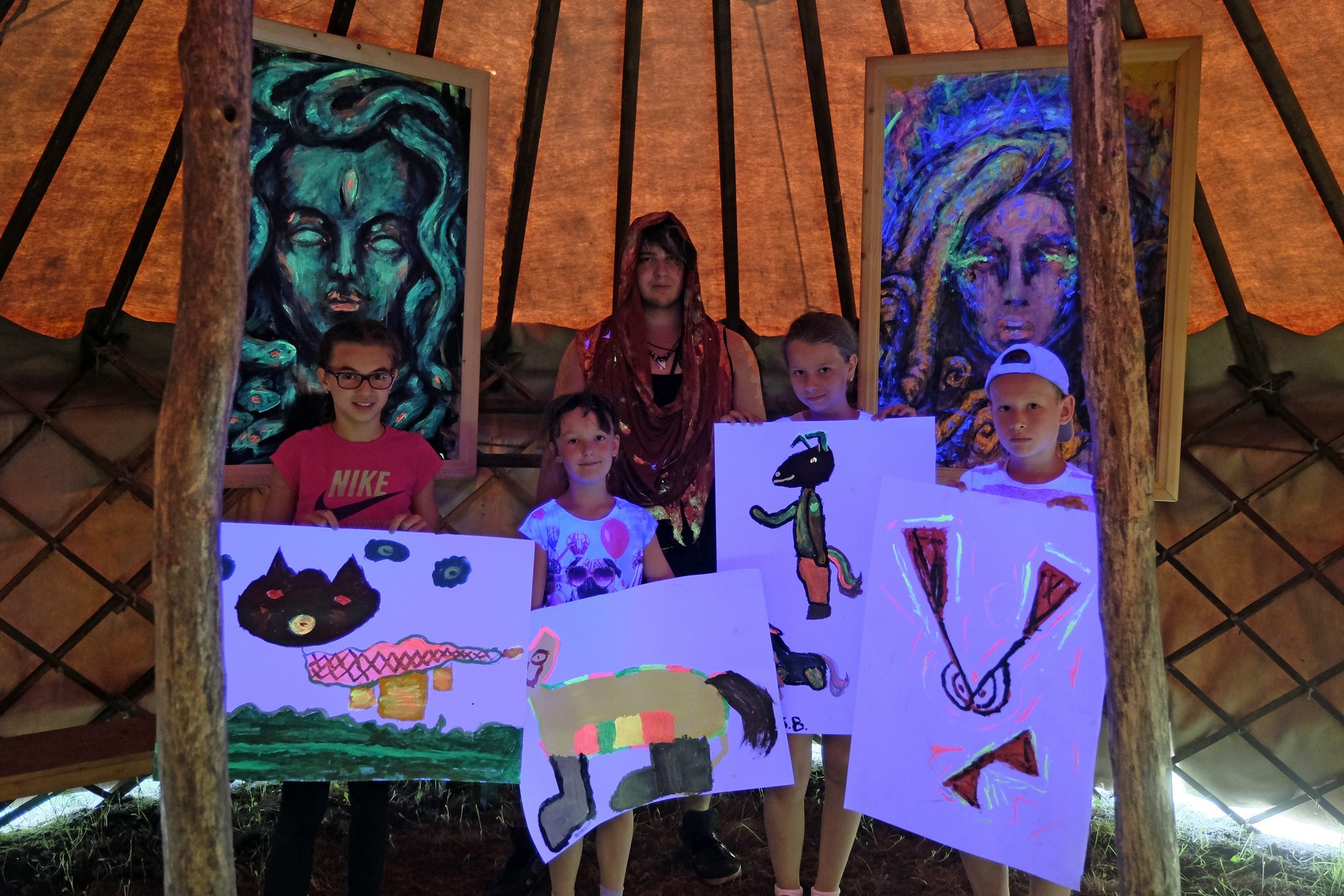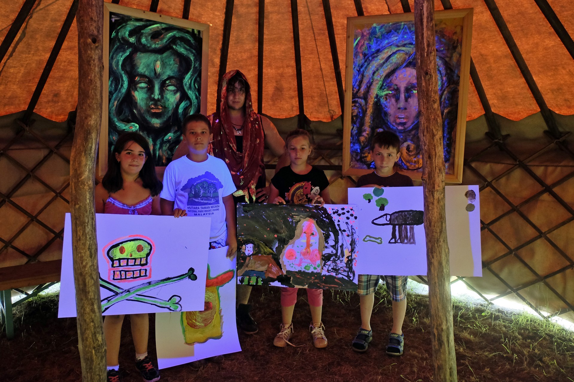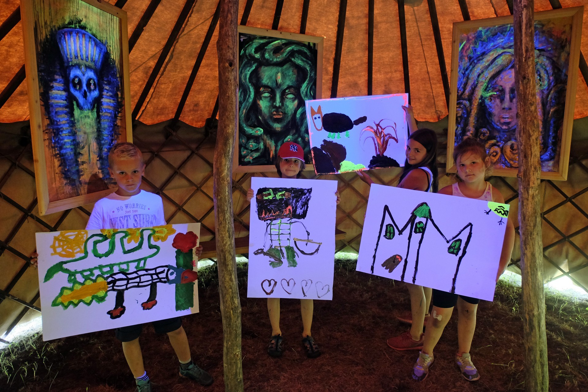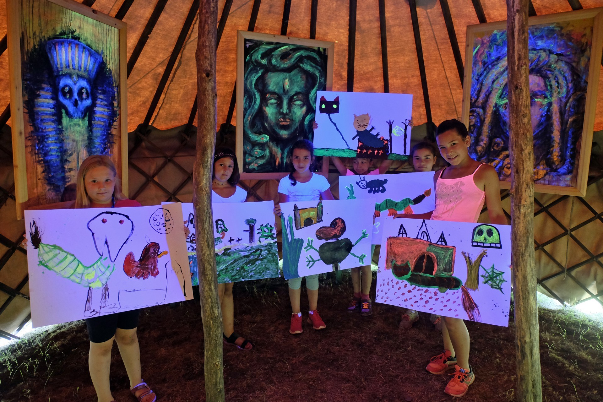 Legvégül kerültek a műalkotásokra az UV-fényre reagáló színes festékek, és a picik végül egy sötét jurtában megnézhették, hogyan világítanak alkotásaik. A programban a tábor vezetőinek segítséget nyújtott Kéri László, aki maga is ezzel a technikával készíti műalkotásait, amik közül jónéhányat el is hozott a rendhagyó táboros tárlatra.
