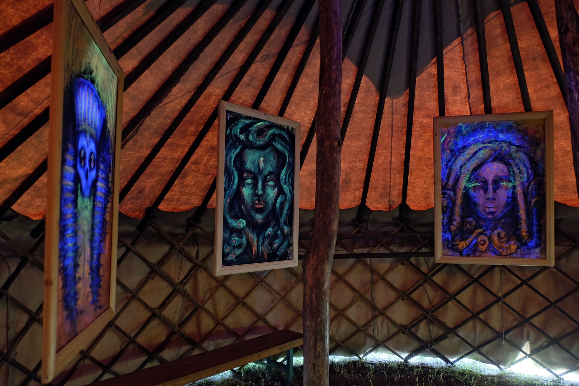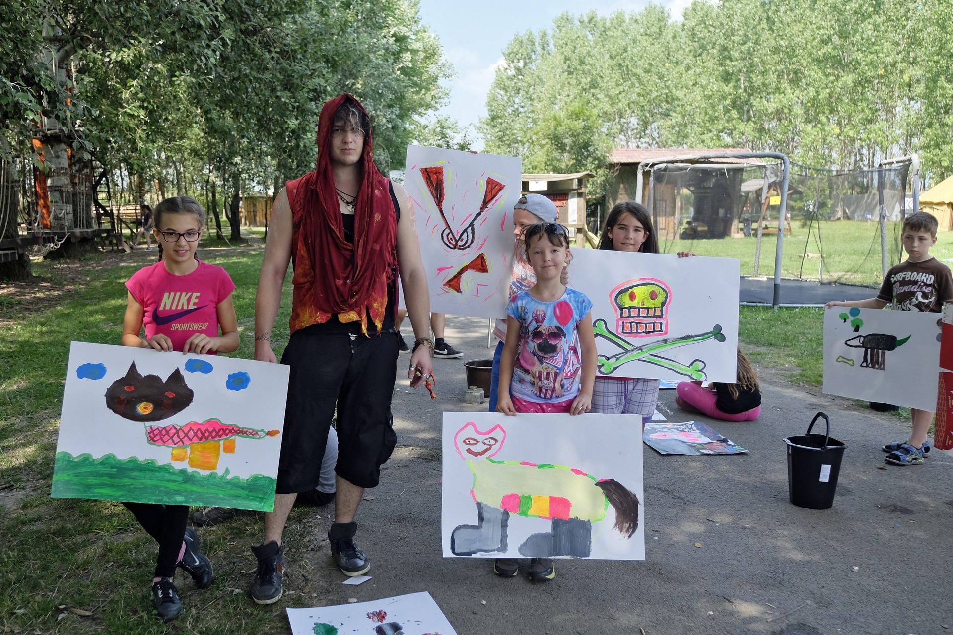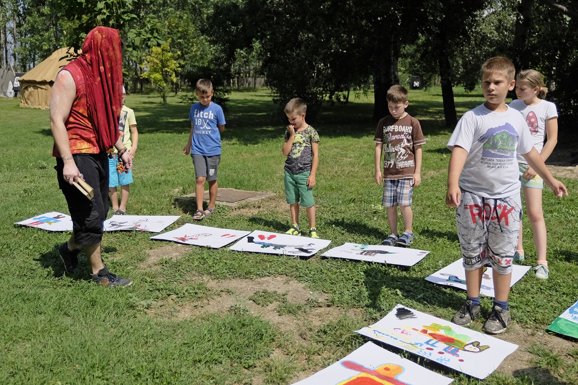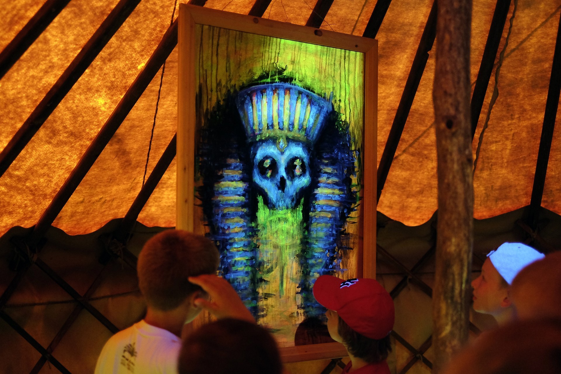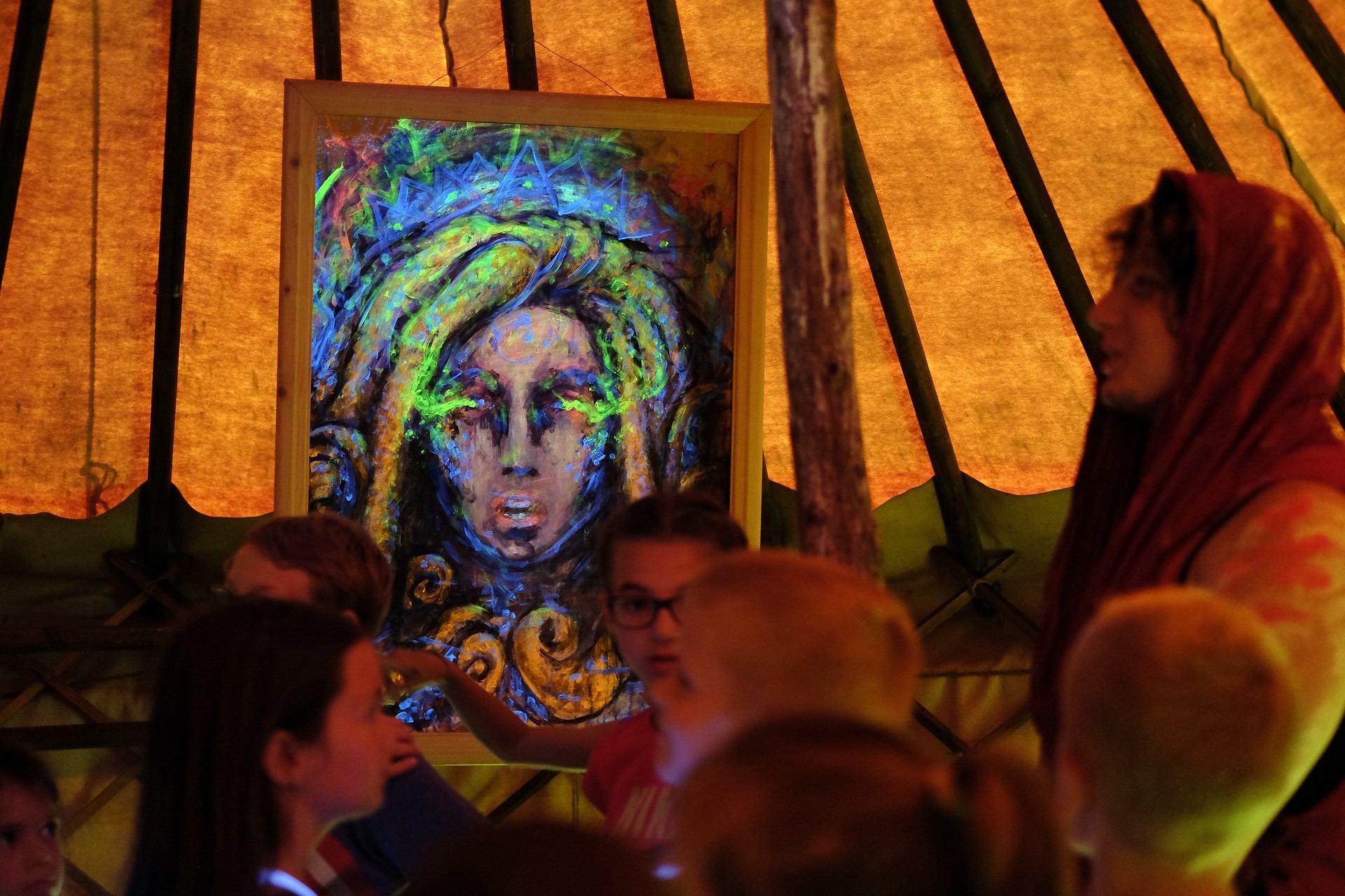 Legvégül kerültek a műalkotásokra az UV-fényre reagáló színes festékek, és a picik végül egy sötét jurtában megnézhették, hogyan világítanak alkotásaik. A programban a tábor vezetőinek segítséget nyújtott Kéri László, aki maga is ezzel a technikával készíti műalkotásait, amik közül jónéhányat el is hozott a rendhagyó táboros tárlatra.