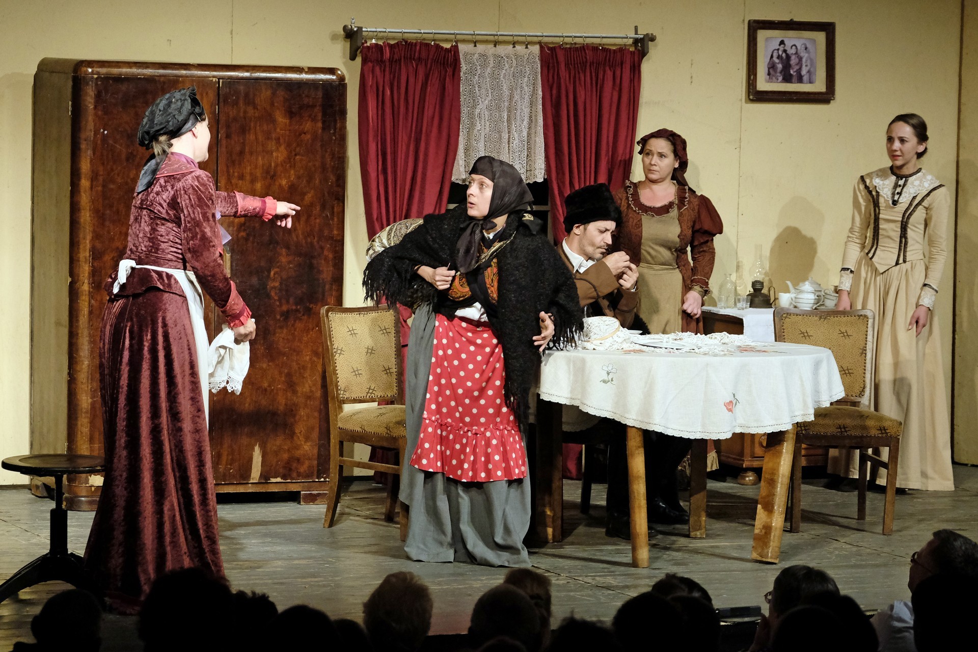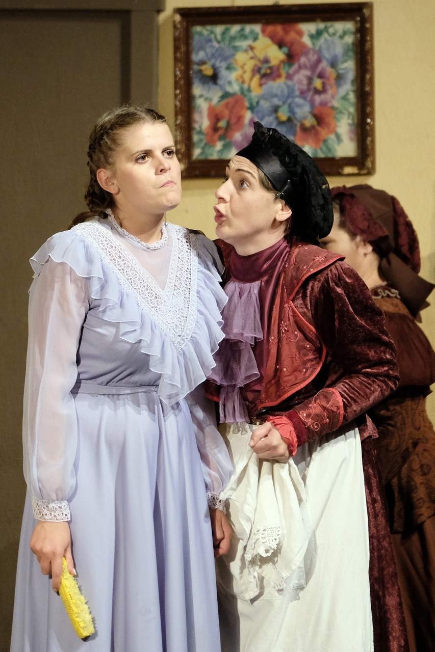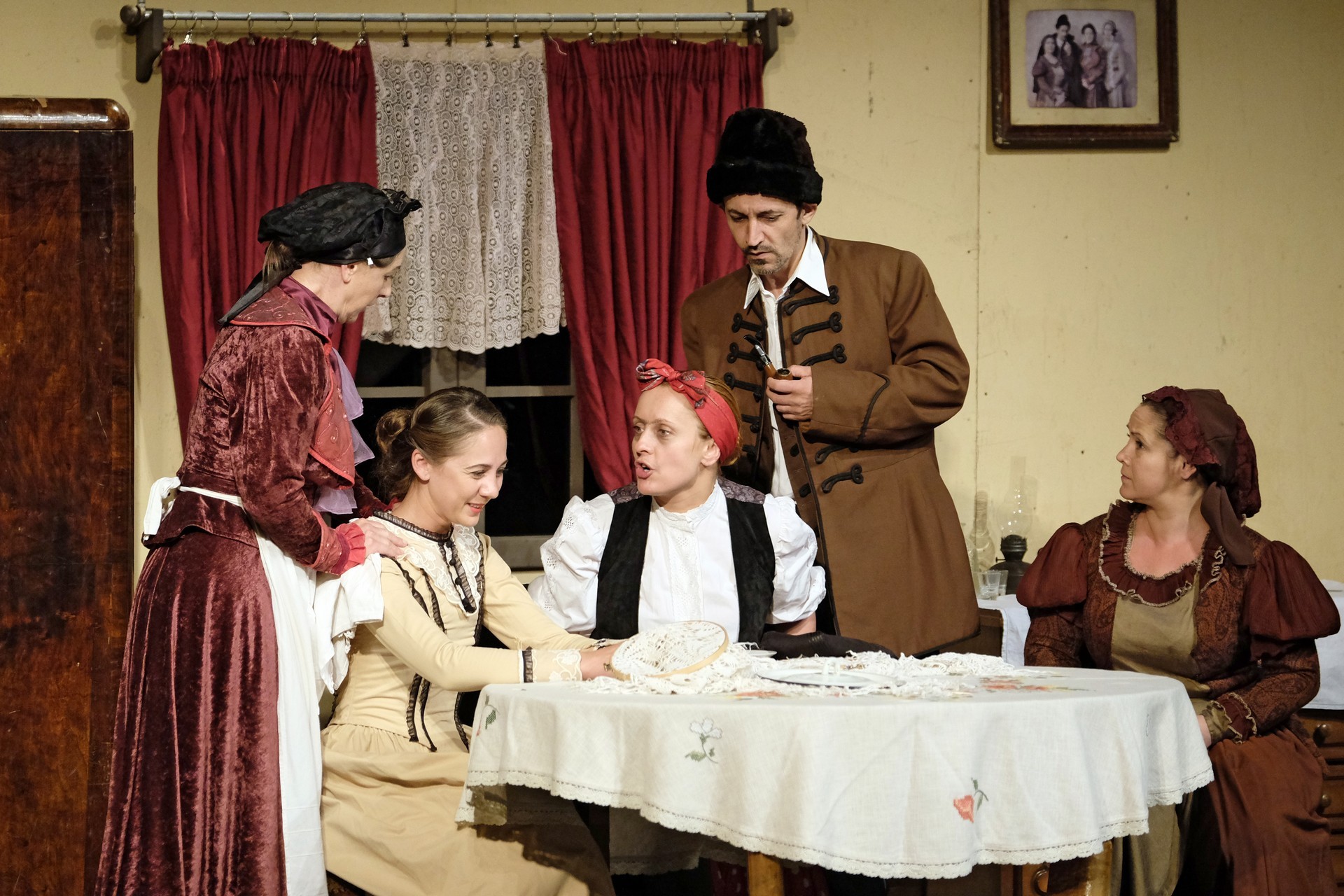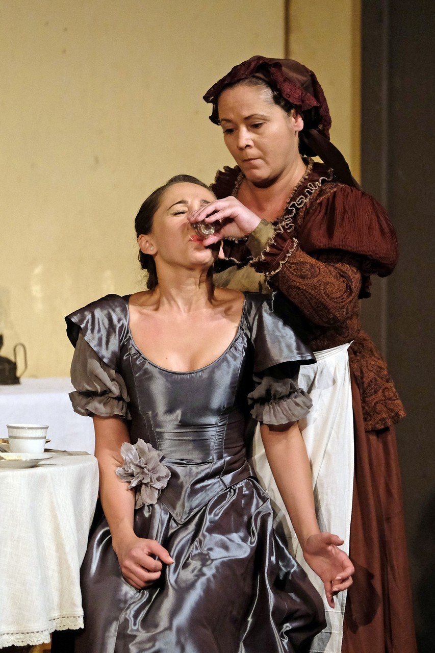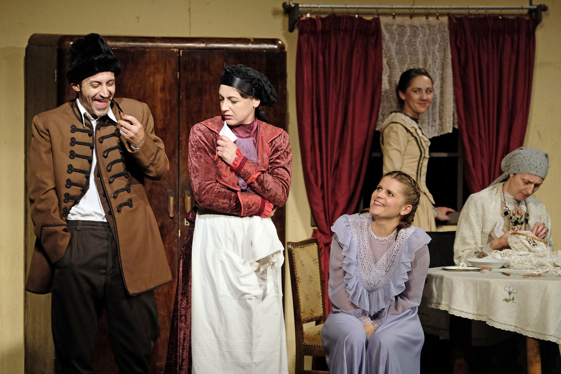 A beregszászi társulatról ritkán olvasni negatív kritikát, ez most sem lesz másképp, hiszen már akár egy szemöldökrándítással leszínészkedtek bárkit a színpadról, nagyon tehetséges, összeszokott játékot láthattunk, amelyet Katkó Ferenc rázott rendezésével tökéletes egységbe. Tarpai Viktória és Ferenci Attila édesen adták a perlekedő házaspárt, a Zsani nénit alakító Vass Magdolna valóban vasladyként osztotta az instrukciókat családtagjainak, Orosz Melinda nagylelkű Pepi nénije, illetve Kacsur Andrea siket és süket Mina nénije pillanatok alatt belopta magát a közönség szívébe. A Domáreckájá Júlia alakította Biri számtalanszor csalt mosolyt a közönség arcára, mondatait kuncogásmorajok követték, Kacsur András pedig mint Lajos bácsi, az egyetlen környéken élő férfiú, aki után már évek óta ácsingóznak a nagynénik, szintén megmutatta, ki az úr a háznál. Reméljük, jó szokásuk szerint minél hamarabb megint városunk felé veszik az irányt, és más darabban is bizonyítják reputációjukat.