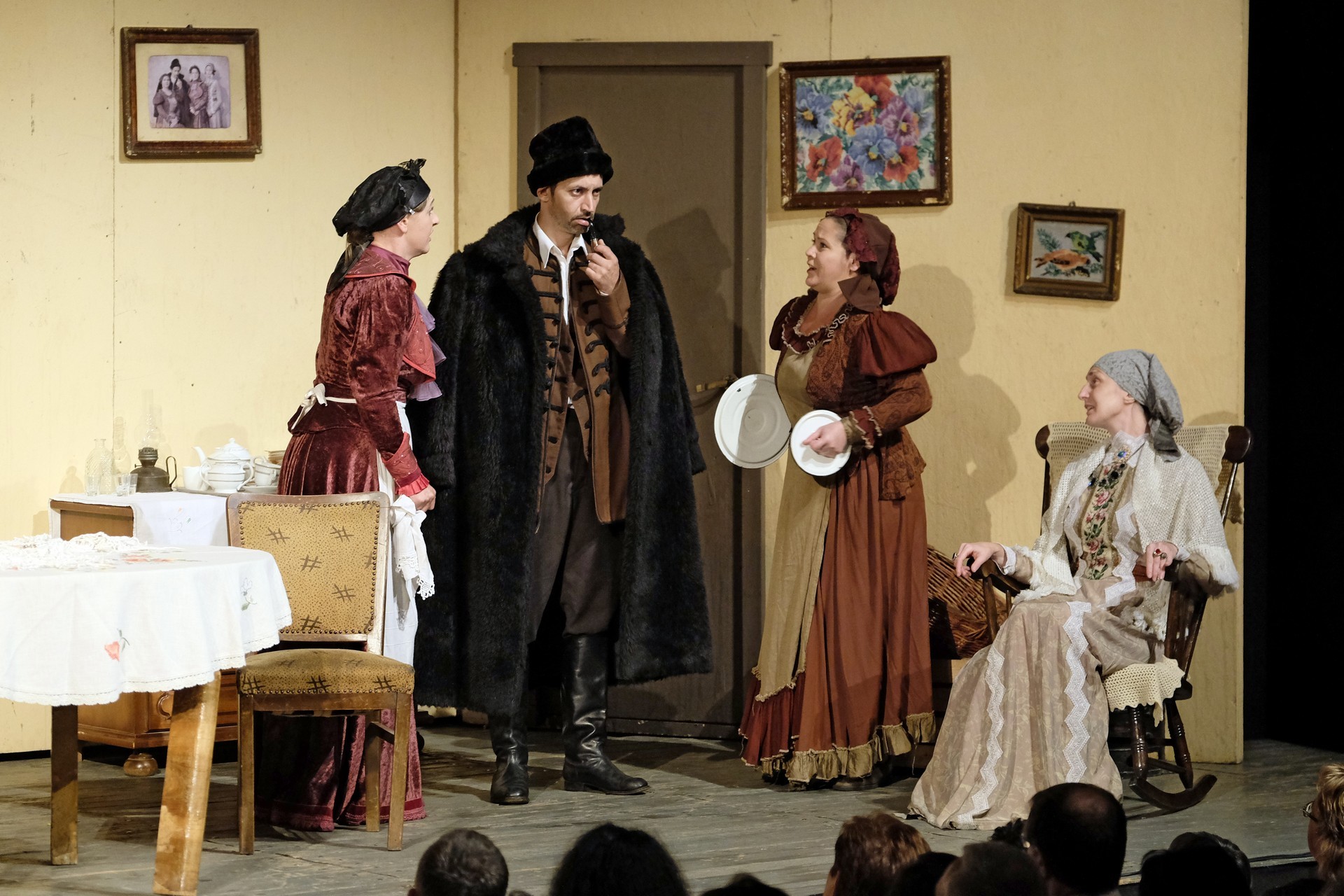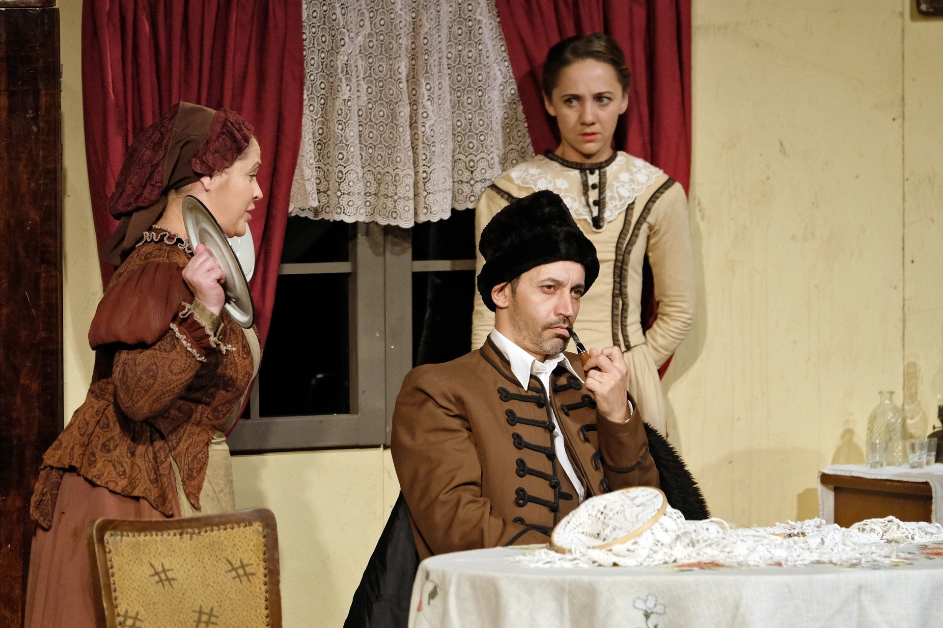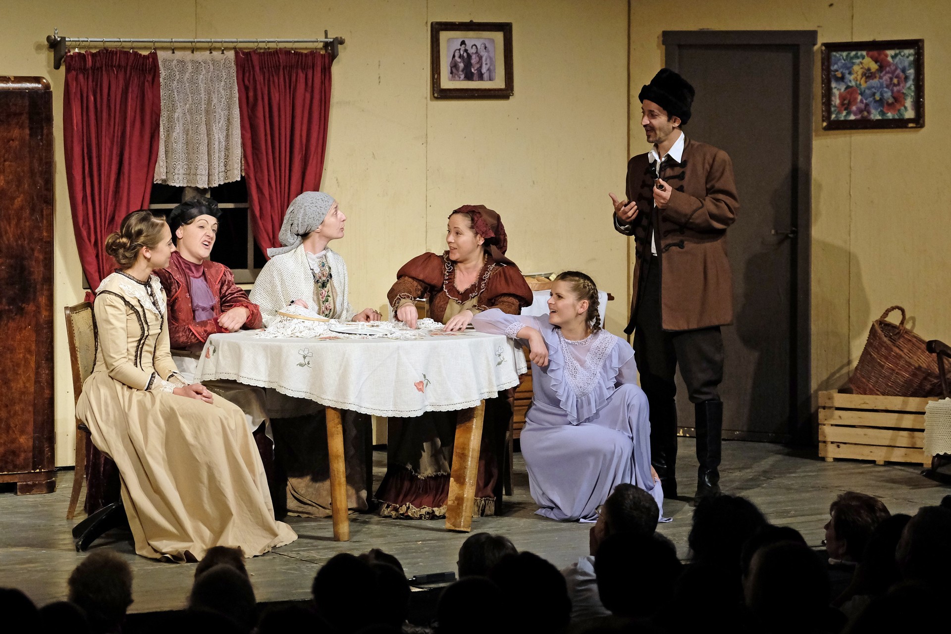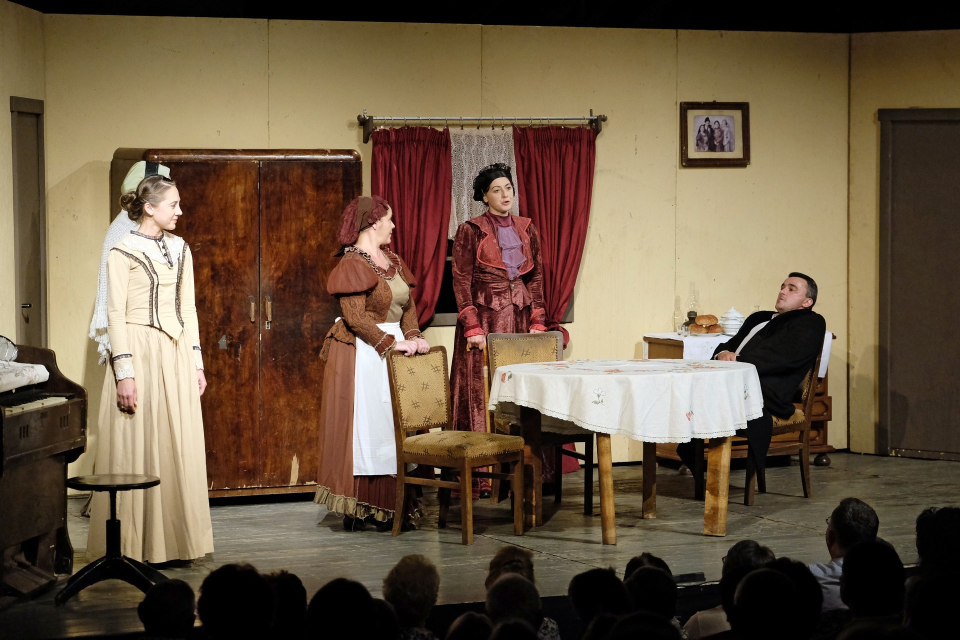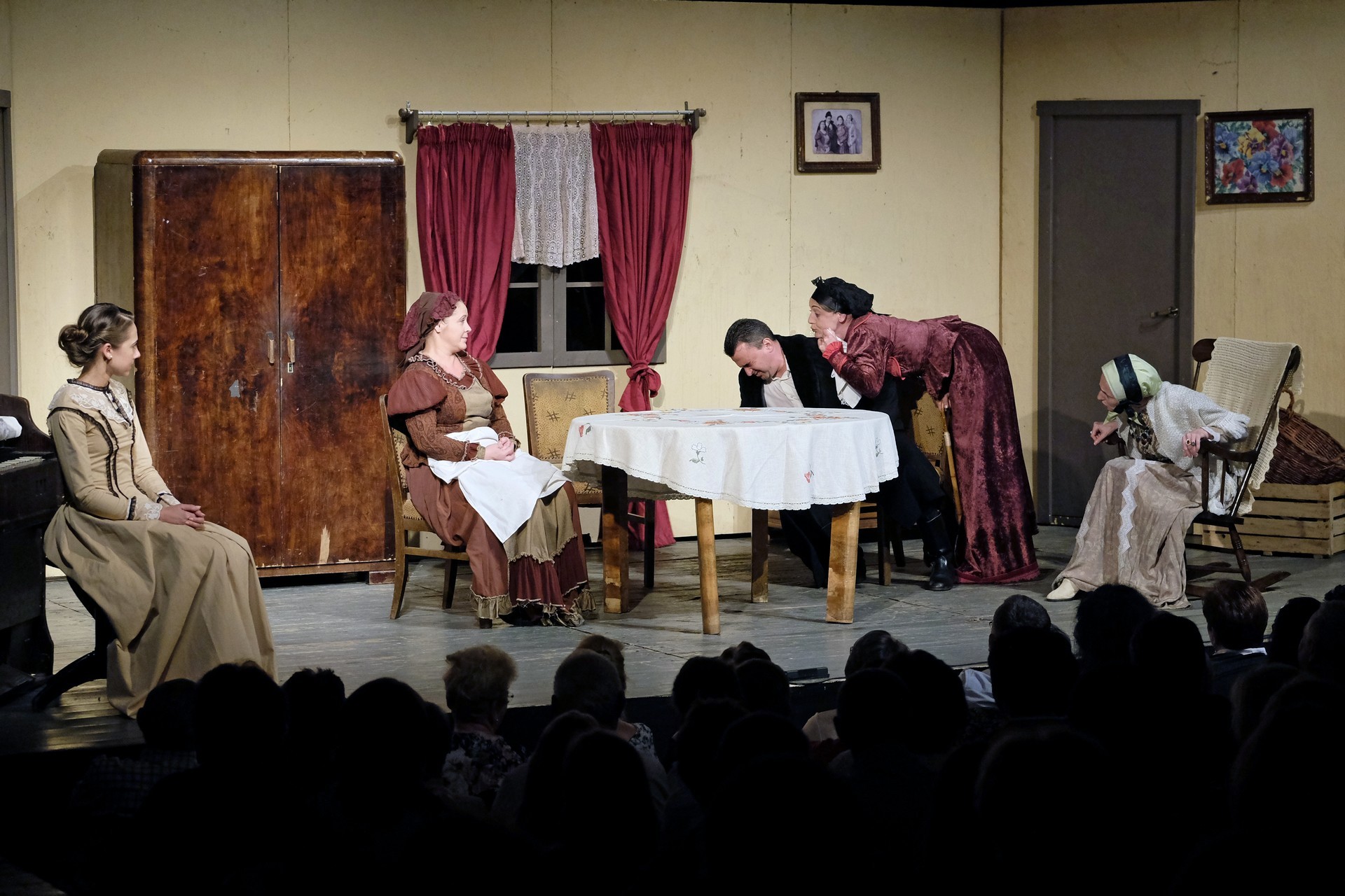 A beregszászi társulatról ritkán olvasni negatív kritikát, ez most sem lesz másképp, hiszen már akár egy szemöldökrándítással leszínészkedtek bárkit a színpadról, nagyon tehetséges, összeszokott játékot láthattunk, amelyet Katkó Ferenc rázott rendezésével tökéletes egységbe. Tarpai Viktória és Ferenci Attila édesen adták a perlekedő házaspárt, a Zsani nénit alakító Vass Magdolna valóban vasladyként osztotta az instrukciókat családtagjainak, Orosz Melinda nagylelkű Pepi nénije, illetve Kacsur Andrea siket és süket Mina nénije pillanatok alatt belopta magát a közönség szívébe. A Domáreckájá Júlia alakította Biri számtalanszor csalt mosolyt a közönség arcára, mondatait kuncogásmorajok követték, Kacsur András pedig mint Lajos bácsi, az egyetlen környéken élő férfiú, aki után már évek óta ácsingóznak a nagynénik, szintén megmutatta, ki az úr a háznál. Reméljük, jó szokásuk szerint minél hamarabb megint városunk felé veszik az irányt, és más darabban is bizonyítják reputációjukat.
