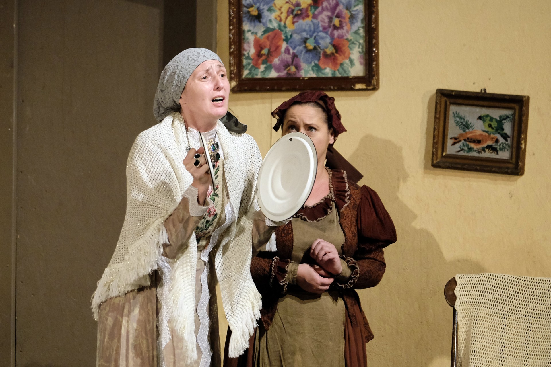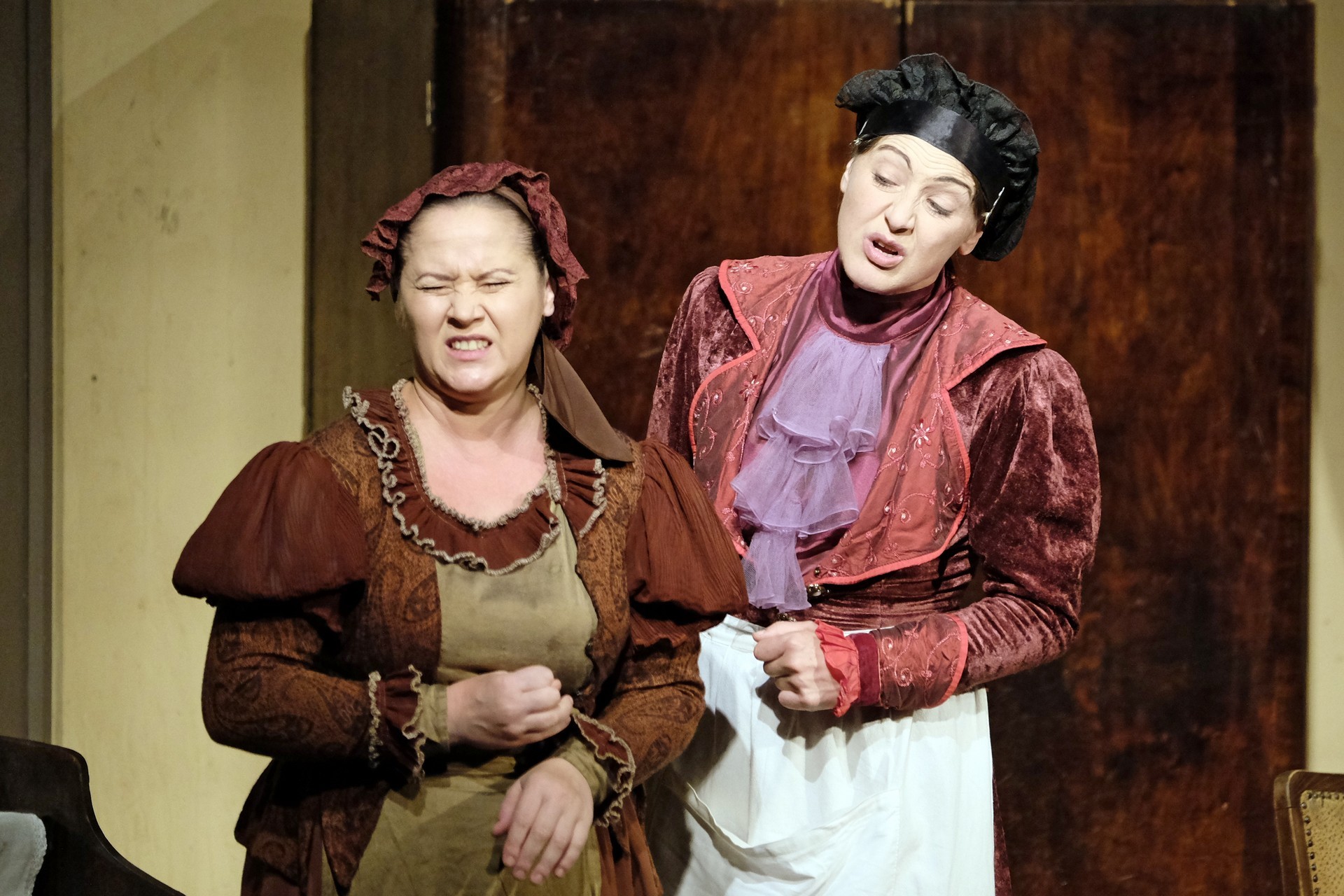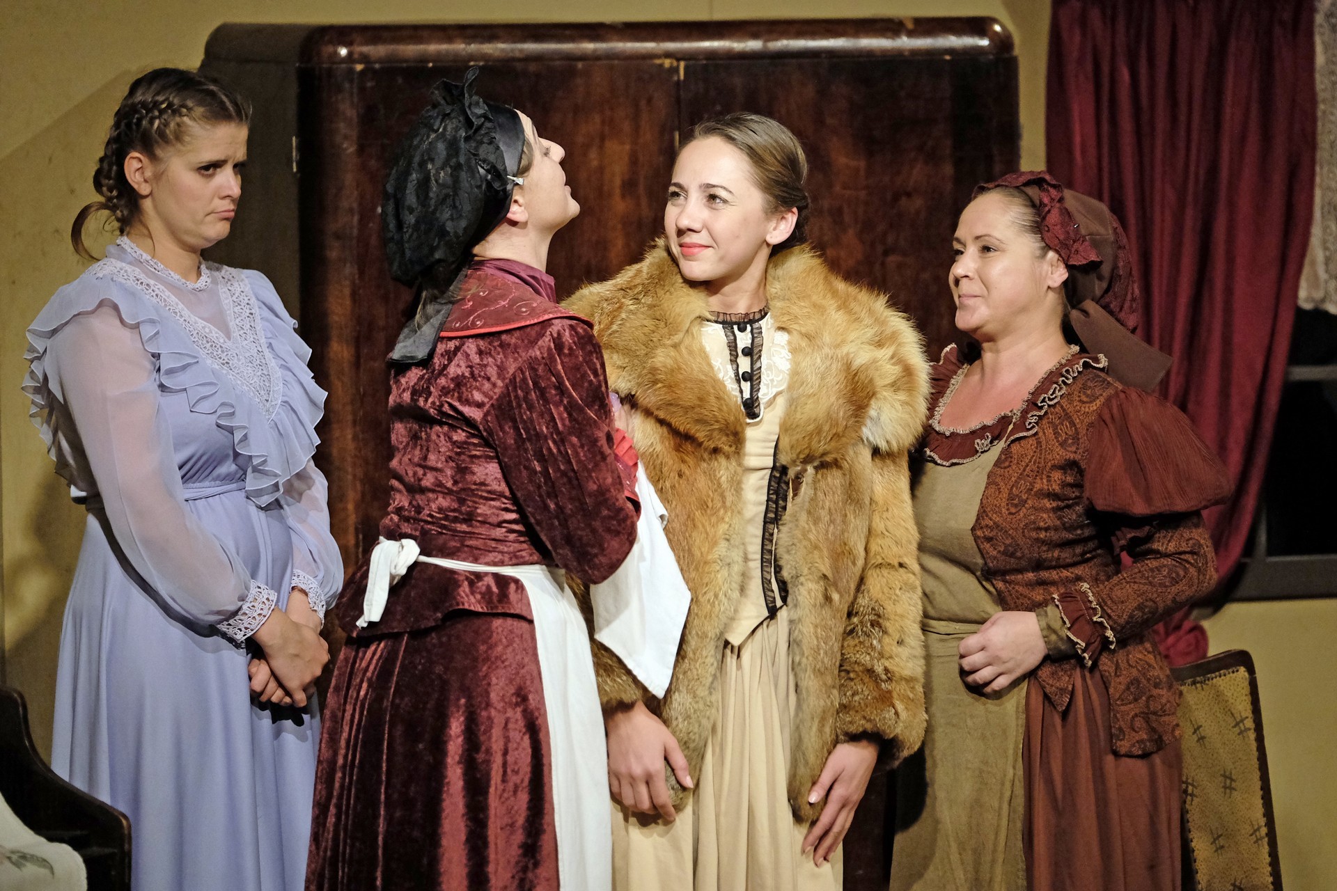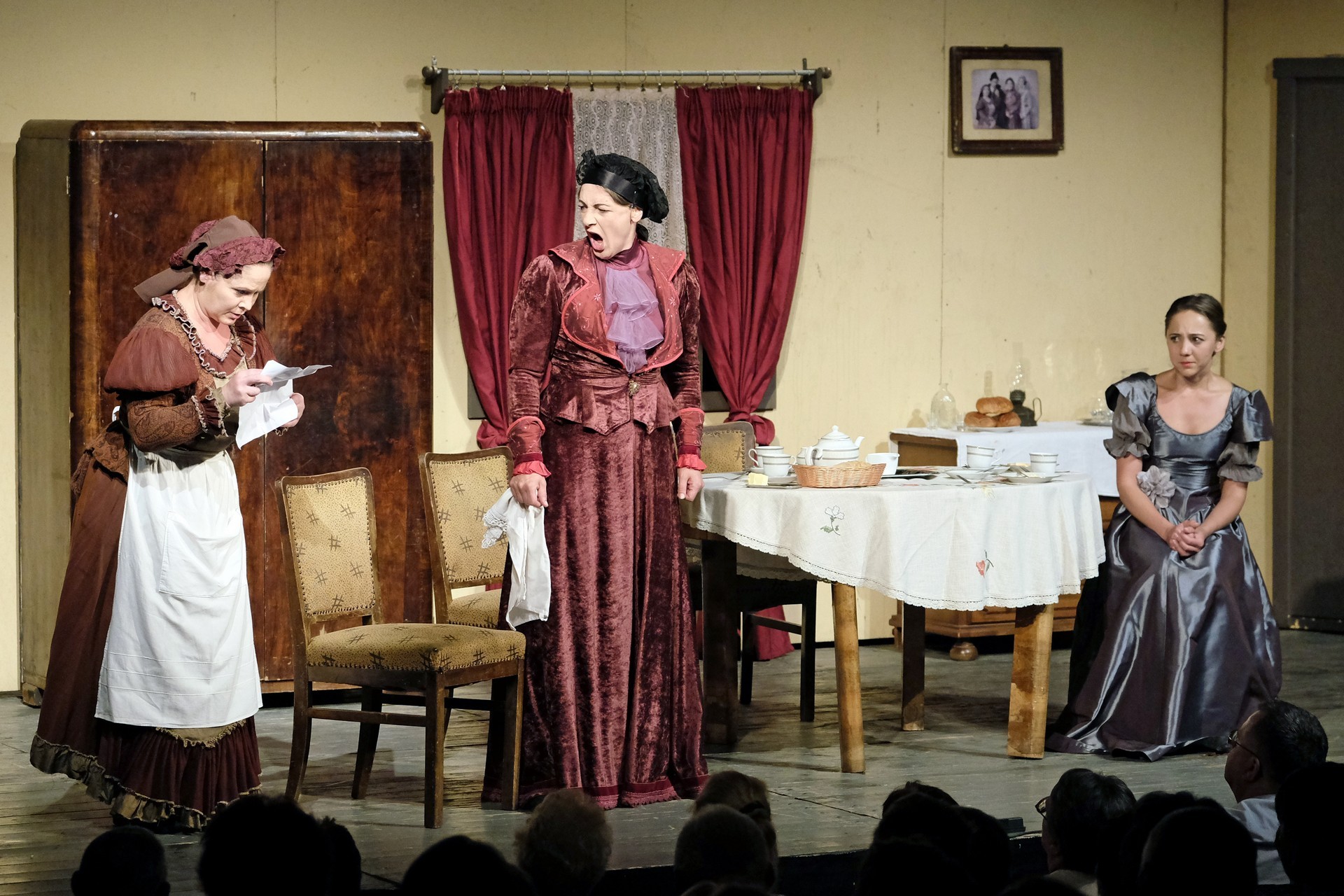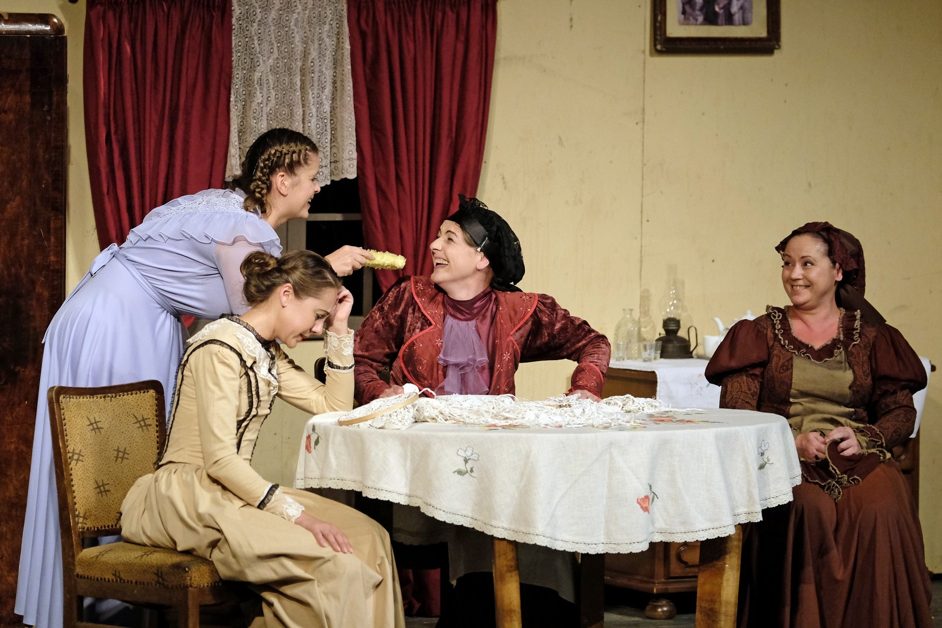 A beregszászi társulatról ritkán olvasni negatív kritikát, ez most sem lesz másképp, hiszen már akár egy szemöldökrándítással leszínészkedtek bárkit a színpadról, nagyon tehetséges, összeszokott játékot láthattunk, amelyet Katkó Ferenc rázott rendezésével tökéletes egységbe. Tarpai Viktória és Ferenci Attila édesen adták a perlekedő házaspárt, a Zsani nénit alakító Vass Magdolna valóban vasladyként osztotta az instrukciókat családtagjainak, Orosz Melinda nagylelkű Pepi nénije, illetve Kacsur Andrea siket és süket Mina nénije pillanatok alatt belopta magát a közönség szívébe. A Domáreckájá Júlia alakította Biri számtalanszor csalt mosolyt a közönség arcára, mondatait kuncogásmorajok követték, Kacsur András pedig mint Lajos bácsi, az egyetlen környéken élő férfiú, aki után már évek óta ácsingóznak a nagynénik, szintén megmutatta, ki az úr a háznál. Reméljük, jó szokásuk szerint minél hamarabb megint városunk felé veszik az irányt, és más darabban is bizonyítják reputációjukat.