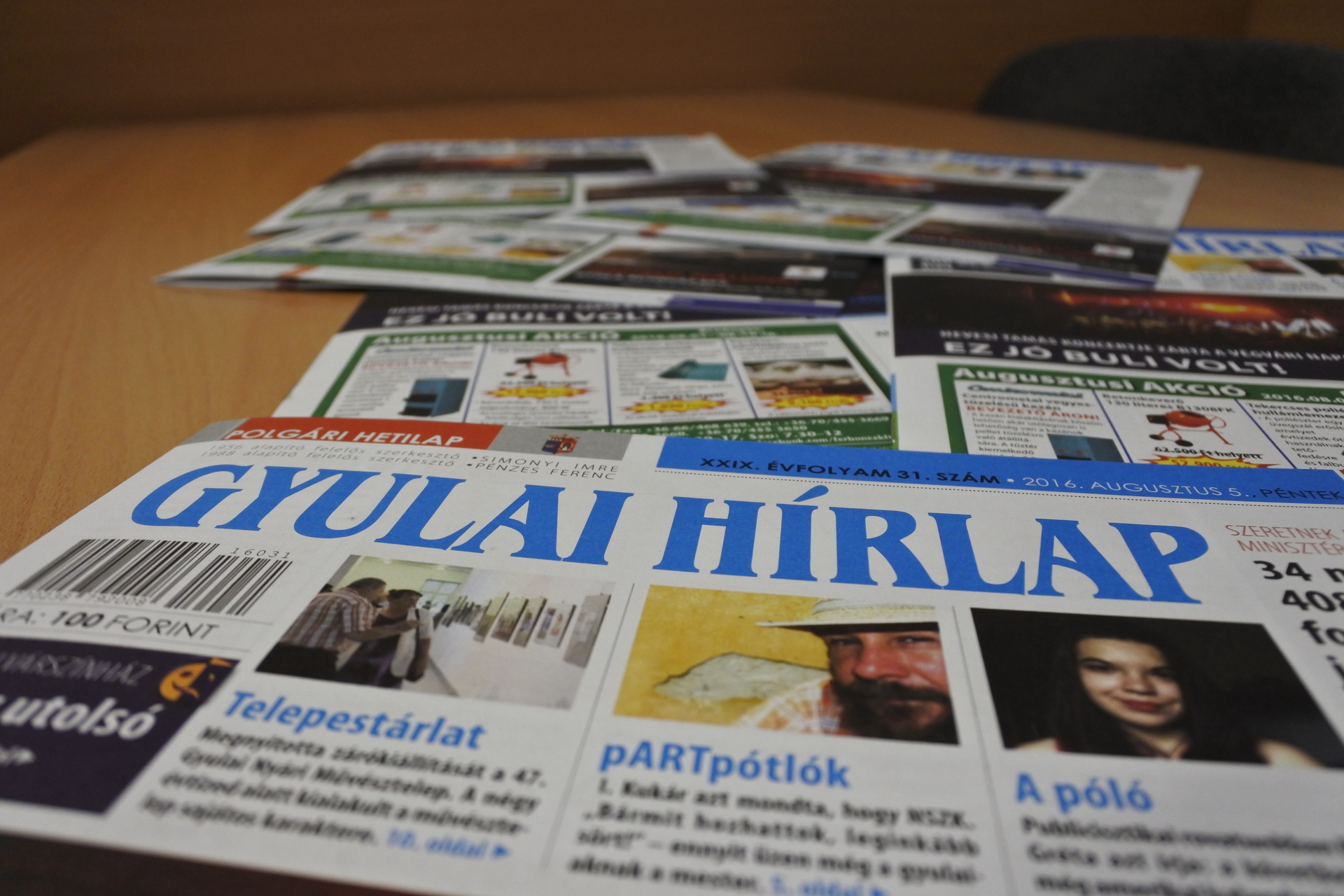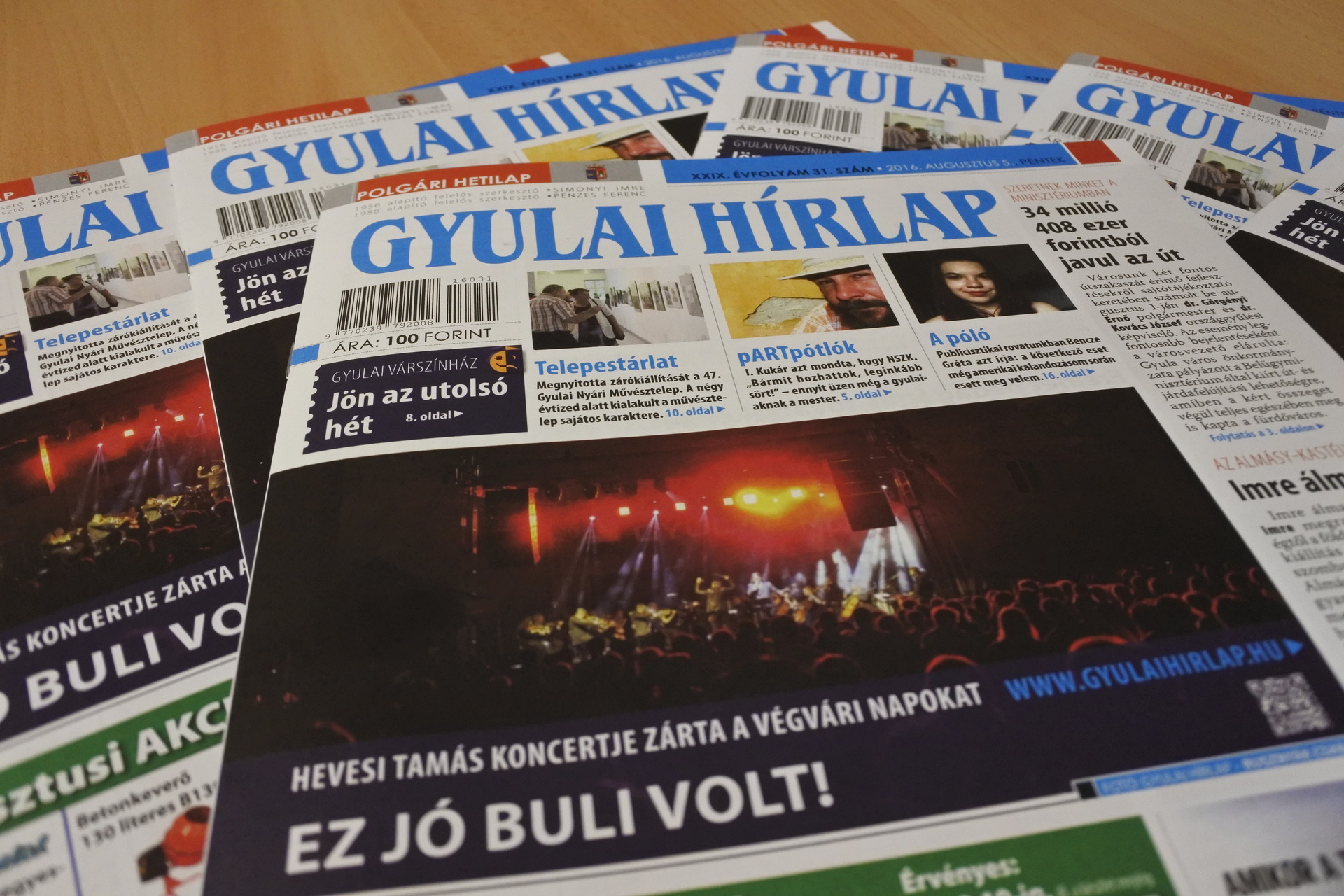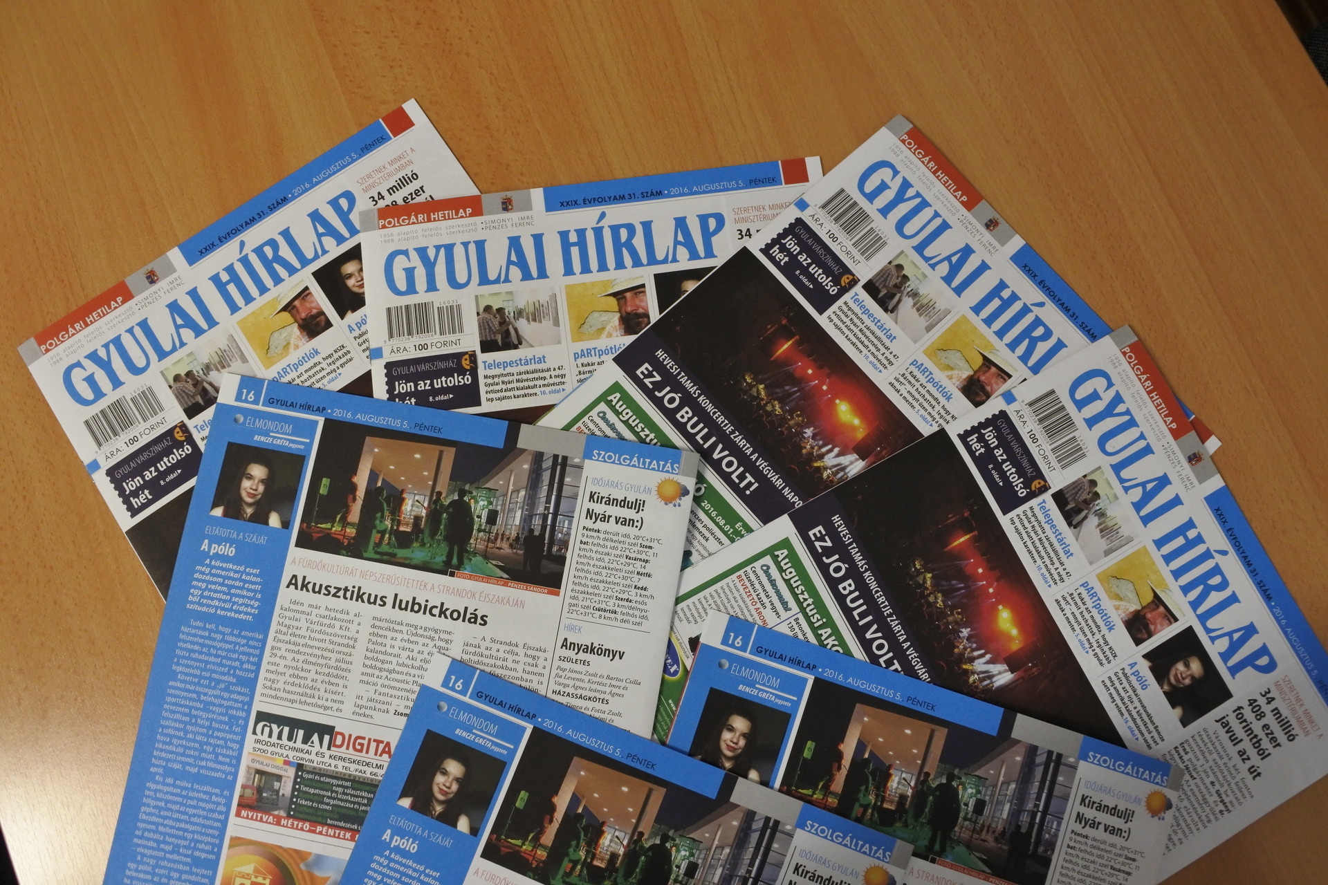 A Gyulai Hírlap XXIX. évfolyam 31. számát jó hírrel kezdjük: 34 millió 408 ezer forintból javulnak meg városunk útjai. A javulás ezúttal elsősorban és másodsorban is a Dob utcát és a Kálvin utcát érinti. Imre álma – Makovecz Imre megrajzolt hite az égtől a földig címmel nyílik különleges kiállítás az Almásy-kastélyban. Belekóstoltunk a fekete áfonyába a gyulai piacon. Most már tudjuk, hogy miről ismerszik meg az, aki fogyaszt ebből a finom gyümölcsből. Csevegő rovatunkban Rita üzenetét tolmácsoljuk a gyulaiaknak. Ott voltunk egy 65 éves érettségi találkozón. Állásbörzénk kifogyhatatlan, munkakeresők előnyben. Tanévkezdés előtti csereberére buzdít a Gyulai Városszépítő és Környezetvédelmi Egyesület. Megírjuk, hogy fogadóórát tart polgármesterünk. Beintünk a szúnyogoknak. Ajánljuk Vásáry André templomos koncertjét. Alkohol mámorban karambolozó, cserbenhagyó, majd a rendőrök karjaiba beleautózó Opeles történet lapunk 5. oldalán olvashatják el. Meghívtak és elmentünk Babi vendéglőjének nyitóceremóniájára, ahol nagyon jól éreztük magunkat. A volt Háromszög kocsma helyén nyílt étterem megnyitóján finom ételekkel és a Gyulai Pálinka Manufaktúra párlataival várták a vendégeket. Örömhír buzgó keresztrejtvényfejtő olvasóinknak, hogy végre belefért a lapba egy jó nagy skandináv rejtvény. Várkonyi Kálmán ezúttal egy népies gyulai dal sorait rejtette el a megfejtésben. Folytatjuk a Gyula város példaértékű sportolói elnevezésű rovatunkat: Zsidó Kittivel beszélgetett Bimbó Lajos. A népszerű gyulai Pocakos Triatlon történetét is megosztja Lajos olvasóinkkal. A 8. oldalunk csupa várszínházas varázslat. Rohmann Ditta csellista csodálatos koncertjéről Tóth Péter ír a Gyulai Hírlapban. Rusznyák Csaba fotóriporterünk a koncerten csodaszép fotókat készített a művésznőről. Olasz dallamokra lötyögtünk egy jót a Rondellánál. Jelentem, hogy a Gyulai Nyári Művésztelep zárókiállításáról sem hiányoztunk: Albrecht Júliát kérdezte Tóth Péter a Kohán Képtárban. Szombaton megsütjük a gyulai batyut és salátával lakunk jól vele. Francia vígjátékra ülünk be a Center Moziba. A héten Pumival keressük az új élet reményét. Ne kukoricázzanak, egyenek minél több csemegekukoricát! Ezt nem én, hanem a dietetikusunk, Szalai Ilona tanácsolja olvasóinknak. Pomázi Ferenccel az „érik a szőlő, hajlik a vesszőt” dalolva űzzük el a darazsakat a lugasból. Apróhirdetés a bogarászóknak, gyulai évfordulók a históriázóknak, Bay Zoltán tanulmányi ösztöndíj pedig a diákoknak. Diákújságíró vendégeskedik szerkesztőségünkben. Bencze Gréta publicisztikájának a címe: A póló. Ha akusztikus lubickolásra vágynak megint, írják meg a Gyulai Várfürdőnek. A nyaralók pedig ne hagyják otthon a naptejet!