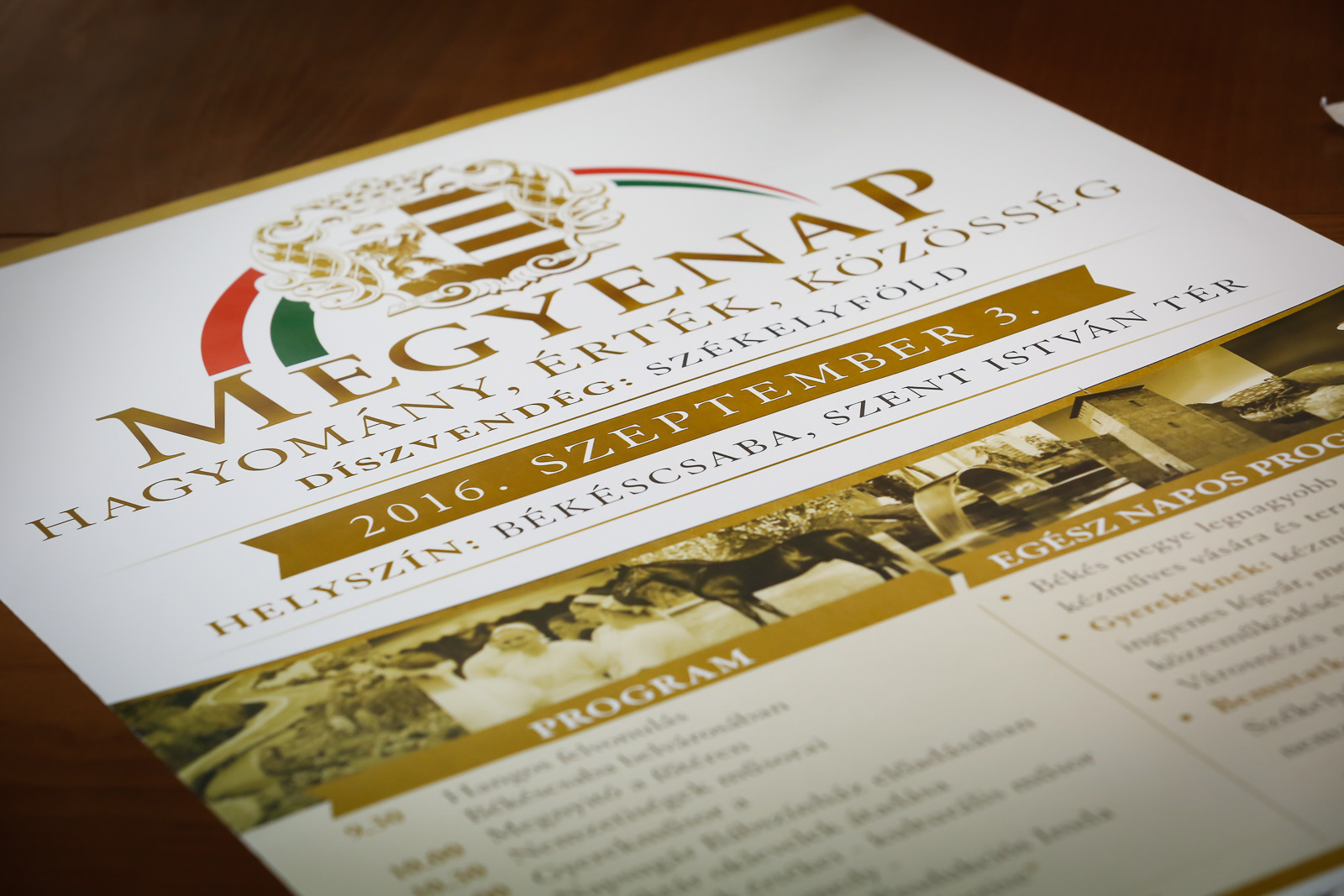 A program reggel kilenc órától sötétedésig tart. Fél tízkor hangos felvonulás indul kikiáltóval – fúvószenekarral, hagyományőrzőkkel, óriásbábbal és bábszínházi bohócokkal – a Csaba Centertől a főtérig. A Megyenap hivatalos megnyitója 10 órakor lesz a Szent István téren, majd a színpadon egész nap egymást követik a fellépők. Délelőtt a nemzetiségek mutatkoznak be, délután felkért megyei szereplők: a Tabán Néptáncegyüttes, a Dumaszínház, a Cervinus Teátrum, a Gyulai vonósnégyes, az orosházi Vadvirág-Esély Klub és a Balassi Táncegyüttes. A gyerekek szórakoztatásáról 12 órától a Békéscsabai Napsugár Bábszínház gondoskodik, délután 17 órától a Szomszéd Néni Produkciós Iroda pedig a felnőtteket veszi célba. Az est folytatásában a Csabai Csípős Blues Club két koncertet szervez: a Borsodi Blues Collective és a Deák Bill Blues Band lép színpadra.