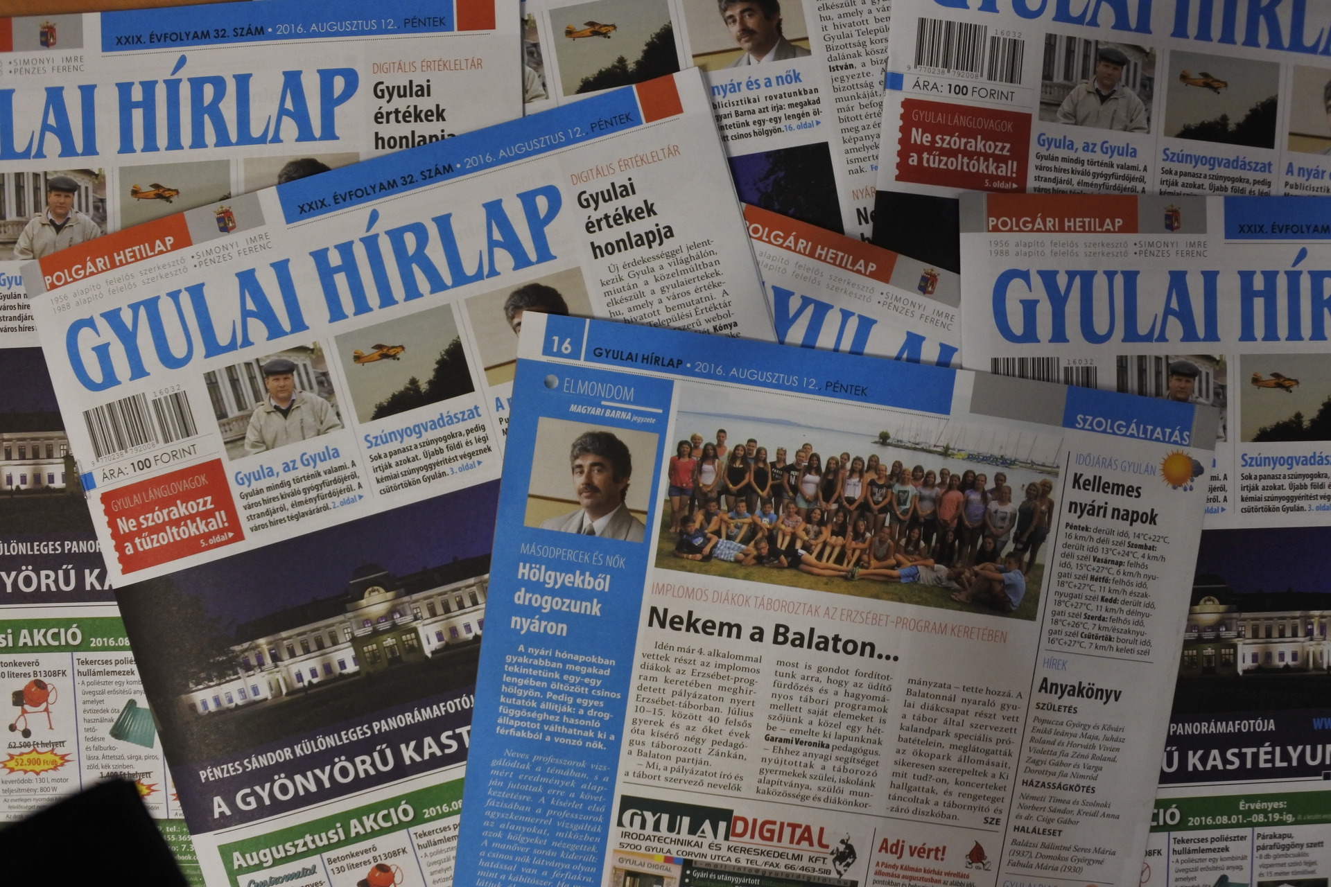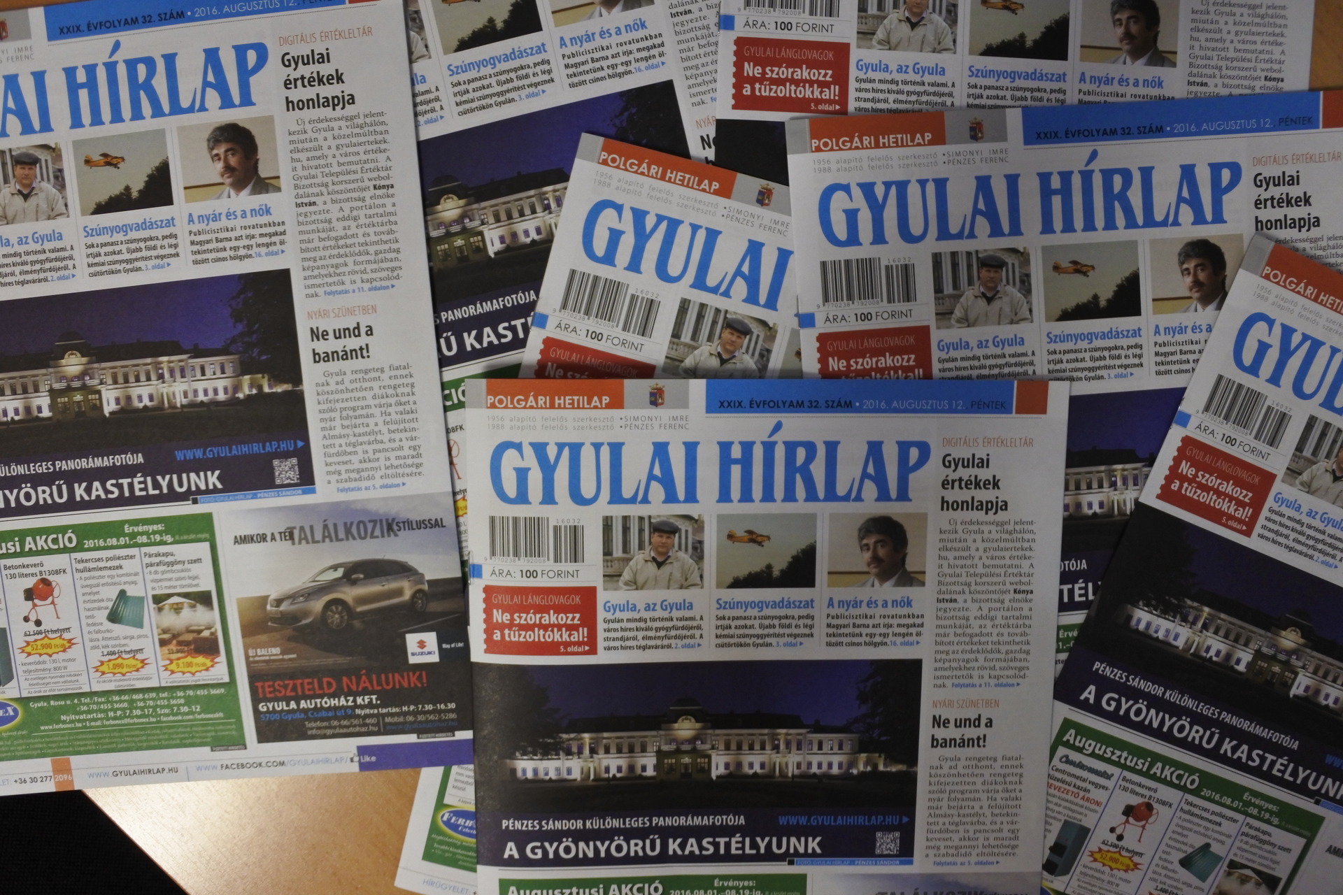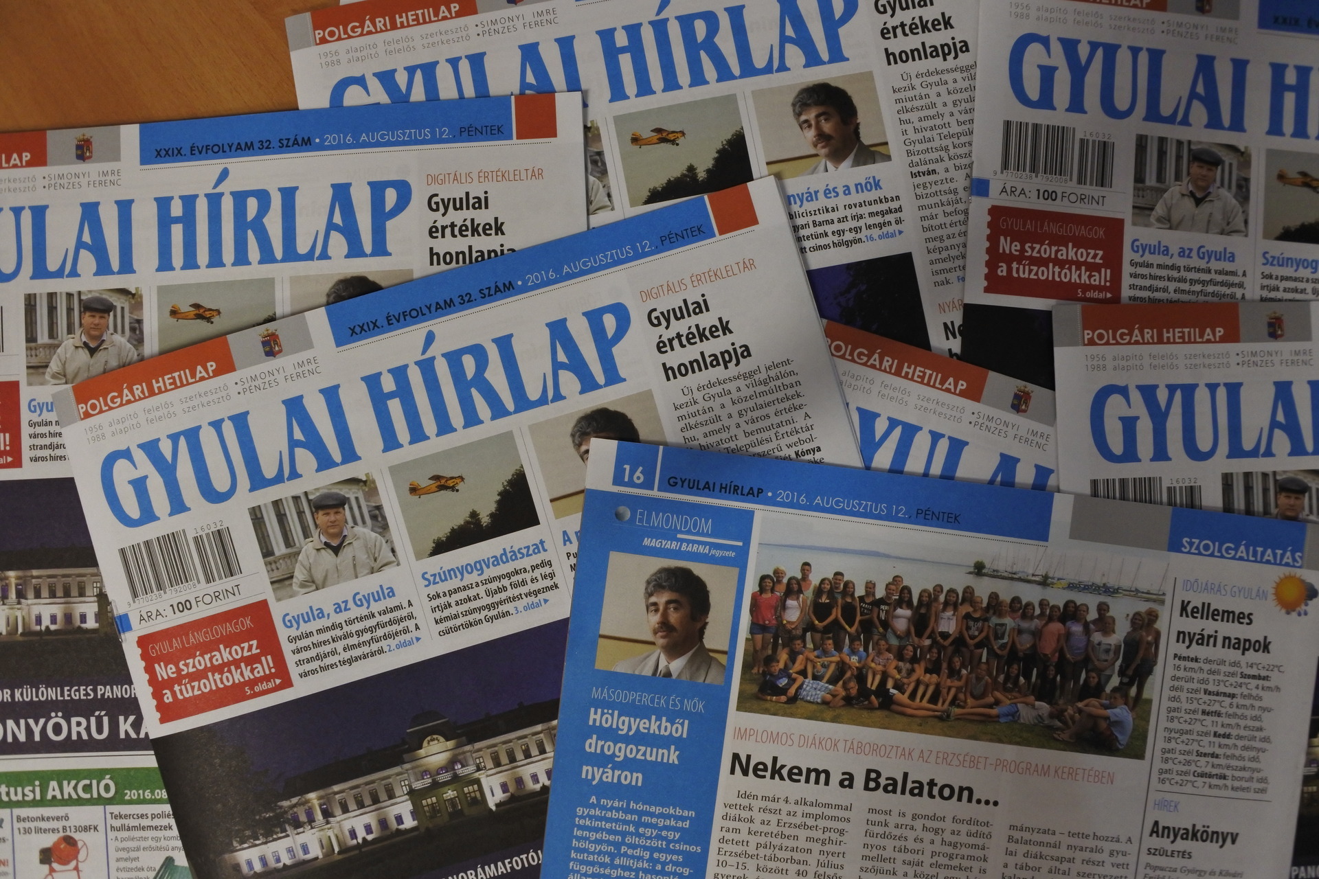 A Gyulai Hírlap XXIX. évfolyam 32. számával jelentősen megnöveljük városunk értékét, mivel hírt adunk a Gyulai értékek honlapja címmel arról a digitális értékleltárról, amit nemrégiben „nyitottak” meg online. Böngésszék kedvükre, gondolatban pedig és bátran egészítsék ki azt saját gyulai értékélményeikkel. Nyári szünetben vannak a tanulók, ahogy Bencze Gréta is, aki diáktollforgatóként a Gyulai Hírlap szerkesztőségében vendégeskedett három hetet. Reméljük, jól érezte magát nálunk, mi örültünk neki is és az írásainak is. Ne und a banánt! cikkében körbejárta Gyulát, a nyarat, beszélgetett fiatalokkal és felnőttekkel, majd megírta, hogyan lehet itthon jól vakációzni. Béres István, városunk főépítésze egyre ritkábban ragad tollat, most azonban megtette, s nagyon is jól tette. Írását a Fórum rovatban olvashatják. Nem tudom, ki hogy van vele, az én életemben a gyalult tök nem igazán játszik jelentős szerepet. Súr Enikő a gyulai piacon gyalult tökkel találkozott. Ebből a találkozásból született a „Gyalult tök” írás. Jó étvágyat! A Csevegőben szomszédolunk. A többi kitalálhatják… Állásbörze rovatunkat a dolgozni vágyók ne tévesszék szem elől! A gyulai önkormányzat több dologban is segíteni szeretné a városunkban élő fiatalokat. Bencze Gréta annak is utánajárt, hogy mit csináljunk, ha lemaradtunk a főiskoláról vagy/és az egyetemről. Zenél a kastély augusztus 26-án. Ezt nem szabad kihagyni! Minden részlet lapunk 4. oldalán elolvasható. A román anyanyelvű turisták ezentúl mindent megtudhatnak Gyuláról a visitgyula.com oldalon. Valaki szándékosan tévesztette meg a gyulai tűzoltókat. Az „emberke” helyében ezentúl nagyon messzire elkerülném a lánglovagokat! Magyar bajnok lett Bartyik Bianka. Gratulálunk neki! Emléktáblát avattunk Kerecsényi László hős és vitéz tiszteletére. Dúskálunk a kultúrában Gyulán, s tényleg igyekszünk lépést tartani az eseményekkel, online se mindig megy, print meg még kevésbé. Azért csemegéket találnak ezen a héten is lapunkban. Spanyol filmre ülünk be a moziba. A házi aszalás titkairól írunk az Olvasójegyben. Luckynek otthont keresünk. Vitaminbombákkal fenyegetjük a szervezetünket az Életmód rovatban. Bolhákat keresünk nagyítóval az akácosban Feri bácsival, aki nem csak szabadidejében, de álmában is kertész. Lehűtött dinnyével ülünk ki a teraszra, hogy végig böngésszük az aprókat a lapban. Semmi baj, ha bealudtál, mert nem maradtál le semmiről. Magyari Barna, a nők és a „drogok” megvárnak. Kellemes nyári napok jönnek. Hajnalban találkozunk a Körösnek szép partjánál.