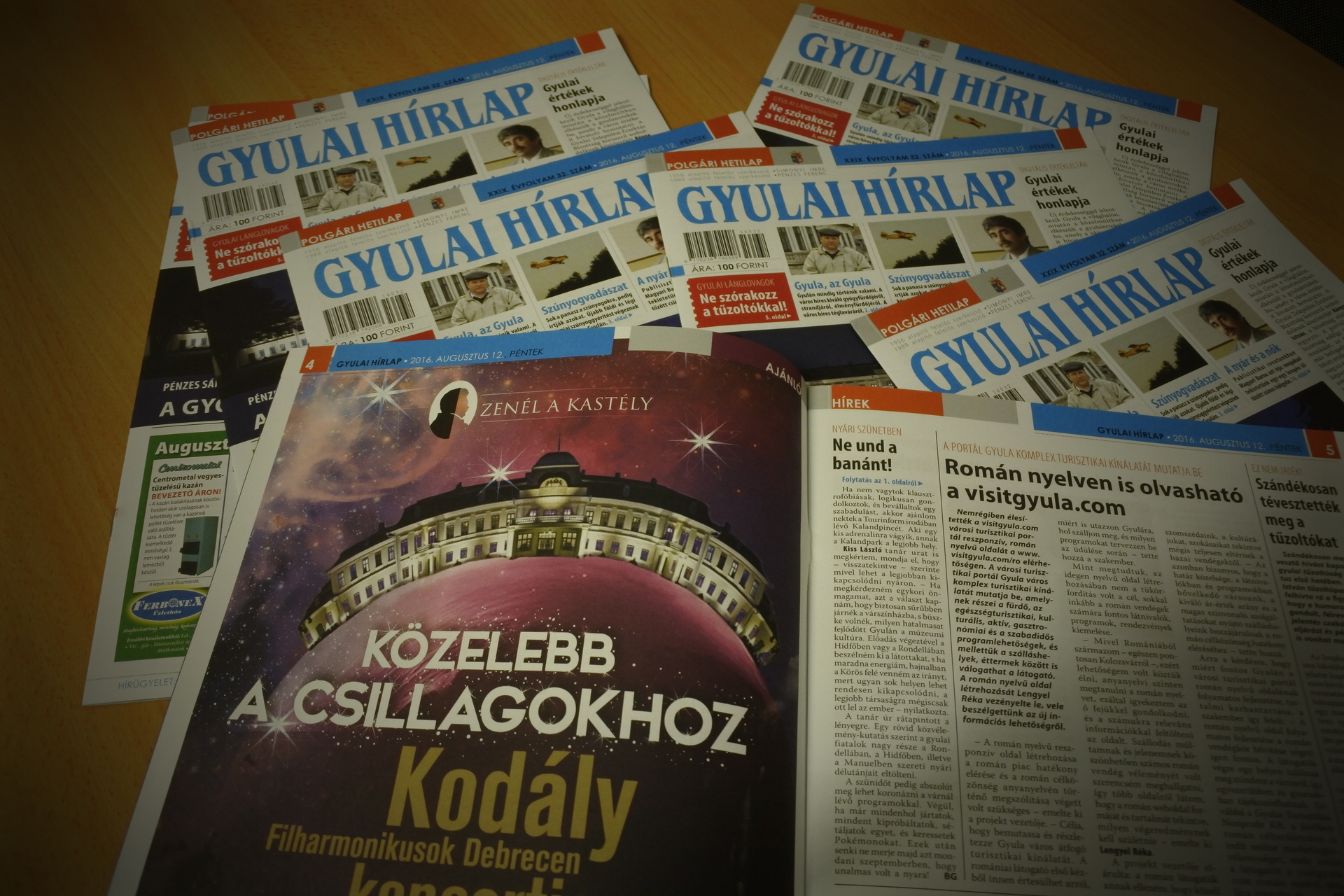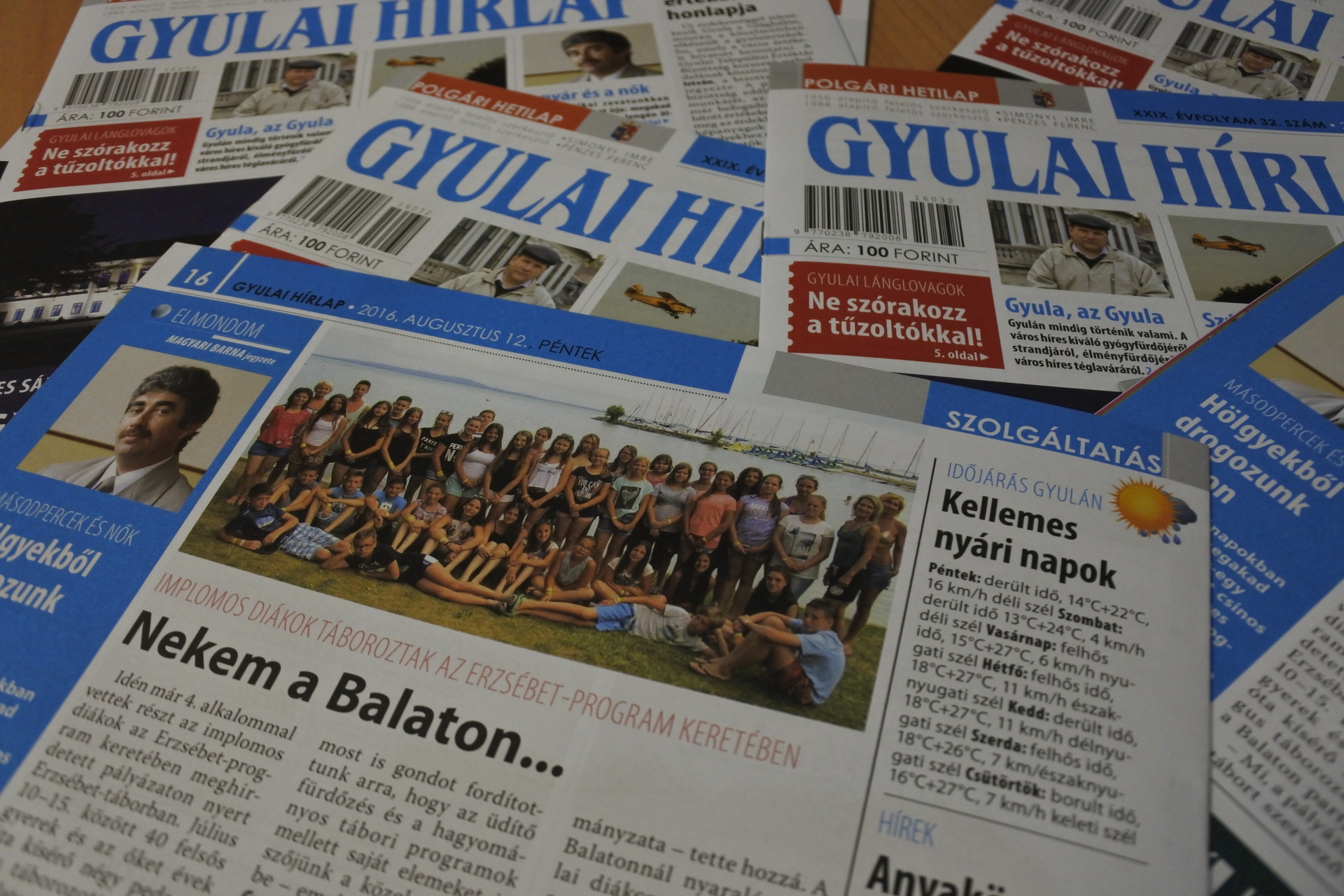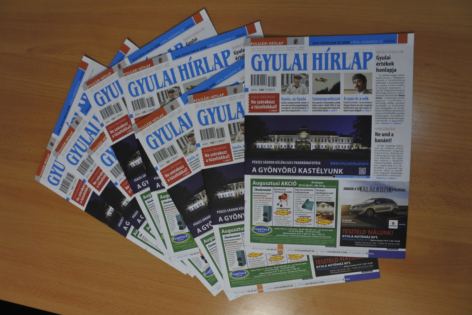 A Gyulai Hírlap XXIX. évfolyam 32. számával jelentősen megnöveljük városunk értékét, mivel hírt adunk a Gyulai értékek honlapja címmel arról a digitális értékleltárról, amit nemrégiben „nyitottak” meg online. Böngésszék kedvükre, gondolatban pedig és bátran egészítsék ki azt saját gyulai értékélményeikkel. Nyári szünetben vannak a tanulók, ahogy Bencze Gréta is, aki diáktollforgatóként a Gyulai Hírlap szerkesztőségében vendégeskedett három hetet. Reméljük, jól érezte magát nálunk, mi örültünk neki is és az írásainak is. Ne und a banánt! cikkében körbejárta Gyulát, a nyarat, beszélgetett fiatalokkal és felnőttekkel, majd megírta, hogyan lehet itthon jól vakációzni. Béres István, városunk főépítésze egyre ritkábban ragad tollat, most azonban megtette, s nagyon is jól tette. Írását a Fórum rovatban olvashatják. Nem tudom, ki hogy van vele, az én életemben a gyalult tök nem igazán játszik jelentős szerepet. Súr Enikő a gyulai piacon gyalult tökkel találkozott. Ebből a találkozásból született a „Gyalult tök” írás. Jó étvágyat! A Csevegőben szomszédolunk. A többi kitalálhatják… Állásbörze rovatunkat a dolgozni vágyók ne tévesszék szem elől! A gyulai önkormányzat több dologban is segíteni szeretné a városunkban élő fiatalokat. Bencze Gréta annak is utánajárt, hogy mit csináljunk, ha lemaradtunk a főiskoláról vagy/és az egyetemről. Zenél a kastély augusztus 26-án. Ezt nem szabad kihagyni! Minden részlet lapunk 4. oldalán elolvasható. A román anyanyelvű turisták ezentúl mindent megtudhatnak Gyuláról a visitgyula.com oldalon. Valaki szándékosan tévesztette meg a gyulai tűzoltókat. Az „emberke” helyében ezentúl nagyon messzire elkerülném a lánglovagokat! Magyar bajnok lett Bartyik Bianka. Gratulálunk neki! Emléktáblát avattunk Kerecsényi László hős és vitéz tiszteletére. Dúskálunk a kultúrában Gyulán, s tényleg igyekszünk lépést tartani az eseményekkel, online se mindig megy, print meg még kevésbé. Azért csemegéket találnak ezen a héten is lapunkban. Spanyol filmre ülünk be a moziba. A házi aszalás titkairól írunk az Olvasójegyben. Luckynek otthont keresünk. Vitaminbombákkal fenyegetjük a szervezetünket az Életmód rovatban. Bolhákat keresünk nagyítóval az akácosban Feri bácsival, aki nem csak szabadidejében, de álmában is kertész. Lehűtött dinnyével ülünk ki a teraszra, hogy végig böngésszük az aprókat a lapban. Semmi baj, ha bealudtál, mert nem maradtál le semmiről. Magyari Barna, a nők és a „drogok” megvárnak. Kellemes nyári napok jönnek. Hajnalban találkozunk a Körösnek szép partjánál.