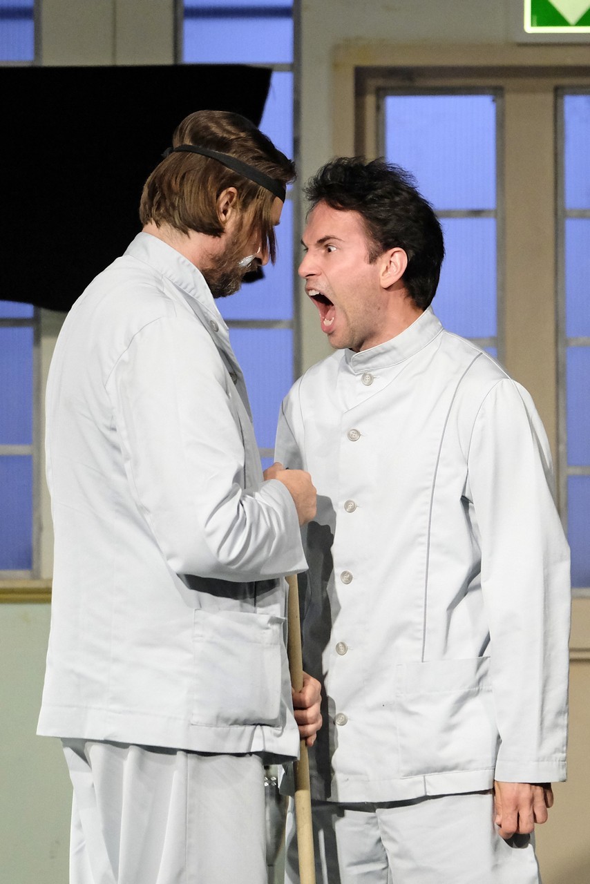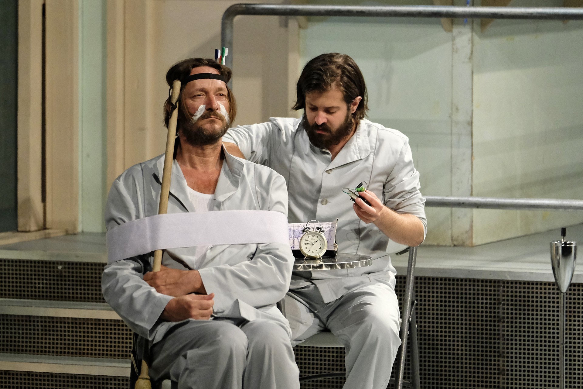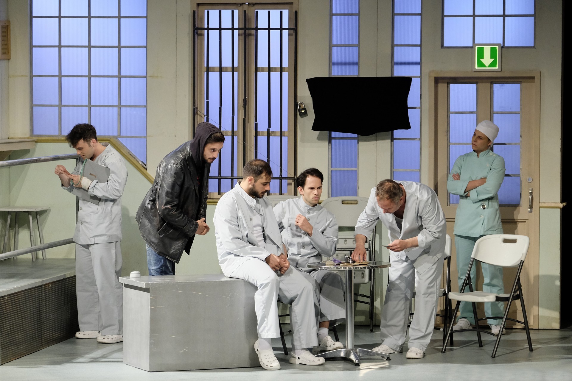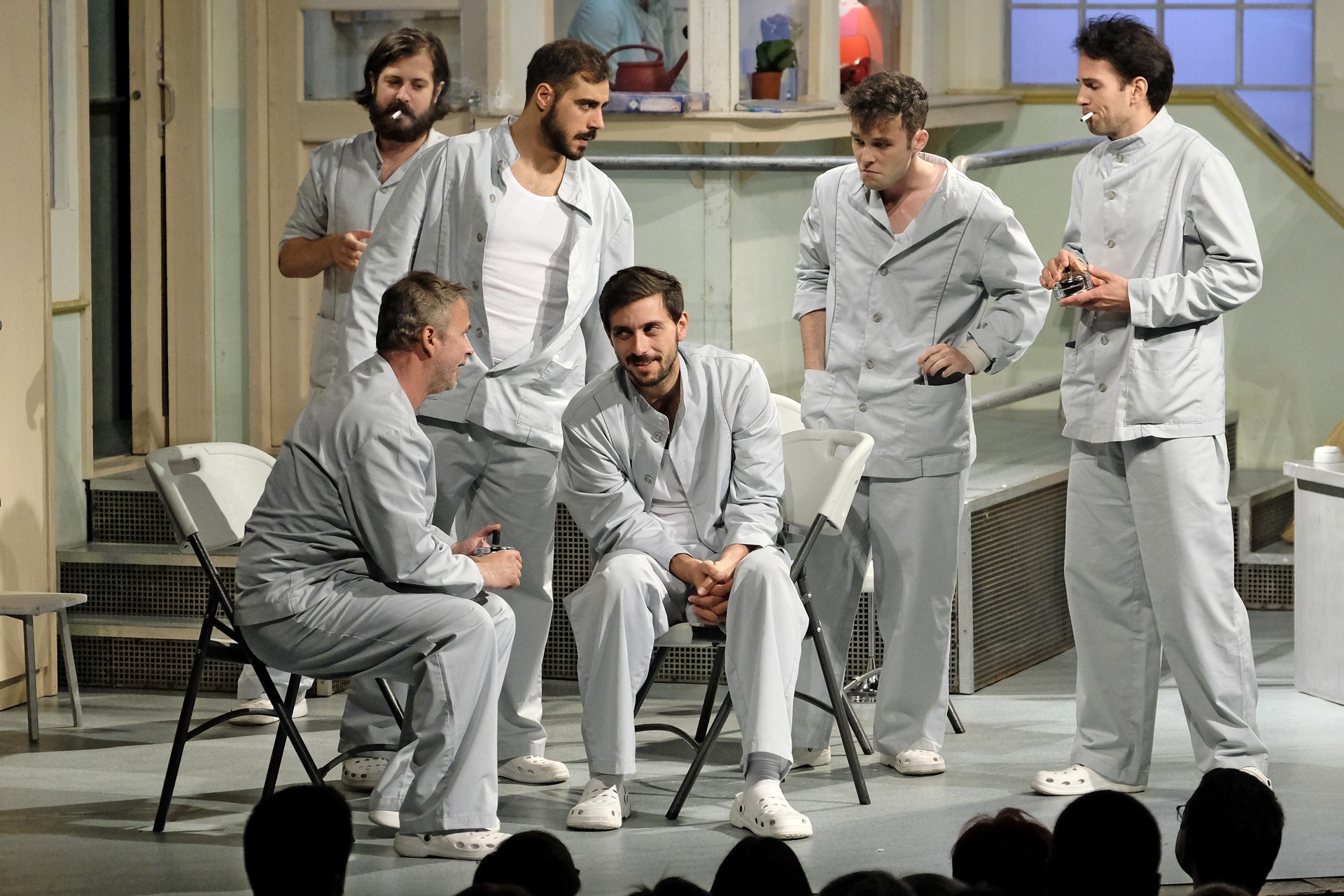 Be kell vallanom, ambivalens érzések kavarogtak bennem, hiszen egy 5 Oscar-díjas filmmel felvenni a versenyt, és újat mutatni, színdarabot írni a műből, vagy színpadra állítani nem kis kihívás. De ezt az akadályt könnyedén átugrották. Dale Wasserman librettója alapján, Znamenák István összeszedett, tökéletesen megkoreografált rendezésében a mű újabb köntöst kapott. A színdarabot a filmmel ellentétben inkább mondanám közönségbarátabbnak az itt-ott megtűzdelt poénjai és félmondatai miatt, melyek mosolyt csaltak az arcokra, és feloldották a nyomasztó légkört, míg a filmben inkább a realisztikus helyzetábrázolás kap teret. Tehát szó, ami szó, borzasztóan izgatott, hogy mi fog történni a színpadon, azonban nem emlékszem másra, csak arra, hogy miután kihunytak a nézőtéren a fények, megjelent egy dimenziókapu, és beszippantotta az egész közönséget. Ott lebegtünk valahol a valóság és a színjáték mezsgyéjén, a cselekmény előrehaladtával nehezen lehetett eldönteni, mégis hol vagyunk valójában. Egy színházi előadáson vagy egy pszichiátriai osztály társalgójában. Szabó Kimmel Tamás játékára a legtalálóbb jellemző a természetesség és könnyedség, minden mondat, minden mozdulat rendkívül jól állt neki. Péterfy Bori tökéletesen formálta meg a diktatórikus, elembertelenítő és kőszívű Ratched nővért, mondatai nyomán megfagyott a levegő. Kocsis Pál pedig szavak nélkül is fantasztikusan töltötte meg tartalommal Bromden indiánfőnök szerepét. Minden elismerésem a castingosé, aki remekül válogatta össze a szereplőgárdát, egytől egyig emlékezetes alakítások születtek.