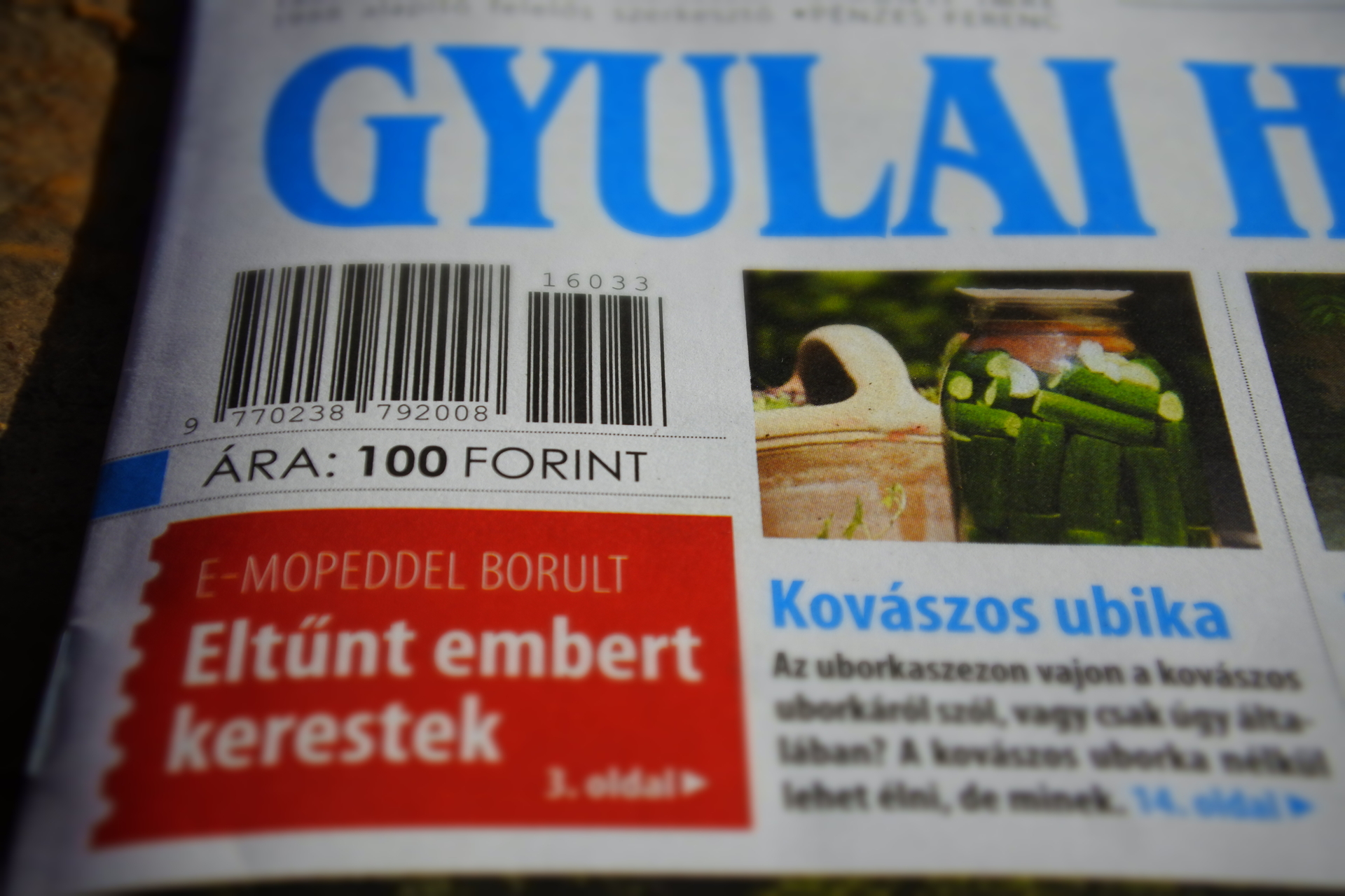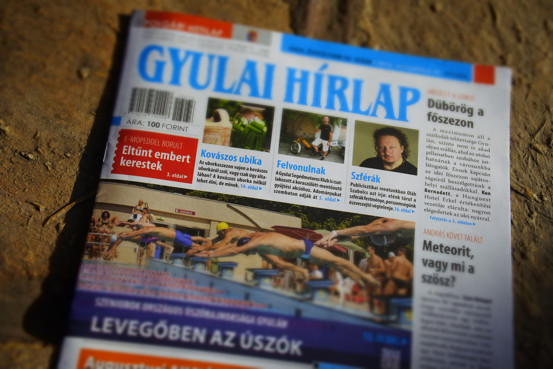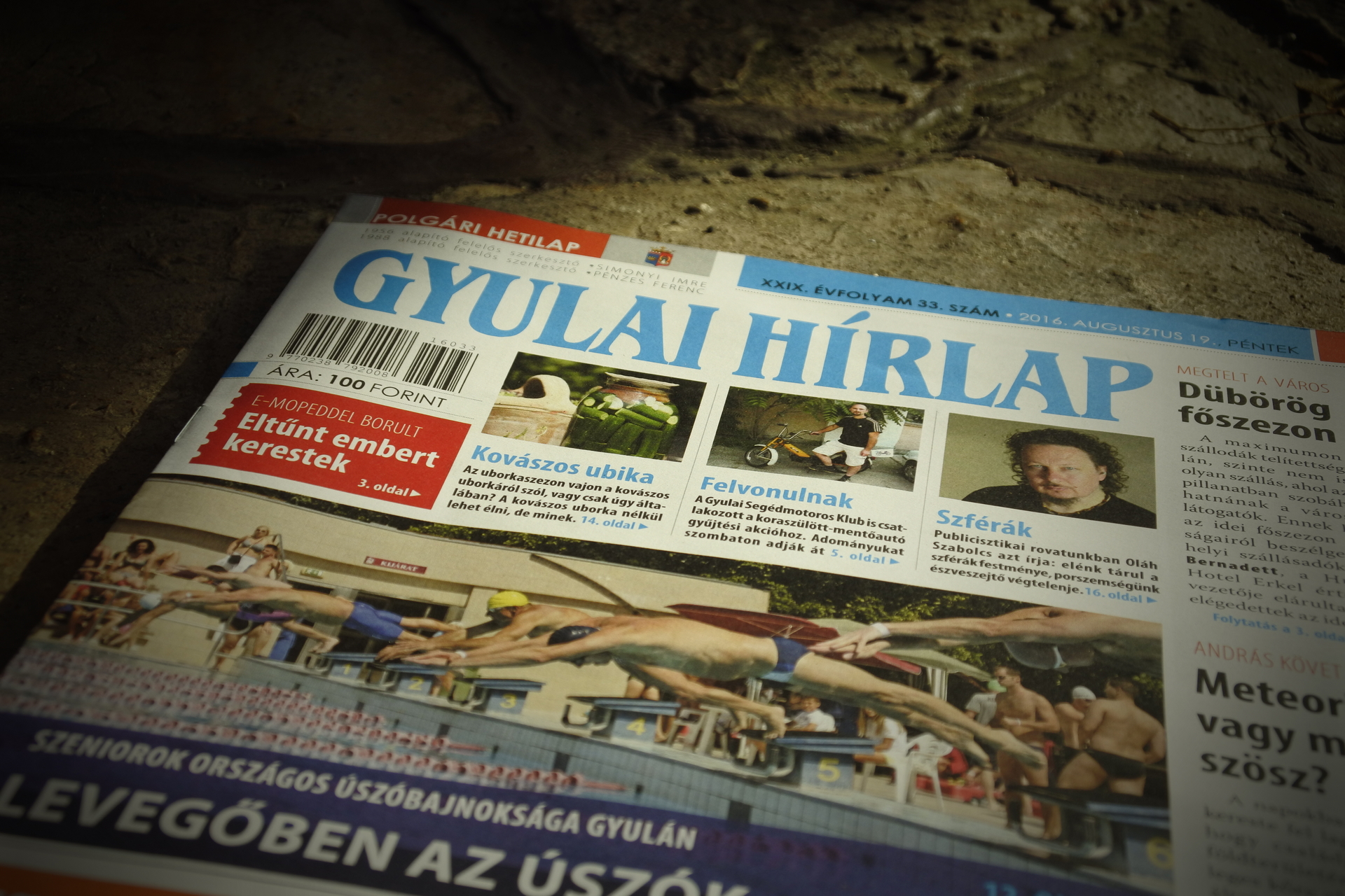 A Gyulai Hírlap XXIX. évfolyam 33. számában együtt csobbanunk szenior úszóinkkal. A turisztikai piac résztvevőivel rátapasztottuk fülünket városunk képzeletbeli mellkasára, s meghallottuk, ahogy dübörög a csupaszív főszezon. András követ talált, majd üzenetet írt nekünk, hogy nézzük meg a talált kövét, ami lehet, hogy egy meteorit. Szabó Eszti ment el, hogy megnézze Andrást és a követ, ami lehet, hogy meteorit, de nem biztos, hogy az. Ami ebben a történetben biztos, hogy András nem meteorit, a kő pedig nem András. Remélem, hogy érhető voltam. Az idei szőlőtermésbe kóstolt bele Súr Enikő a gyulai piacon. A termés mennyisége jó, a szőlő finom, a vevők azonban nem nagyon akarnak ráharapni a szőlőre. Csevegő rovatunkban a MÁV-nak köszönhetően időutazunk. Köszönjük, MÁV! Állásbörze rovatunk a megszokottnál is tartalmasabb, munkakeresők ezen a héten is előnyben. Félmillió gazdálkodót minősített a NAV. Egy e-bringás árokba borult. A gyulai lánglovagok pedig eltűnt embert kerestek. A Minden Magyarok Néptáncfesztiváljának teljes programja elolvasható a Gyulai Hírlap 4. oldalán. Augusztus 20-án adománygyűjtő motorosok vonulnak fel városunkban. Megyenapra készülünk, megírjuk a szeptember 3-ai nap programjait. Gyula város példaértékű sportolói sorozatunkban ezúttal Csukás József labdarúgóval beszélgetett Bimbó Lajos. Gyulai civilekkel utaztunk Aradra, hogy aradi civilekkel találkozzunk. Egykori gyulai ’56-os forradalmárokkal elevenítettük fel "azokat" a napokat. Sikeres évadot zárt a Gyulai Várszínház, a nézőszám elérte a 27 ezret. A víz a főszereplője a Székely Aladár Fotóklub legújabb tárlatának. Hamisítatlan érintés volt a GYAK kispART-ja. Fodor György tanár úr tollából minden kiderül. Vasárnap gyulai kolbászt sütünk palacsinta tésztában a nagyival. A Haverok fegyverben című filmre röhögjük szét a mozit. A héten pici cicáknak keresünk gazdikat. A padlizsán fogyasztását szeretnénk kicsit „megnyomni” Szalai Ilona cikkével. Uborkára és annak kovászolására buzdítjuk olvasóinkat Pomázi Ferenccel, aki még álmában is kertész. Csemegézzen az apróhirdetések között is. Egy apró malőr is történt a heti lapszámban. A nyomtatott lapból lemaradt Oláh Szabolcs jegyzetének az eleje, egészen pontosan a leadja. Szabolcs teljes szféraélménye az online oldalunkon is megtalálható publicisztikájának összeolvasásával érhető el. Végezetül lazán lubickoltunk mi is egyet a gyulai éjszakában. Nyakunkon a nyár utolsó hetei. Használjuk el és ki!