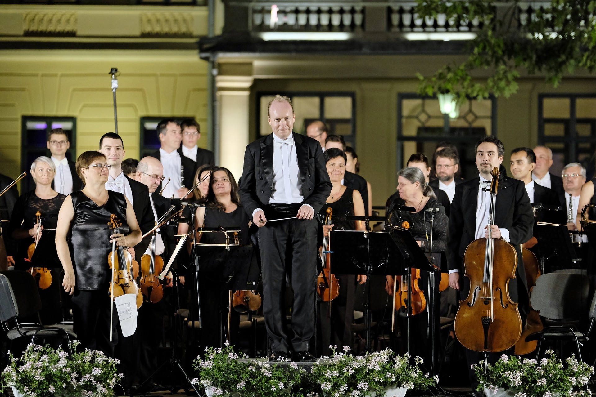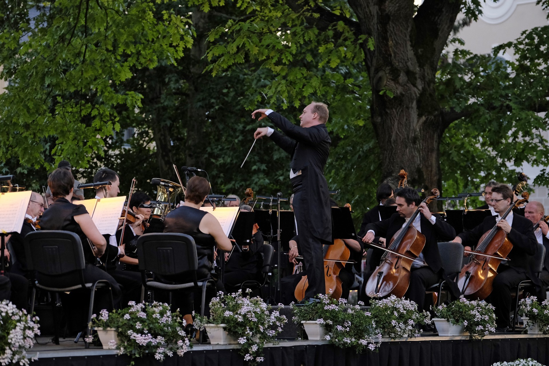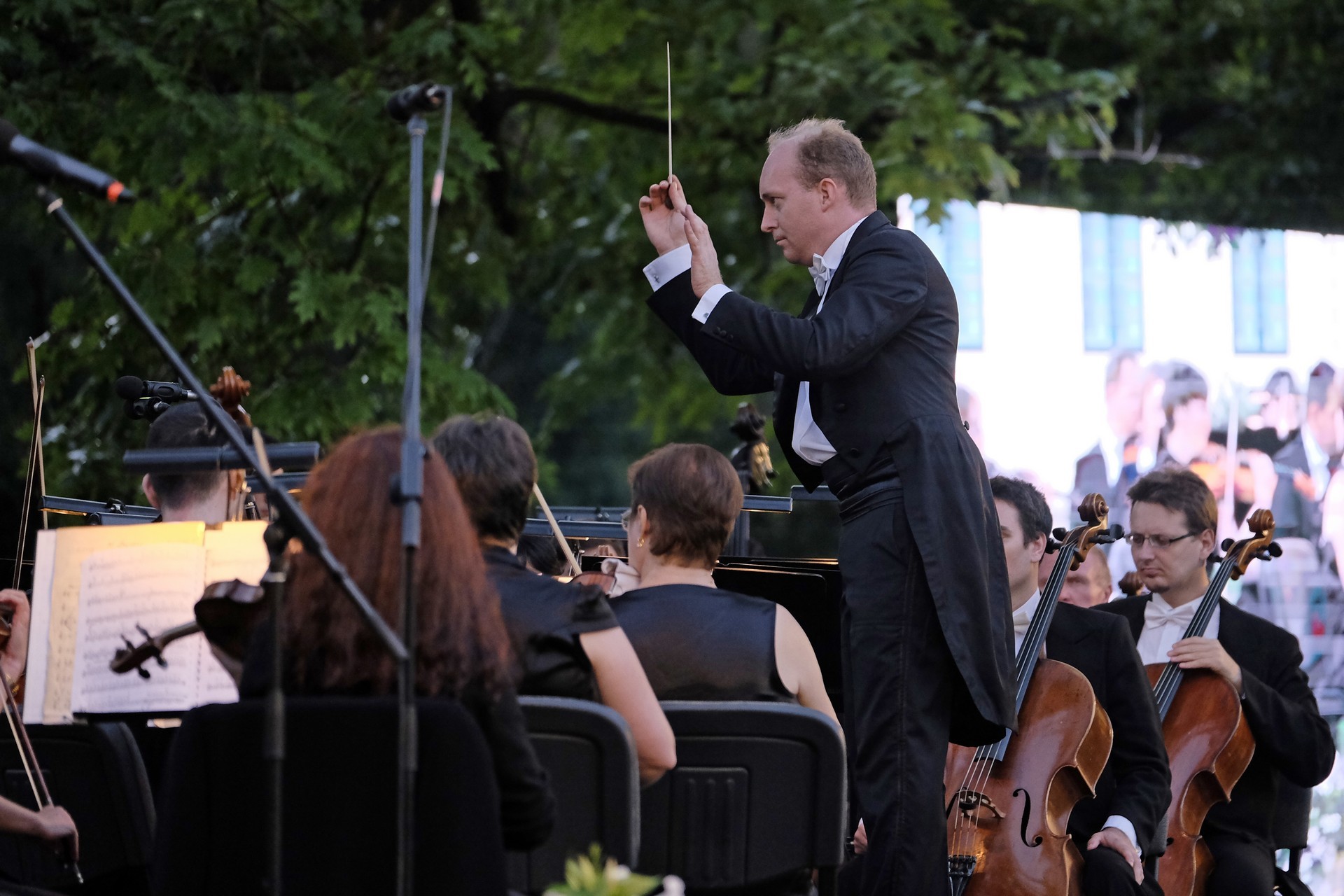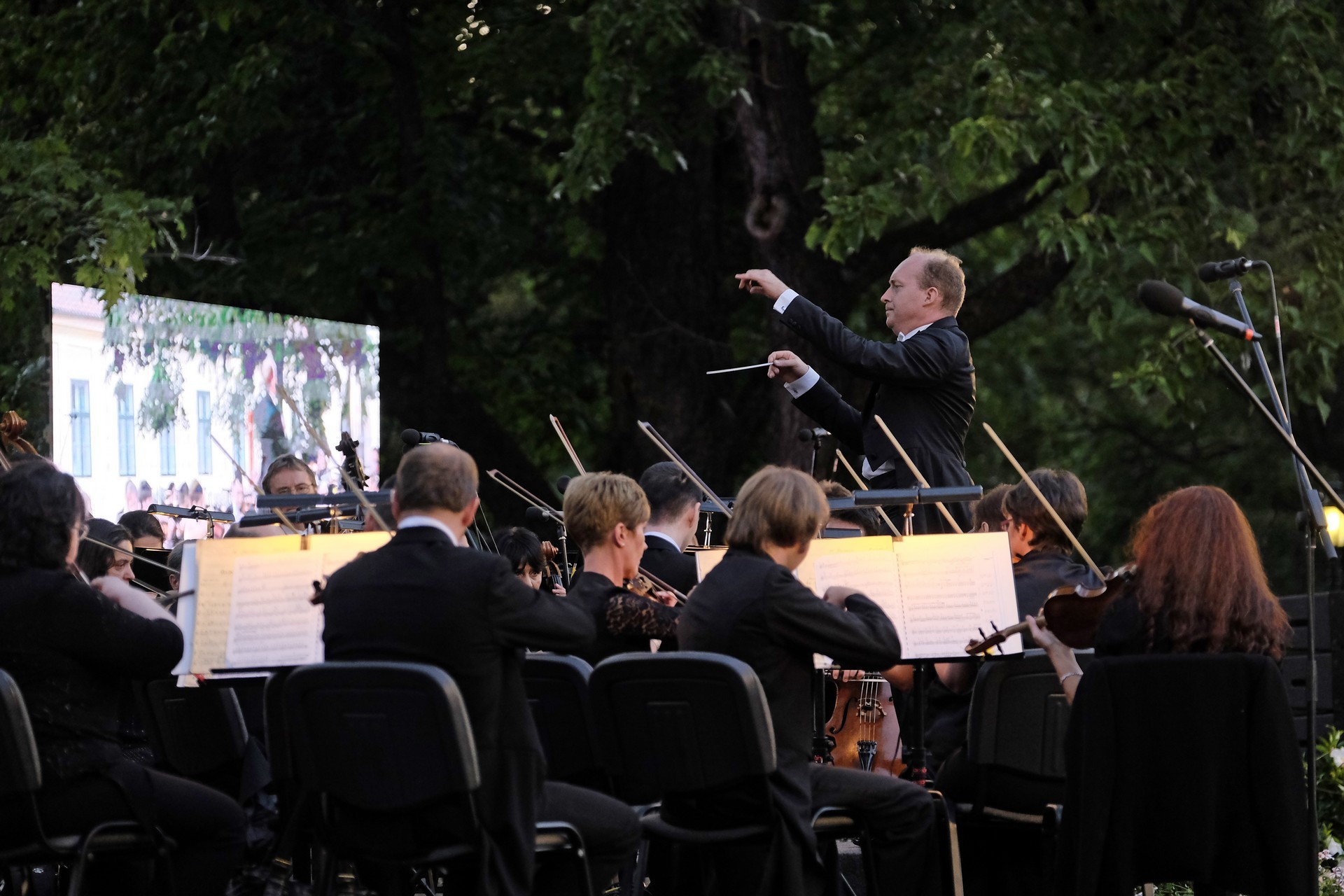 Az elhangzó műveket az esthez tökéletesen illeszkedő, megejtő emberséggel megragadott, informatív összekötőszövegeivel a kellemes modorú Gróf Miklós konferálta fel, ami által a másodikként elhangzó Csillagok háborúja című film ismert zenéjét magától értetődőn követte Sosztakovics édes-bús keringője, melynek hallatán nemegyszer könnybe lábadt az ember szeme. A műfaji kalandozások Vivaldi négy évszak című művével folytatódtak, amelyből a Nyár III., befejező tétele volt hallható. A színpad jobb oldalára helyezett kivetítőn négy közvetítői kamera gondos összehangoltságának köszönhetően látható is volt, ahogy Somogyi-Tóth Dániel a zenekarral karizmatikusan felépítteti és összefogja a szétpattanni készülő zenei erőt. A fényekkel pazarul komponáló operatőrök a hegedűszólót játszó Alexáné Kardos Ildikót is kiemelték, és a zenekar valamennyi rezdülését megmutatták. Debussy impresszionista stílusban fogant, szinte pókháló finomságú Holdfénye hallgatása közben a parkra is szép lassan ráborult az est. A nagyon erős felütéssel induló koncert a lassabb tételek miatt ekkorra kissé belesimult a nyáresti környezetbe, de Handel barokk Tűzijáték szvitjével visszatért a kezdeti dinamikus hangvétel. A remek megoldásokkal tűzdelt, minden pillanatában ünnepélyes mű még a műfajhoz kevésbé vonzódókban is felkeltette a zene életszeretet fokozó erejét. Épp ezért a befejezésként játszott Csajkovszkij-mű után a ráadás sem maradhatott el, a közönség ovációját a zenekar a Karib-tenger kalózai című Walt Disney-film legismertebb részletének eljátszásával hálálta meg. A parádés fokozásokkal teli mű lendülete a közönséget is magával ragadta.