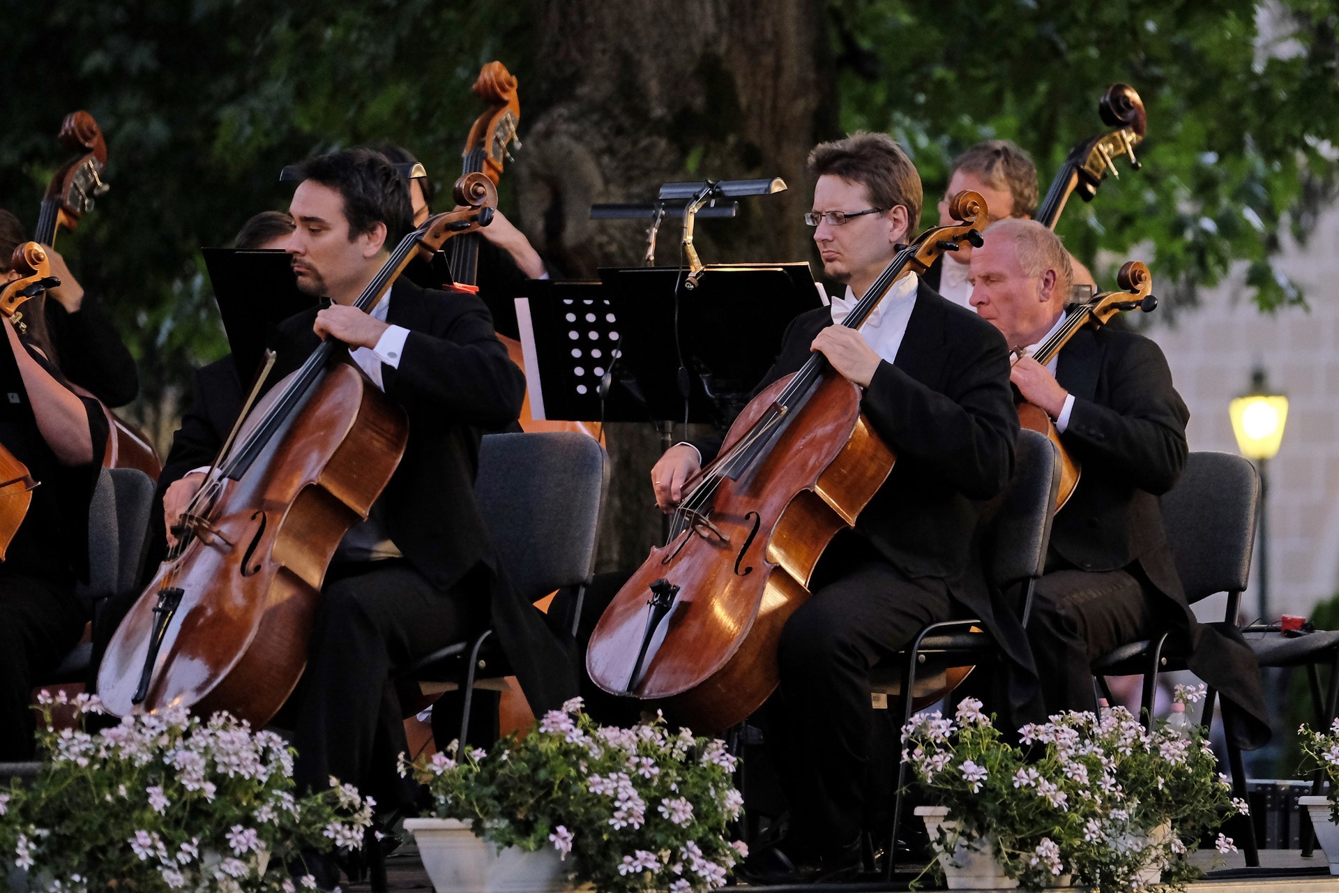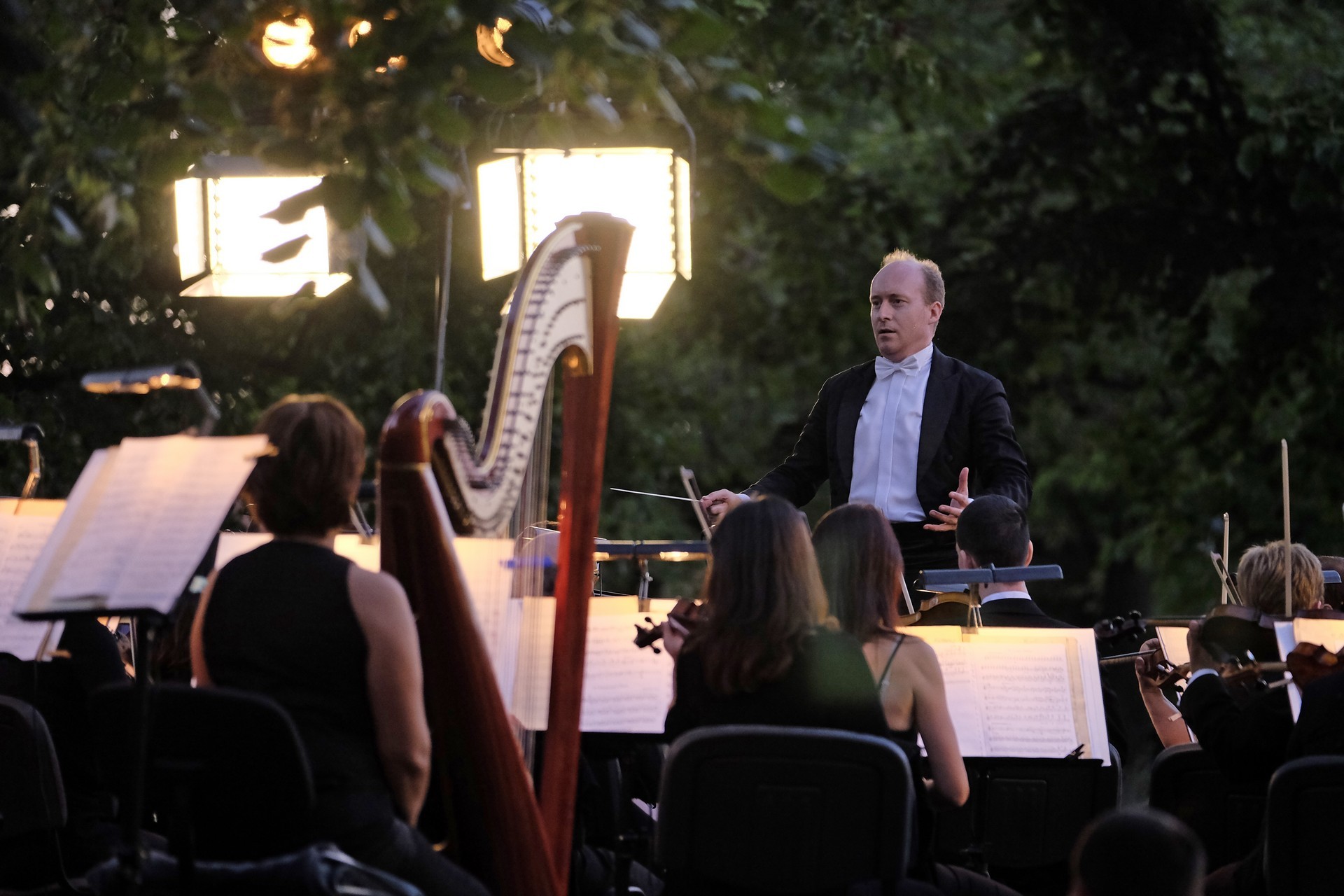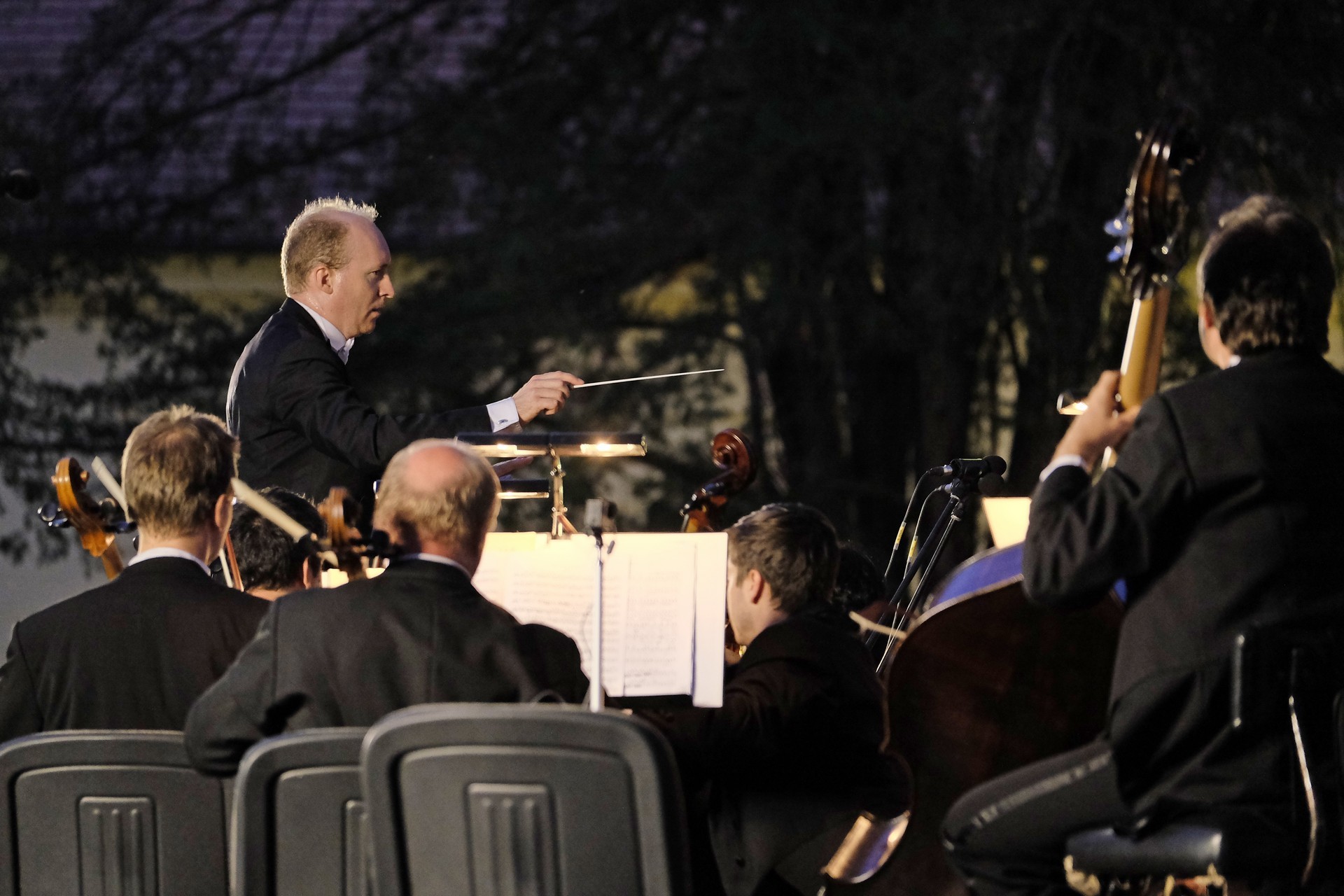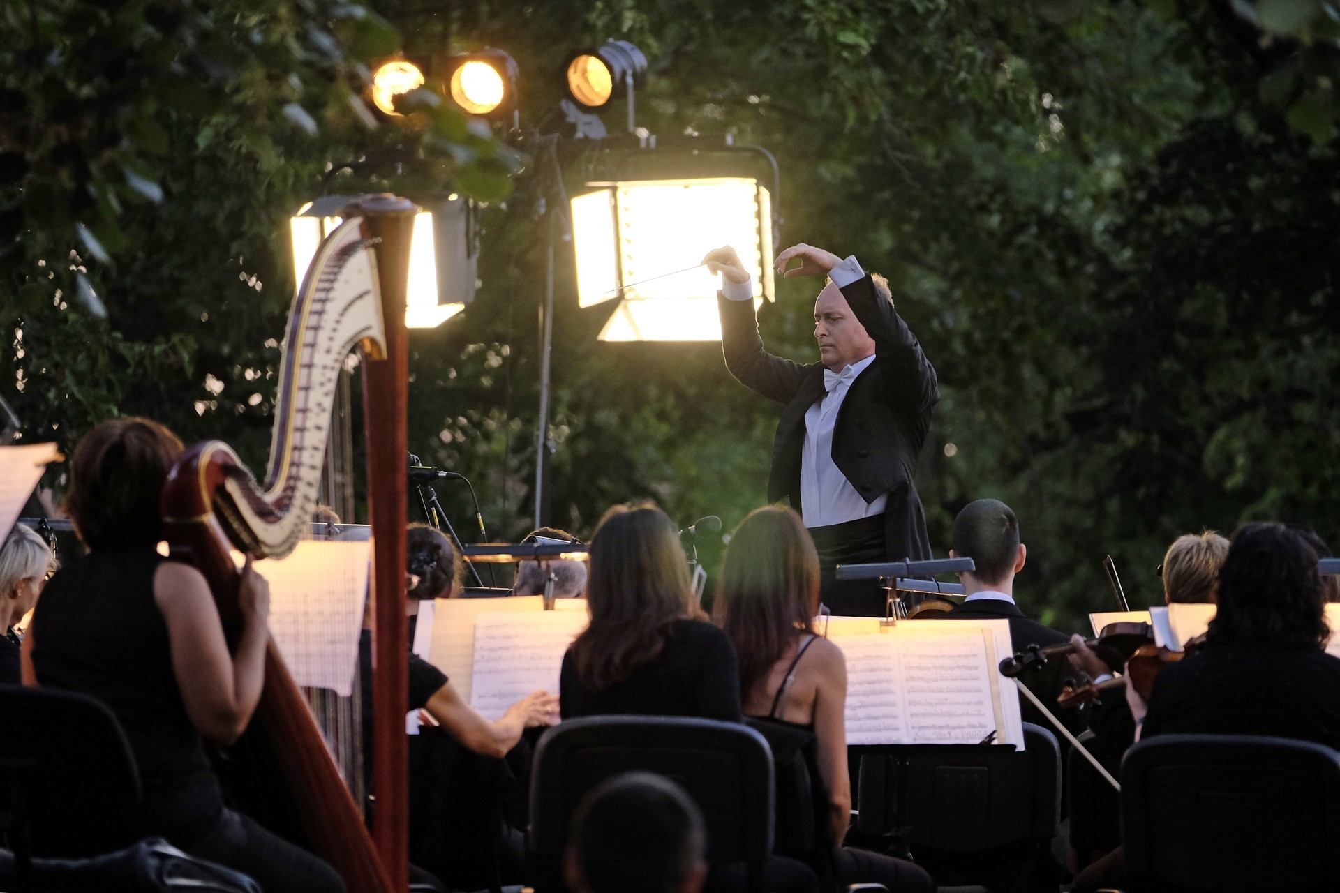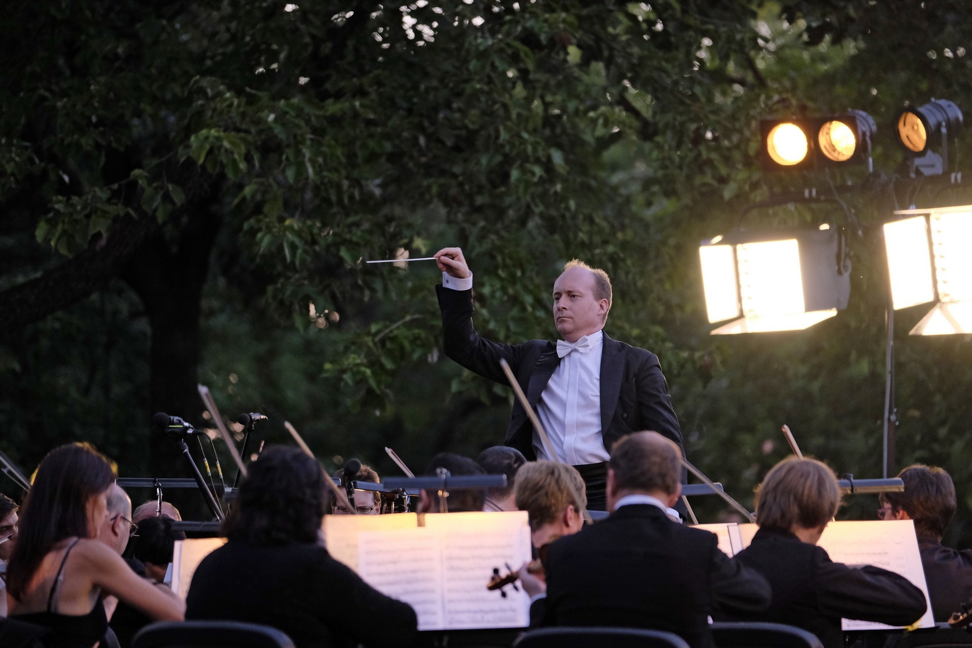 Az elhangzó műveket az esthez tökéletesen illeszkedő, megejtő emberséggel megragadott, informatív összekötőszövegeivel a kellemes modorú Gróf Miklós konferálta fel, ami által a másodikként elhangzó Csillagok háborúja című film ismert zenéjét magától értetődőn követte Sosztakovics édes-bús keringője, melynek hallatán nemegyszer könnybe lábadt az ember szeme. A műfaji kalandozások Vivaldi négy évszak című művével folytatódtak, amelyből a Nyár III., befejező tétele volt hallható. A színpad jobb oldalára helyezett kivetítőn négy közvetítői kamera gondos összehangoltságának köszönhetően látható is volt, ahogy Somogyi-Tóth Dániel a zenekarral karizmatikusan felépítteti és összefogja a szétpattanni készülő zenei erőt. A fényekkel pazarul komponáló operatőrök a hegedűszólót játszó Alexáné Kardos Ildikót is kiemelték, és a zenekar valamennyi rezdülését megmutatták. Debussy impresszionista stílusban fogant, szinte pókháló finomságú Holdfénye hallgatása közben a parkra is szép lassan ráborult az est. A nagyon erős felütéssel induló koncert a lassabb tételek miatt ekkorra kissé belesimult a nyáresti környezetbe, de Handel barokk Tűzijáték szvitjével visszatért a kezdeti dinamikus hangvétel. A remek megoldásokkal tűzdelt, minden pillanatában ünnepélyes mű még a műfajhoz kevésbé vonzódókban is felkeltette a zene életszeretet fokozó erejét. Épp ezért a befejezésként játszott Csajkovszkij-mű után a ráadás sem maradhatott el, a közönség ovációját a zenekar a Karib-tenger kalózai című Walt Disney-film legismertebb részletének eljátszásával hálálta meg. A parádés fokozásokkal teli mű lendülete a közönséget is magával ragadta.