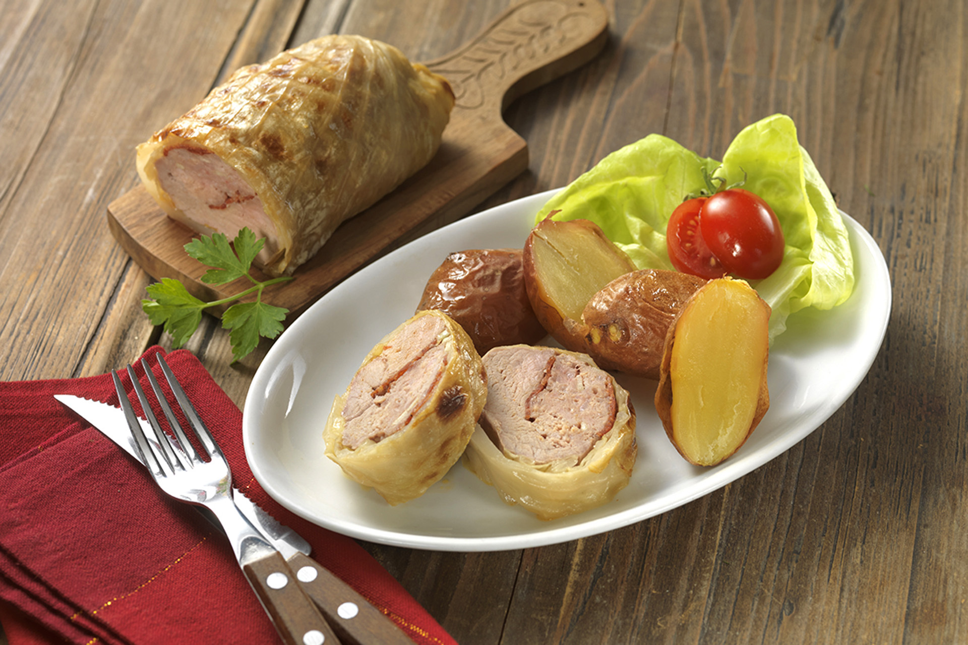A szűzpecsenyét éles késsel vékonyan lehártyázzuk, megmossuk, leszárítjuk, hosszában félig bevágjuk, sózzuk, borsozzuk. Az apróra vágott vöröshagymát a forró olajon megfuttatjuk, rászórjuk a zúzott fokhagymát, langyosra hűtjük, a darált húshoz adjuk, sóval, borssal ízesítjük és összekeverjük. A füstölt gyulai kolbászt vékony karikákra szeleteljük, a húsvágatba teszünk egy sort, beletömködjük a fűszeres darált húst, befedjük kolbászszeletekkel. A káposztalevelek vastag levélnyelét vékonyan levágjuk, félig fedve egymásra tesszük, ráfektetjük a töltött szűzpecsenyét, belecsavarjuk a káposztába, és zsírozott tepsibe tesszük. Meglocsoljuk a száraz fehérborral, és 180°C-os sütőben kb. 35 perc alatt megsütjük, többször meglocsolva a szaftjával. Éles késsel ujjnyi vastag szeletekre vágjuk, és héjában sült burgonyával körítjük.