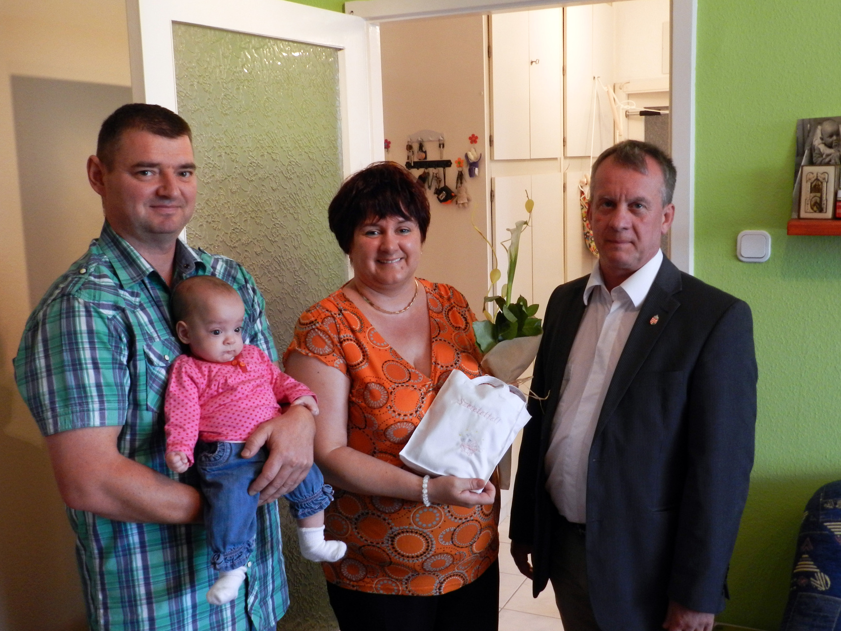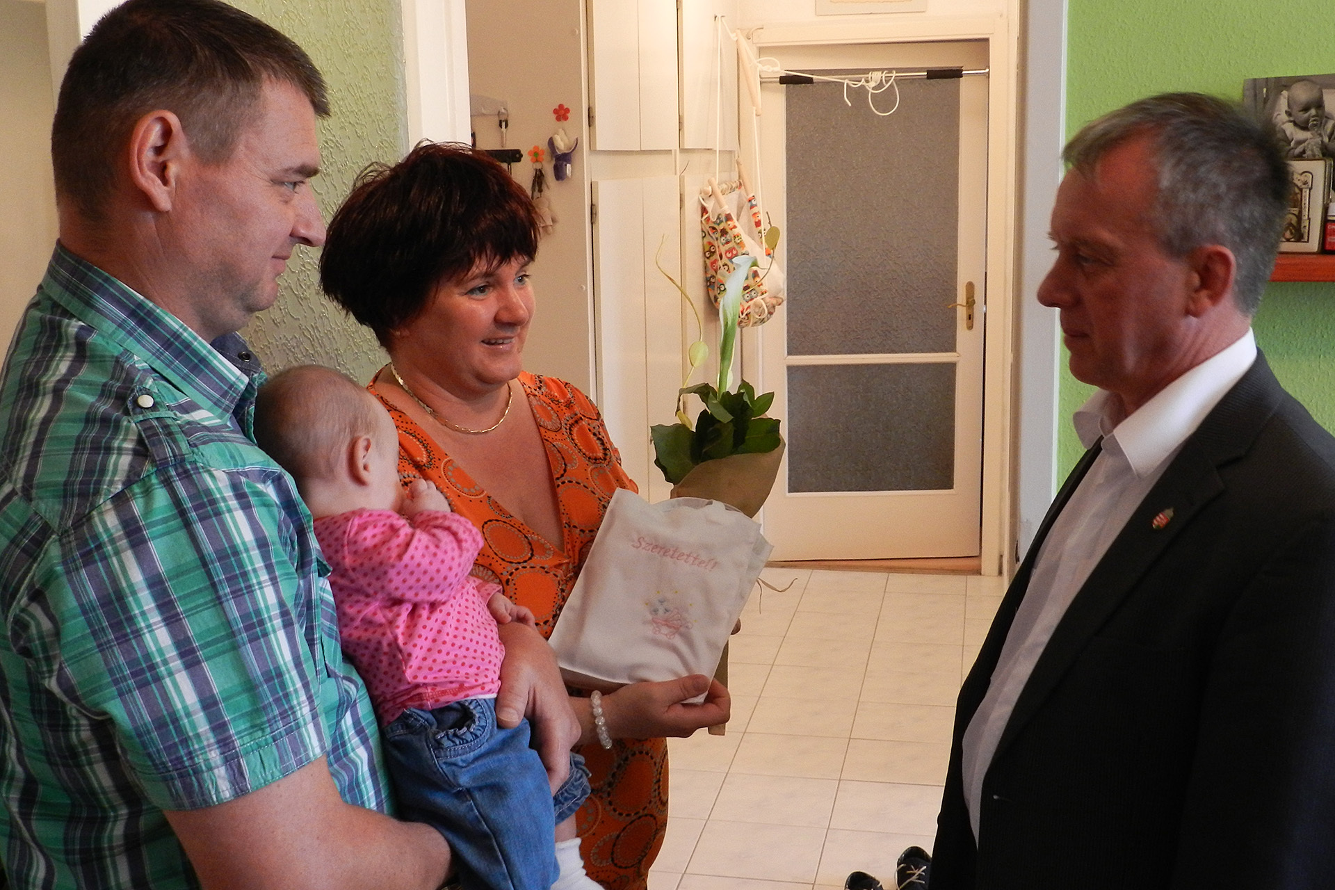 Torma Béla önkormányzati képviselő köszöntötte Nagy Fruzsinát, valamint édesanyját Nagyné Kiss Andreát. A család, a hagyományoknak megfelelően kapott egy Póka György-festményt, valamint a Gyulai Kreatív Varrónők Szövetkezetétől egy babaruhát, amelyen szerepel kicsi neve, születési dátuma, születési súlya és csillagjegye.