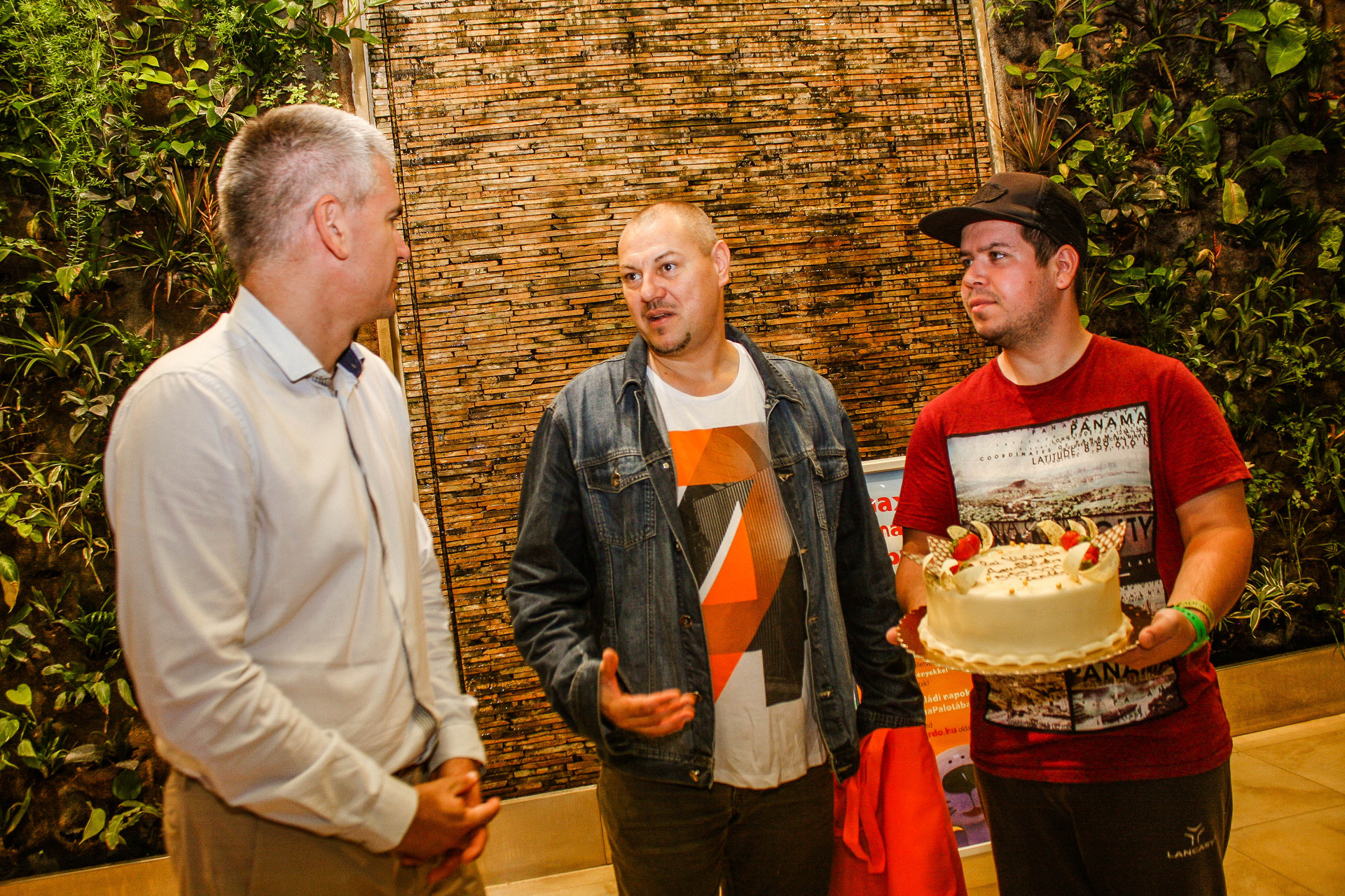 Kovács Zsoltot és Kovács Gyulát tortával köszöntötte Boros László Attila, a várfürdő igazgatója