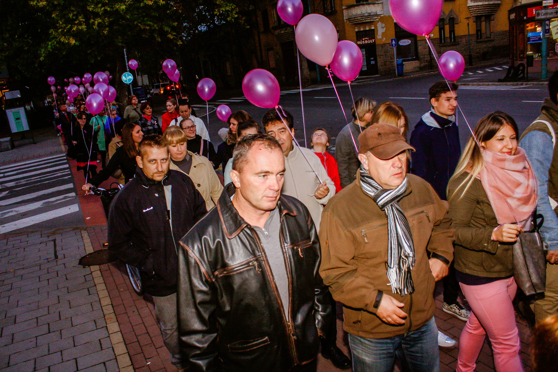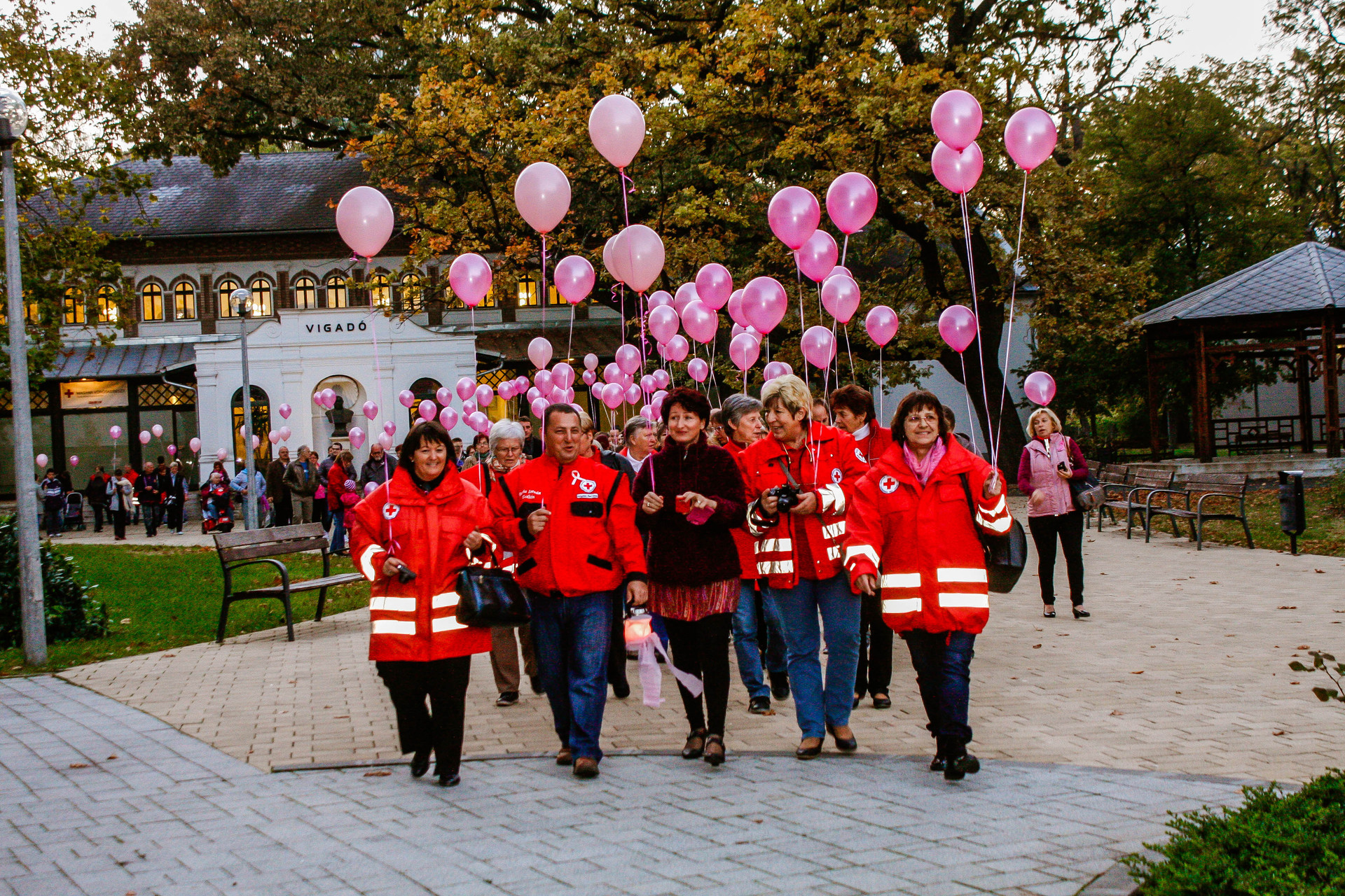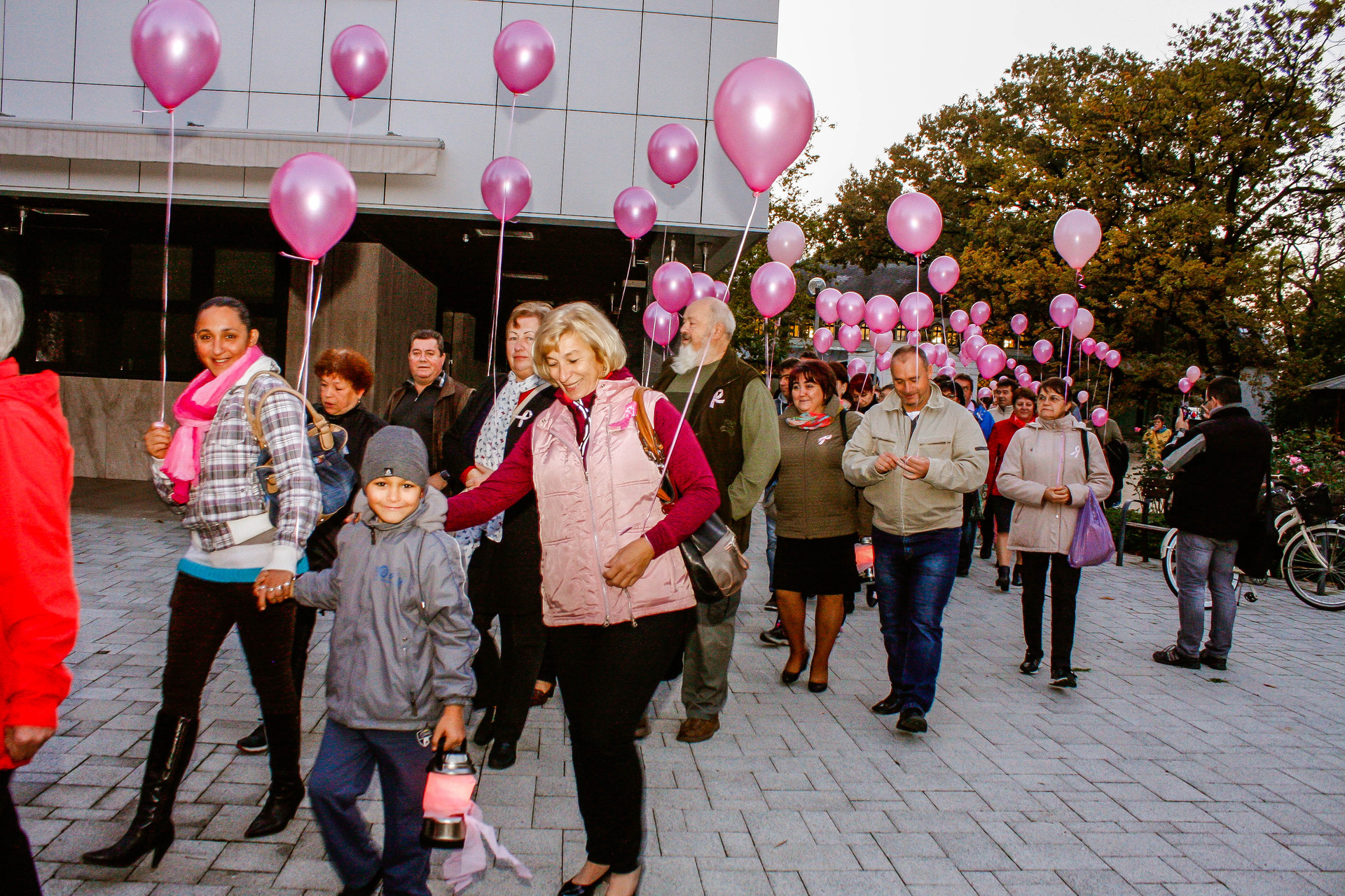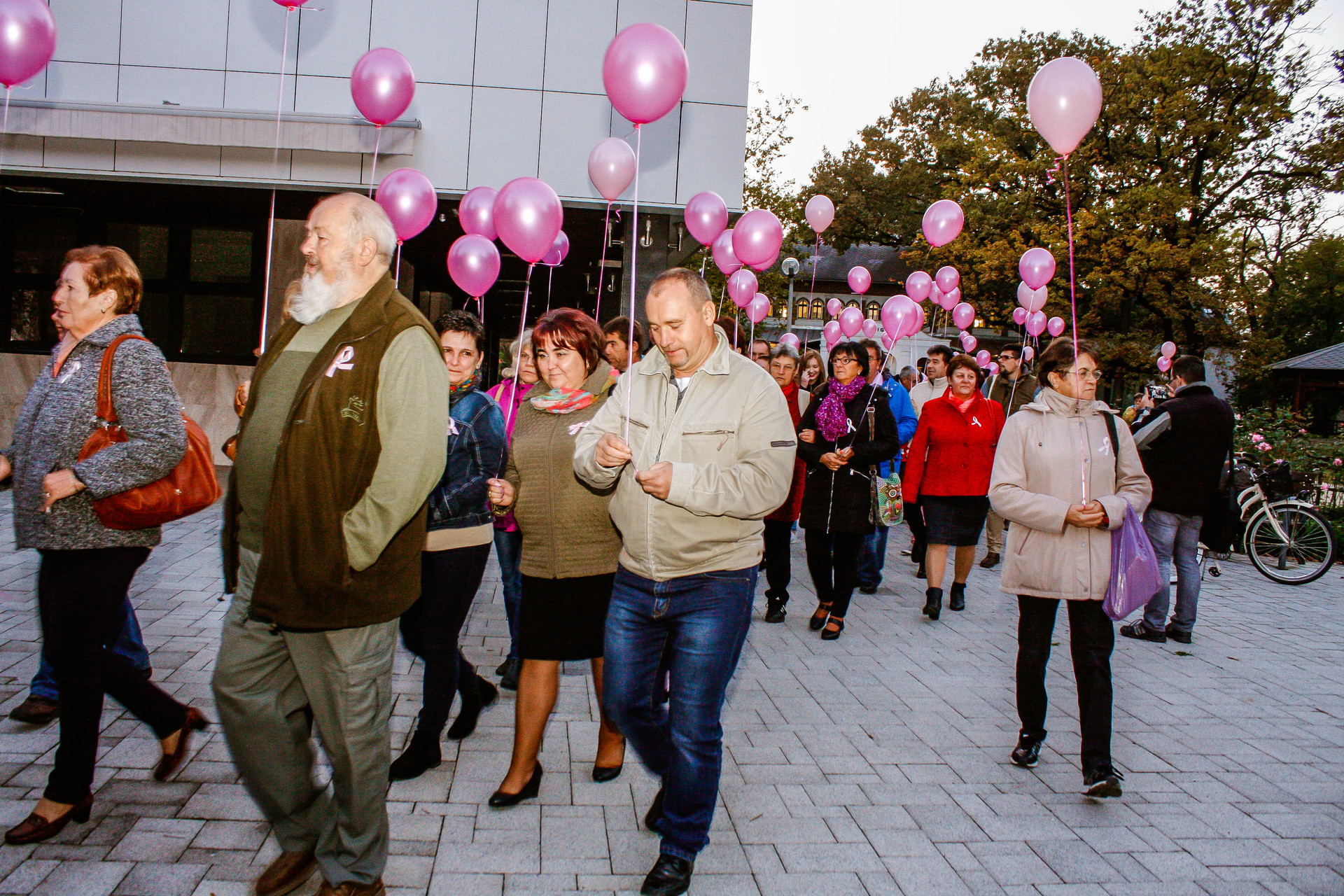 A résztvevők rózsaszín léggömbökkel sétáltak a Világóráig