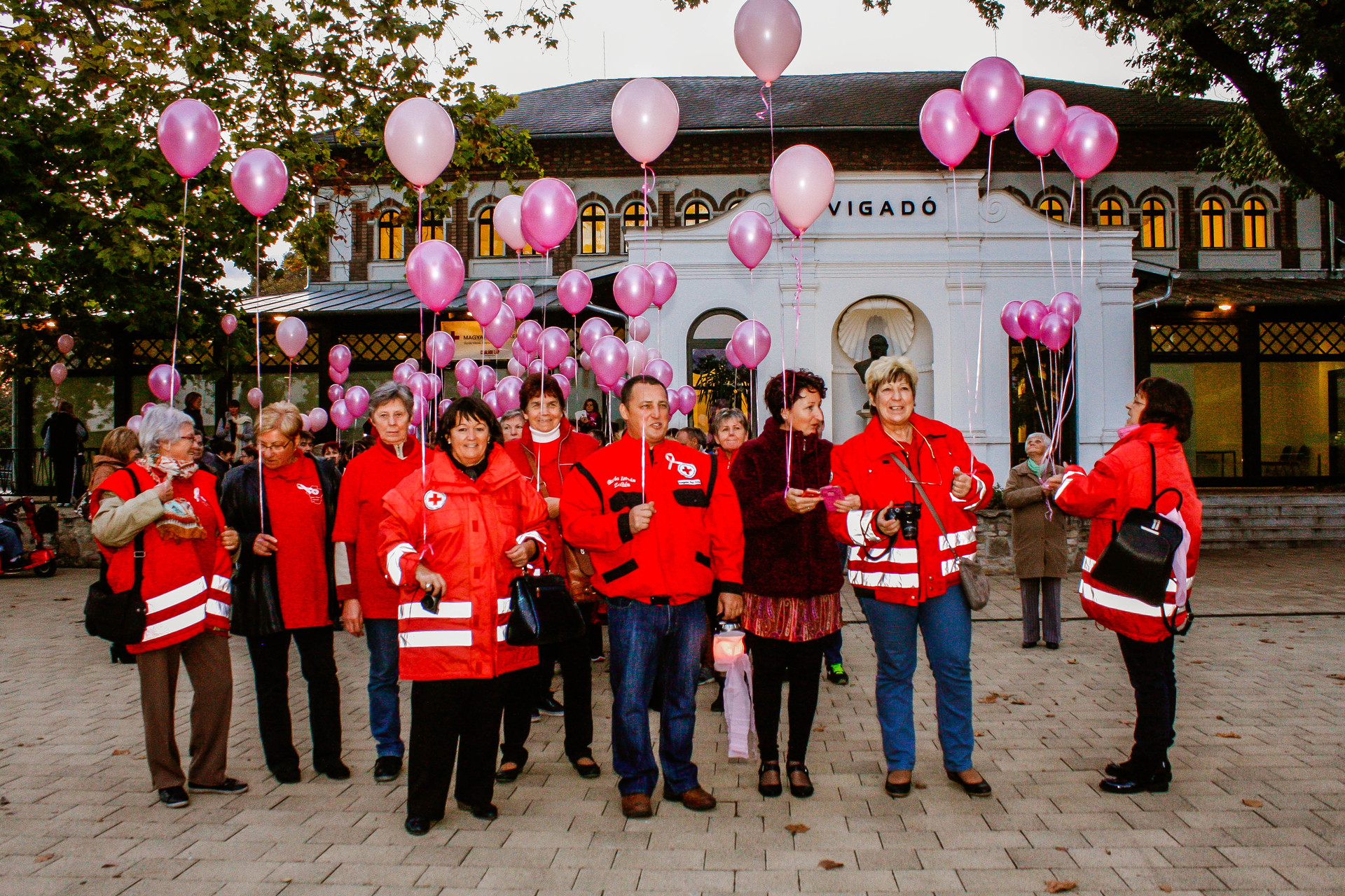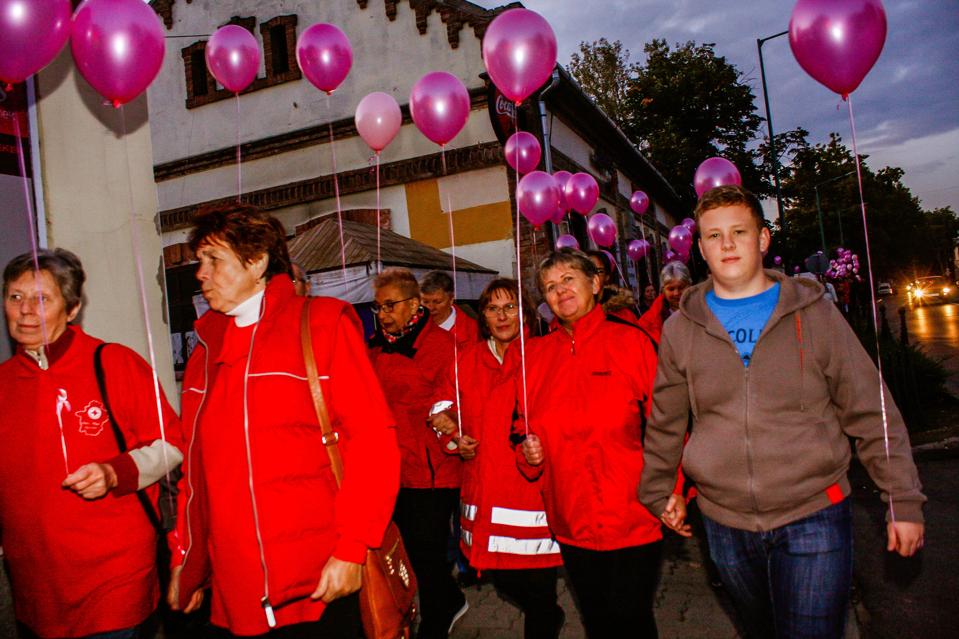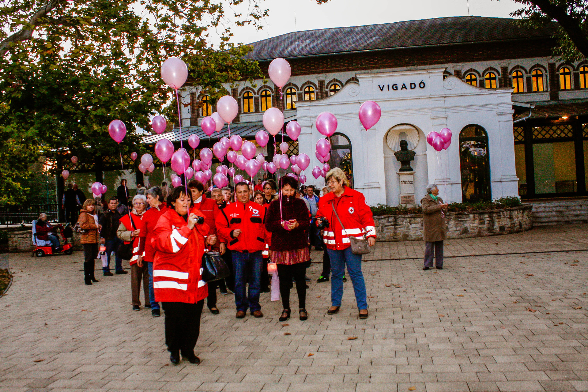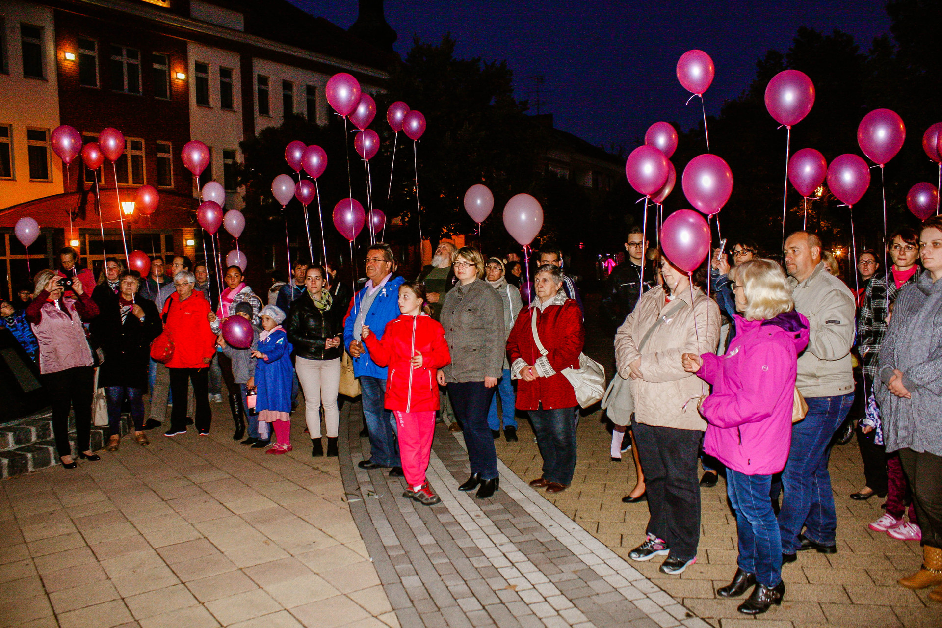 A résztvevők rózsaszín léggömbökkel sétáltak a Világóráig