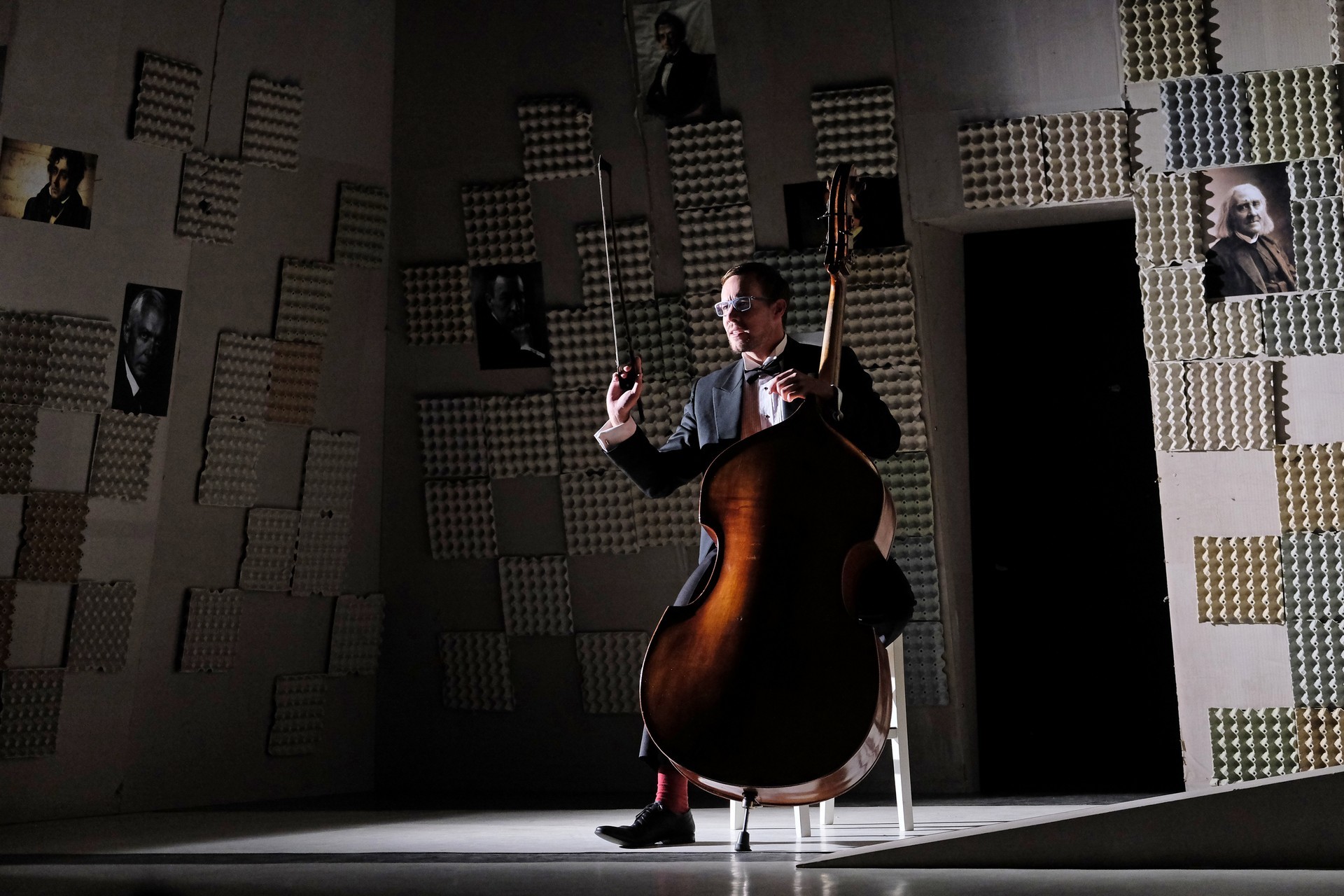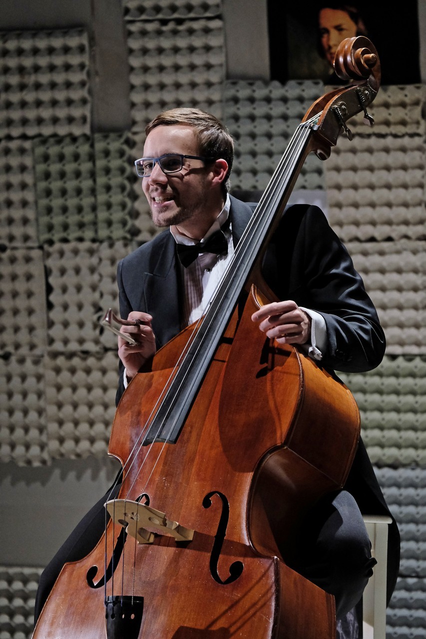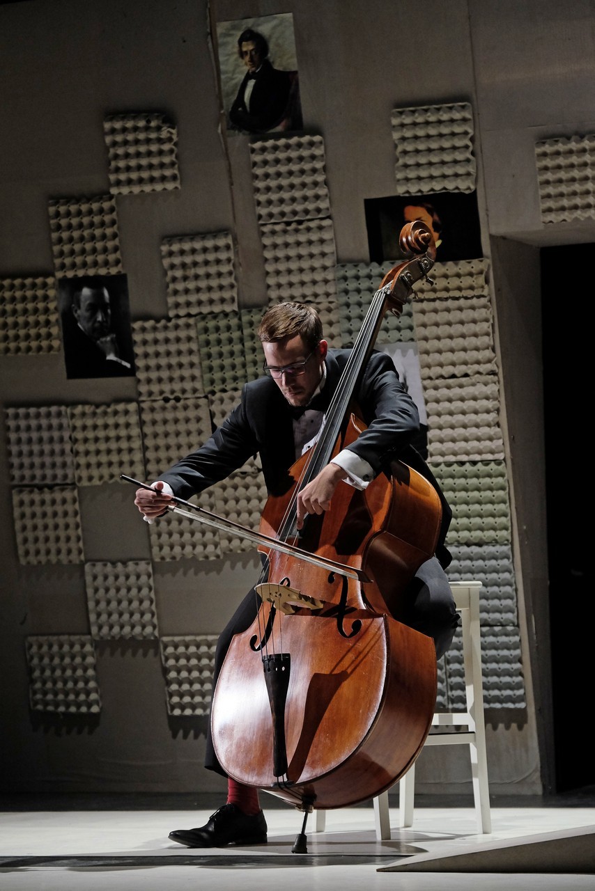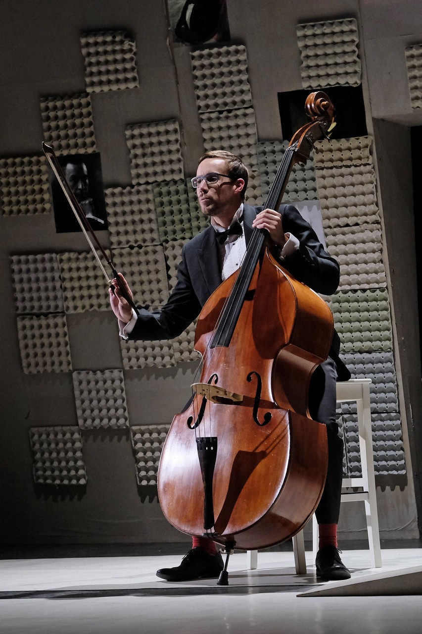 „Gyakran van, mi összehasonlíthatatlanul jobb a környezeténél, mégis kimarad, elpusztul – mondja –, mint a háromhúros nagybőgő, aminek sokkal szebb a hangja, de azért a német, négyhúros változat terjedt el, mert akkoriban ott voltak a nagy zeneszerzők. Akik persze csak elvétve komponáltak bőgőre valamit.” A zenész és a néző közti beszélgetésben hamar felszínre tör a mellőzöttség sértettsége, a kisebbrendűséget túlkompenzáló pökhendiség és a kitörésre való képtelenség. Ahogy ez az elveszett, modoros kis csodabogár játszik hangszerén, vagy ahogy ül a szmokingjához húzott vörös zoknijában az önsajnálat hangszigetelt szobájába zárva, és vall az életéről, szerelméről, és beszél a zenéről, mint metafizikai jelenségről, valamint egyszerre áldott és átkozott hangszeréről, mi örömének éppúgy, mint összes frusztráltságának megtestesítője, egyszerre lelkes és kiábrándult, szenvedélyes, de magányos, és úgy alázatos, hogy közben lázadó is. Egy-egy pillanatra játékán át felvillan Darvas Iván, hangja pedig több ízben is Székhelyi Józsefet juttatja észbe, de bármit és bárhogy is tesz, a nézőtéren ülők közül mindenki azt érezheti: közvetlenül rá néz és hozzá szól. Játszi könnyedséggel vonja magára a figyelmet, és még a tinilányok is áhítattal hallgatják rögtönzött zenetörténeti előadását, és vesznek remekül minden burkolt poént. Ilyen előadásra nekik is öröm színházba menni. Hisz nem markol sokat, így sikerül a látszatnál lényegesen többet megfognia. Üde, szellemes, világos és könnyed, így annál jobban üt egy-egy elrejtett mély gondolat.