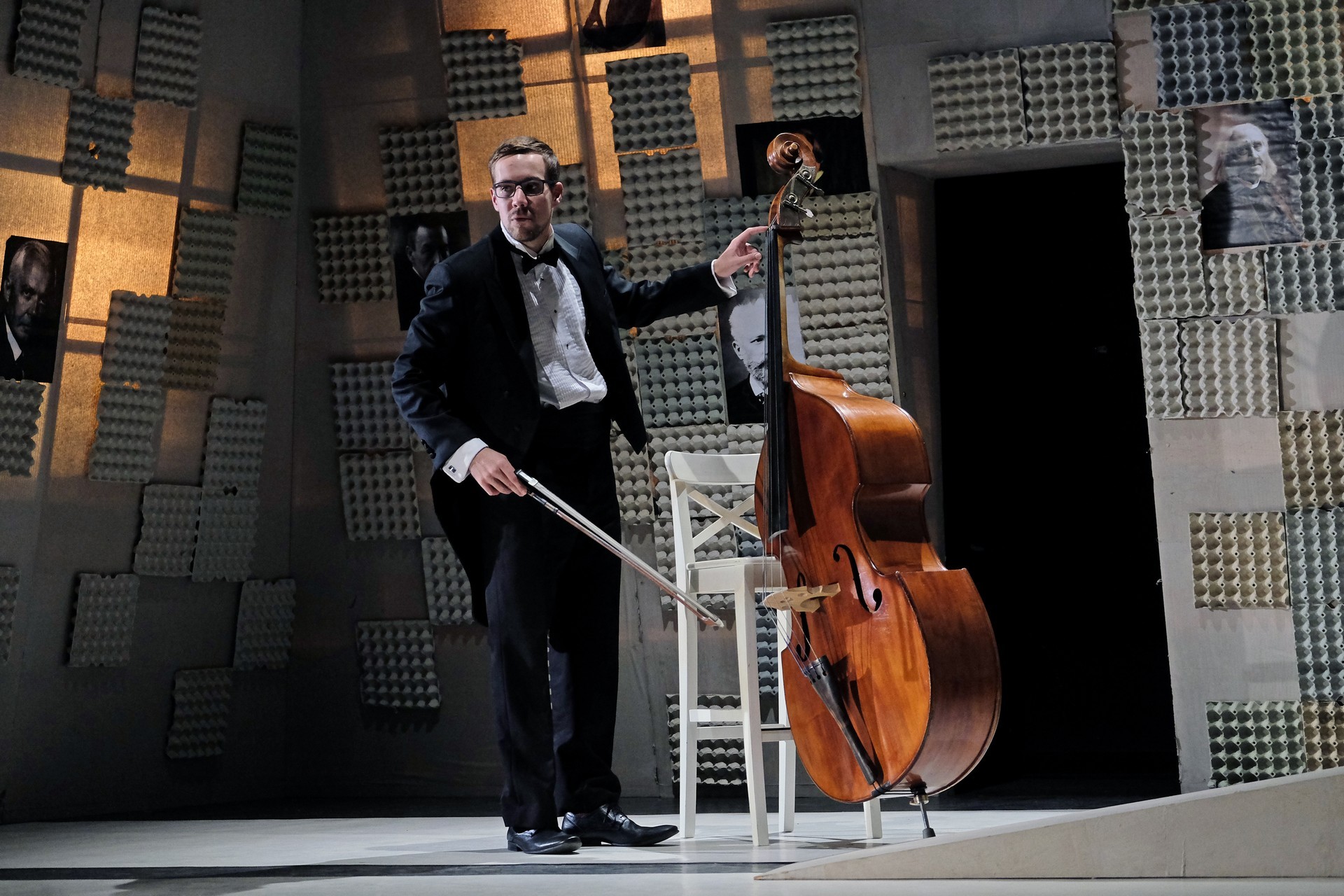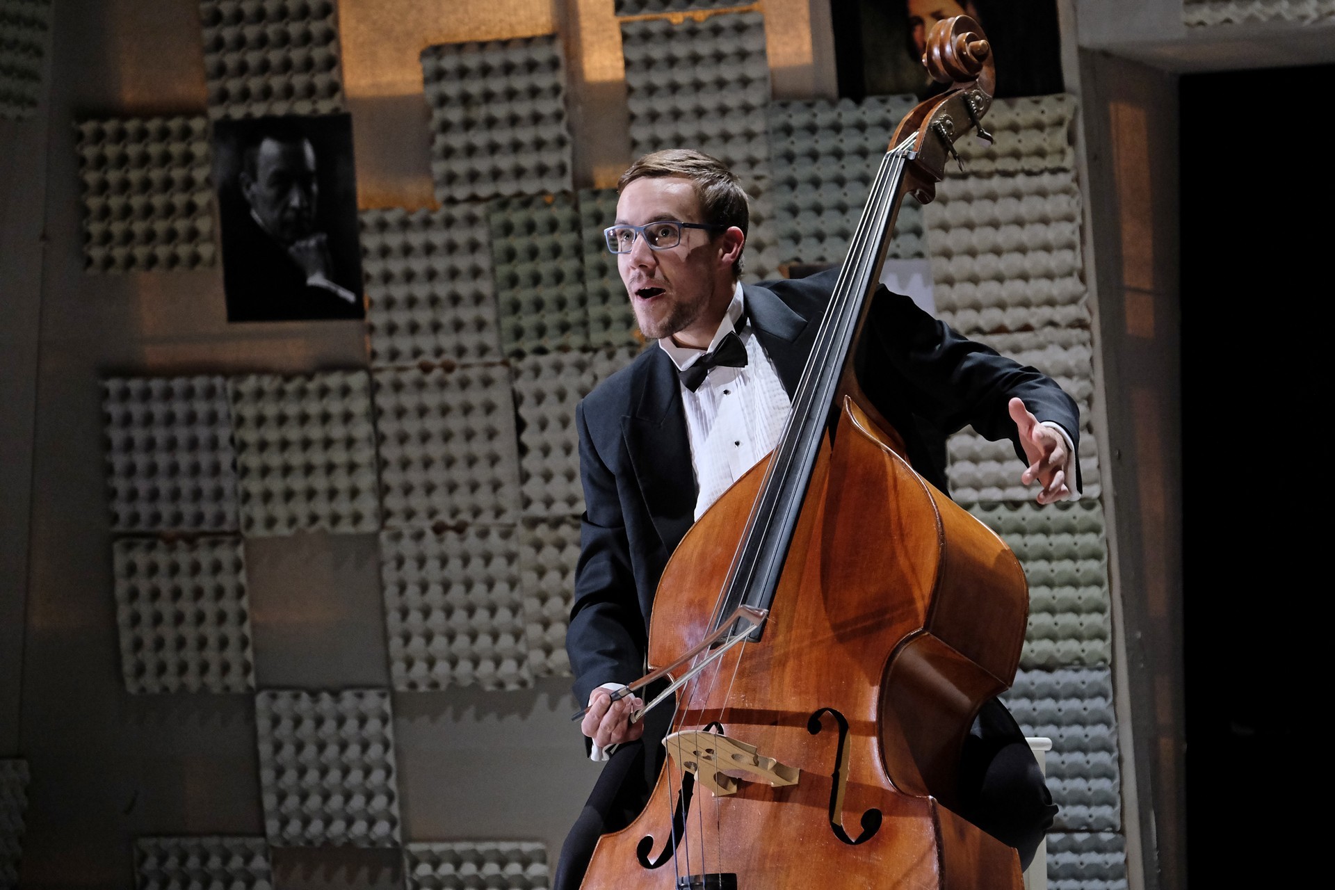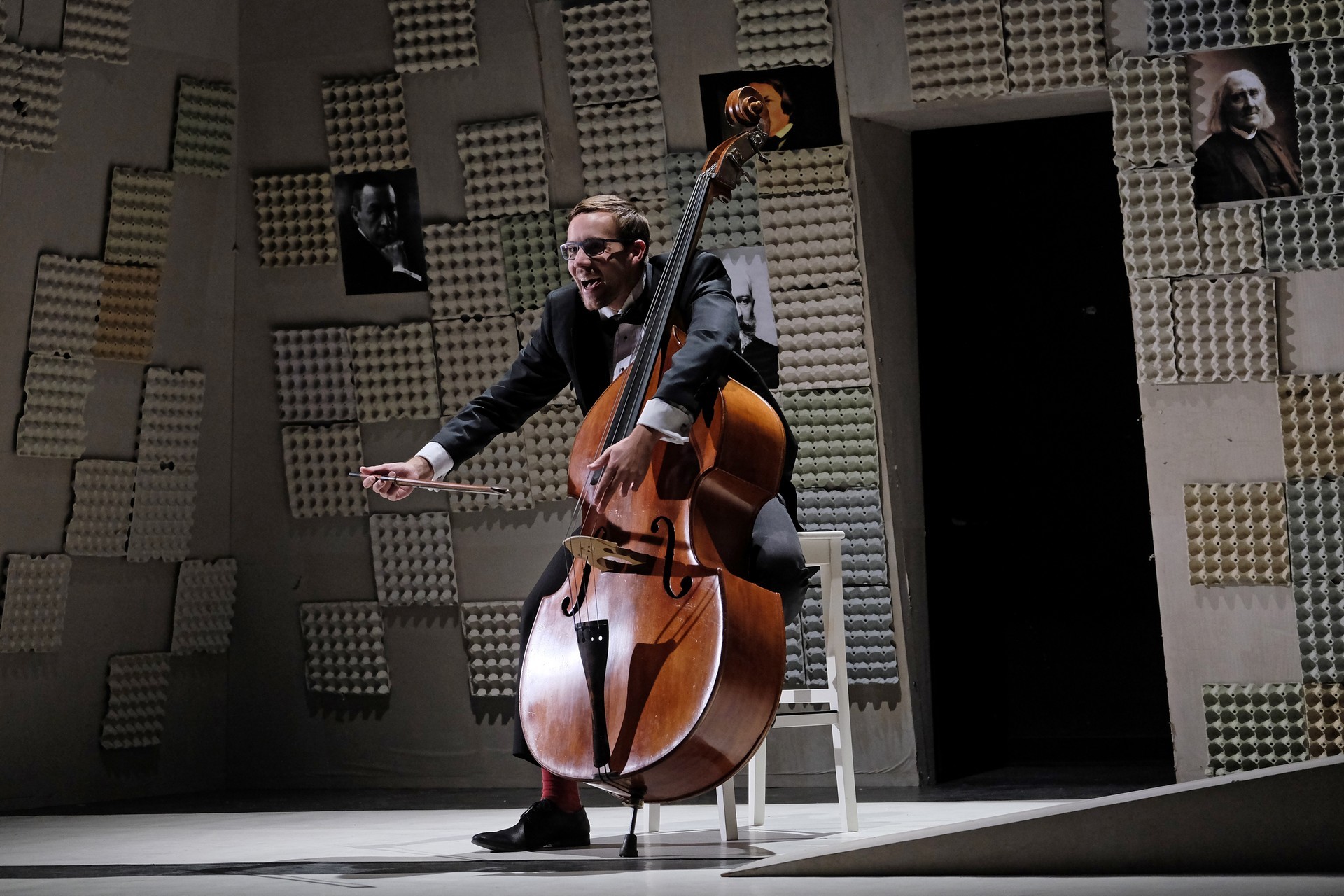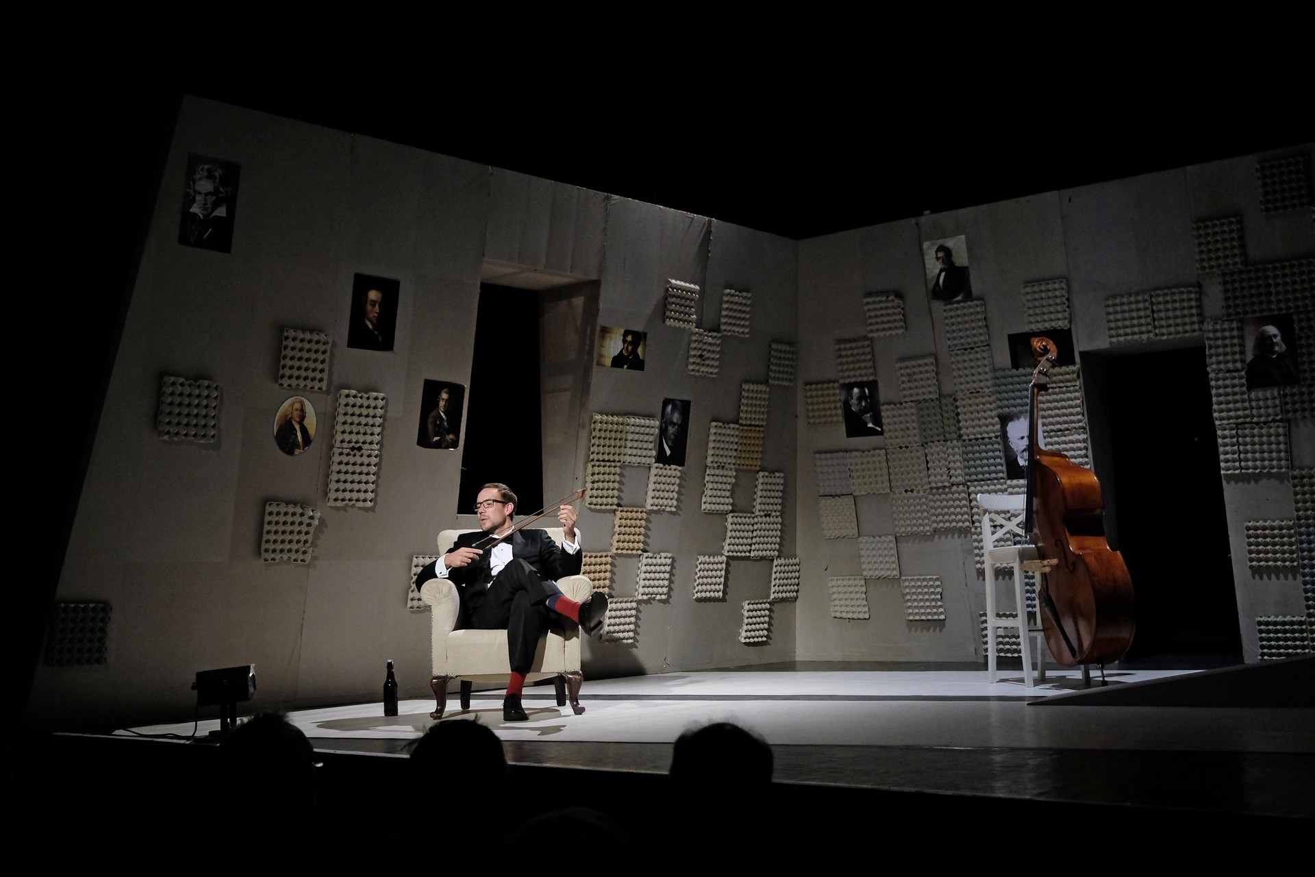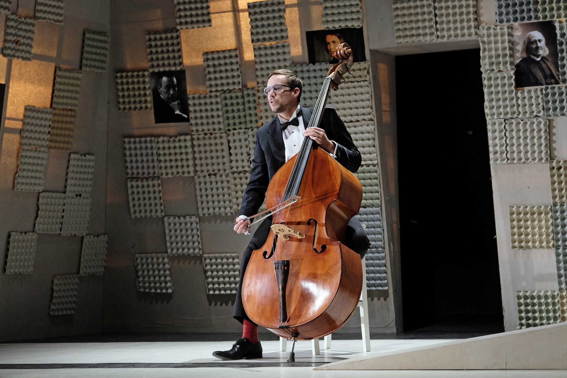 „Gyakran van, mi összehasonlíthatatlanul jobb a környezeténél, mégis kimarad, elpusztul – mondja –, mint a háromhúros nagybőgő, aminek sokkal szebb a hangja, de azért a német, négyhúros változat terjedt el, mert akkoriban ott voltak a nagy zeneszerzők. Akik persze csak elvétve komponáltak bőgőre valamit.” A zenész és a néző közti beszélgetésben hamar felszínre tör a mellőzöttség sértettsége, a kisebbrendűséget túlkompenzáló pökhendiség és a kitörésre való képtelenség. Ahogy ez az elveszett, modoros kis csodabogár játszik hangszerén, vagy ahogy ül a szmokingjához húzott vörös zoknijában az önsajnálat hangszigetelt szobájába zárva, és vall az életéről, szerelméről, és beszél a zenéről, mint metafizikai jelenségről, valamint egyszerre áldott és átkozott hangszeréről, mi örömének éppúgy, mint összes frusztráltságának megtestesítője, egyszerre lelkes és kiábrándult, szenvedélyes, de magányos, és úgy alázatos, hogy közben lázadó is. Egy-egy pillanatra játékán át felvillan Darvas Iván, hangja pedig több ízben is Székhelyi Józsefet juttatja észbe, de bármit és bárhogy is tesz, a nézőtéren ülők közül mindenki azt érezheti: közvetlenül rá néz és hozzá szól. Játszi könnyedséggel vonja magára a figyelmet, és még a tinilányok is áhítattal hallgatják rögtönzött zenetörténeti előadását, és vesznek remekül minden burkolt poént. Ilyen előadásra nekik is öröm színházba menni. Hisz nem markol sokat, így sikerül a látszatnál lényegesen többet megfognia. Üde, szellemes, világos és könnyed, így annál jobban üt egy-egy elrejtett mély gondolat.