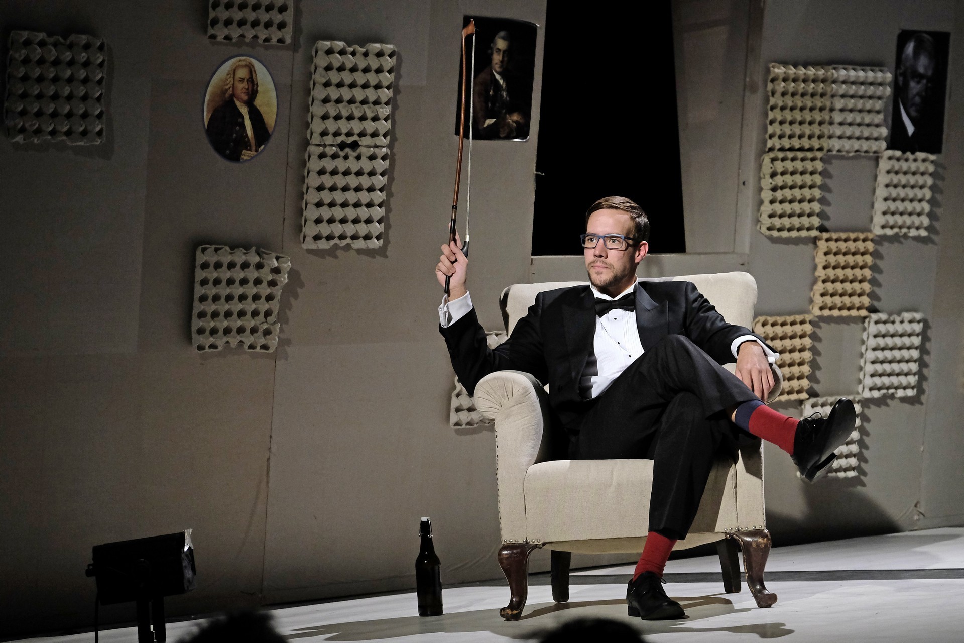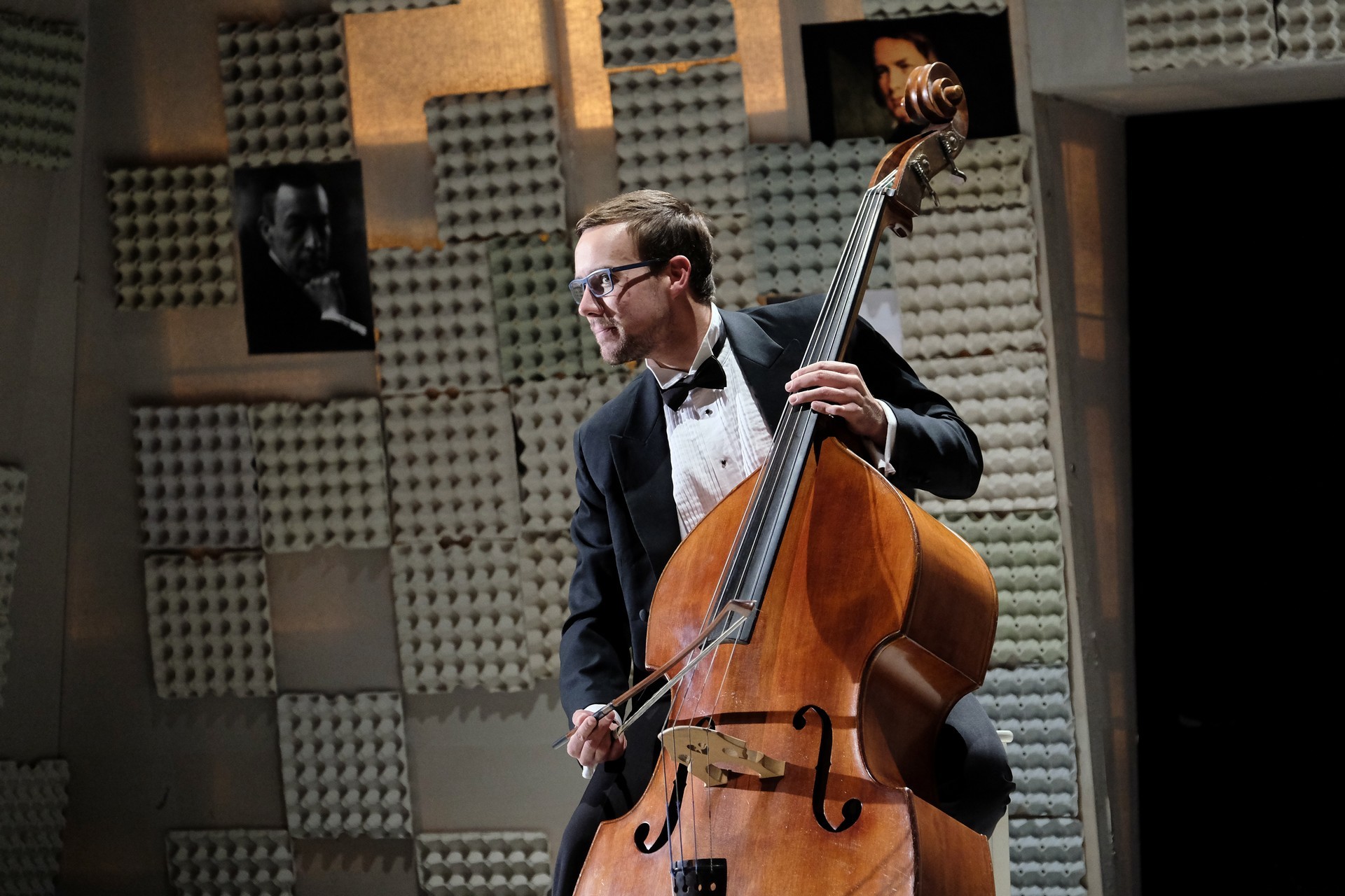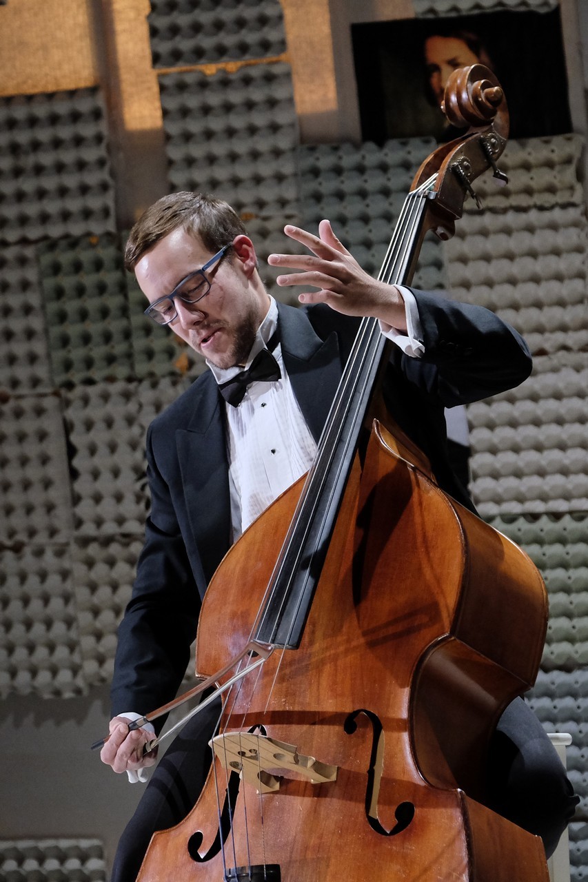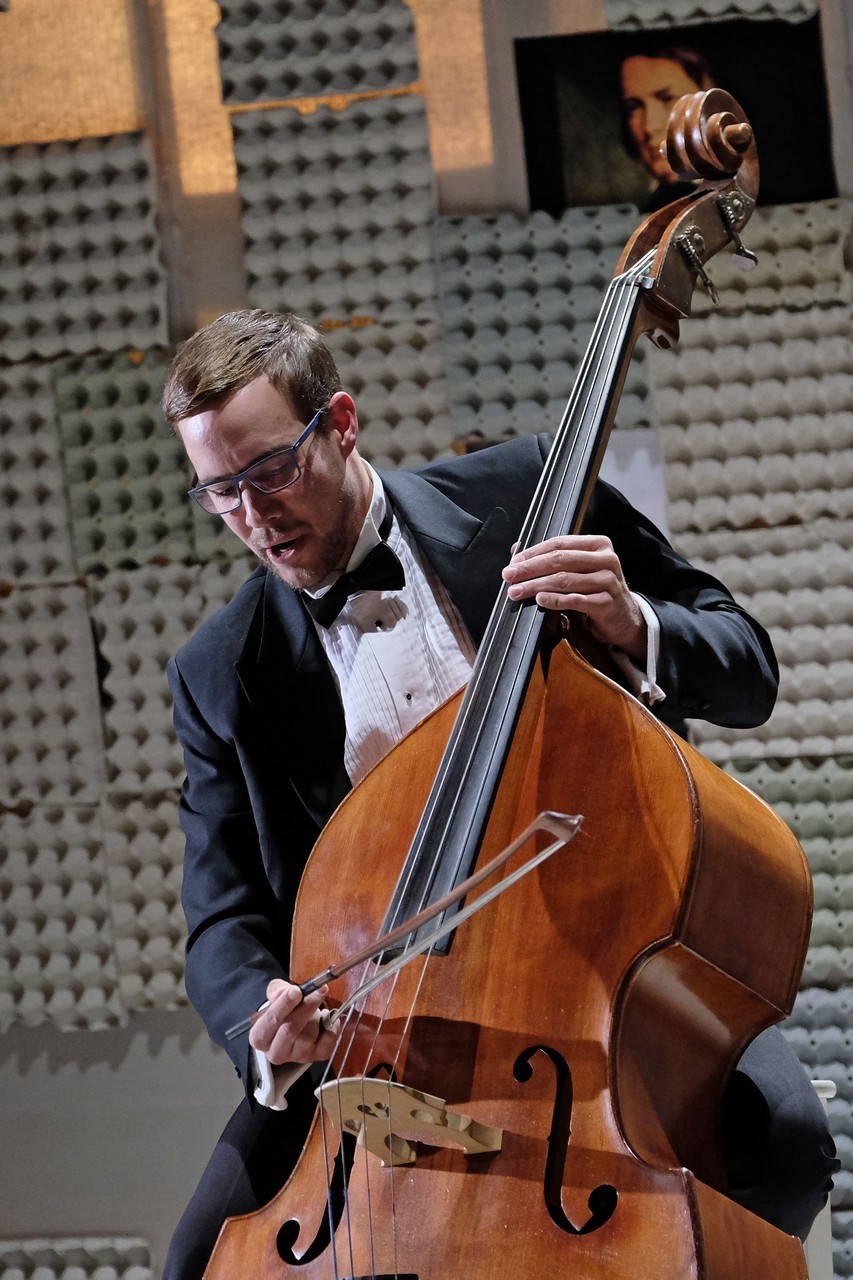 „Gyakran van, mi összehasonlíthatatlanul jobb a környezeténél, mégis kimarad, elpusztul – mondja –, mint a háromhúros nagybőgő, aminek sokkal szebb a hangja, de azért a német, négyhúros változat terjedt el, mert akkoriban ott voltak a nagy zeneszerzők. Akik persze csak elvétve komponáltak bőgőre valamit.” A zenész és a néző közti beszélgetésben hamar felszínre tör a mellőzöttség sértettsége, a kisebbrendűséget túlkompenzáló pökhendiség és a kitörésre való képtelenség. Ahogy ez az elveszett, modoros kis csodabogár játszik hangszerén, vagy ahogy ül a szmokingjához húzott vörös zoknijában az önsajnálat hangszigetelt szobájába zárva, és vall az életéről, szerelméről, és beszél a zenéről, mint metafizikai jelenségről, valamint egyszerre áldott és átkozott hangszeréről, mi örömének éppúgy, mint összes frusztráltságának megtestesítője, egyszerre lelkes és kiábrándult, szenvedélyes, de magányos, és úgy alázatos, hogy közben lázadó is. Egy-egy pillanatra játékán át felvillan Darvas Iván, hangja pedig több ízben is Székhelyi Józsefet juttatja észbe, de bármit és bárhogy is tesz, a nézőtéren ülők közül mindenki azt érezheti: közvetlenül rá néz és hozzá szól. Játszi könnyedséggel vonja magára a figyelmet, és még a tinilányok is áhítattal hallgatják rögtönzött zenetörténeti előadását, és vesznek remekül minden burkolt poént. Ilyen előadásra nekik is öröm színházba menni. Hisz nem markol sokat, így sikerül a látszatnál lényegesen többet megfognia. Üde, szellemes, világos és könnyed, így annál jobban üt egy-egy elrejtett mély gondolat.