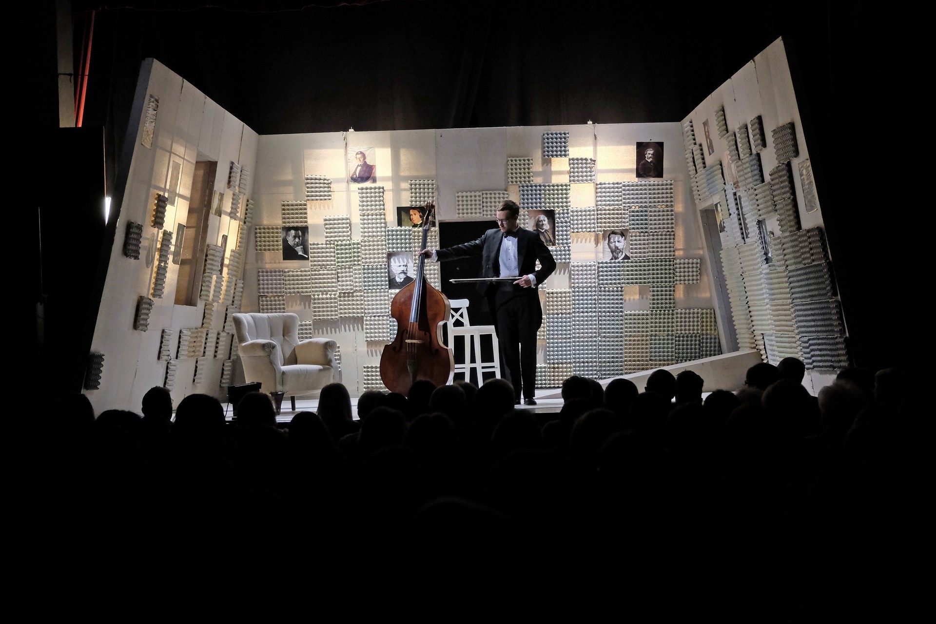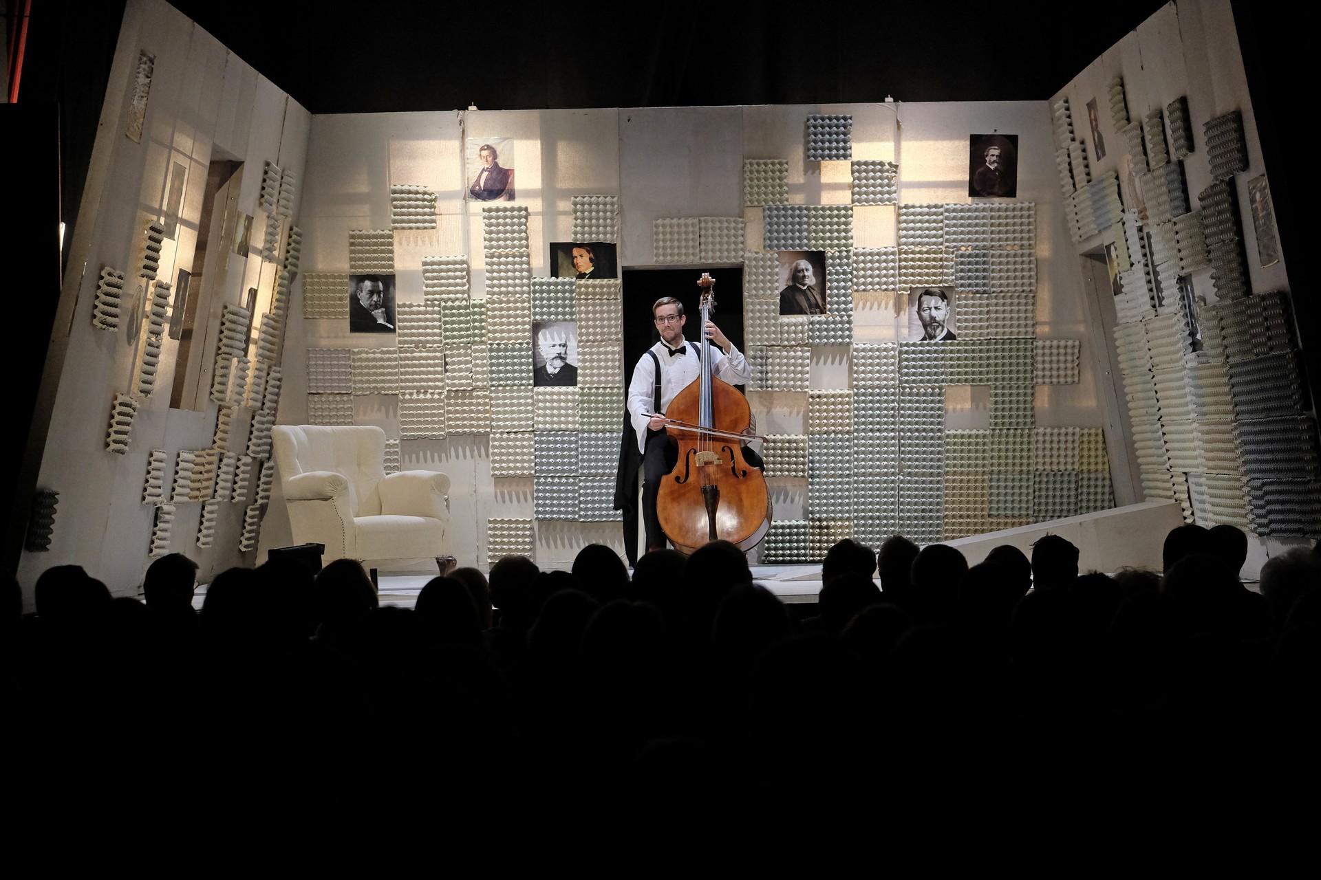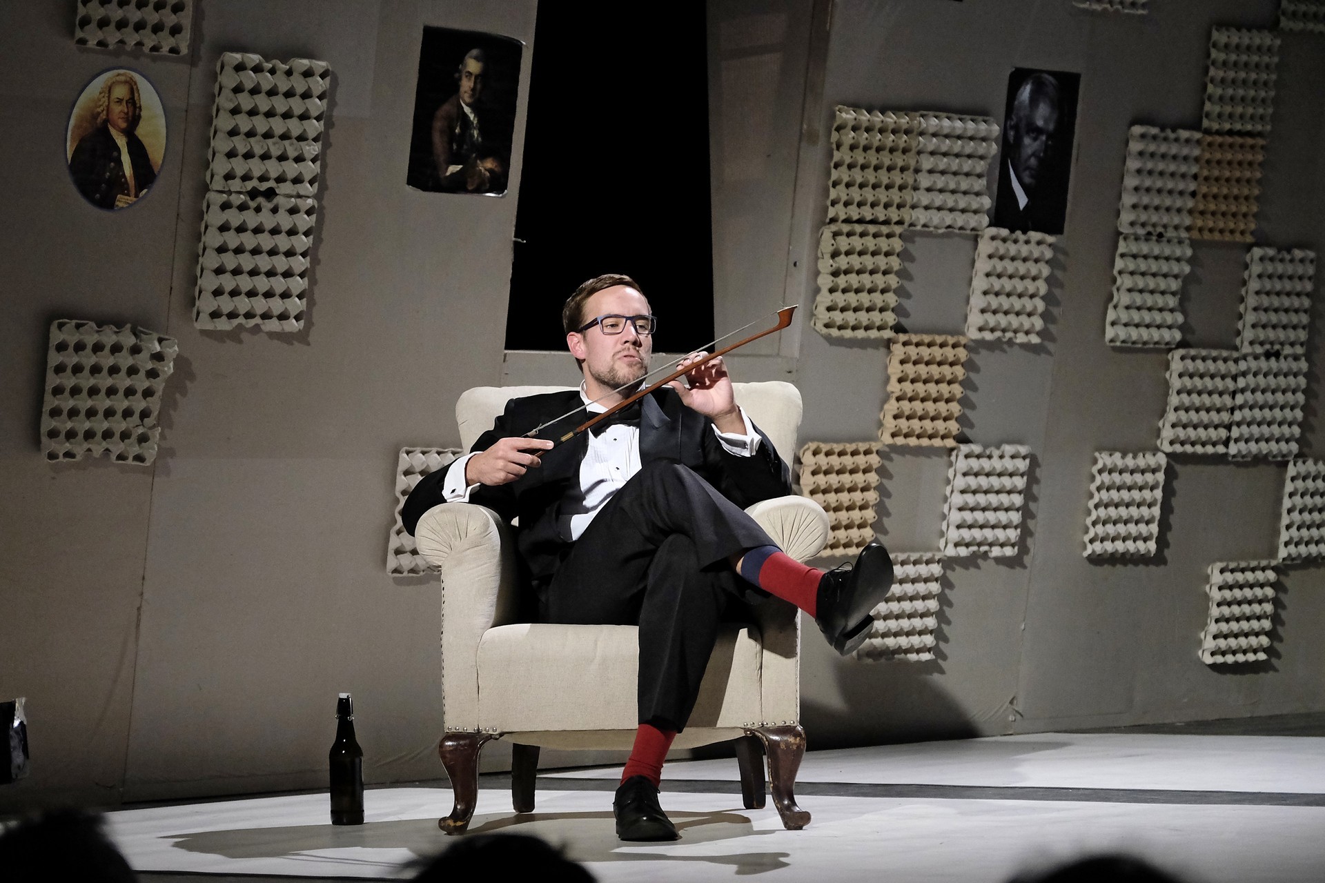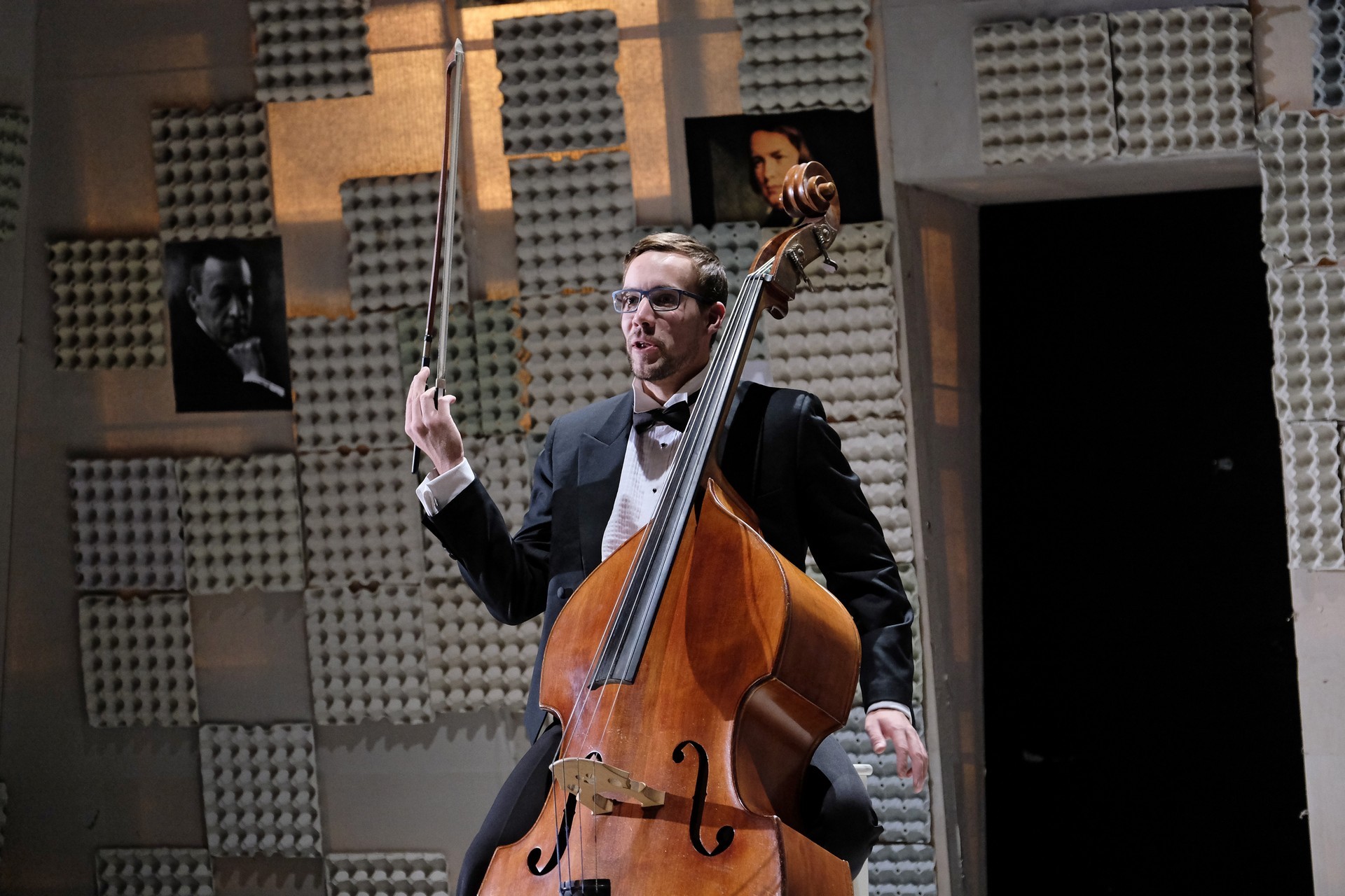 „Gyakran van, mi összehasonlíthatatlanul jobb a környezeténél, mégis kimarad, elpusztul – mondja –, mint a háromhúros nagybőgő, aminek sokkal szebb a hangja, de azért a német, négyhúros változat terjedt el, mert akkoriban ott voltak a nagy zeneszerzők. Akik persze csak elvétve komponáltak bőgőre valamit.” A zenész és a néző közti beszélgetésben hamar felszínre tör a mellőzöttség sértettsége, a kisebbrendűséget túlkompenzáló pökhendiség és a kitörésre való képtelenség. Ahogy ez az elveszett, modoros kis csodabogár játszik hangszerén, vagy ahogy ül a szmokingjához húzott vörös zoknijában az önsajnálat hangszigetelt szobájába zárva, és vall az életéről, szerelméről, és beszél a zenéről, mint metafizikai jelenségről, valamint egyszerre áldott és átkozott hangszeréről, mi örömének éppúgy, mint összes frusztráltságának megtestesítője, egyszerre lelkes és kiábrándult, szenvedélyes, de magányos, és úgy alázatos, hogy közben lázadó is. Egy-egy pillanatra játékán át felvillan Darvas Iván, hangja pedig több ízben is Székhelyi Józsefet juttatja észbe, de bármit és bárhogy is tesz, a nézőtéren ülők közül mindenki azt érezheti: közvetlenül rá néz és hozzá szól. Játszi könnyedséggel vonja magára a figyelmet, és még a tinilányok is áhítattal hallgatják rögtönzött zenetörténeti előadását, és vesznek remekül minden burkolt poént. Ilyen előadásra nekik is öröm színházba menni. Hisz nem markol sokat, így sikerül a látszatnál lényegesen többet megfognia. Üde, szellemes, világos és könnyed, így annál jobban üt egy-egy elrejtett mély gondolat.