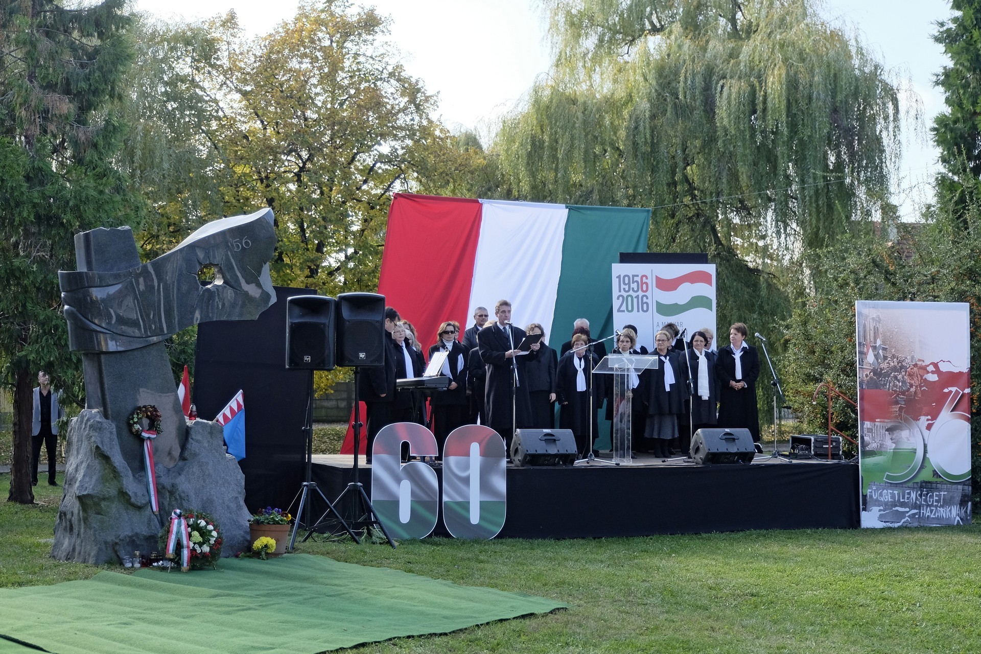 Az ünnepség a Himnusz eléneklésével kezdődött, amelyet az Erkel Ferenc Vegyeskar tolmácsolt a közönségnek. Utána dr. Görgényi Ernő, Gyula város polgármestere tartott emlékbeszédet, amelynek elején köszöntötte a megjelent ’56-os hősöket: M. Szabó Andrást, a város forradalmi polgármesterét, Dandé Jánost, Papp Lászlót, Szántó Mihályt, valamint a Nádházi család megjelent tagjait. Kifejtette, hogy ma egy szabad országban, szabadon és méltósággal emlékezhetünk a hősökre és az áldozatokra, a hőstettekre és mindarra a szenvedésre, amelyet a forradalmároknak kellett kiállniuk. Kiemelte, hogy az 1956-os események nélkül a kommunista diktatúra nem bukott volna meg 1989-ben.