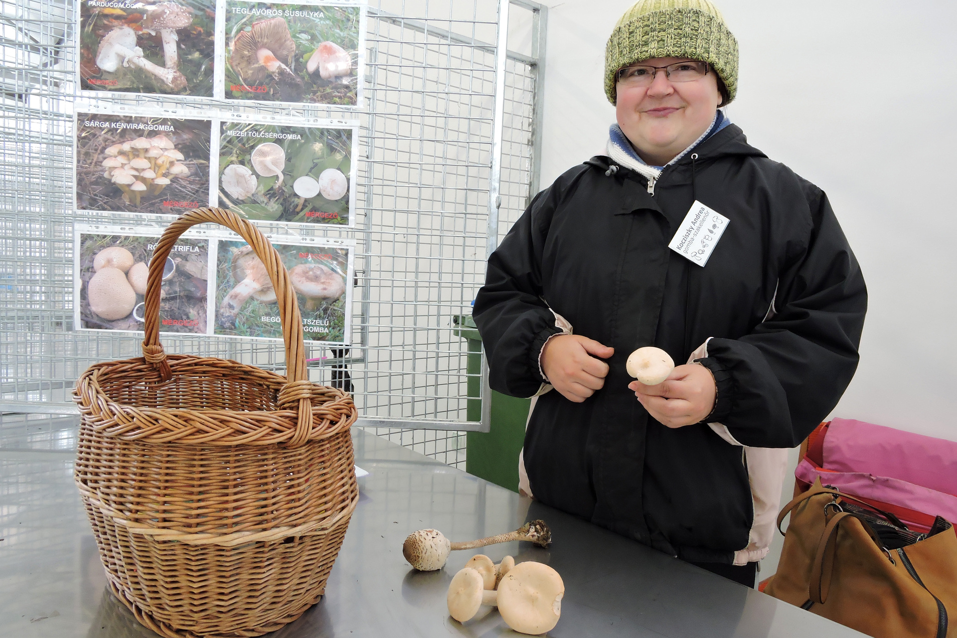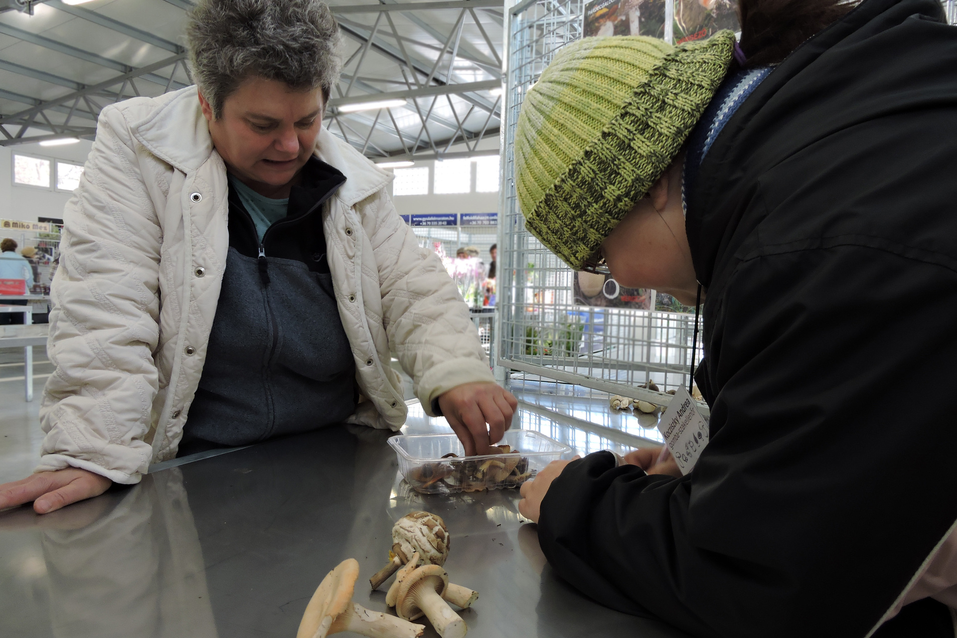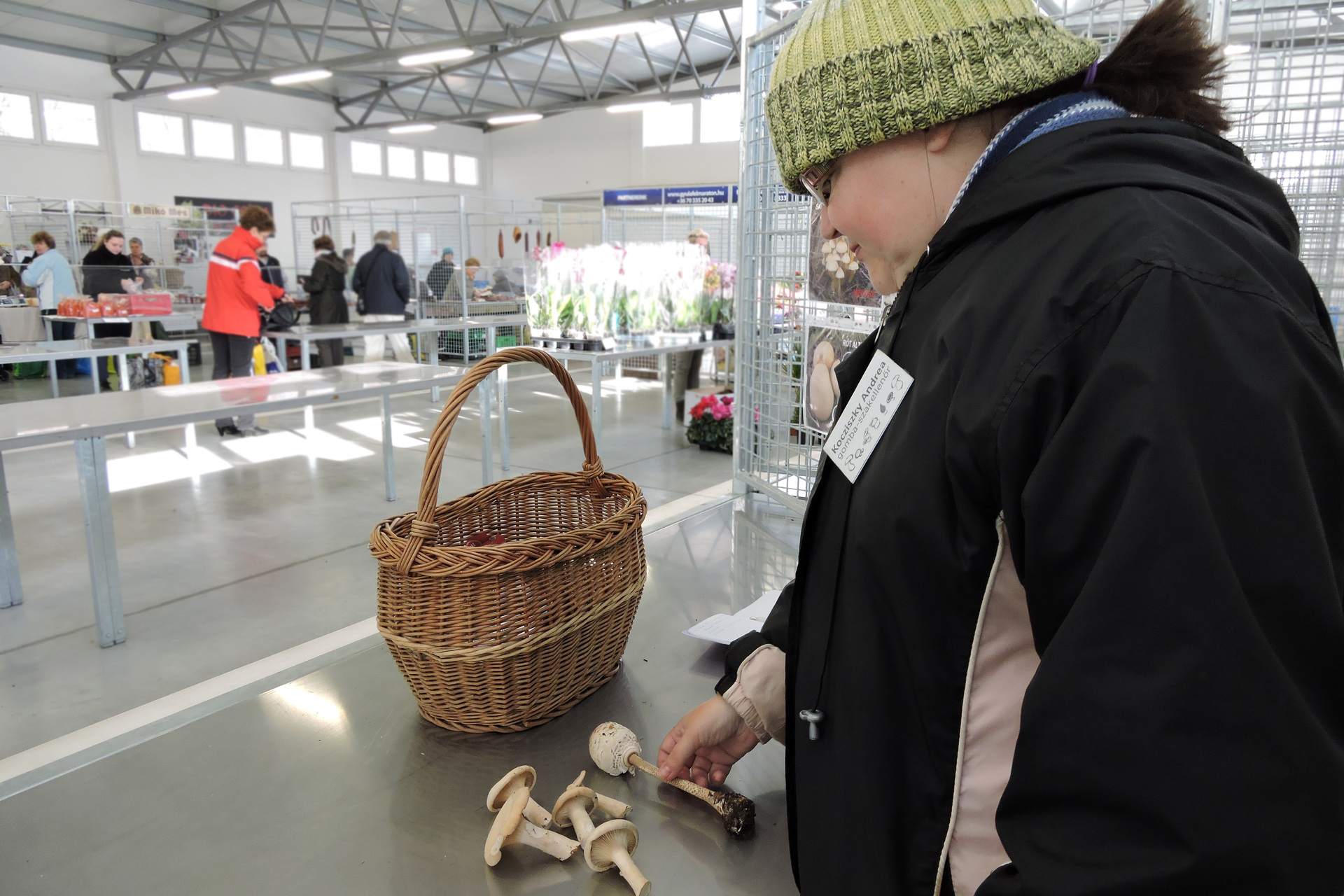 Kocziszky Andrea a gyulai piac vásárcsarnokában vizsgálja be a gombákat