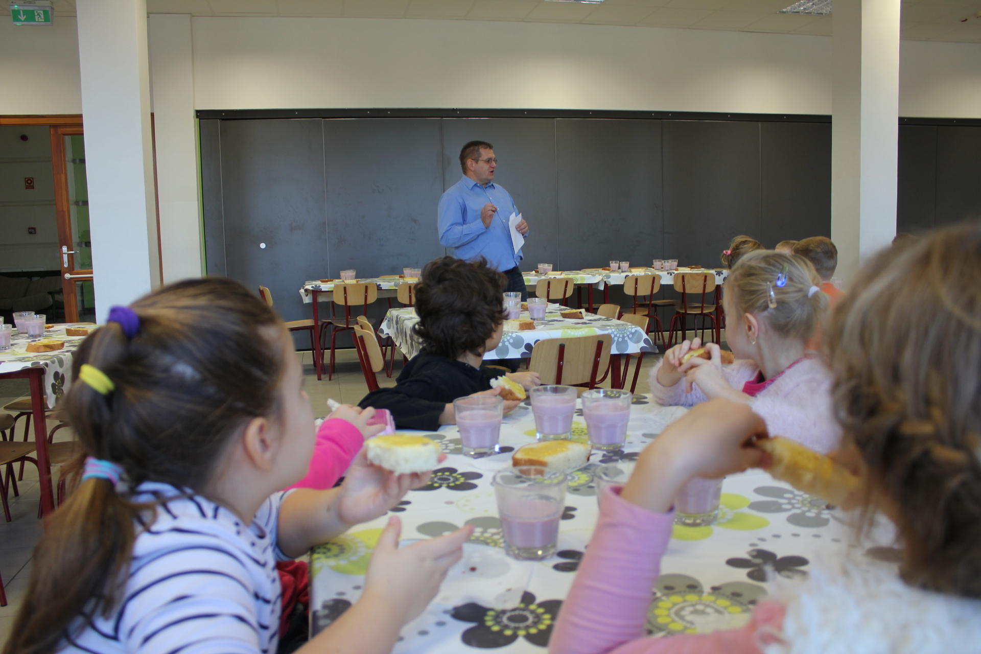 Az Implomban ezúttal az összes alsós évfolyamot meghívták a kóstolóra, és az apróságok mellett a tanárnénik is lelkesen falatozták a kalácsból és napraforgómézből álló reggelit. Közben Lajos Zsolt méhész előadást is tartott az édes finomságról, amiből mindenki megtudhatta, miért egészséges a méz, ahogy azt is, hogy lehetőség szerint ne keverjük azt túl forró folyadékba, mert a hevítés során számos hasznos anyag elveszhet belőle.